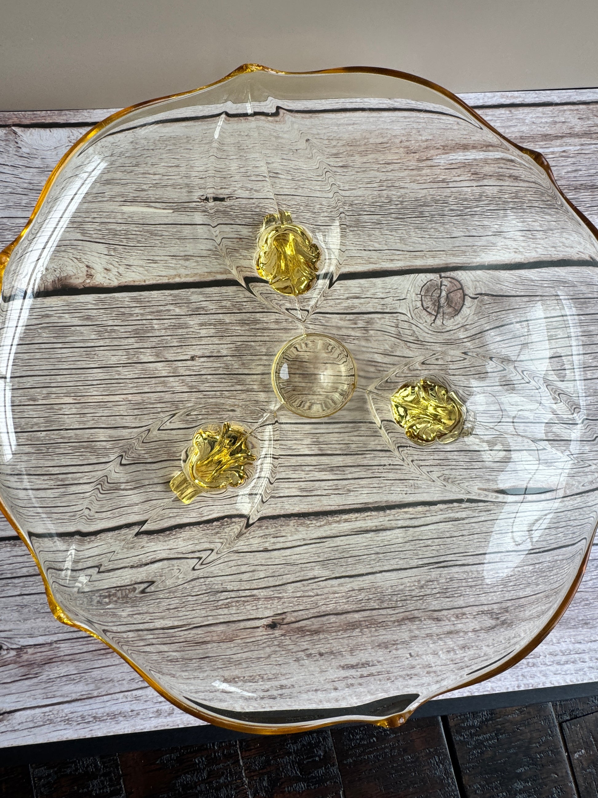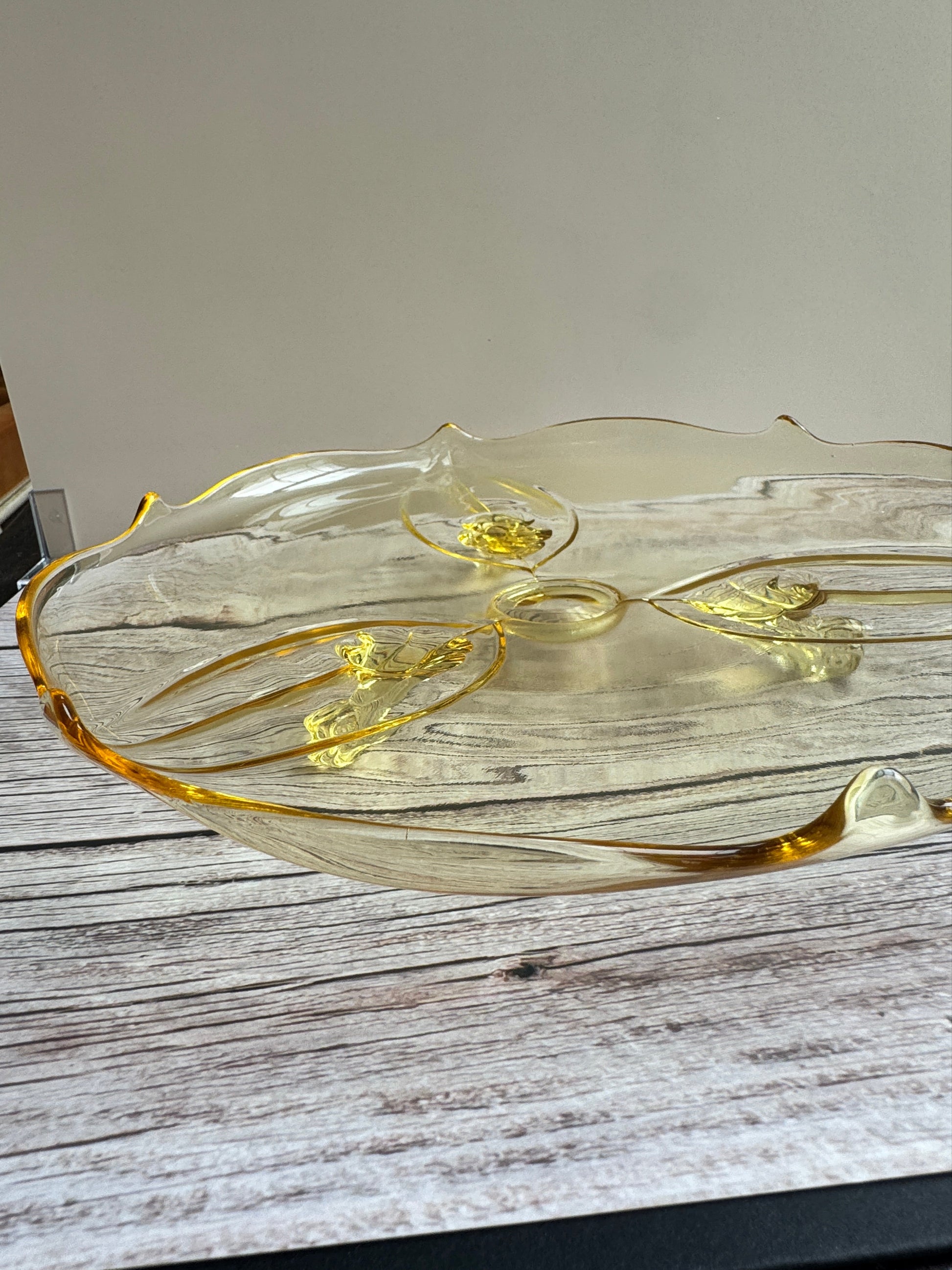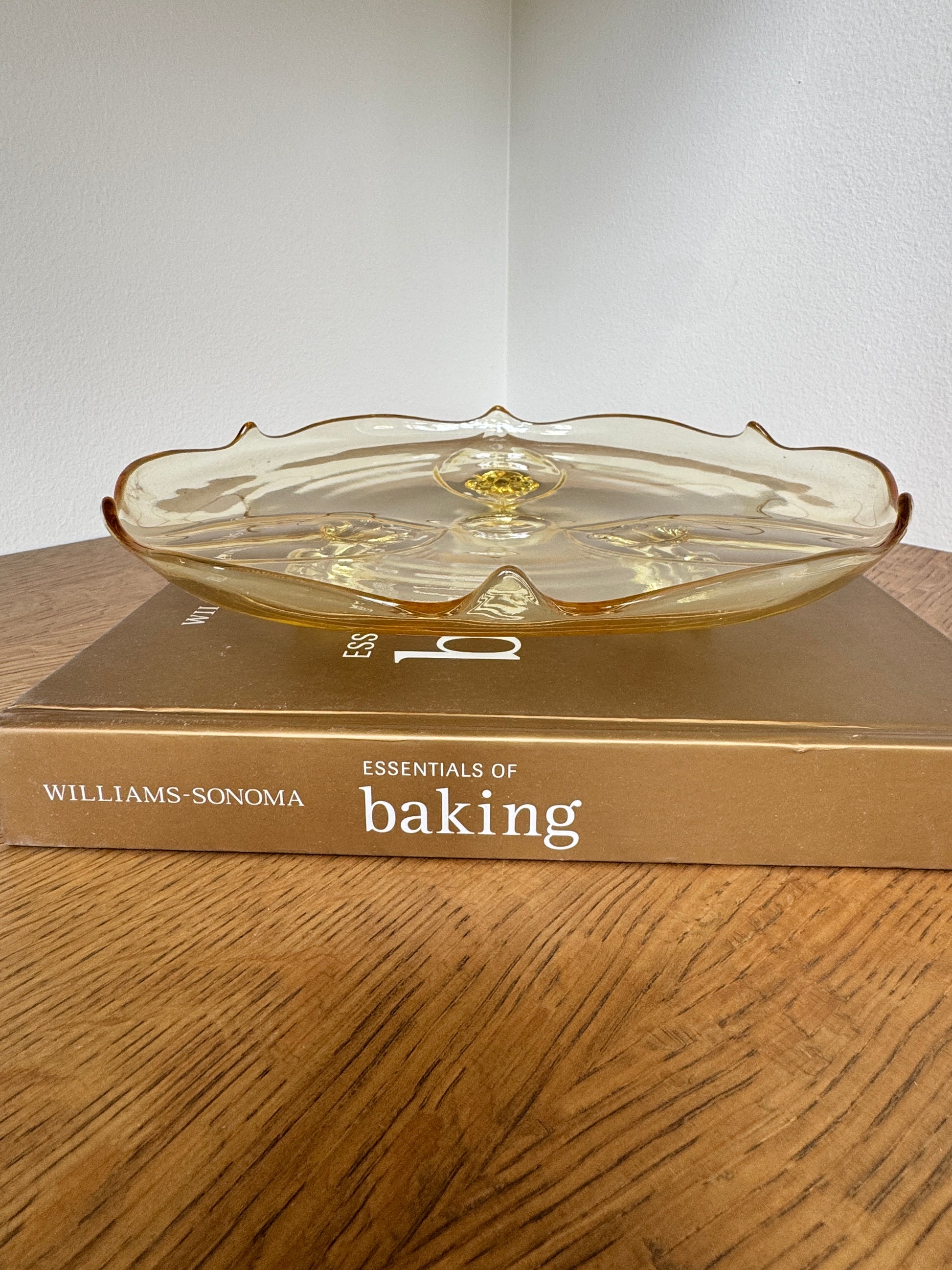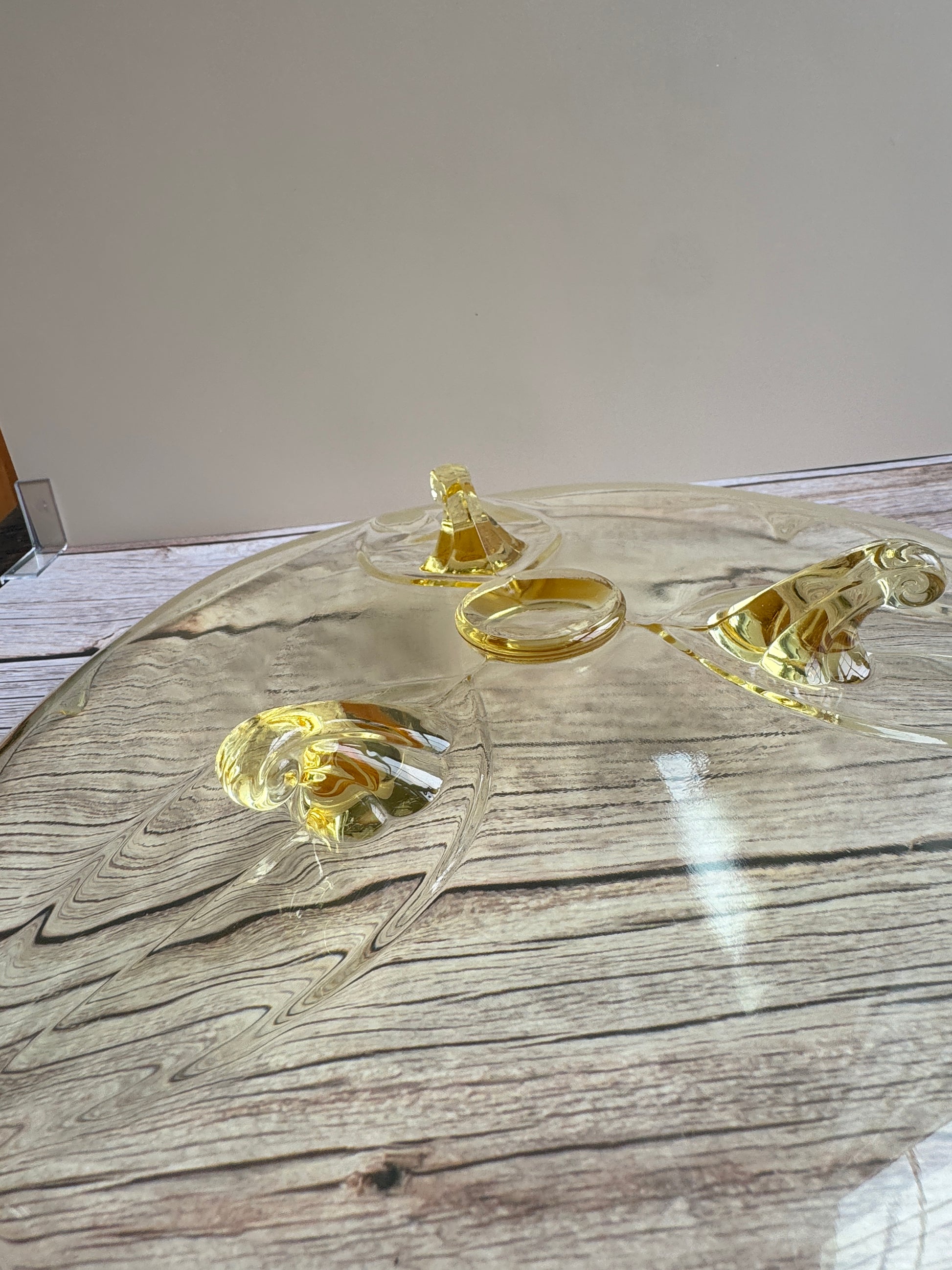 1930s Lancaster Petal Depression Glass Cake Plate – Topaz Yellow, 3-Footed, 10
