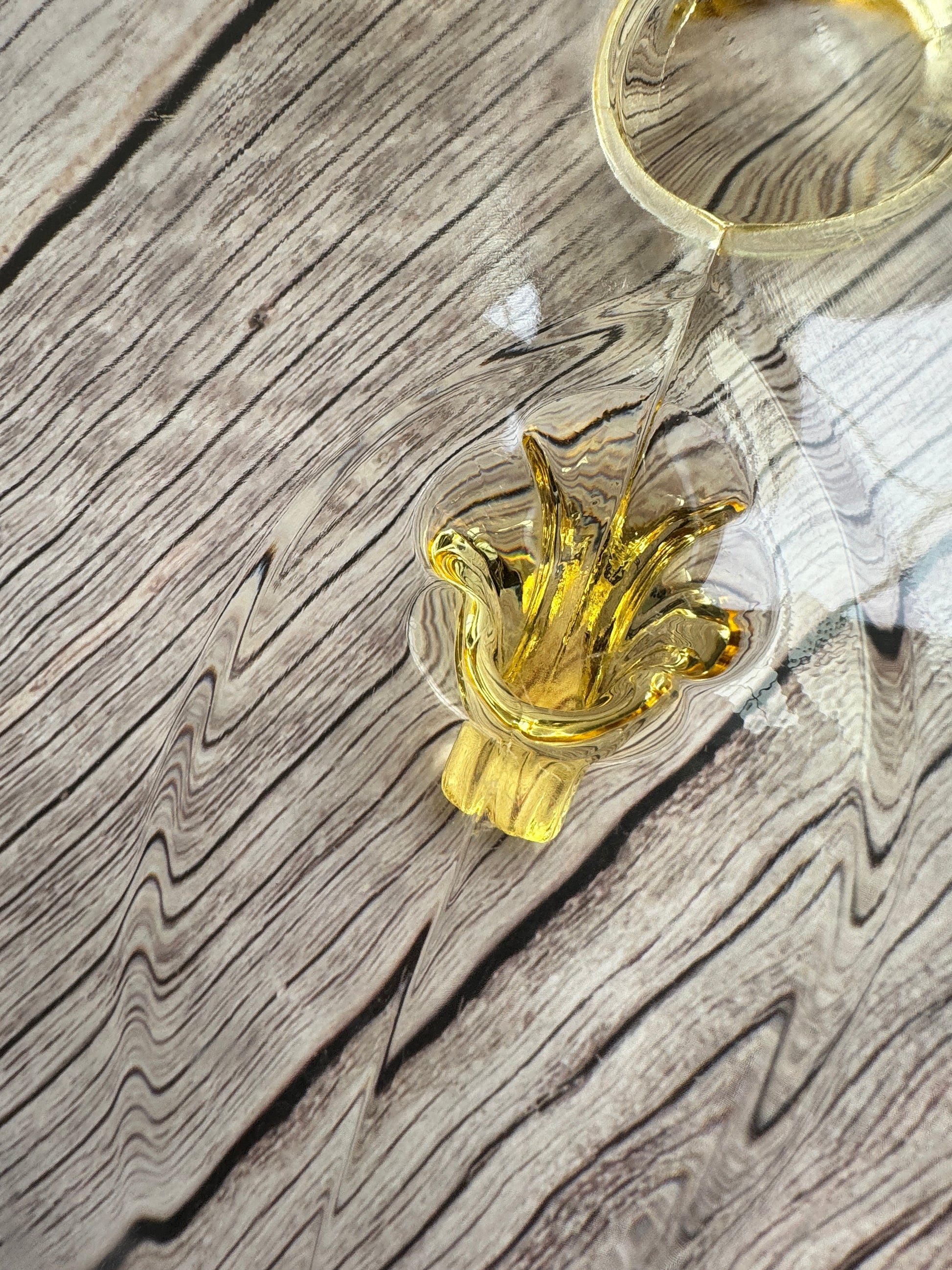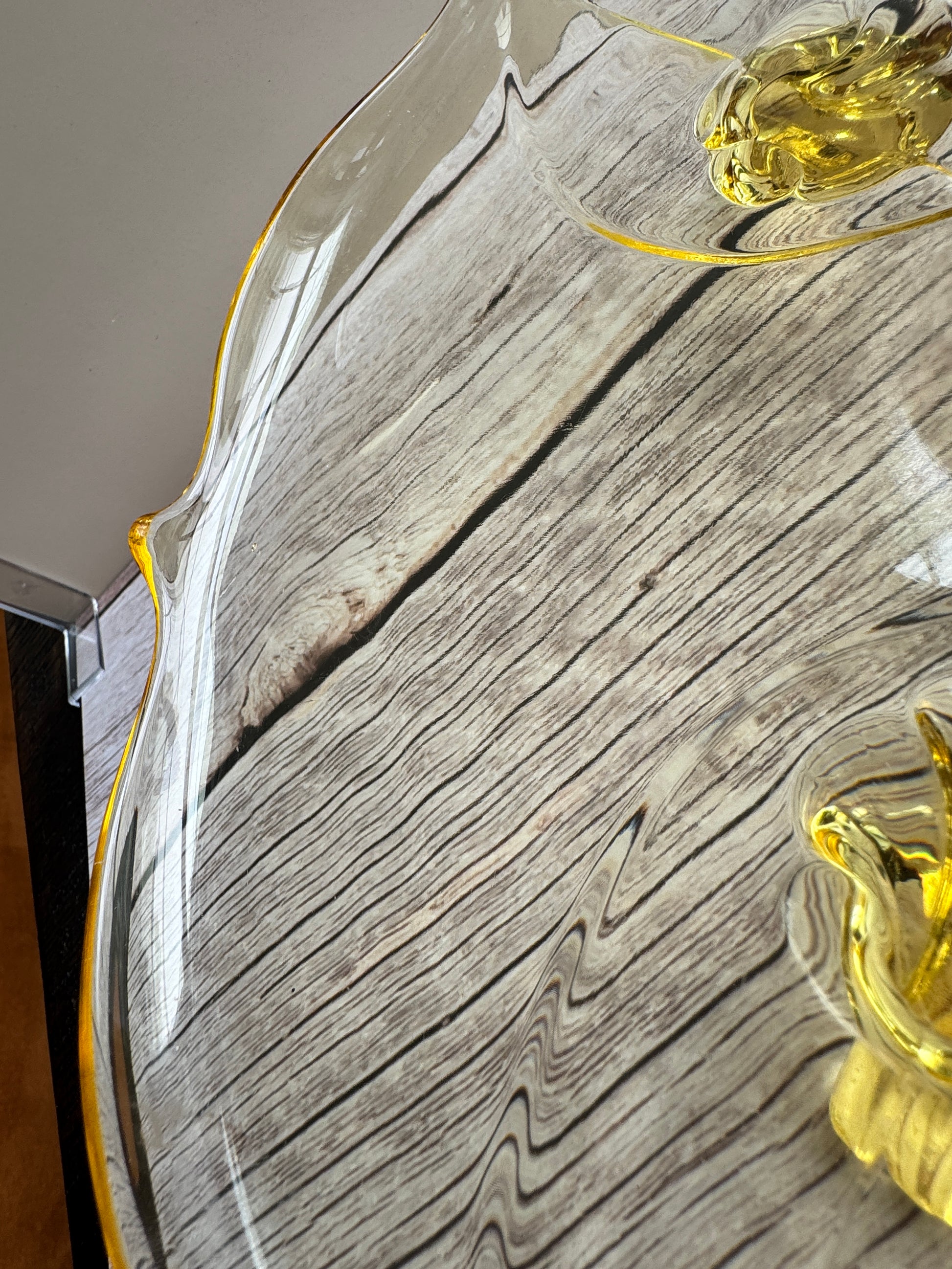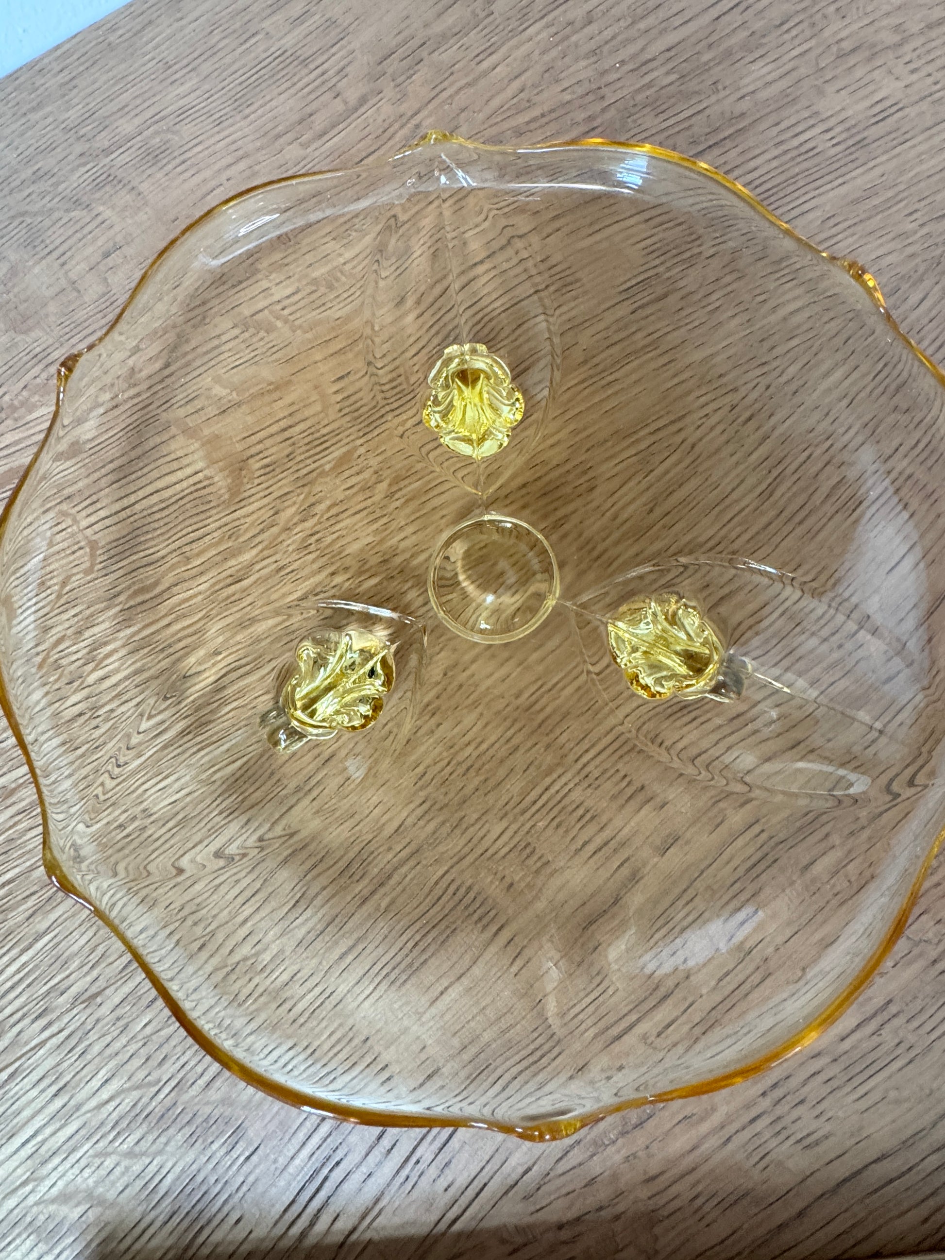 This luminous 1930s Lancaster Glass cake plate features the beloved Petal pattern in a rich topaz yellow—a stunning example of Depression glass design. With its scalloped edge, three ornate floral feet, and classic circular shape, it elevates any table with a touch of vintage elegance.