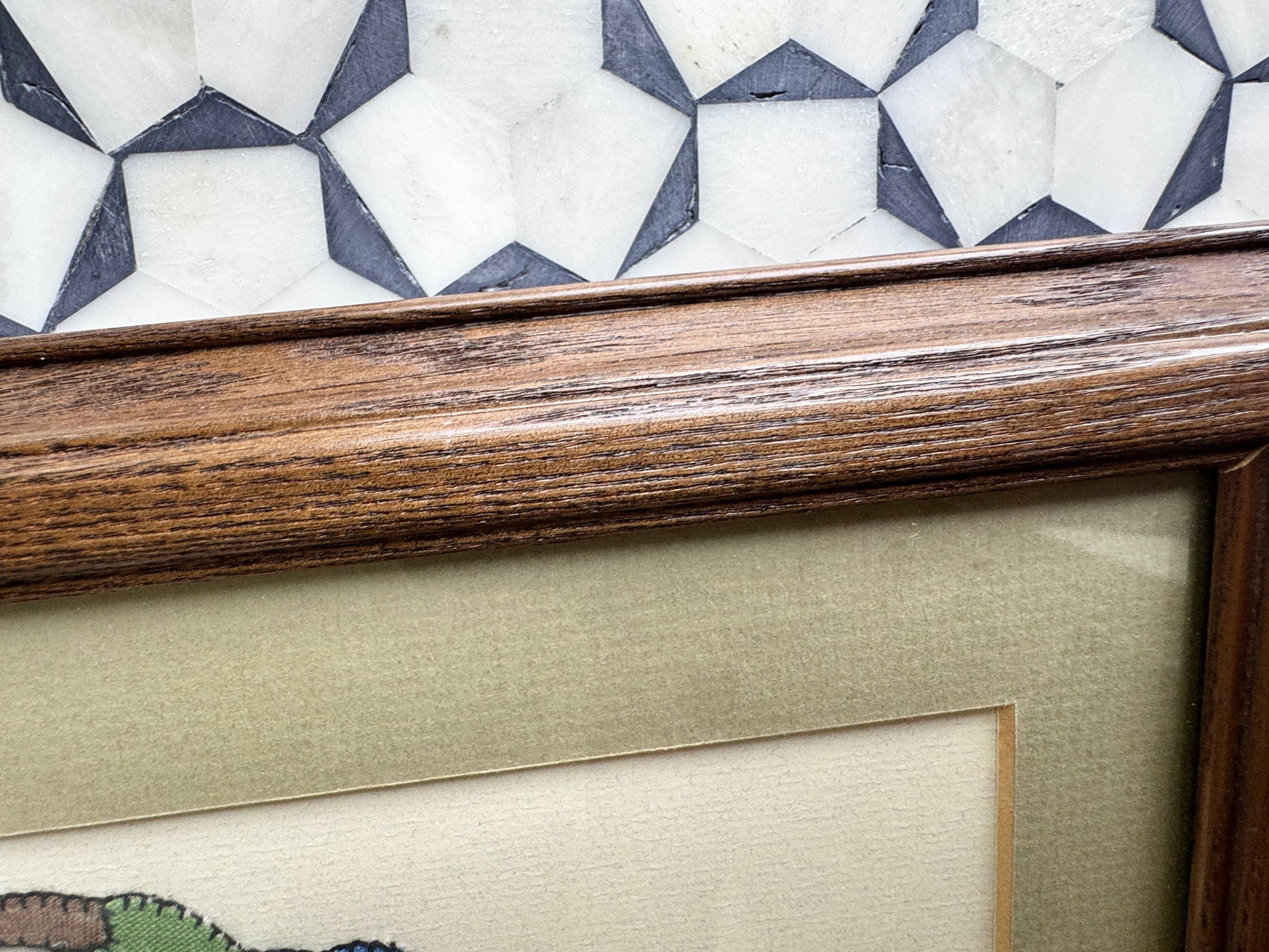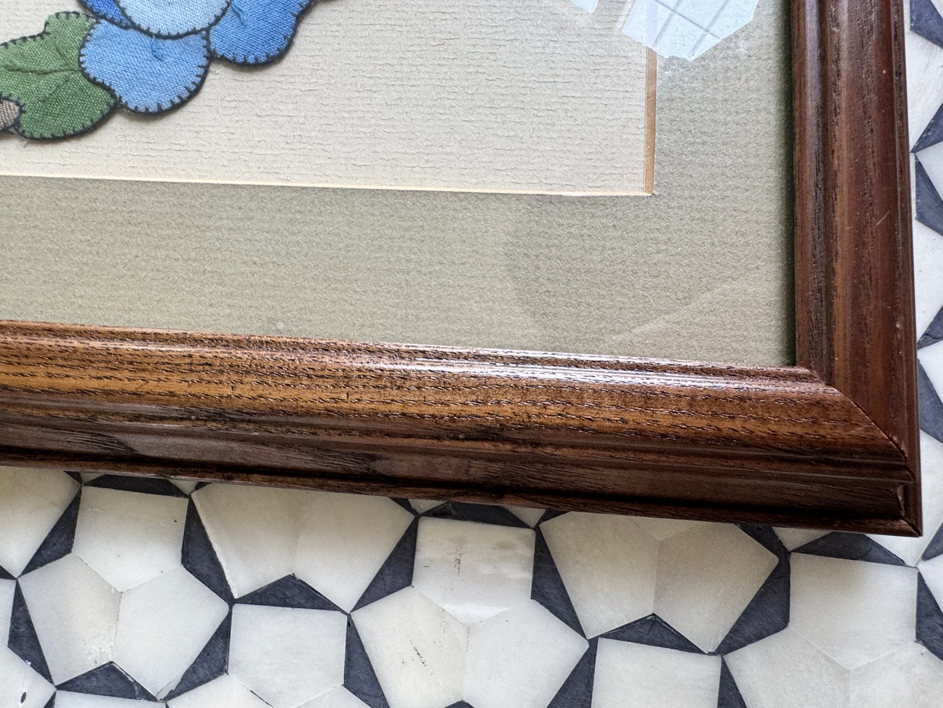 Professionally framed with a double mat in green and beige tones, this piece brings heirloom charm to any wall. The back is sealed with craft paper and wired for hanging. A Michaels label is present on the reverse, indicating the framing was done more recently to preserve the original fabric.