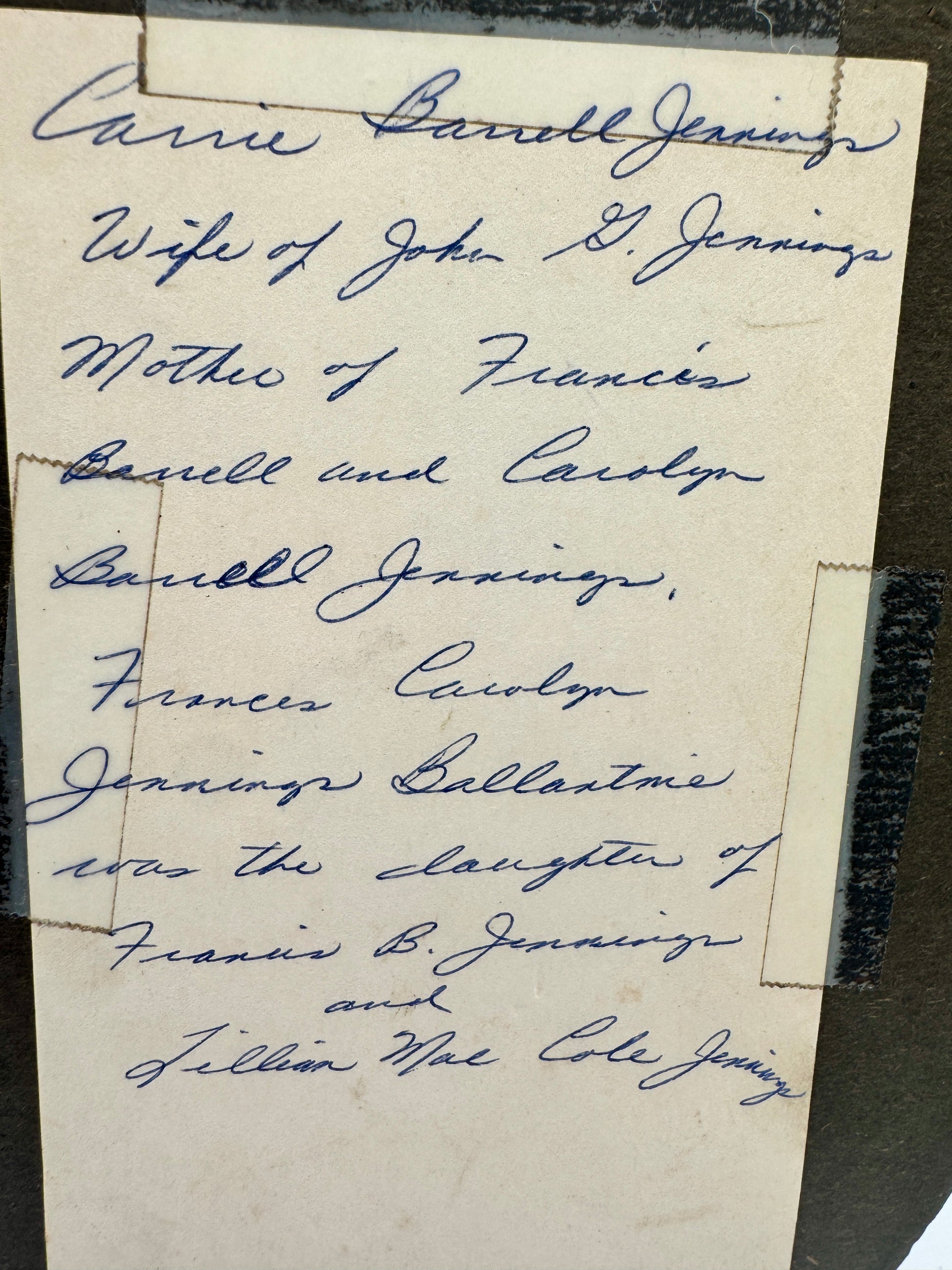 This antique oval frame holds more than meets the eye. On display is a sepia portrait of Carrie Barrell Jennings, wife of John G. Jennings, married in Sangamon County, Illinois in 1886. A handwritten family note affixed to the back documents her lineage, connecting her to multiple generations of the Jennings family.