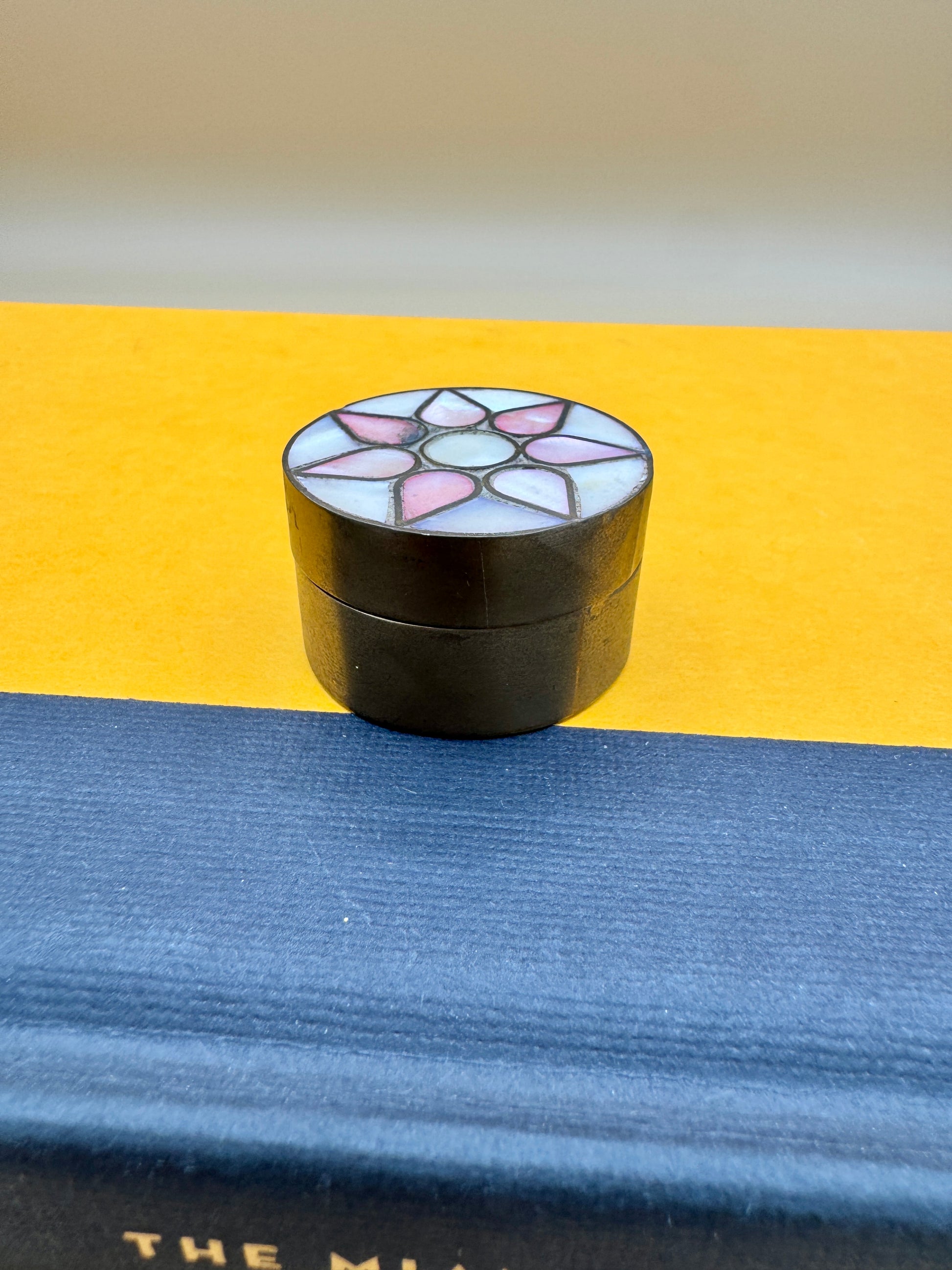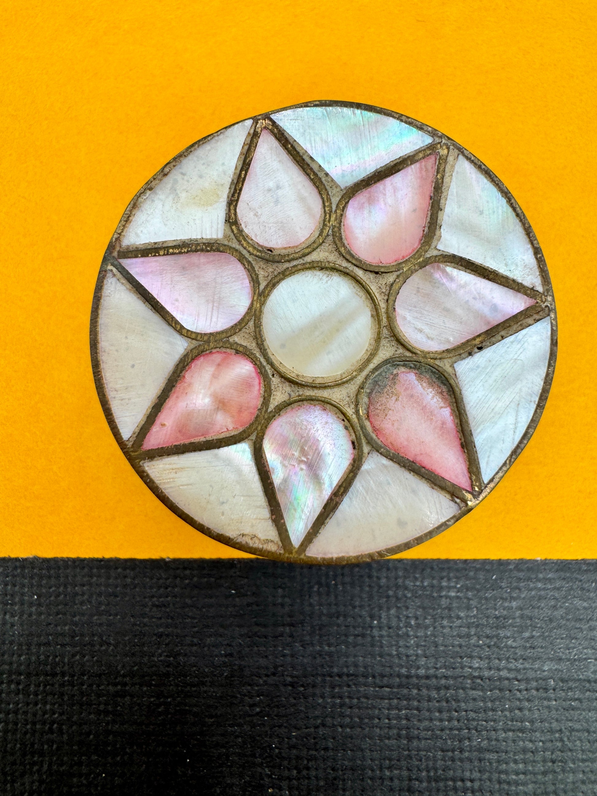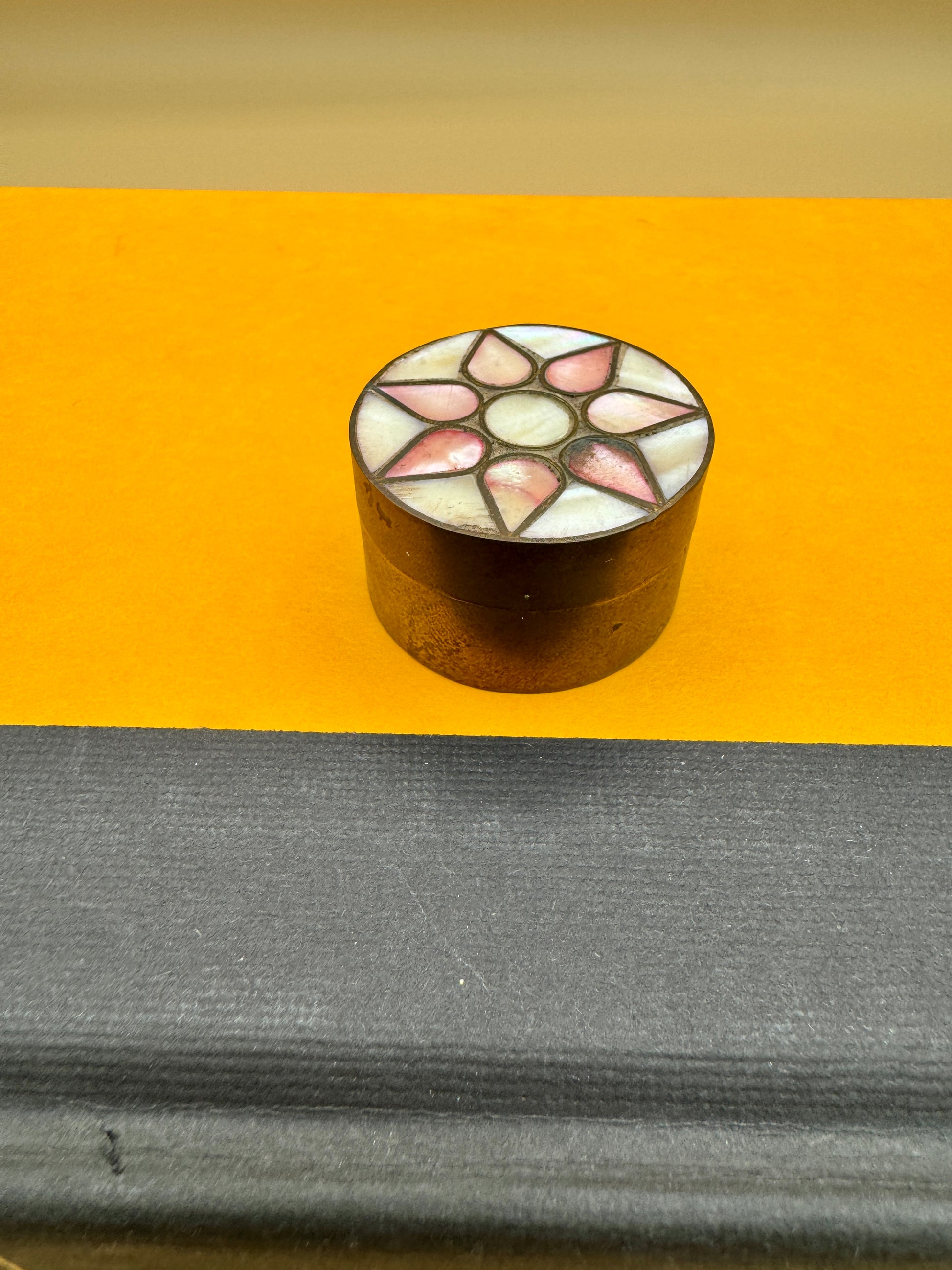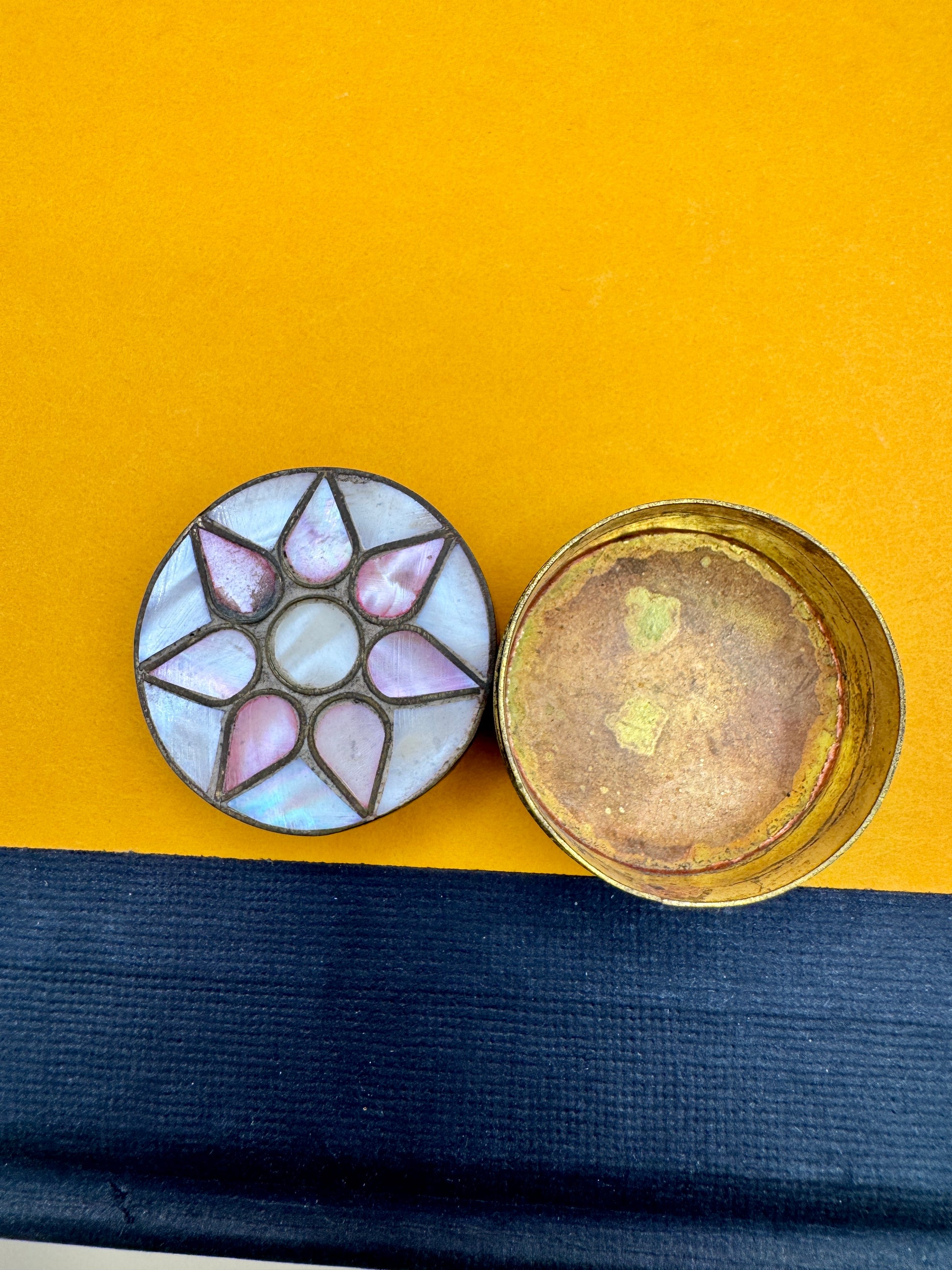 A charming vintage brass pill box featuring a delicate mother of pearl inlay on the lid, arranged in a floral starburst design with pink and white accents. Its compact size makes it perfect for storing pills, jewelry, or tiny keepsakes.