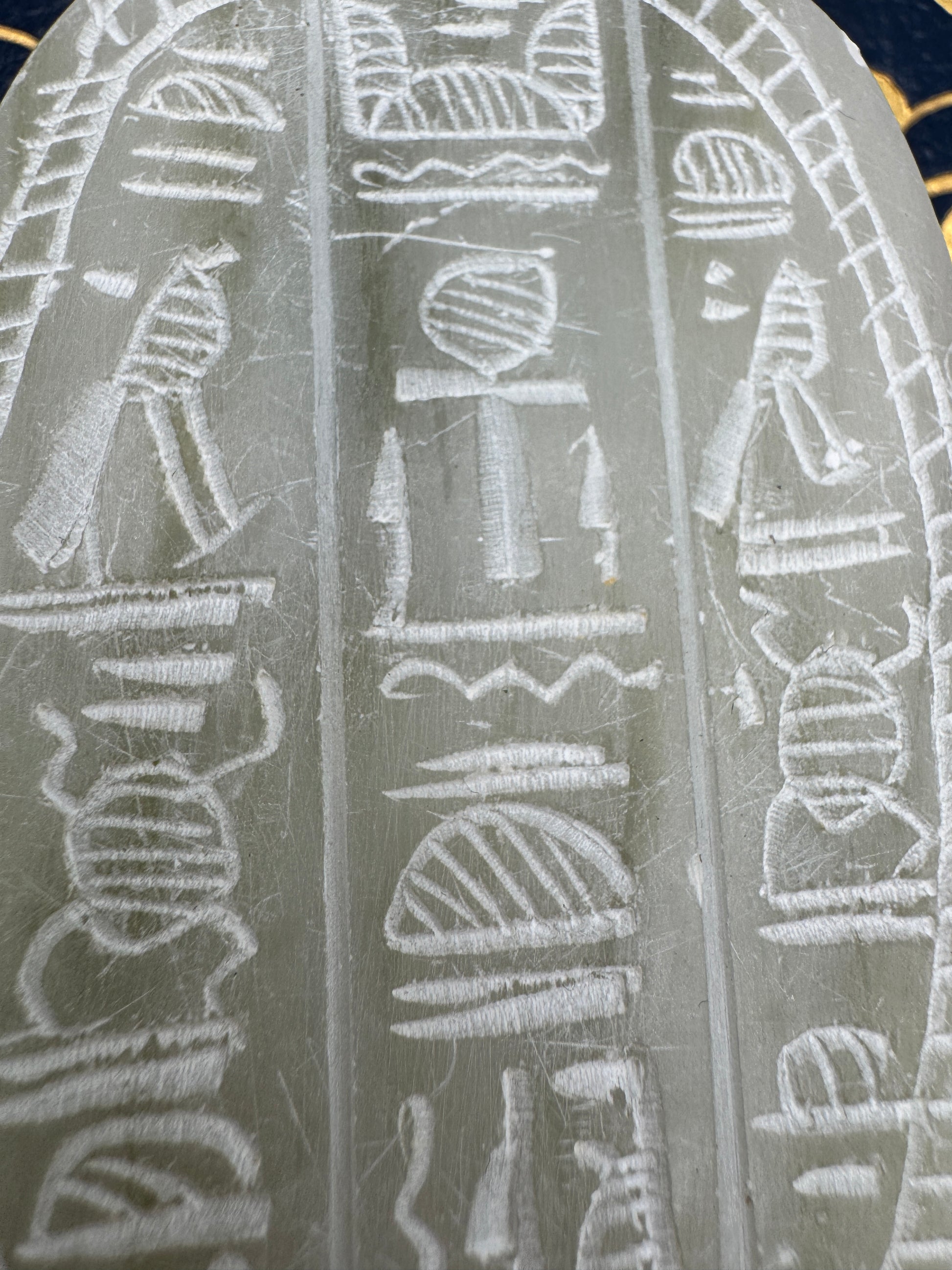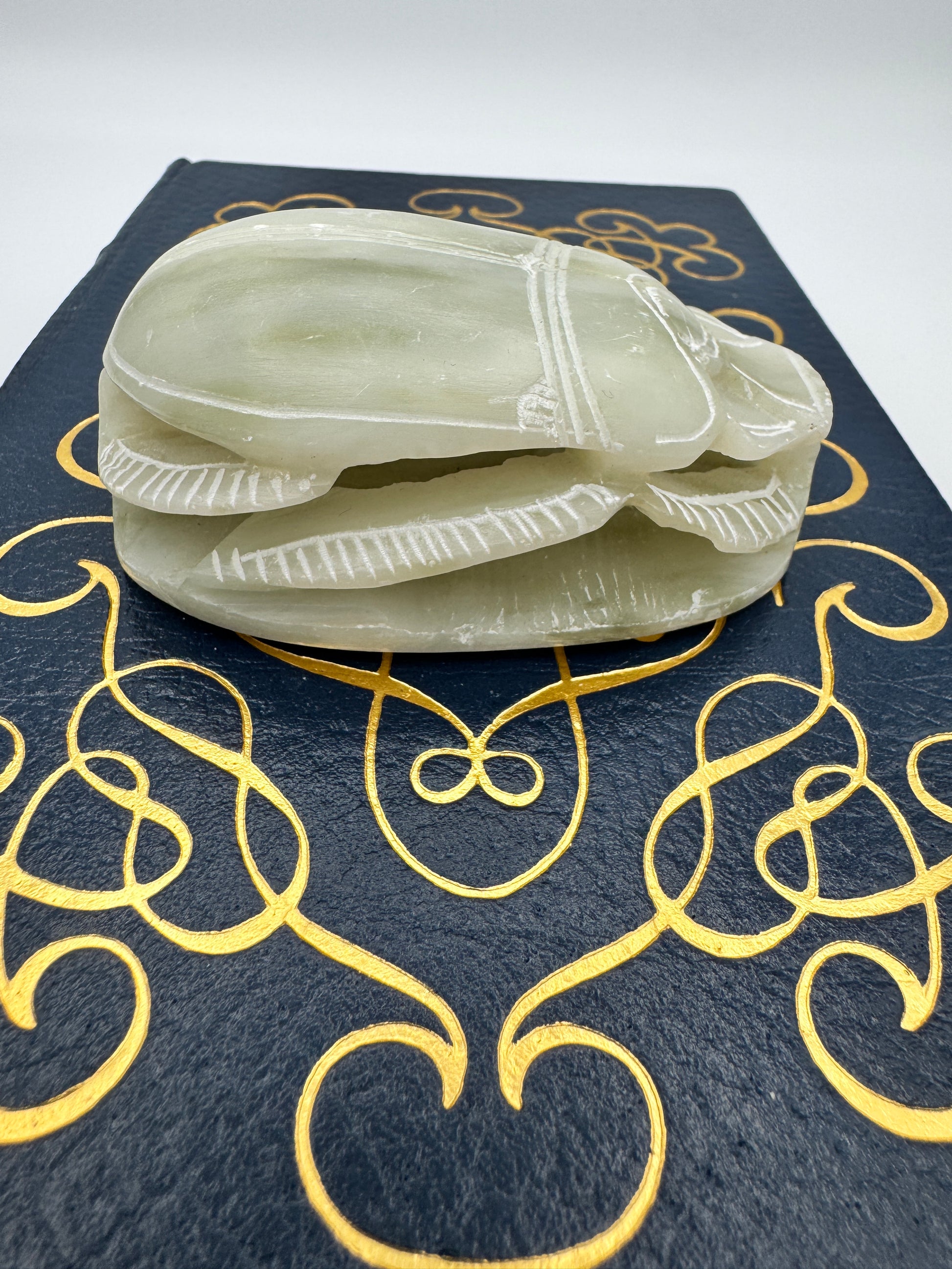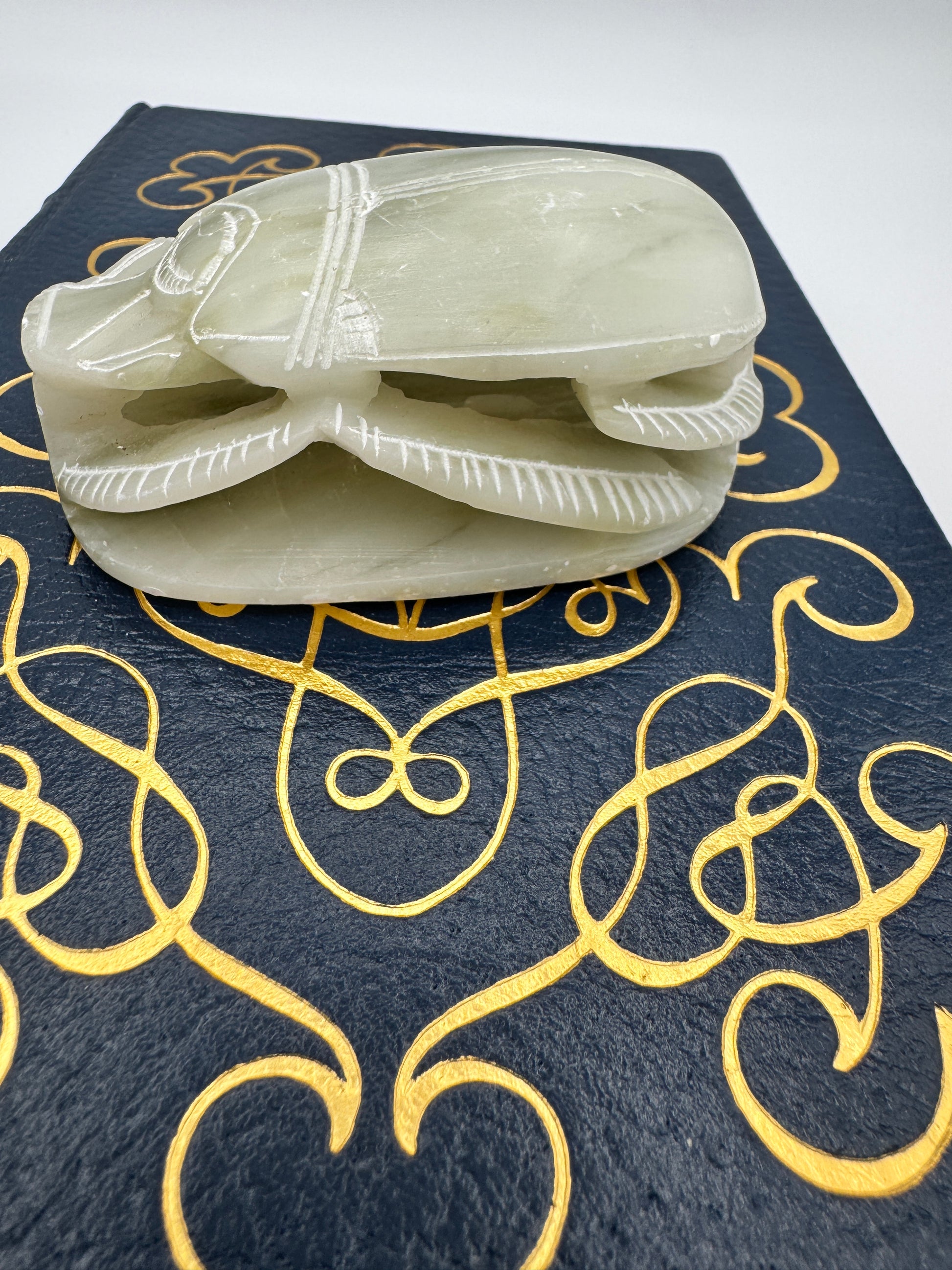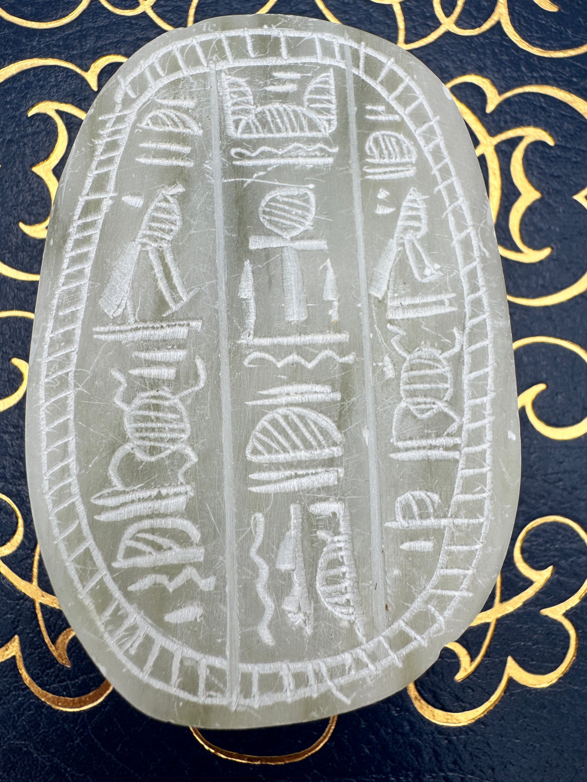 Hand-carved soapstone scarab with engraved hieroglyphs on the underside, measuring 3.5" long by 1.5" high. Scarabs were powerful symbols in ancient Egypt, associated with renewal, protection, and the sun god Khepri. This piece captures that legacy in a decorative carving, perfect for display on a shelf, desk, or as part of a collection of Egyptian-inspired art.