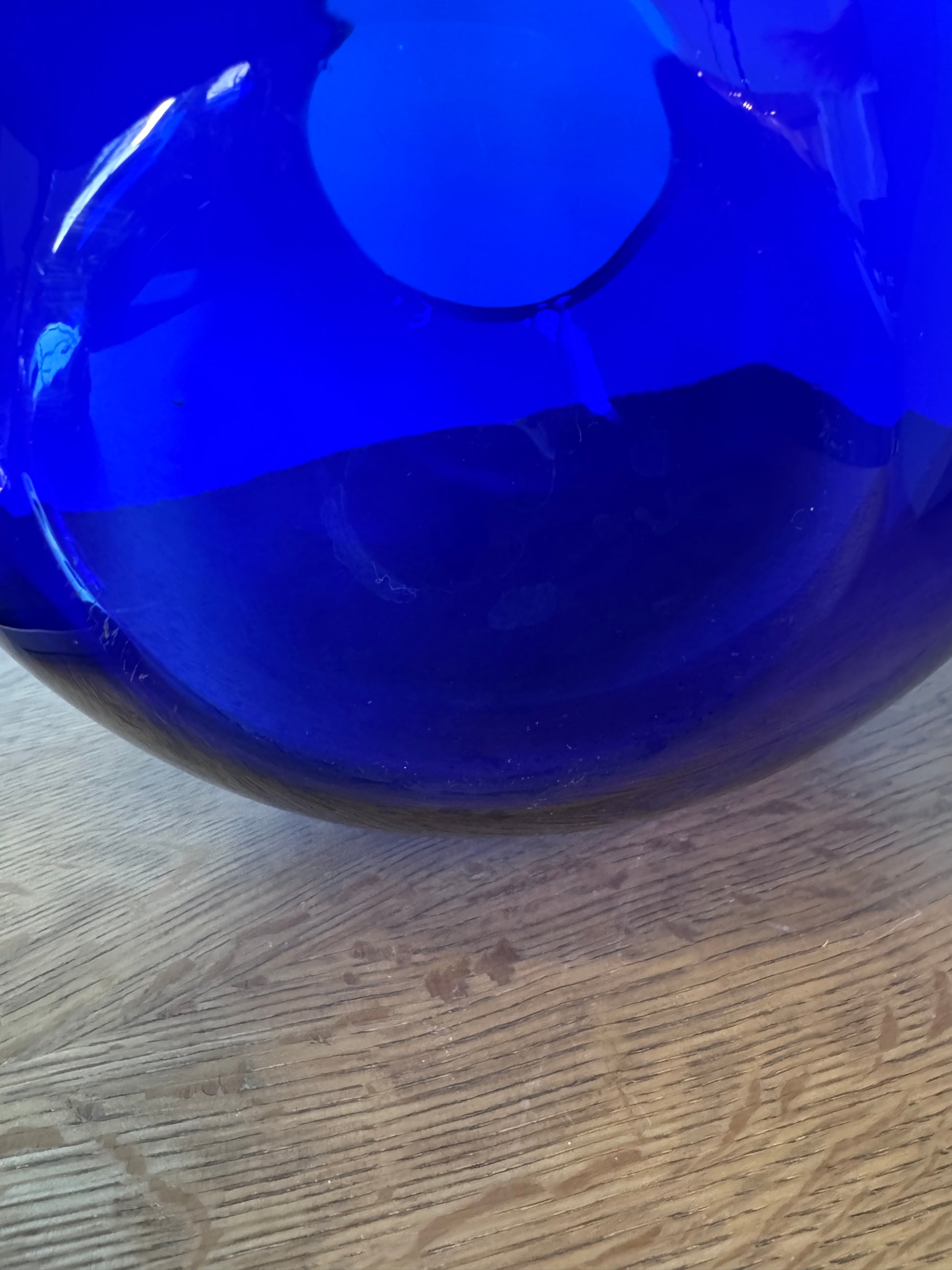 Deep cobalt blue, thick hand-blown glass globe vase. Heavy and dramatic (5.6 lbs) with a perfectly round silhouette — bold modern shape with old-world glassmaking.