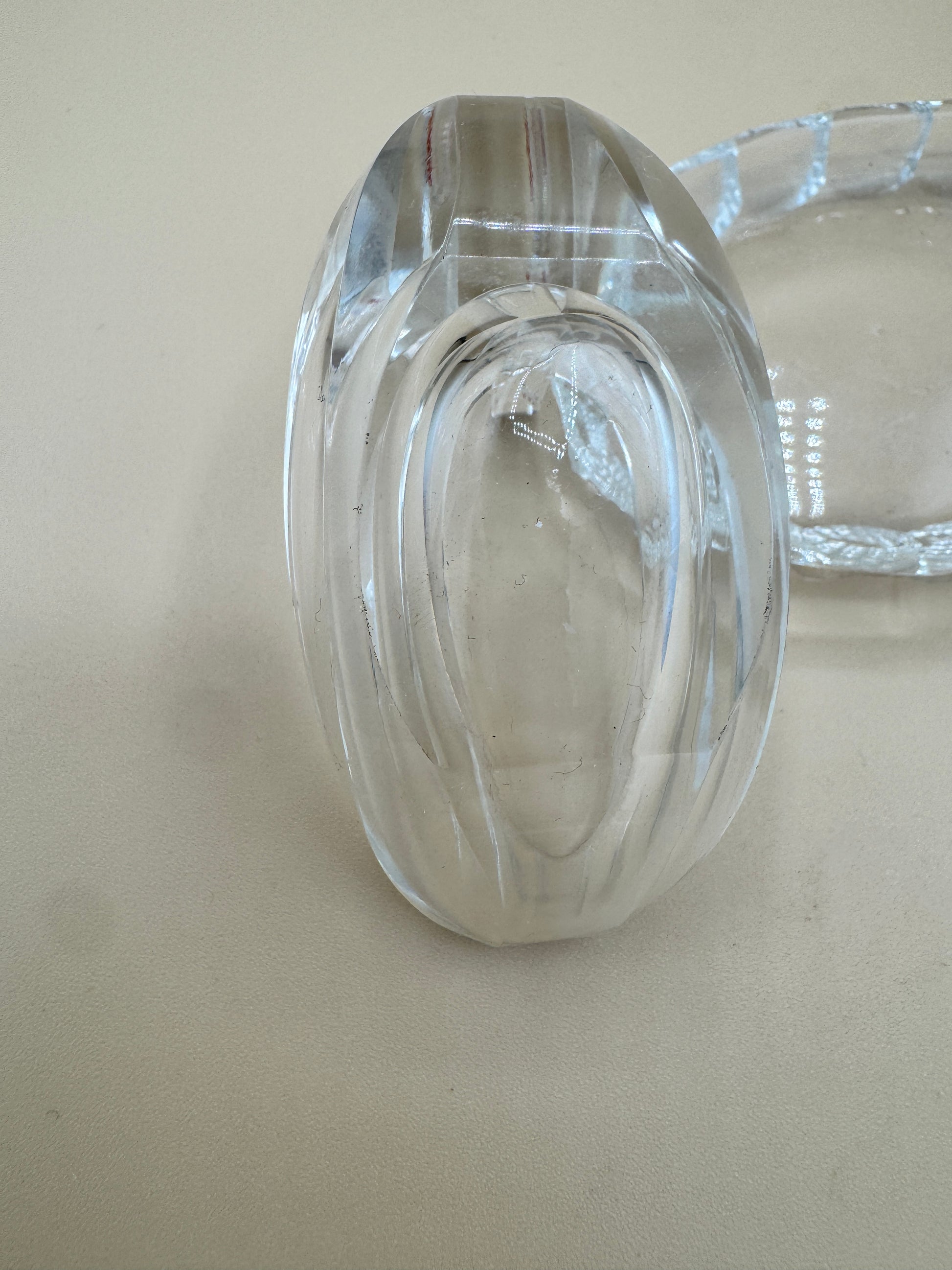 This petite crystal duck salt cellar was crafted in Czechoslovakia. The clear crystal body is beautifully detailed, with hand-painted red eyes adding a playful accent. Originally designed as a functional salt holder, this piece also works as a unique trinket dish or decorative collectible.