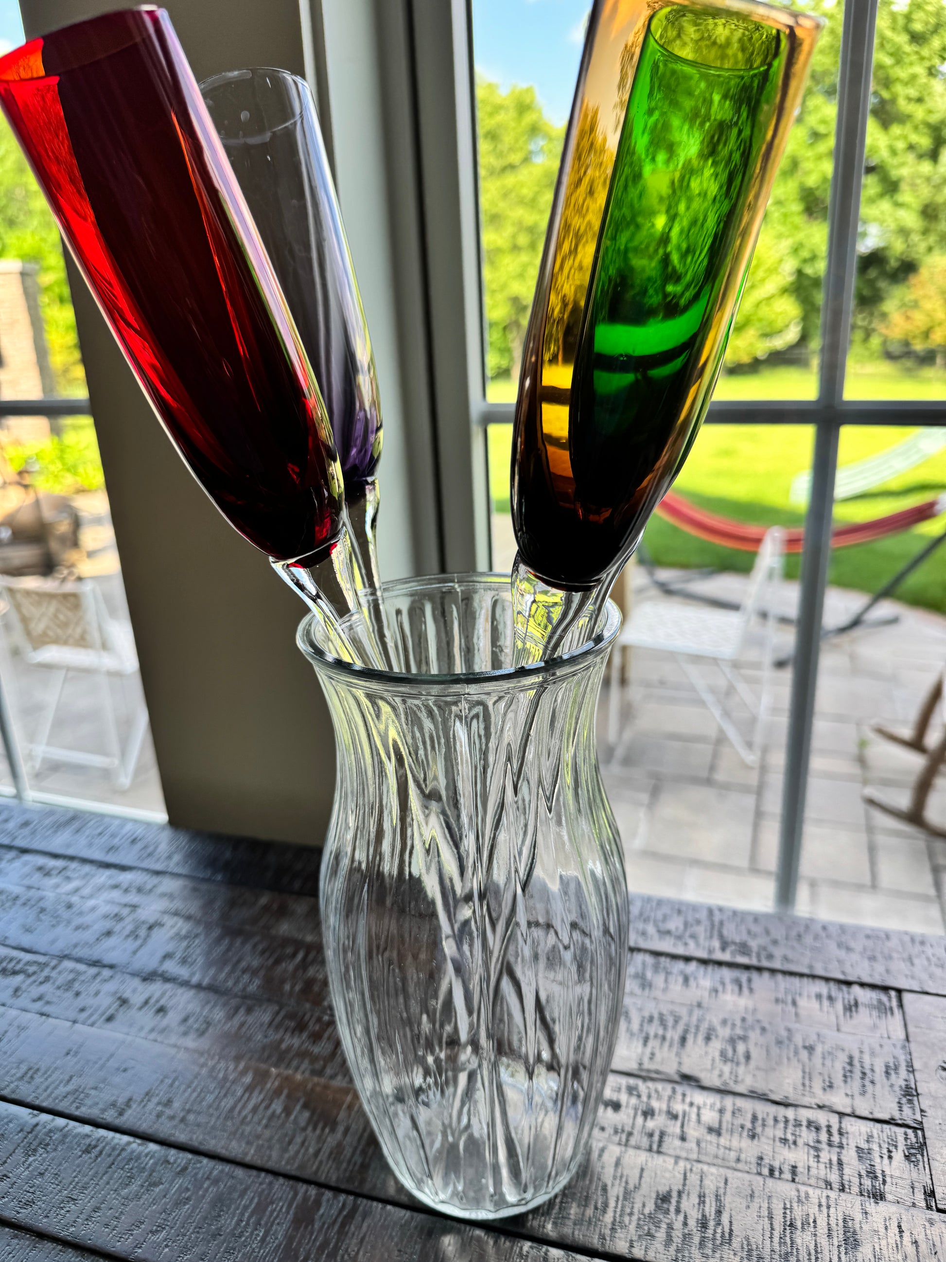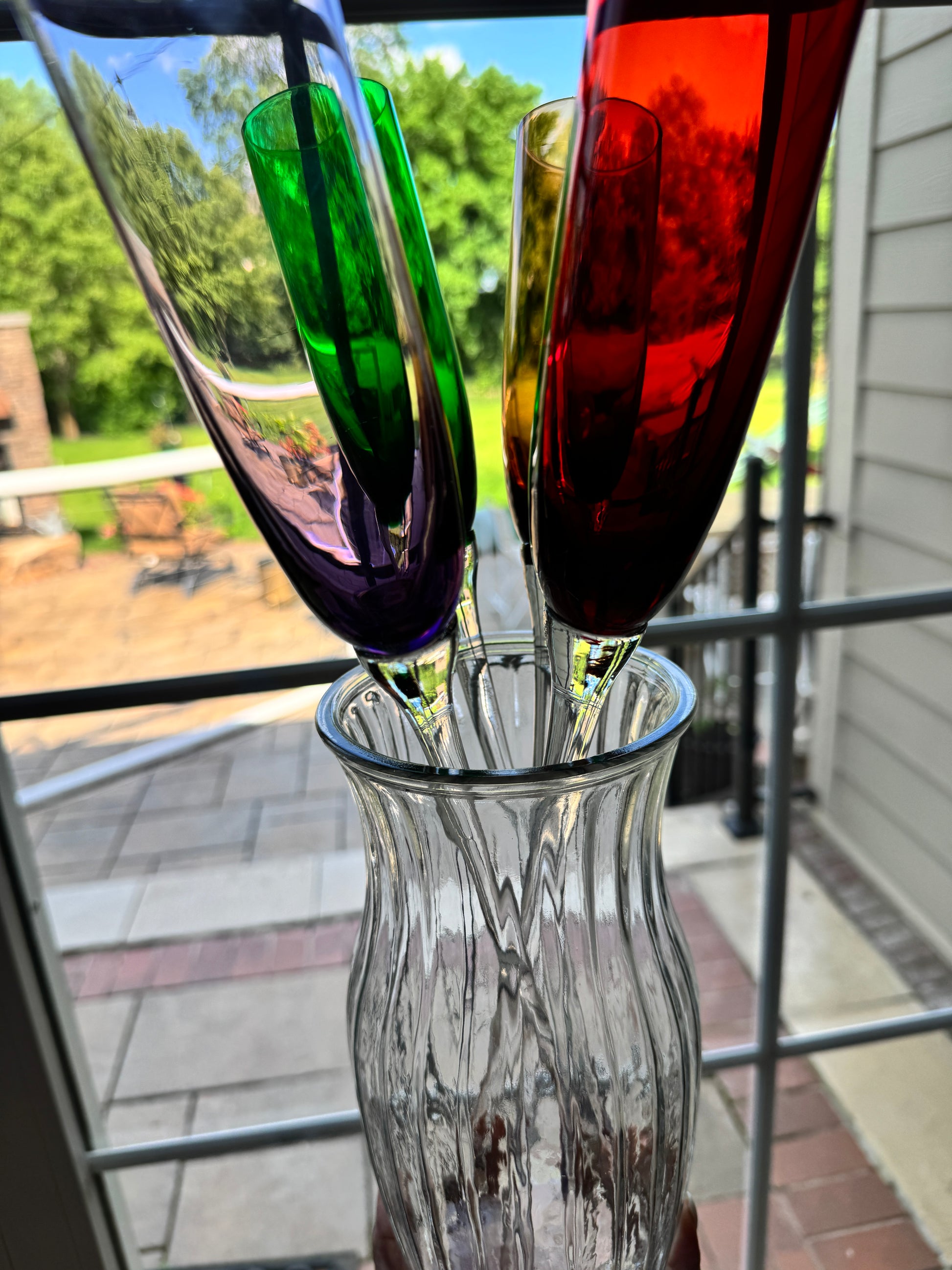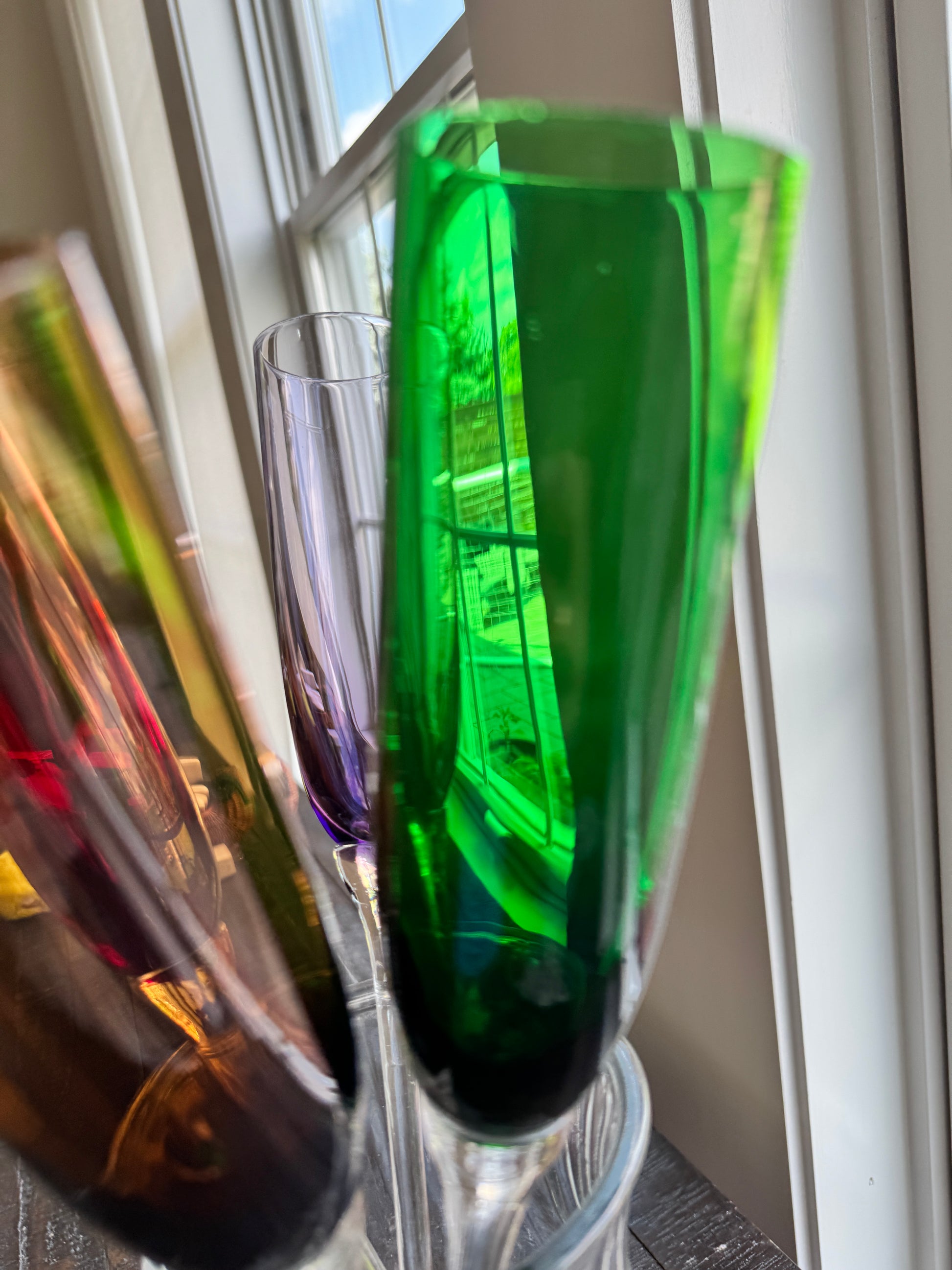 Curated Handblown Rainbow Champagne Flute Set (Set of 4 + Display Vase