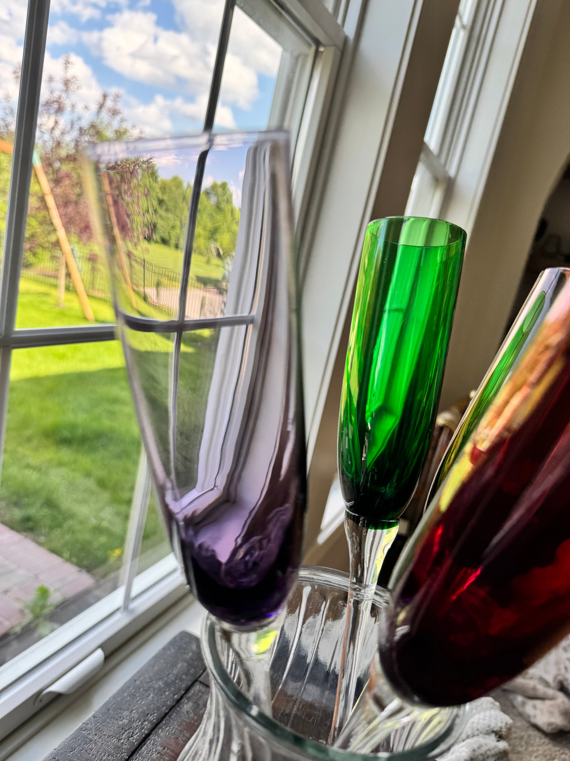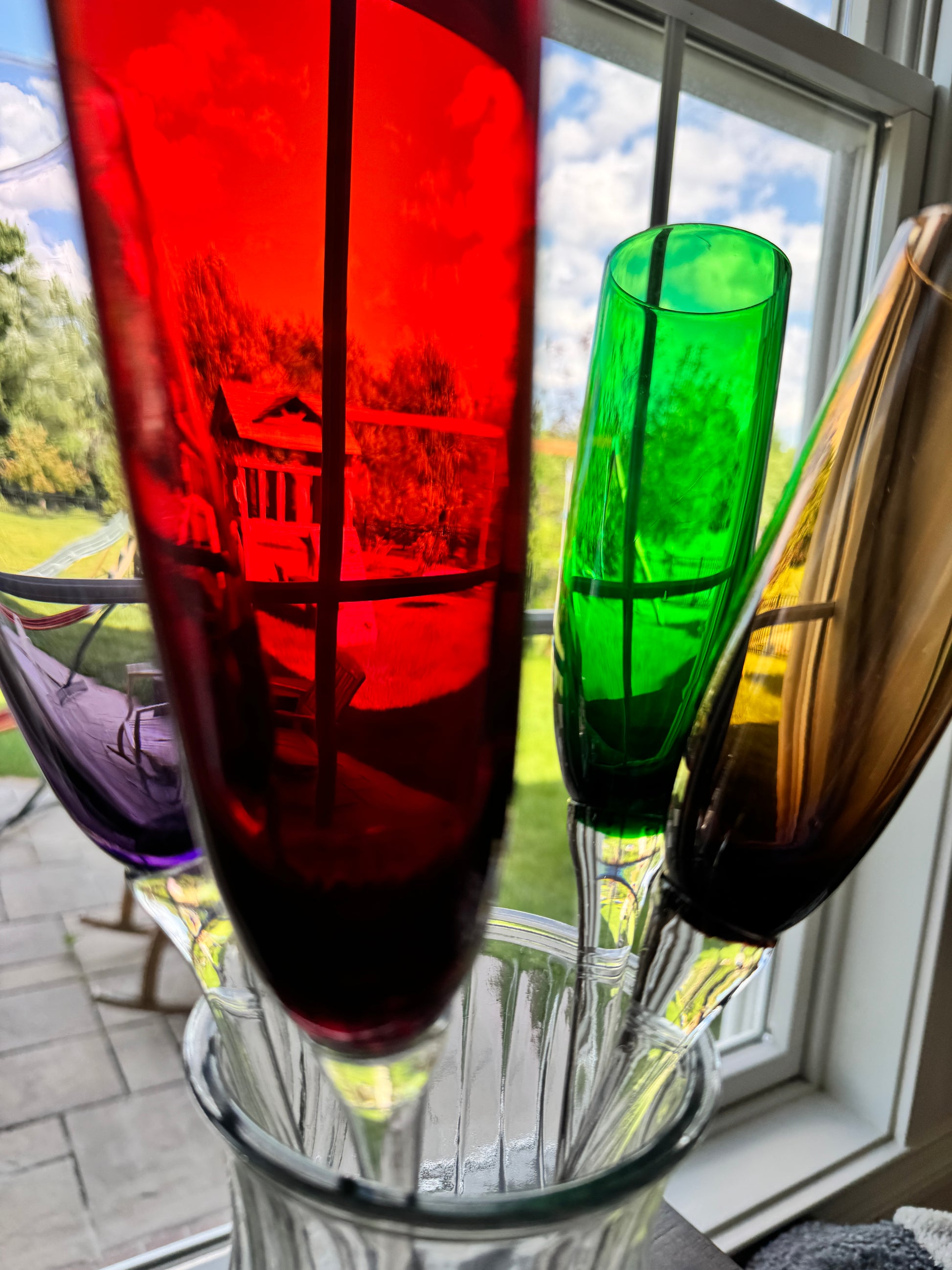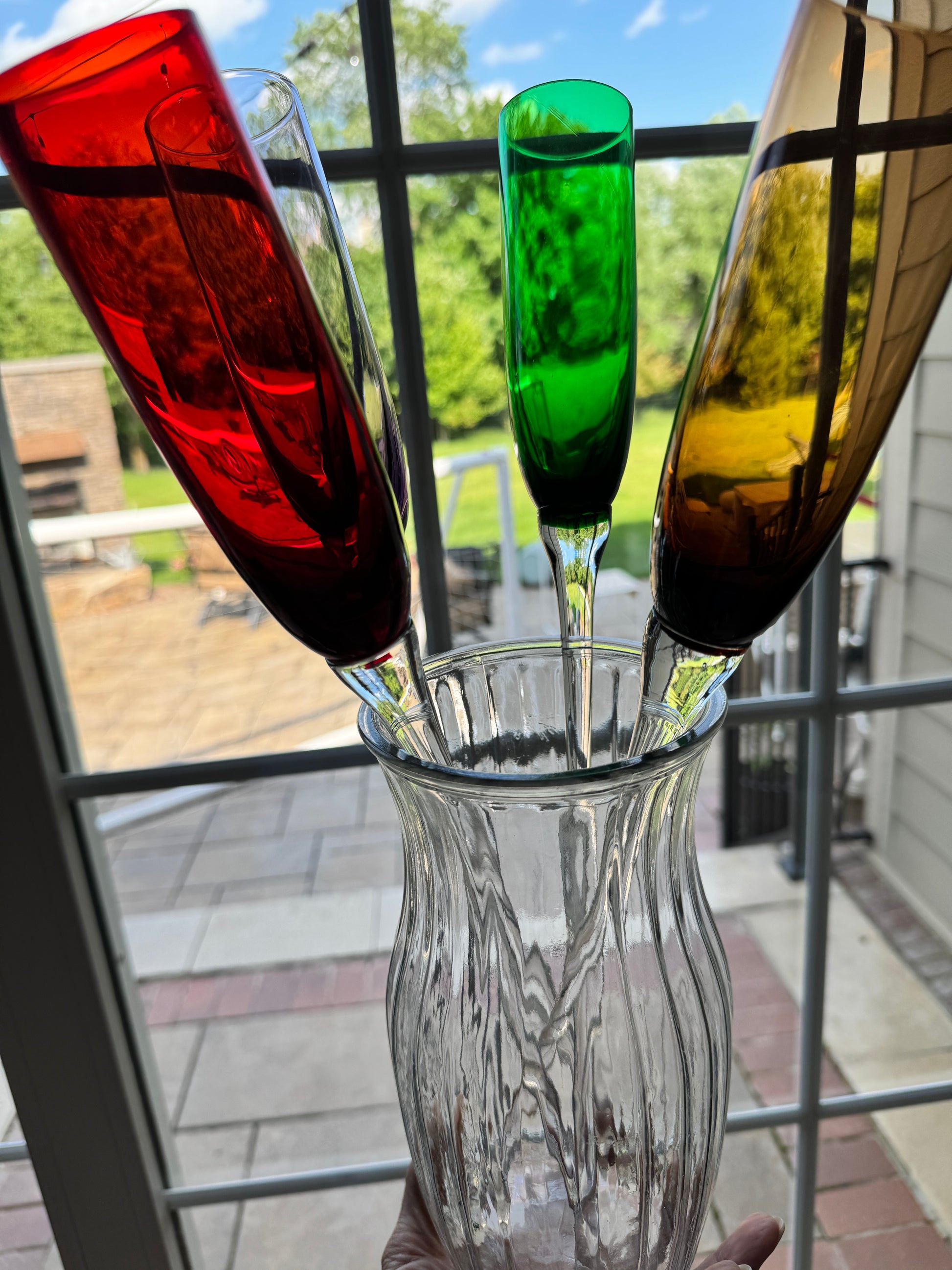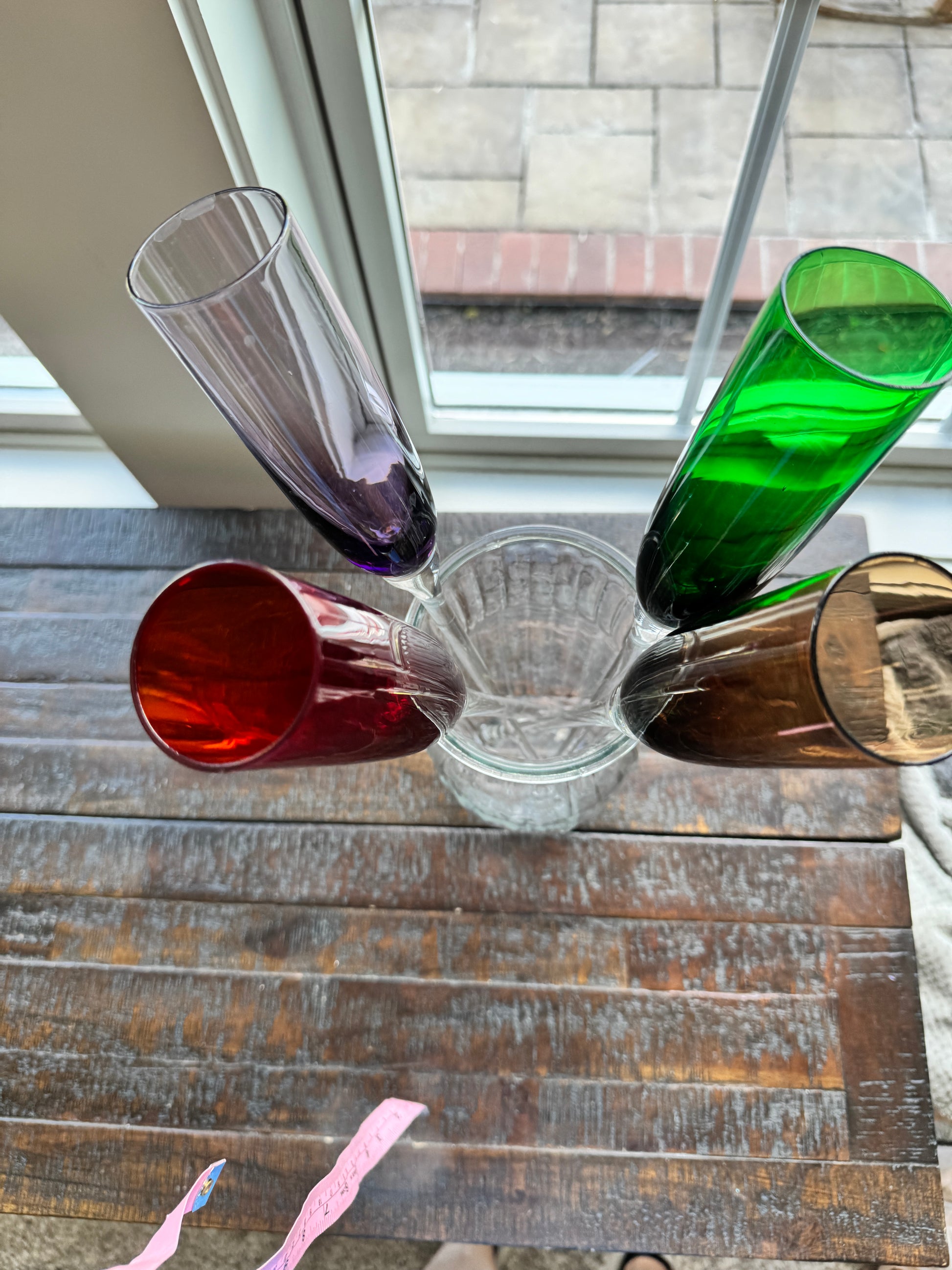 Curated Handblown Rainbow Champagne Flute Set (Set of 4 + Display Vase