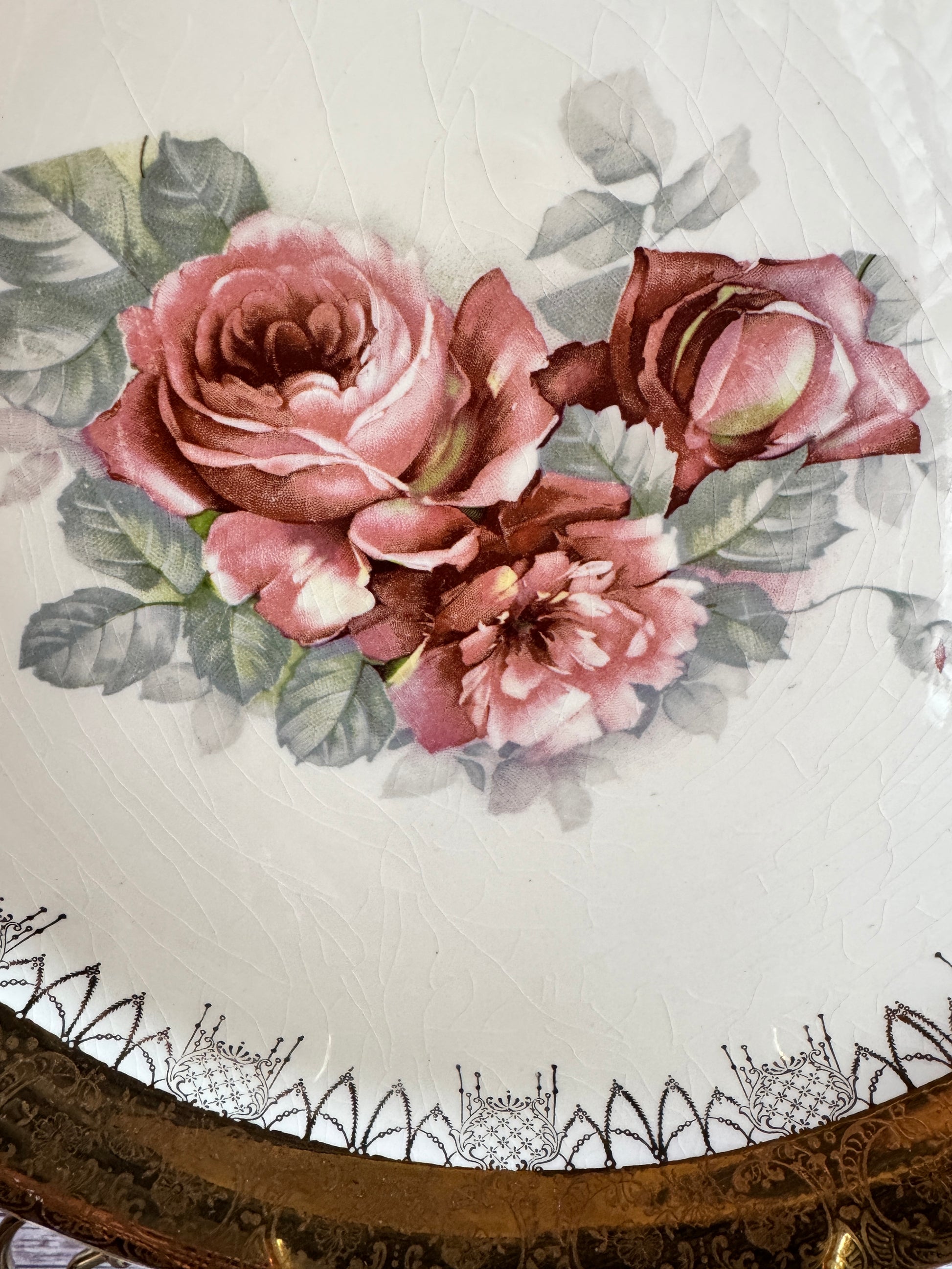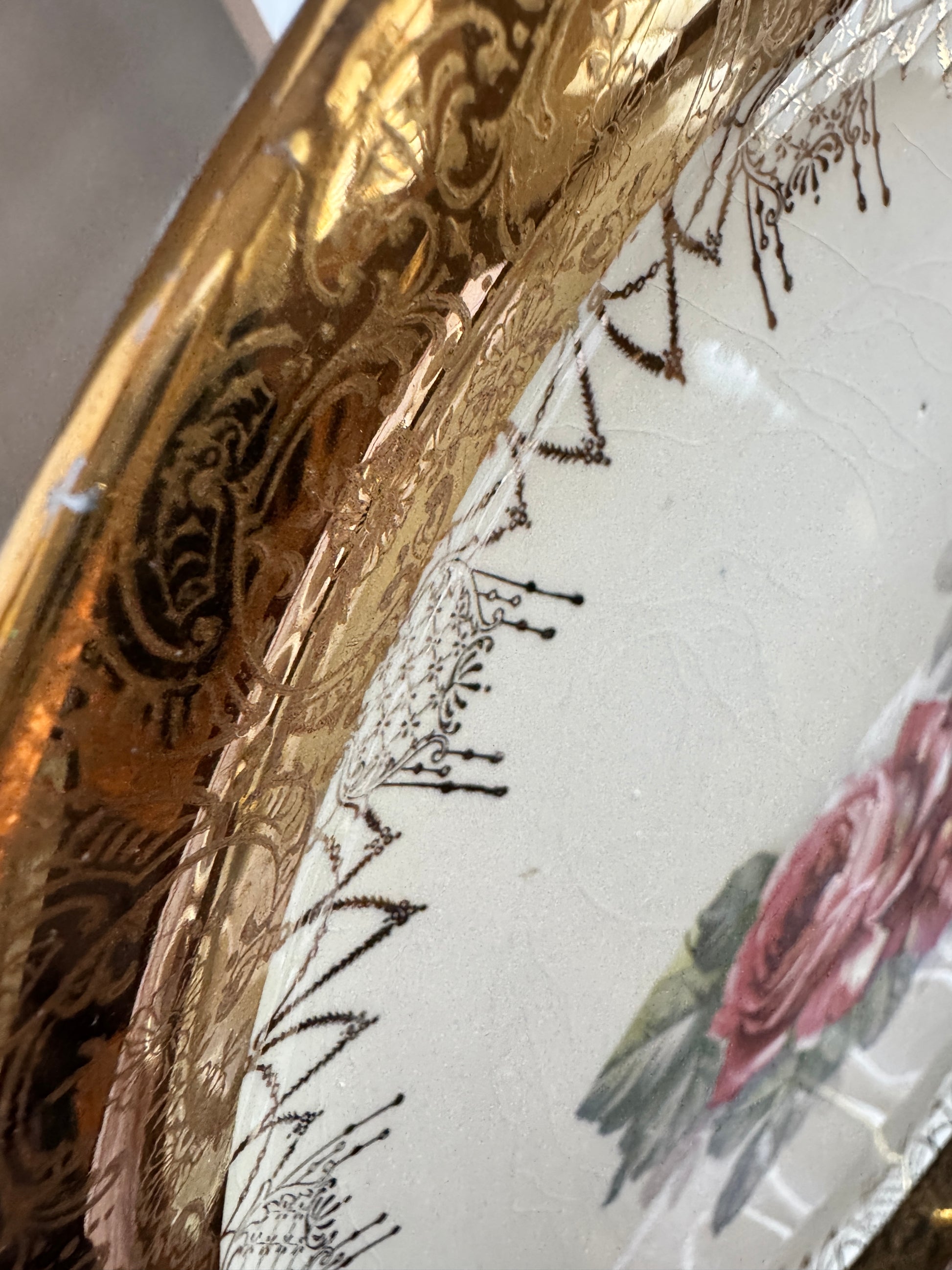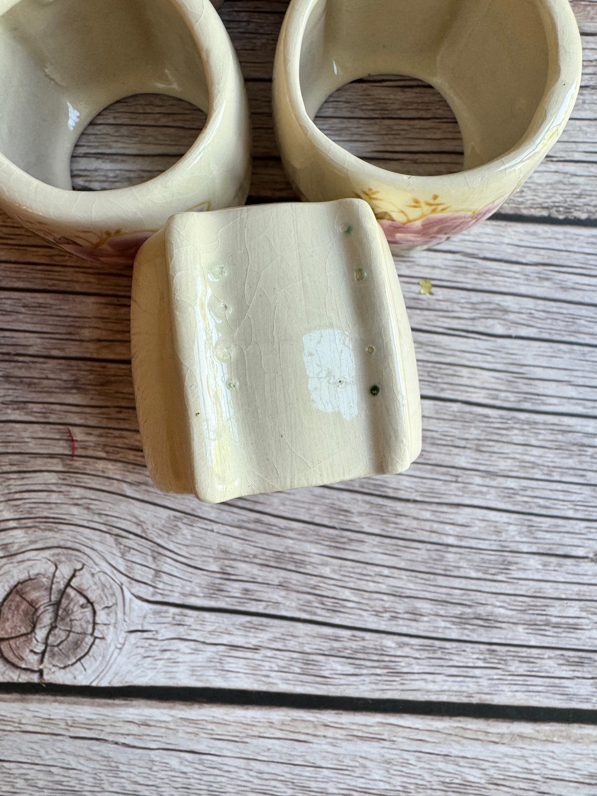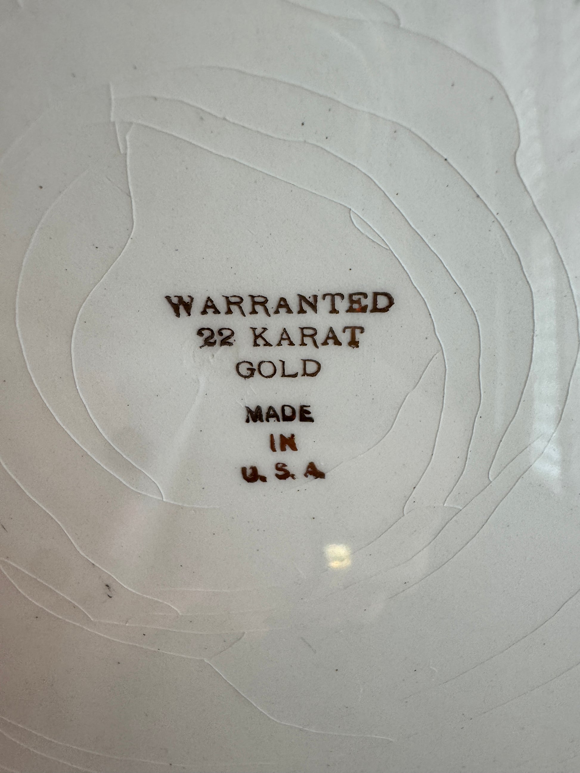 The platter, likely from the 1950s–60s, features a soft glaze and a hand-applied 22-karat gold rim — a detail once reserved for refined American dinnerware. The napkin rings, with their visible crazing, blue kiln marks, and small chips, echo the warmth and history of well-loved tableware.
