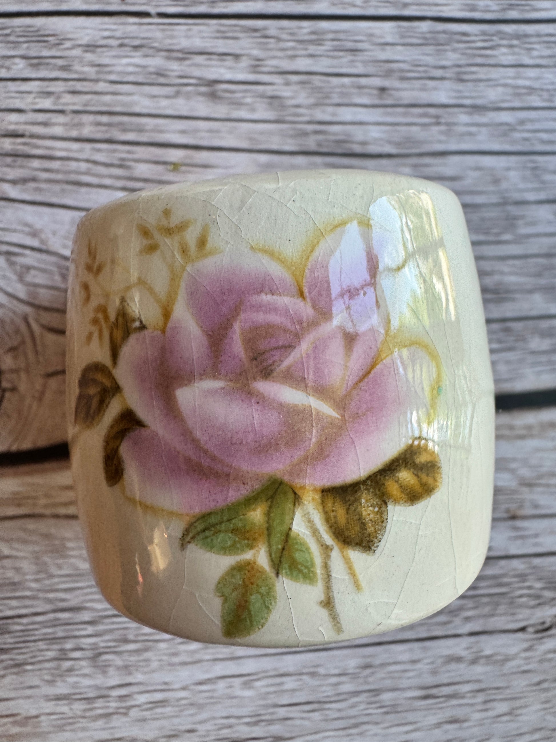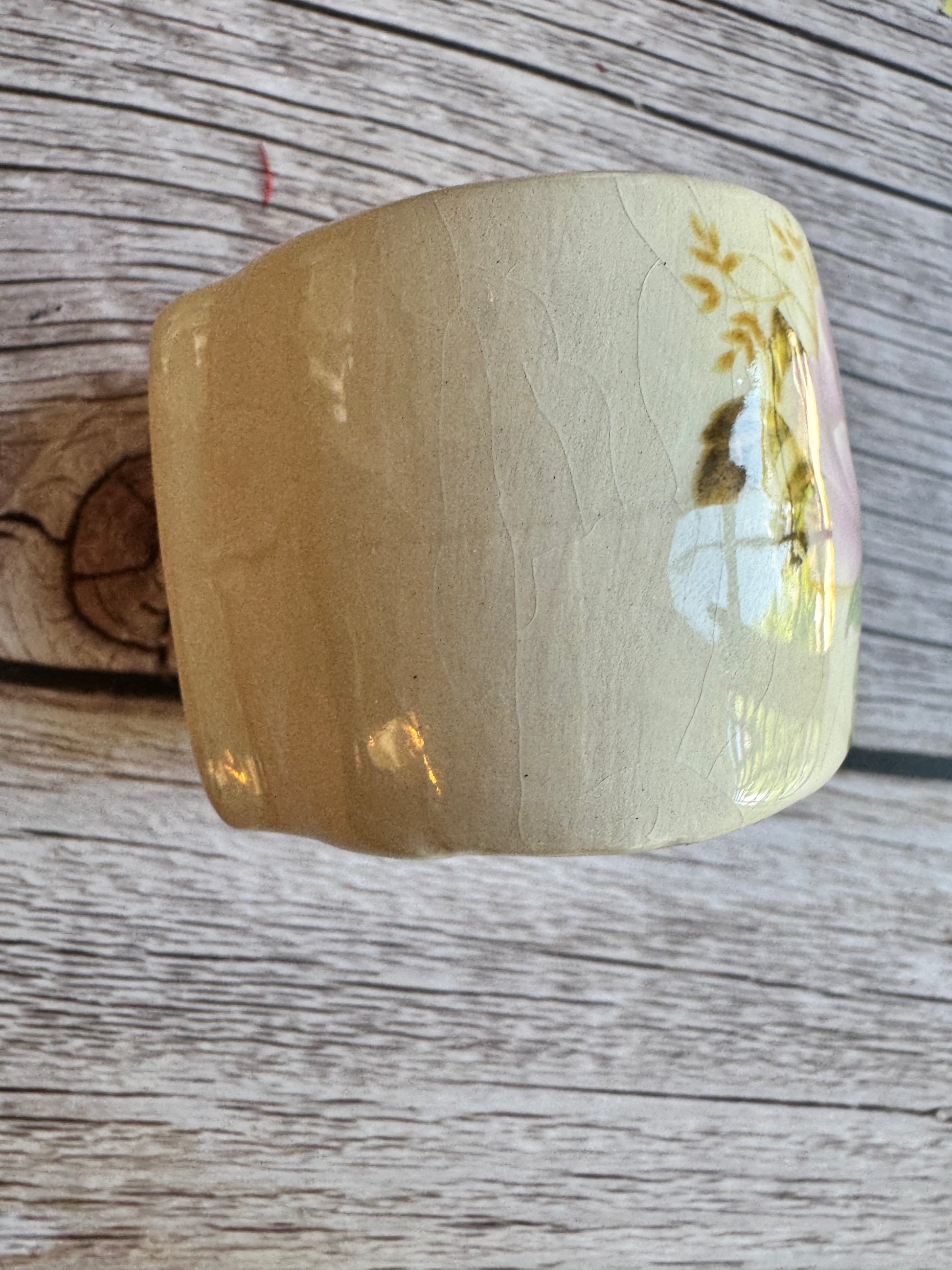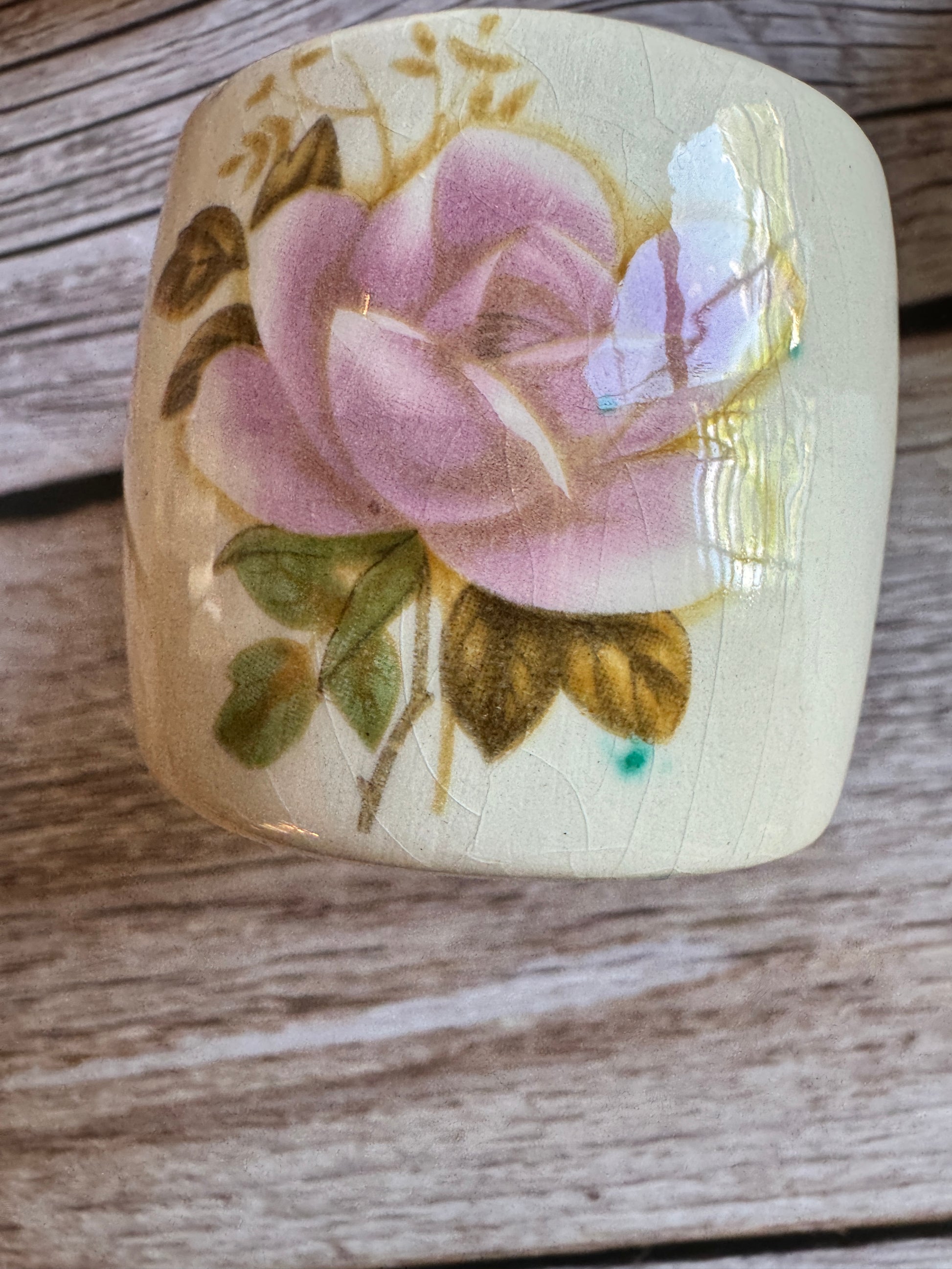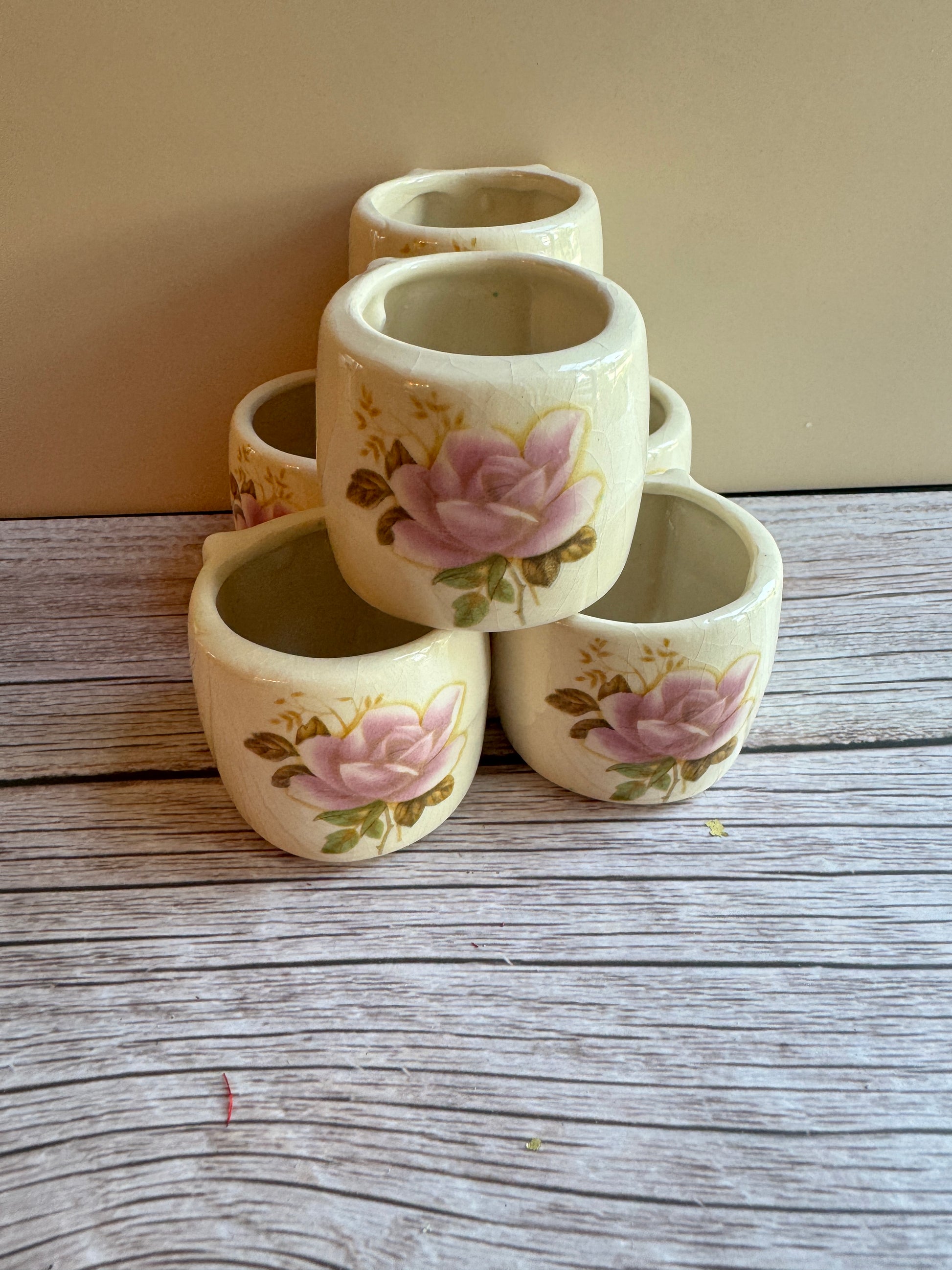 The platter, likely from the 1950s–60s, features a soft glaze and a hand-applied 22-karat gold rim — a detail once reserved for refined American dinnerware. The napkin rings, with their visible crazing, blue kiln marks, and small chips, echo the warmth and history of well-loved tableware.