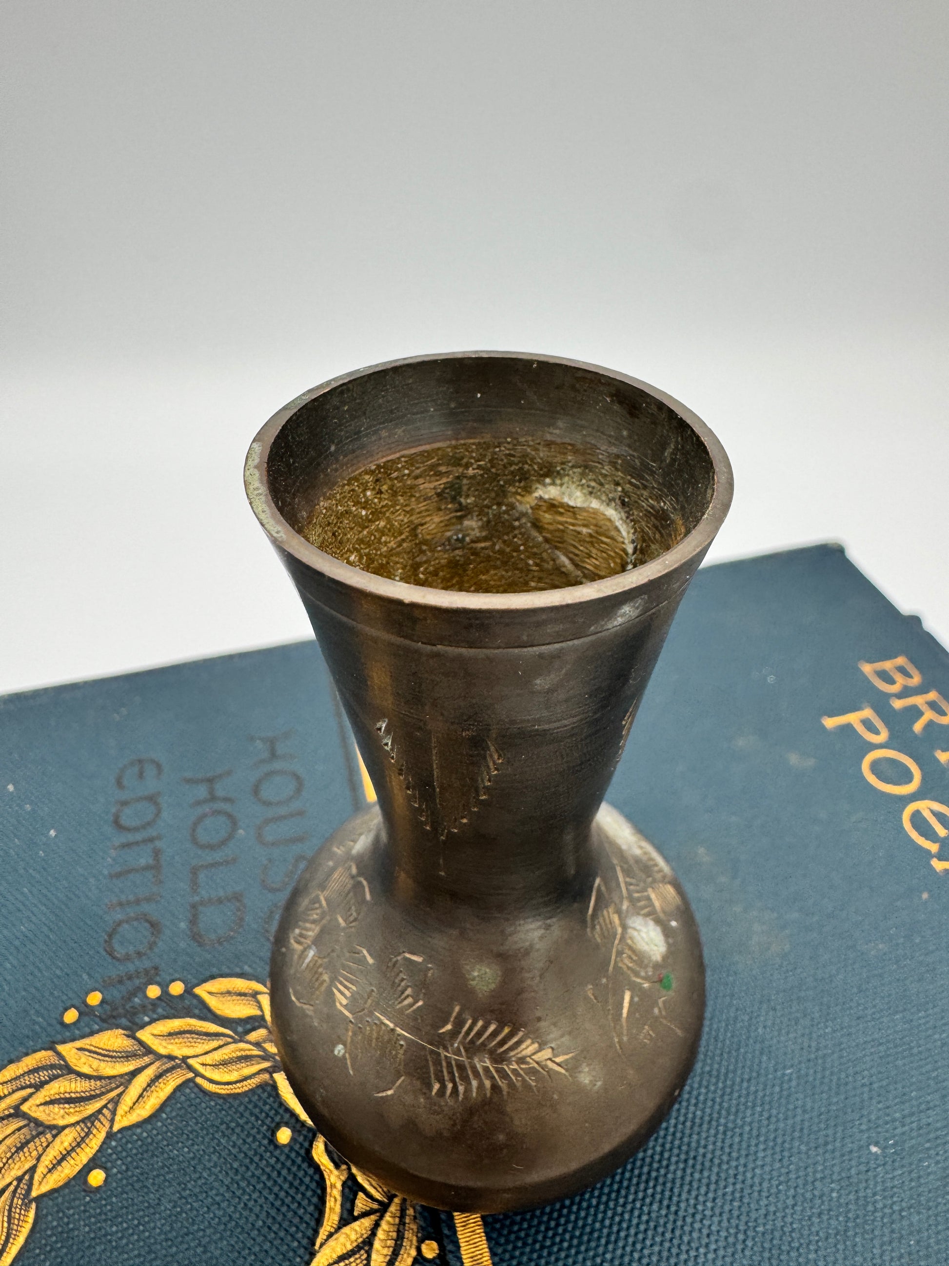 A petite vintage brass vase with a naturally aged dark patina and hand-etched leaf motifs. Measuring 3 inches tall with a 2-inch wide base, this small vessel carries timeless charm in its compact form. Display it as-is for a moody, antique look, or polish it to reveal its warm golden shine. Perfect for styling a single bloom, incense, or as part of a layered vintage vignette.