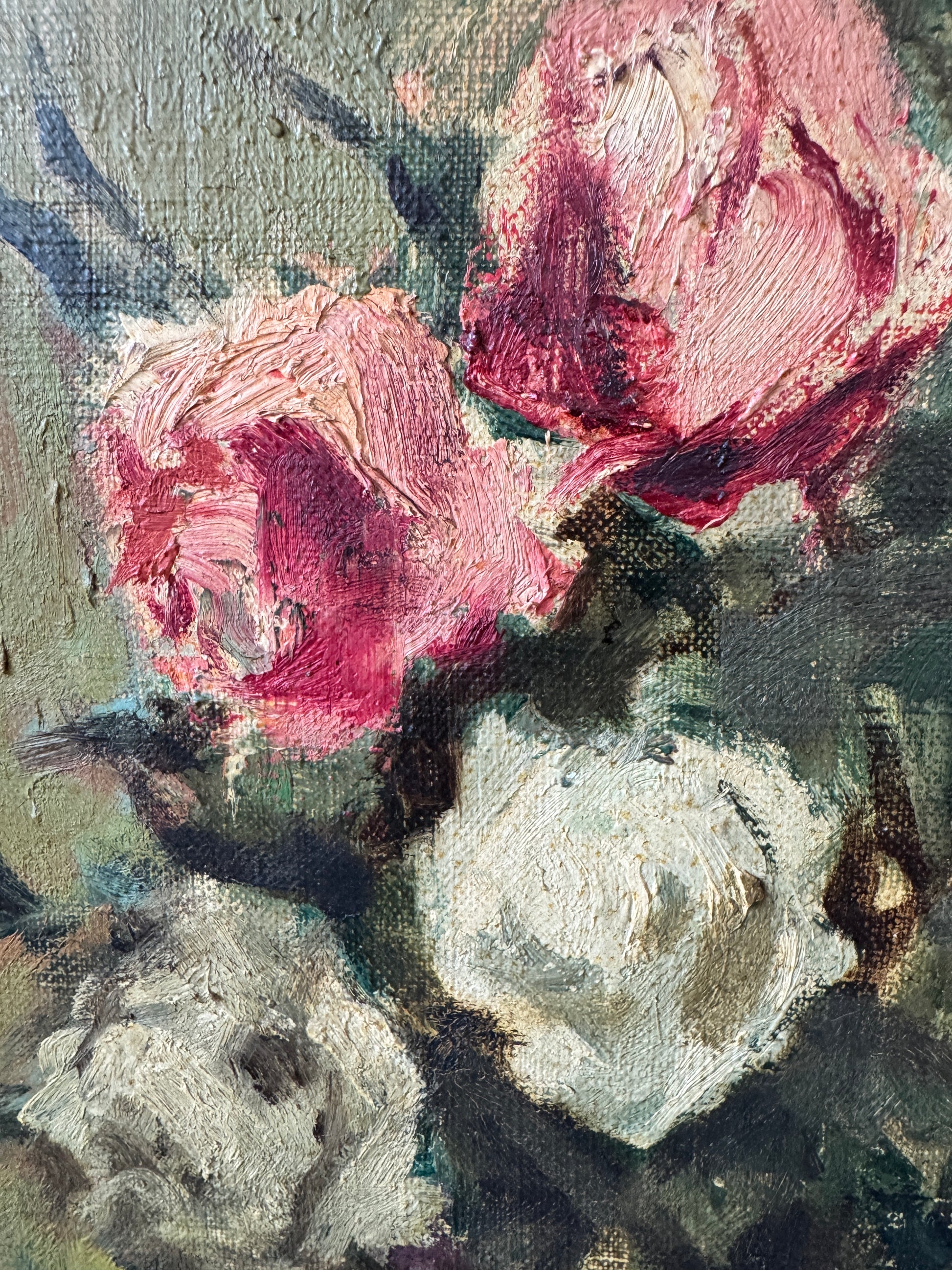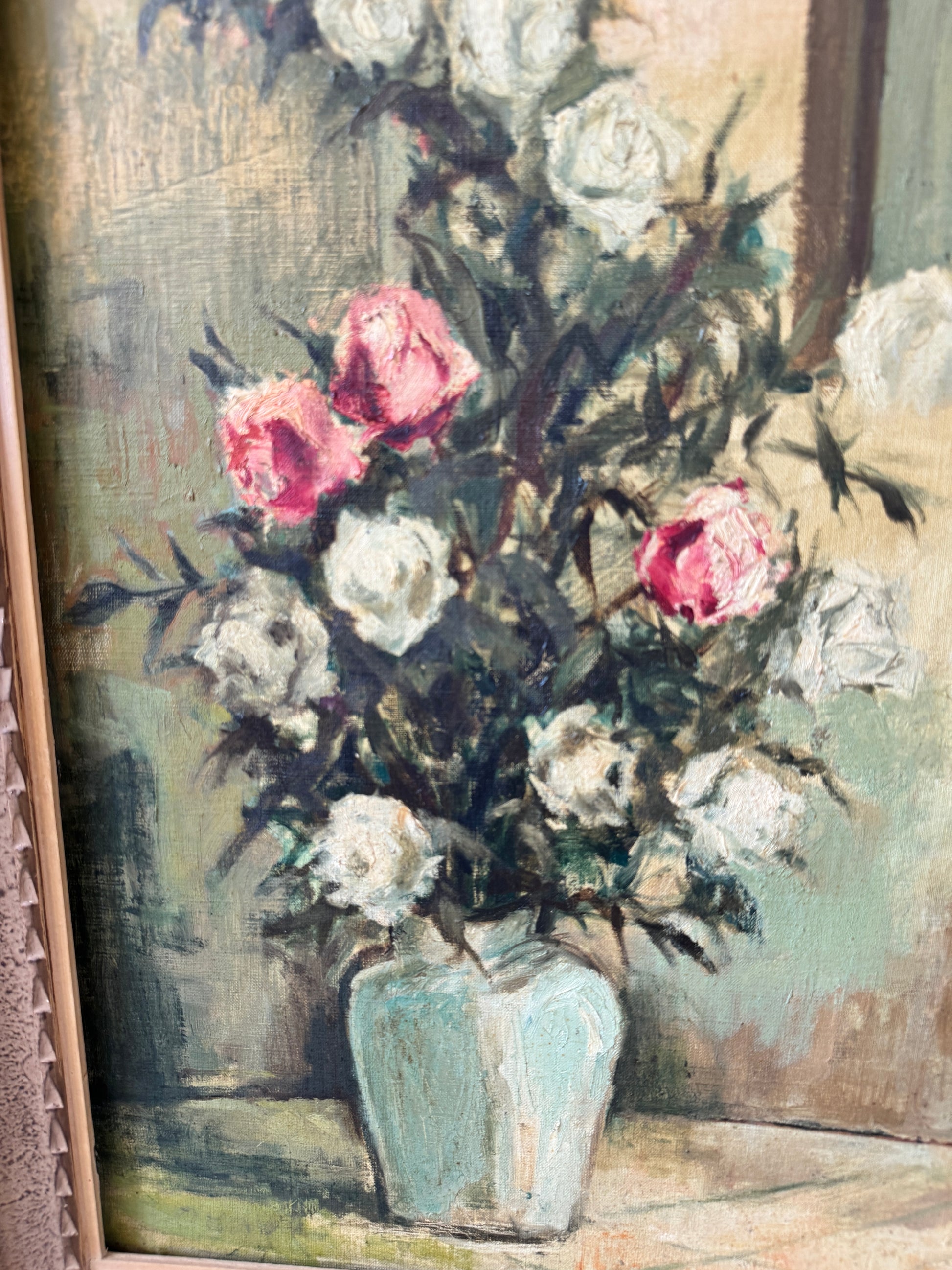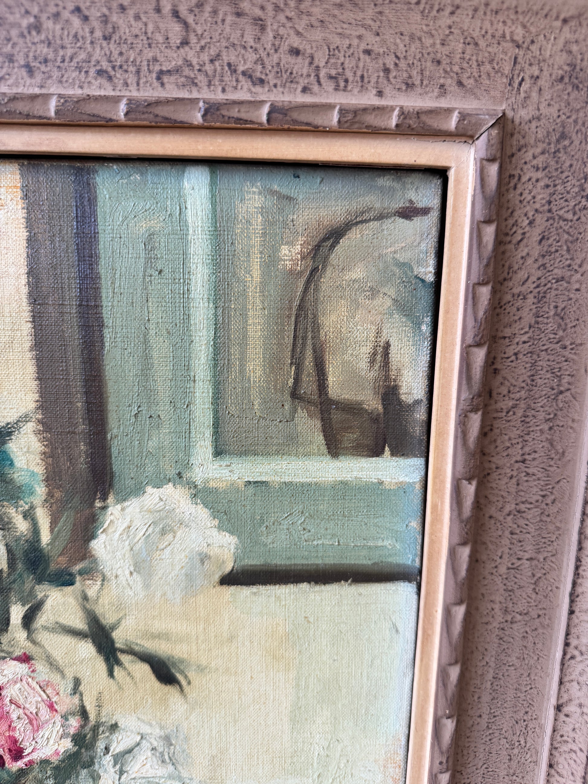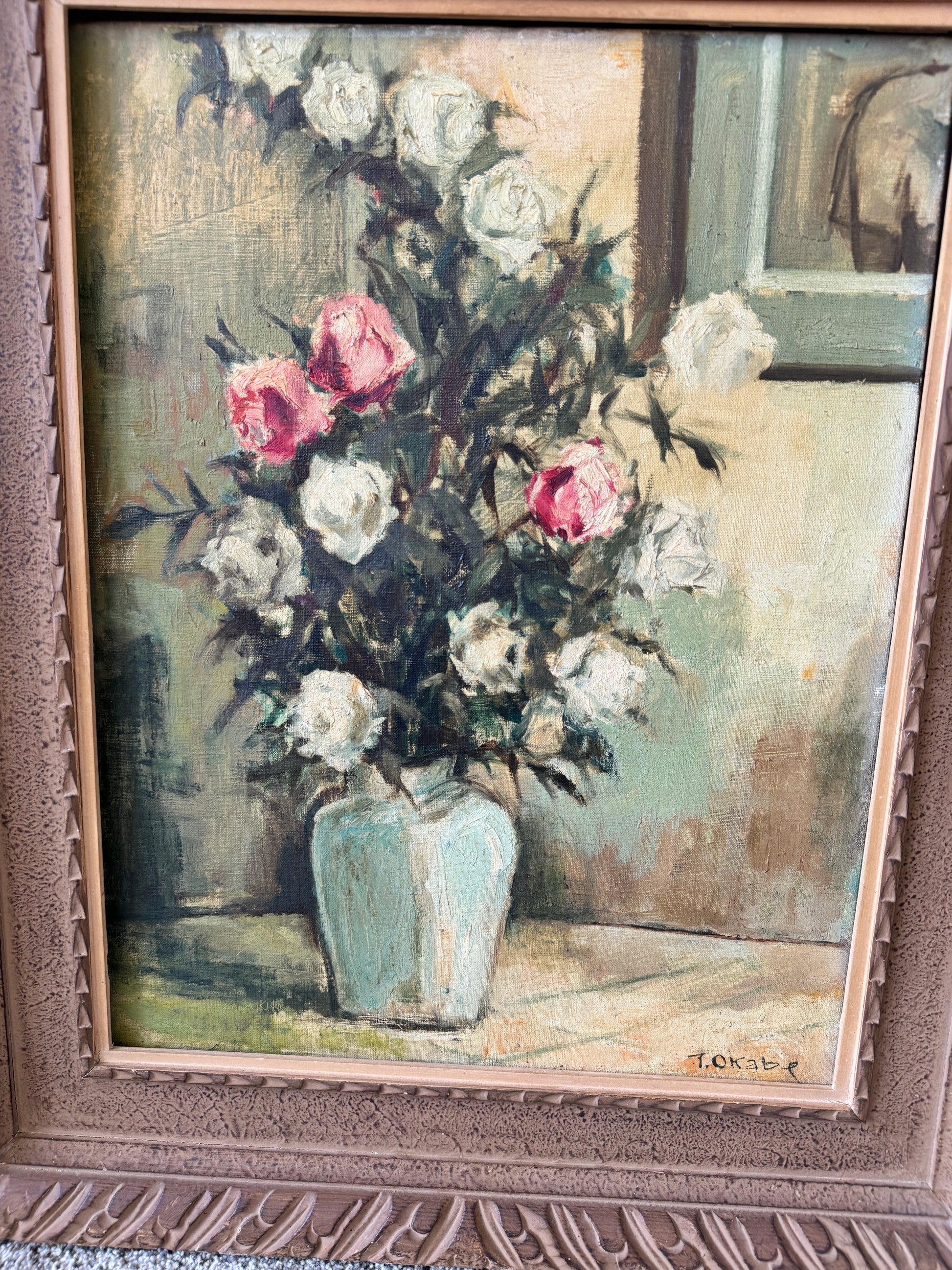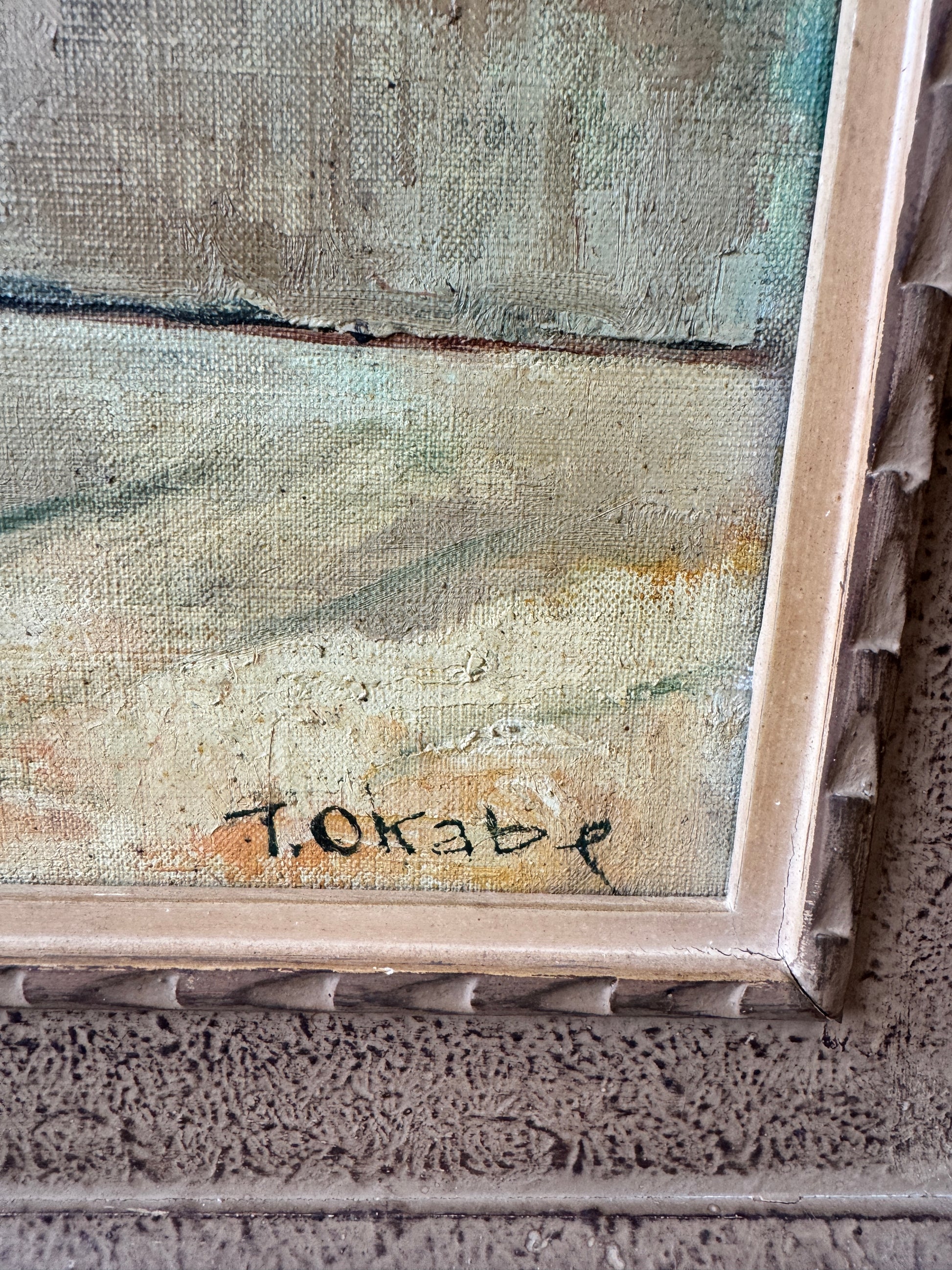 Floral Still Life by T. Okabe (c. 1930) – Oil on Canvas in Celadon Palette