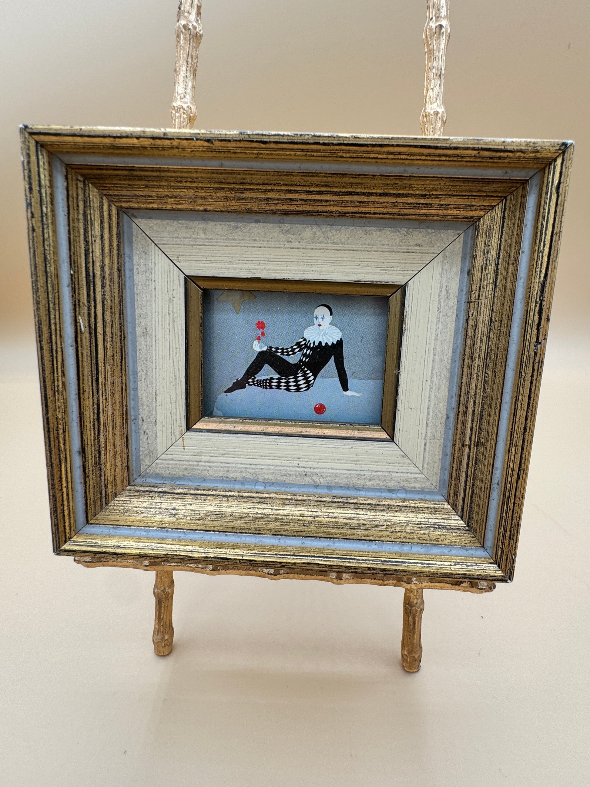 Framed Harlequin Pierrot Print by Eva Müller-Rudolf (Typed Label) – Small Theatrical Wall Art (4.5” x 4”)