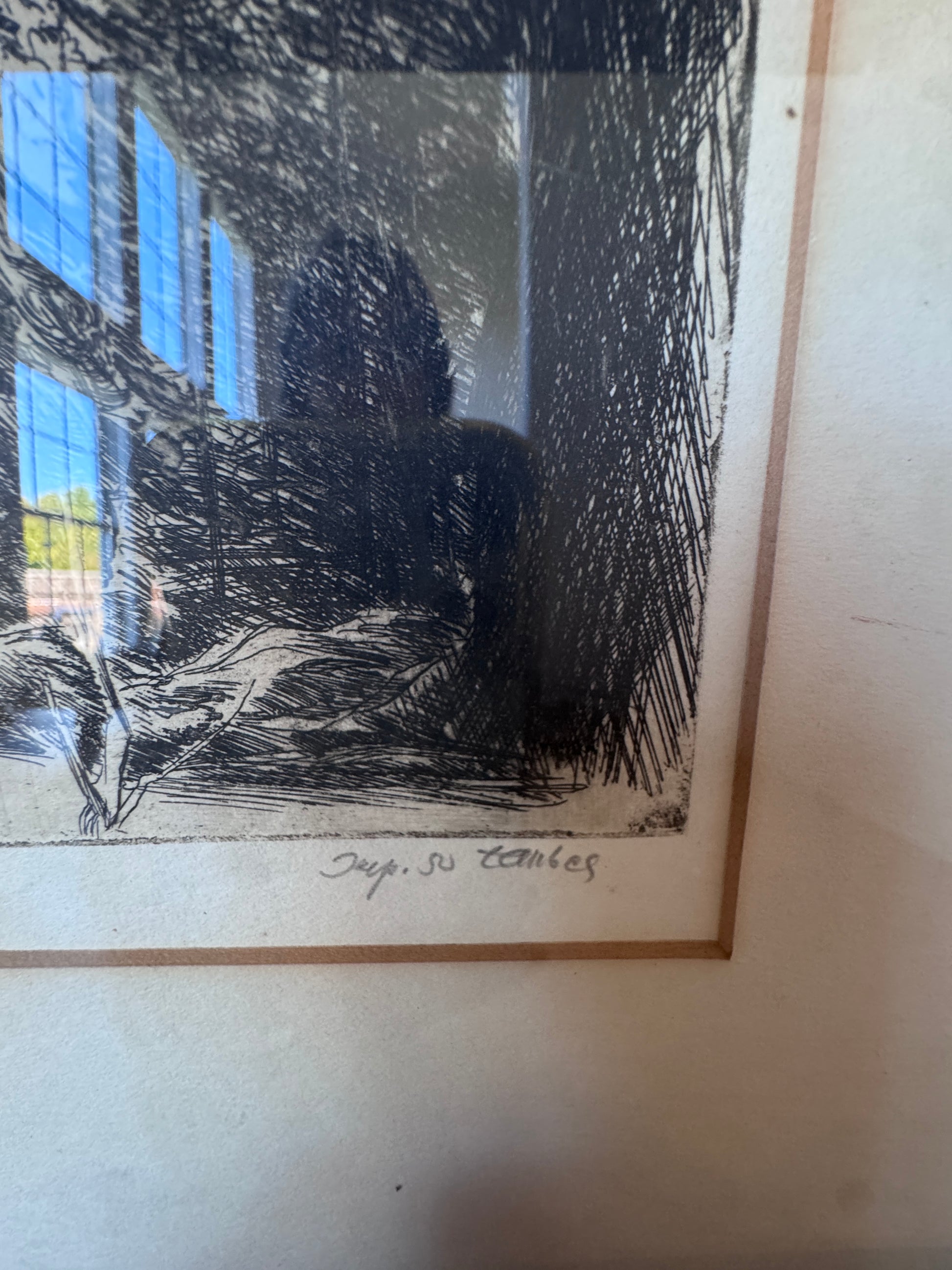 Original etching by Frederic Taubes featuring a dramatic mountain landscape with a lone traveler and tall pines. Rich texture and atmosphere — bold, moody, and perfect for vintage, library, cabin, or gothic interiors.