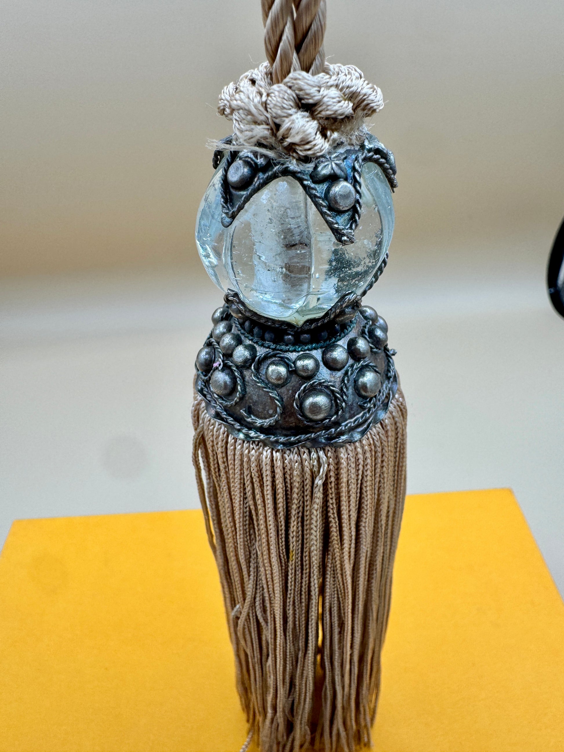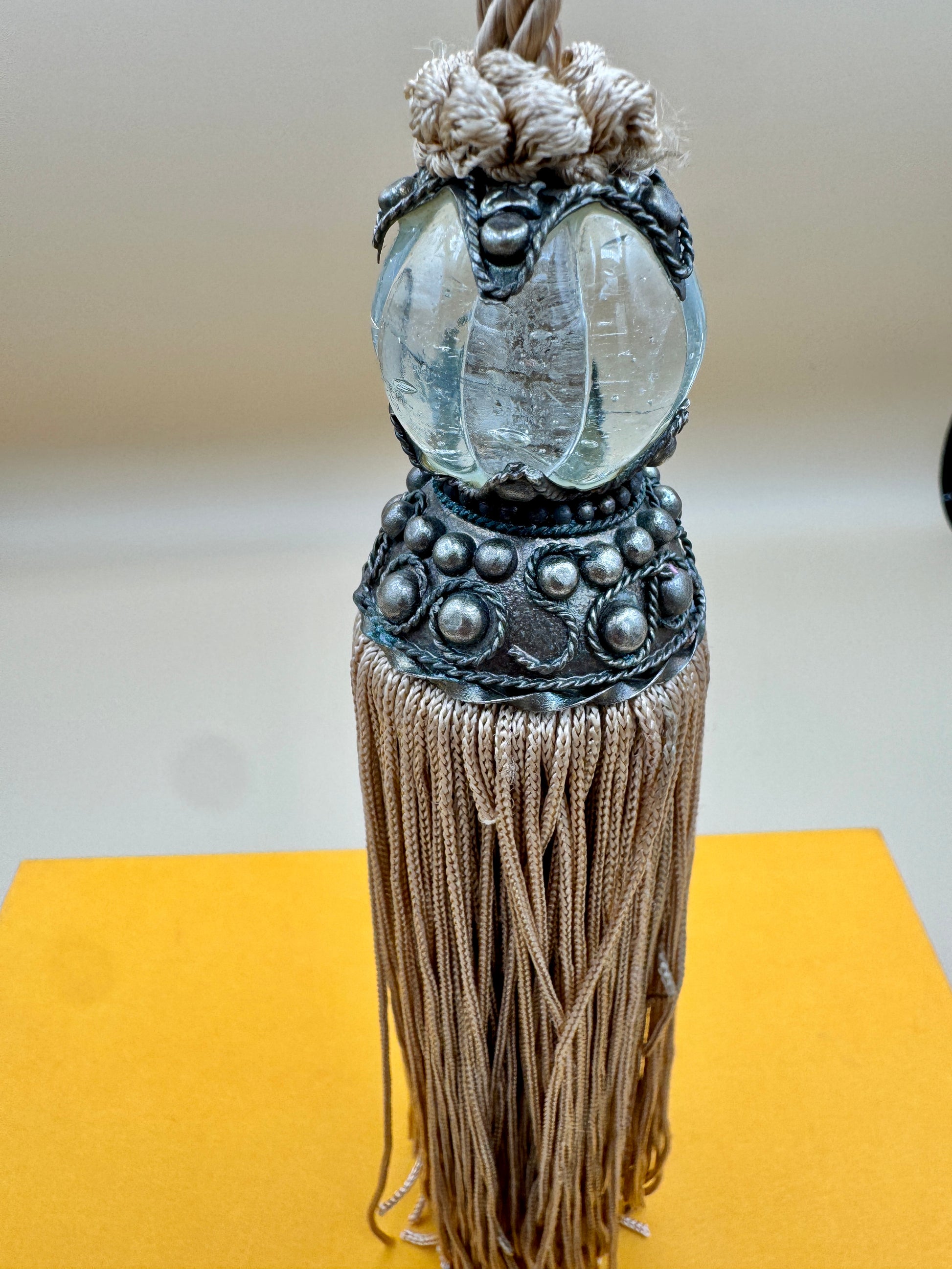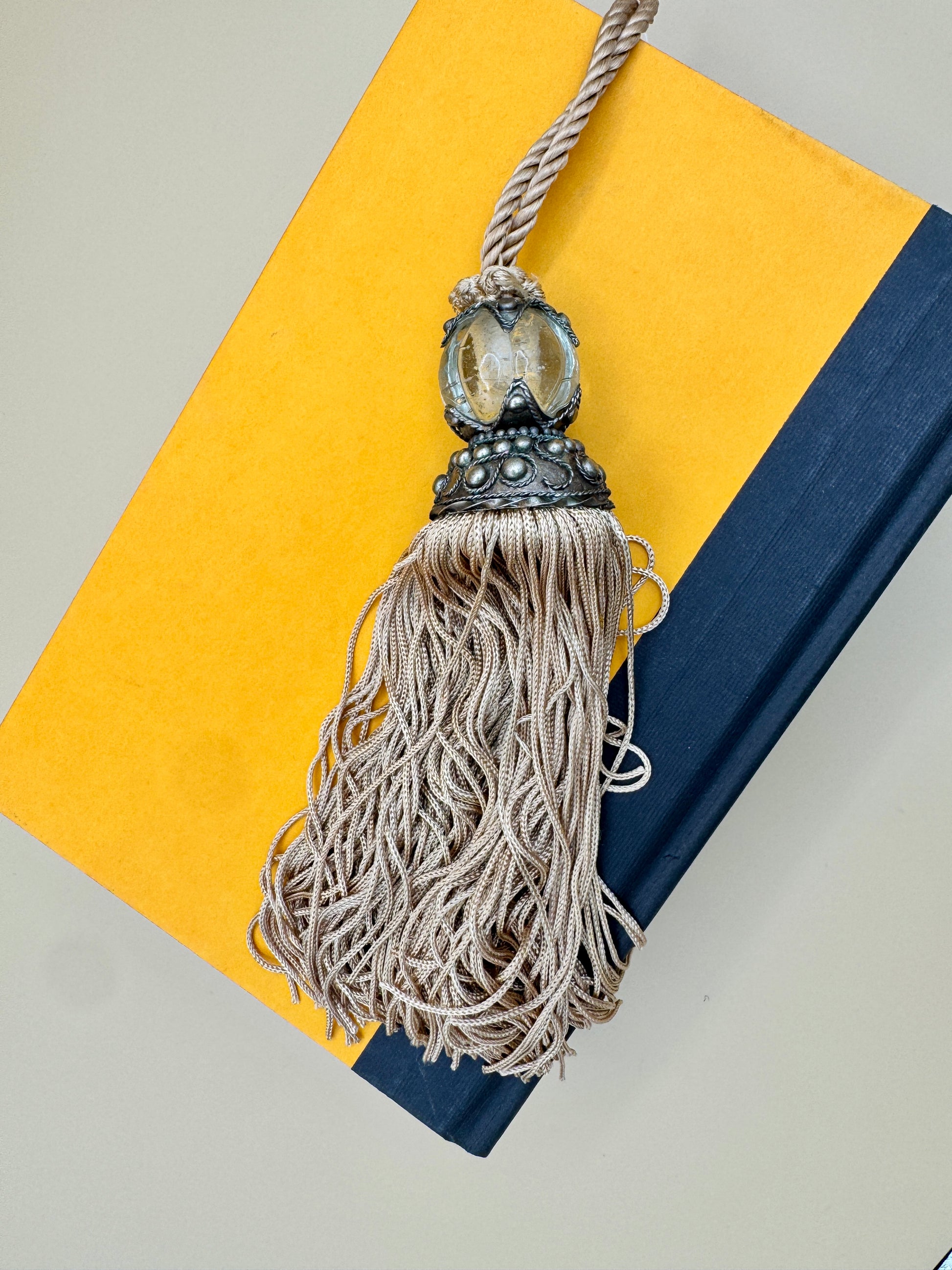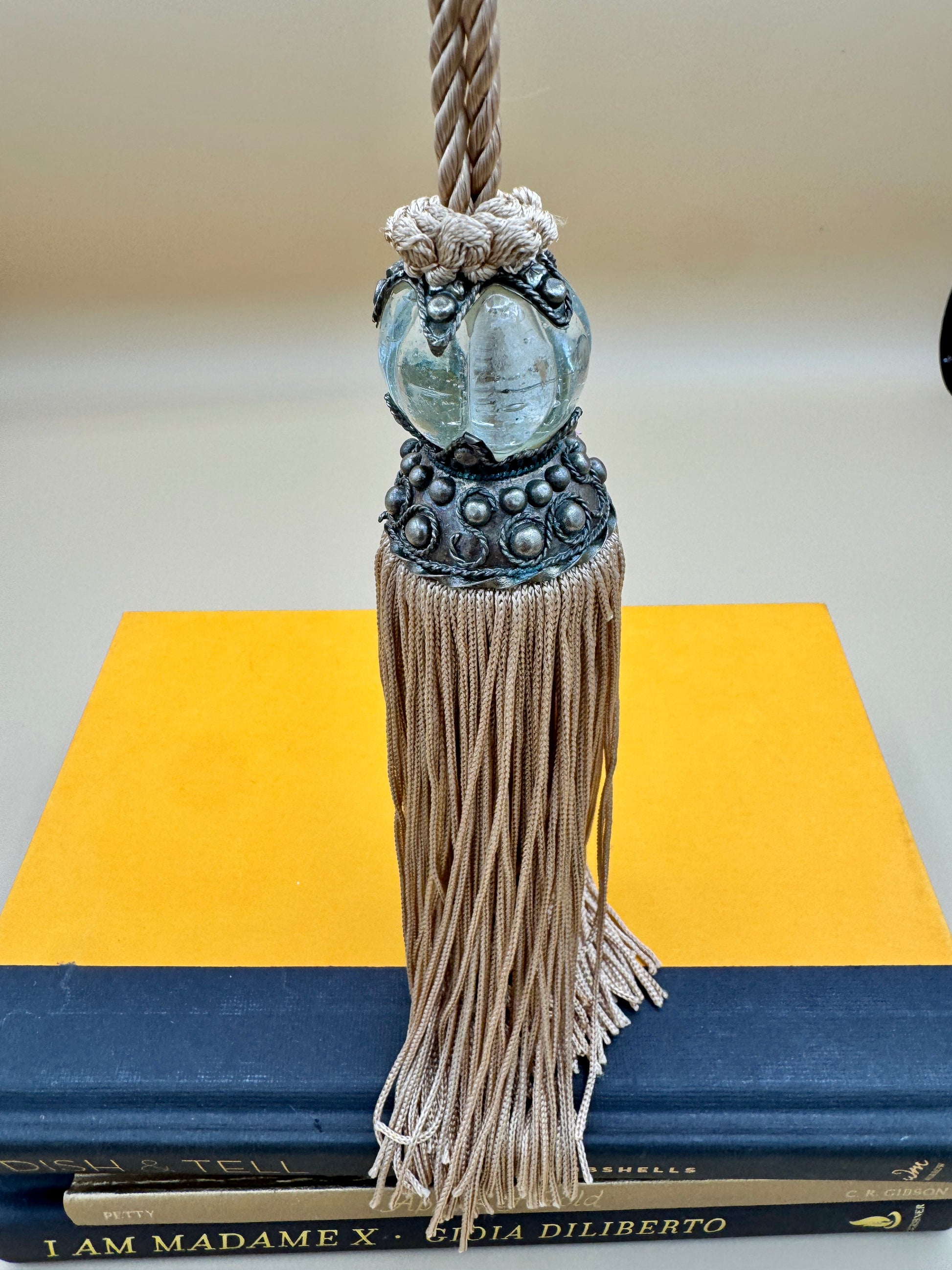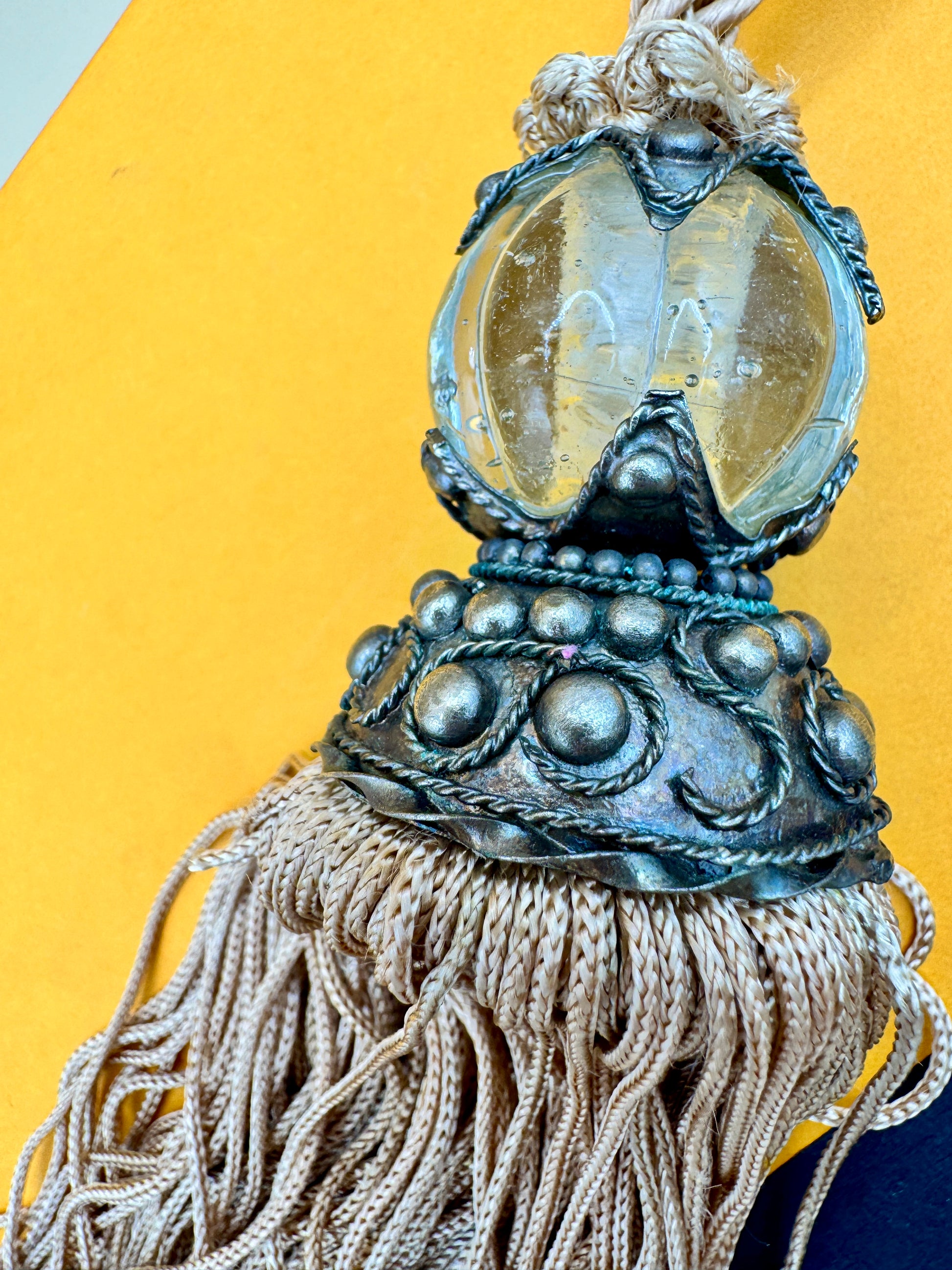 A decorative vintage tassel featuring silky gold fringe, ornate metal detailing, and a clear glass orb accent. Perfect as a curtain tieback, drapery embellishment, or a unique accent in your vintage-inspired home. Its elegant mix of textures and materials makes it a versatile piece that brings charm and sophistication to any space.