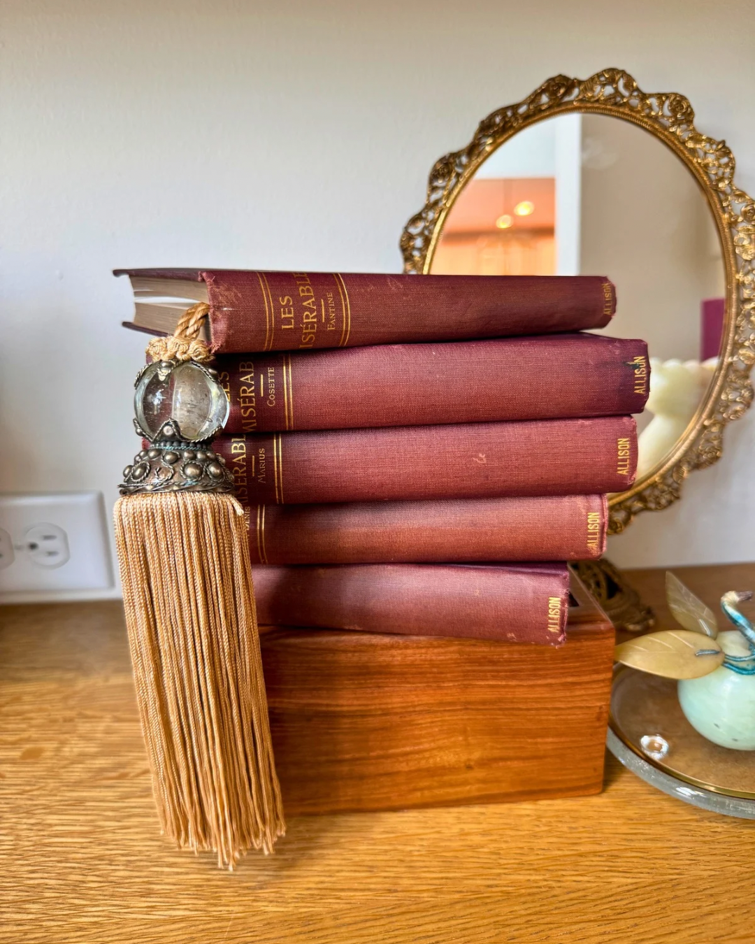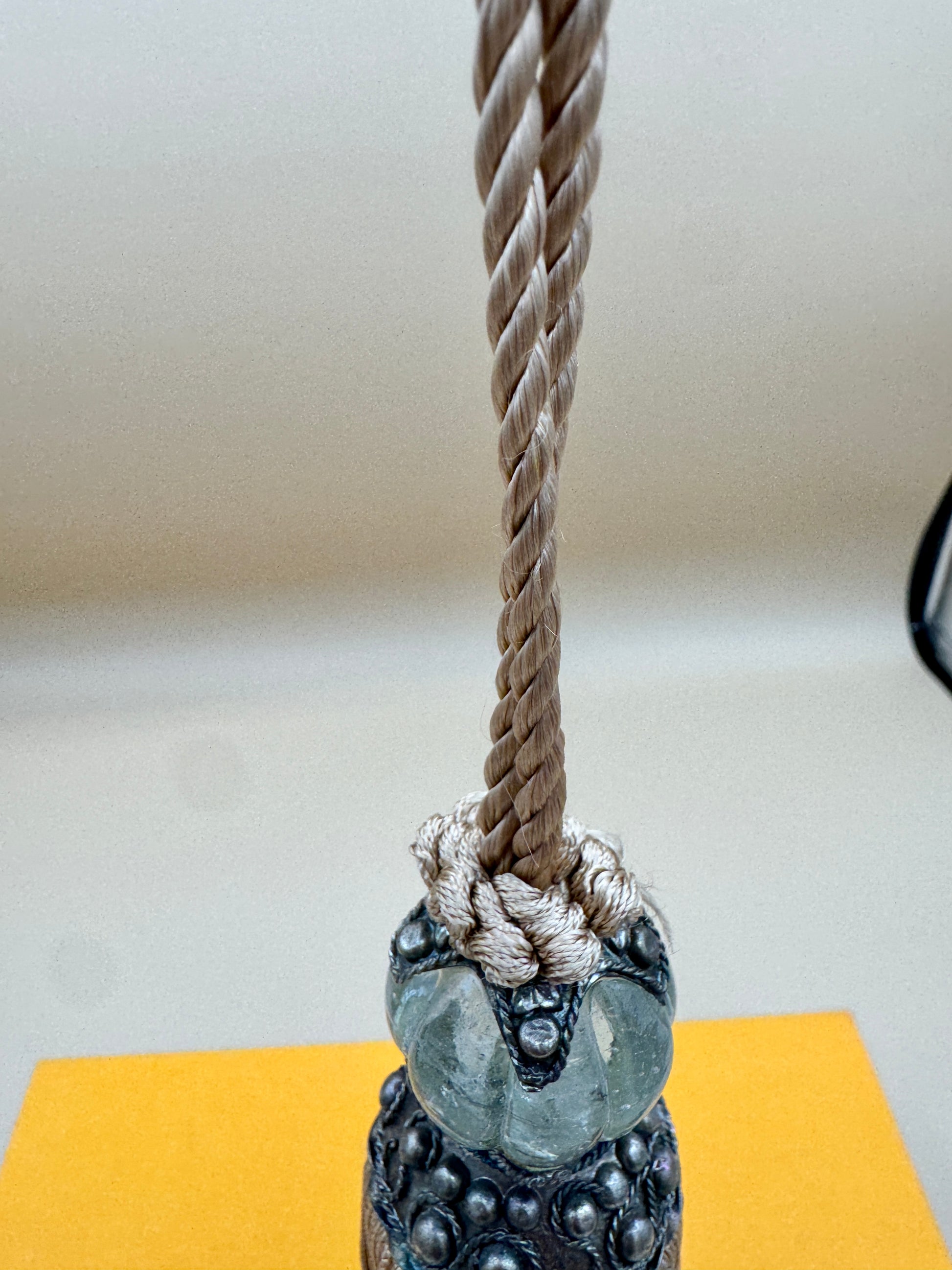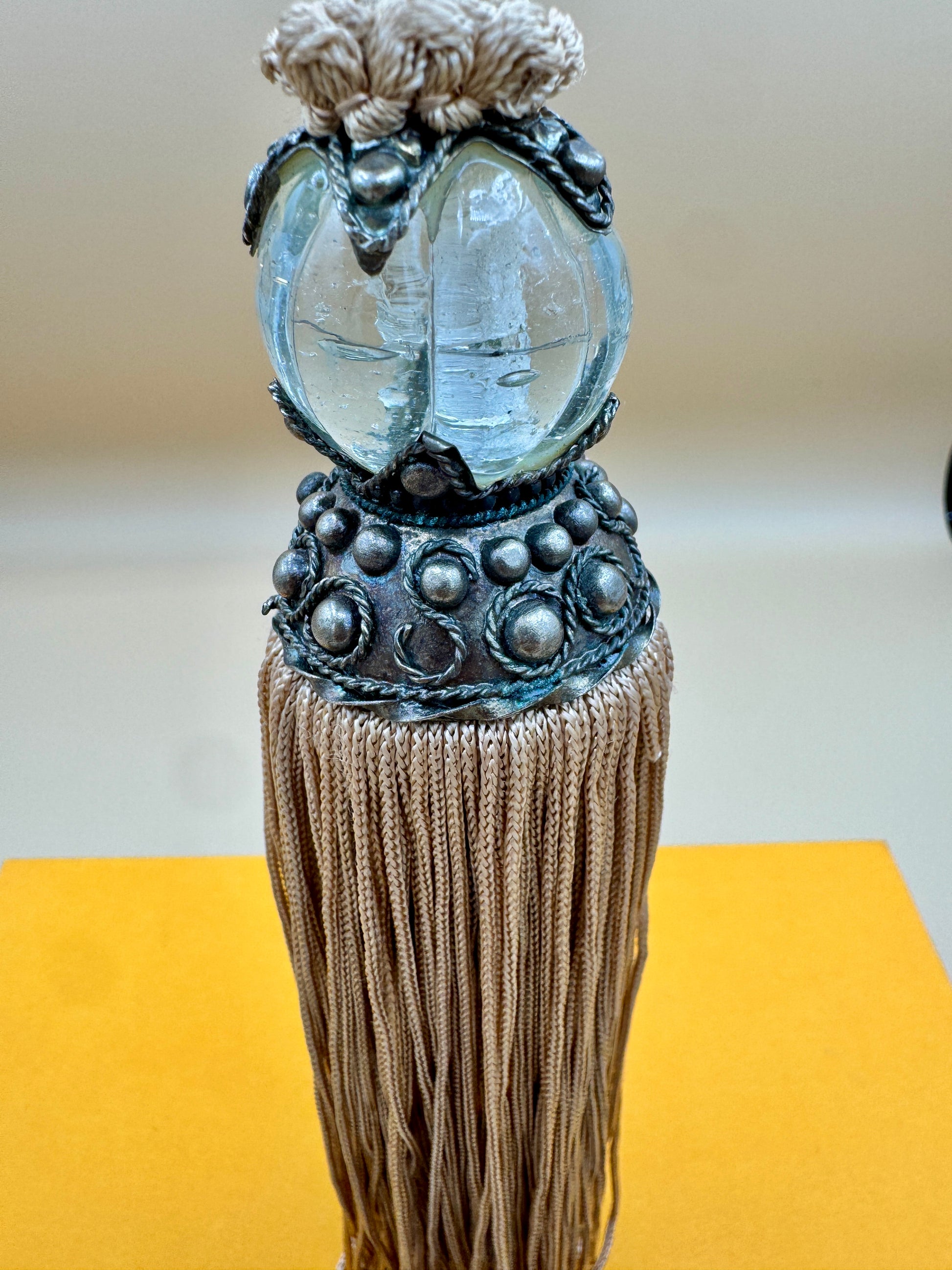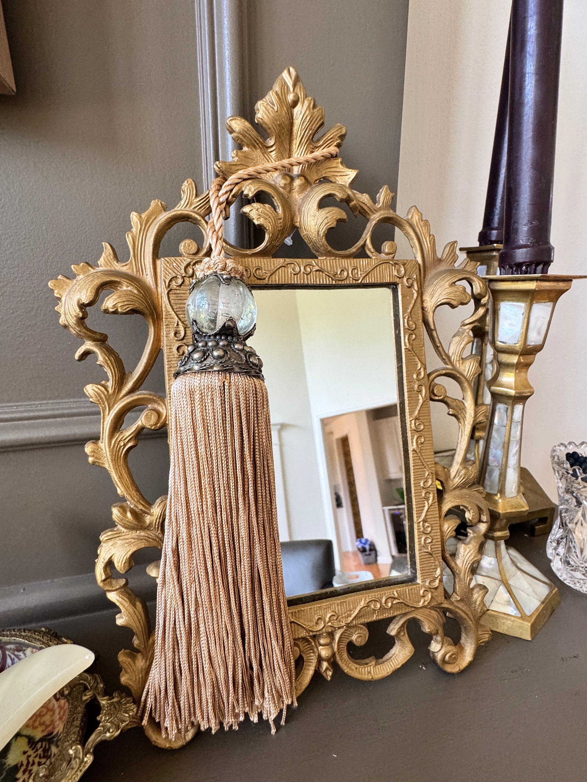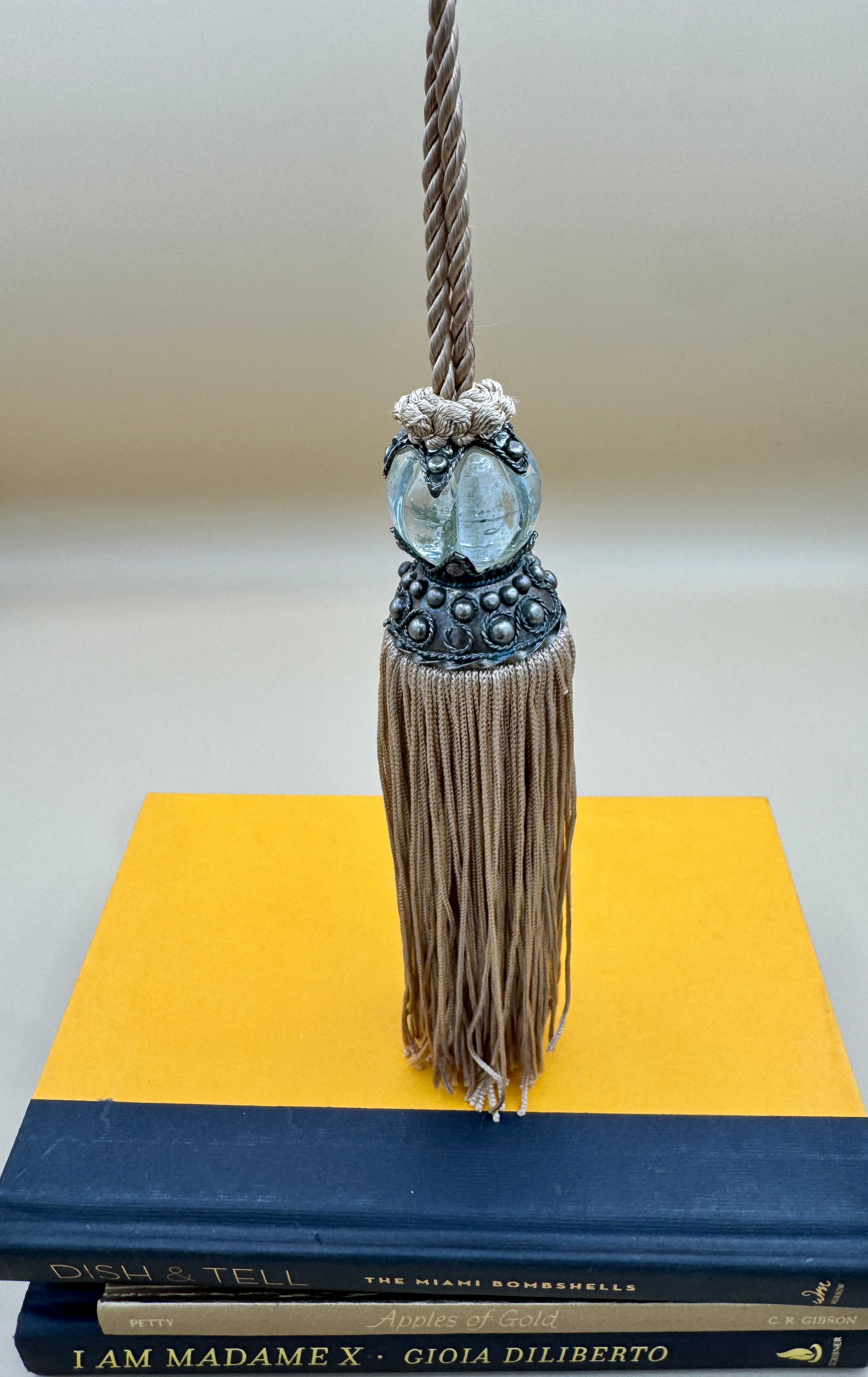 A decorative vintage tassel featuring silky gold fringe, ornate metal detailing, and a clear glass orb accent. Perfect as a curtain tieback, drapery embellishment, or a unique accent in your vintage-inspired home. Its elegant mix of textures and materials makes it a versatile piece that brings charm and sophistication to any space.