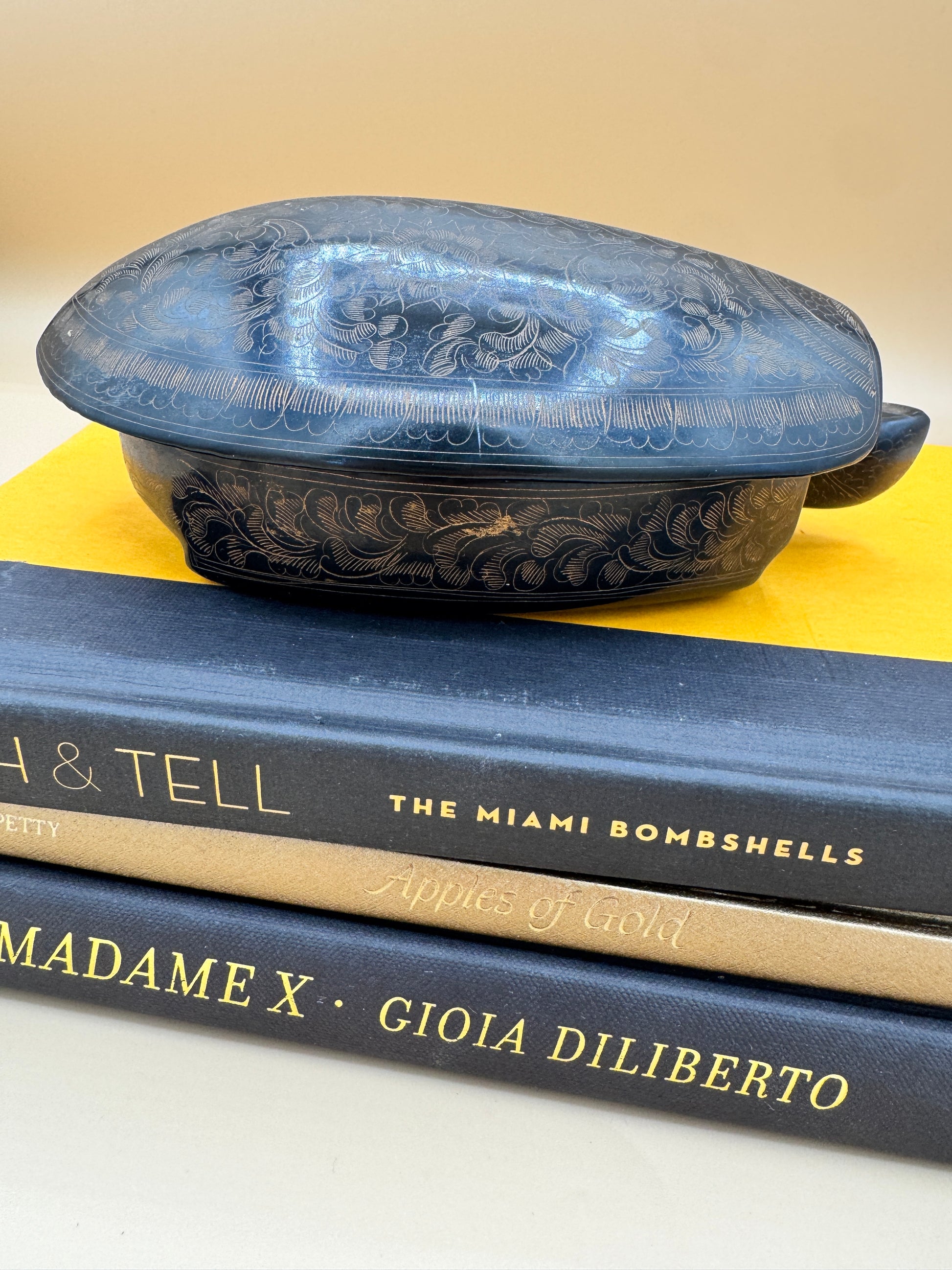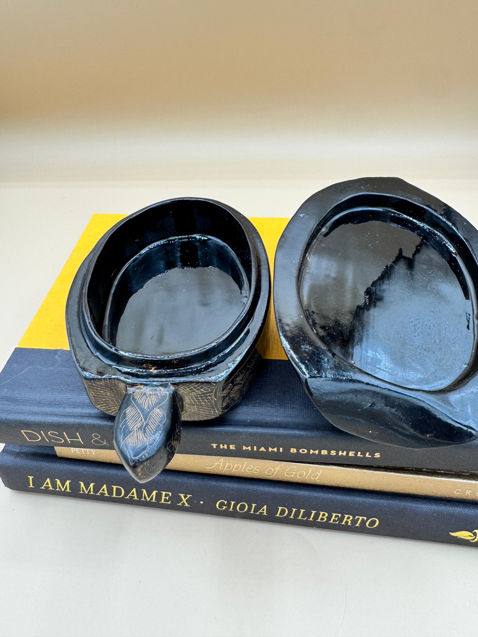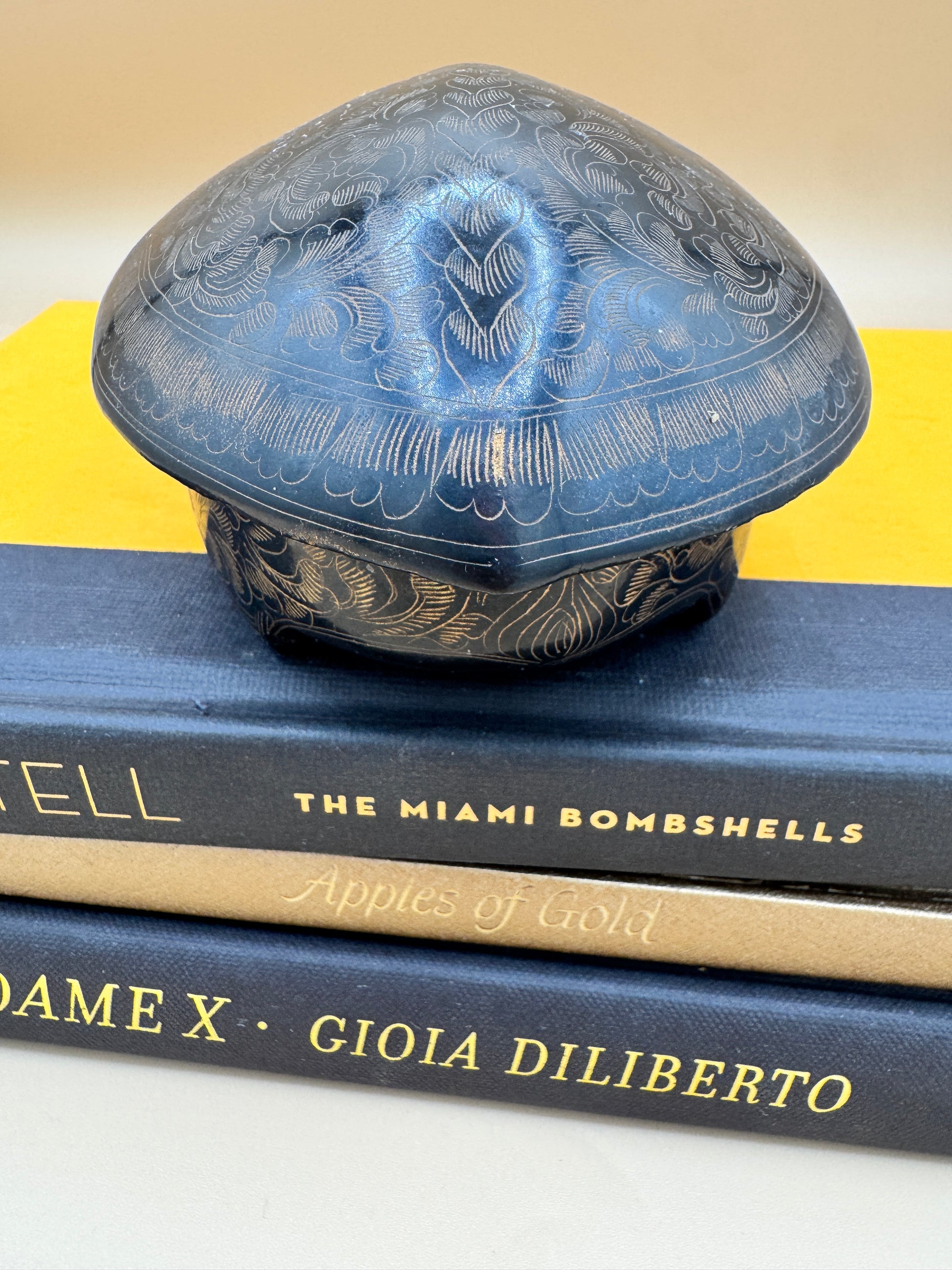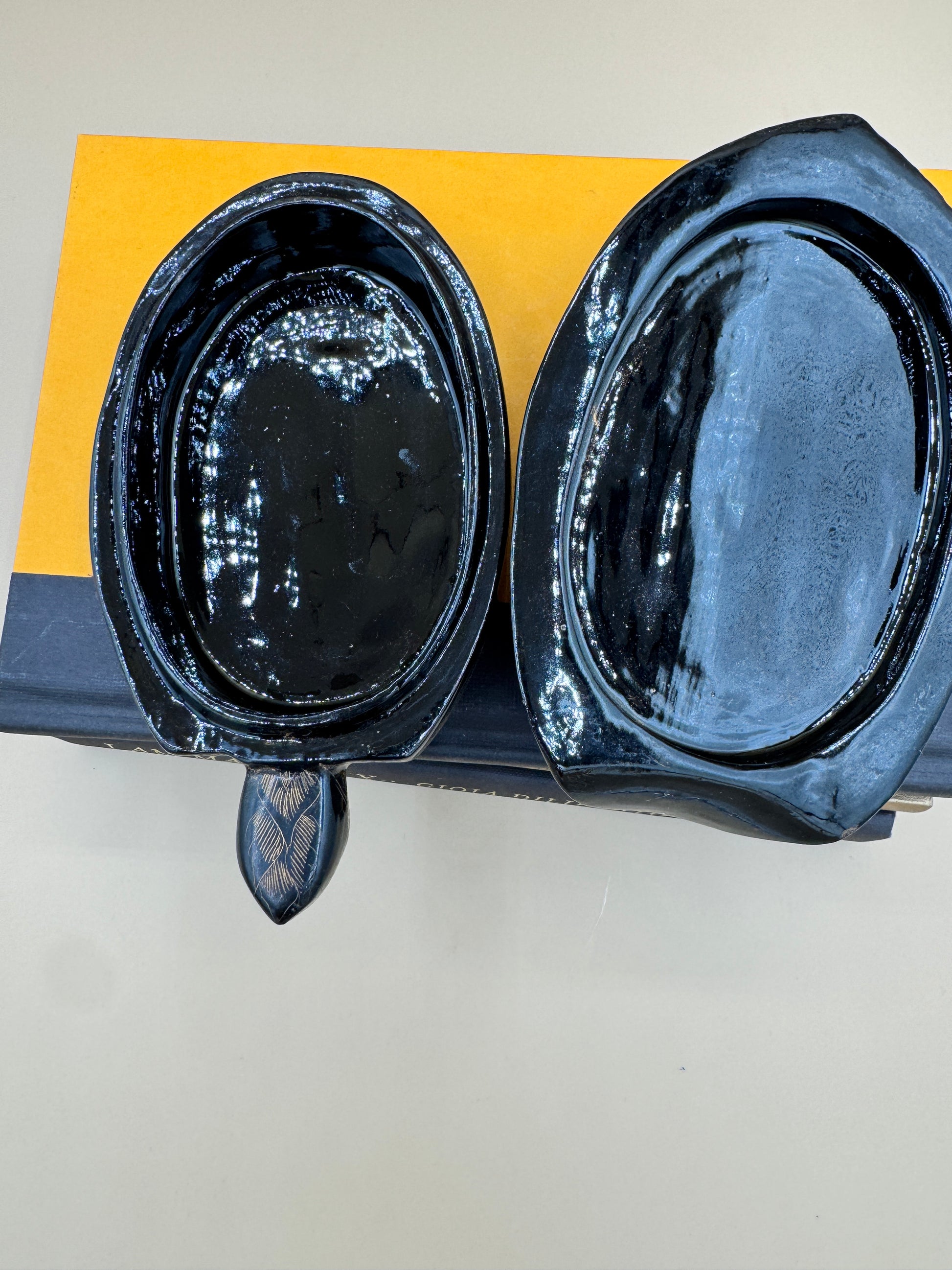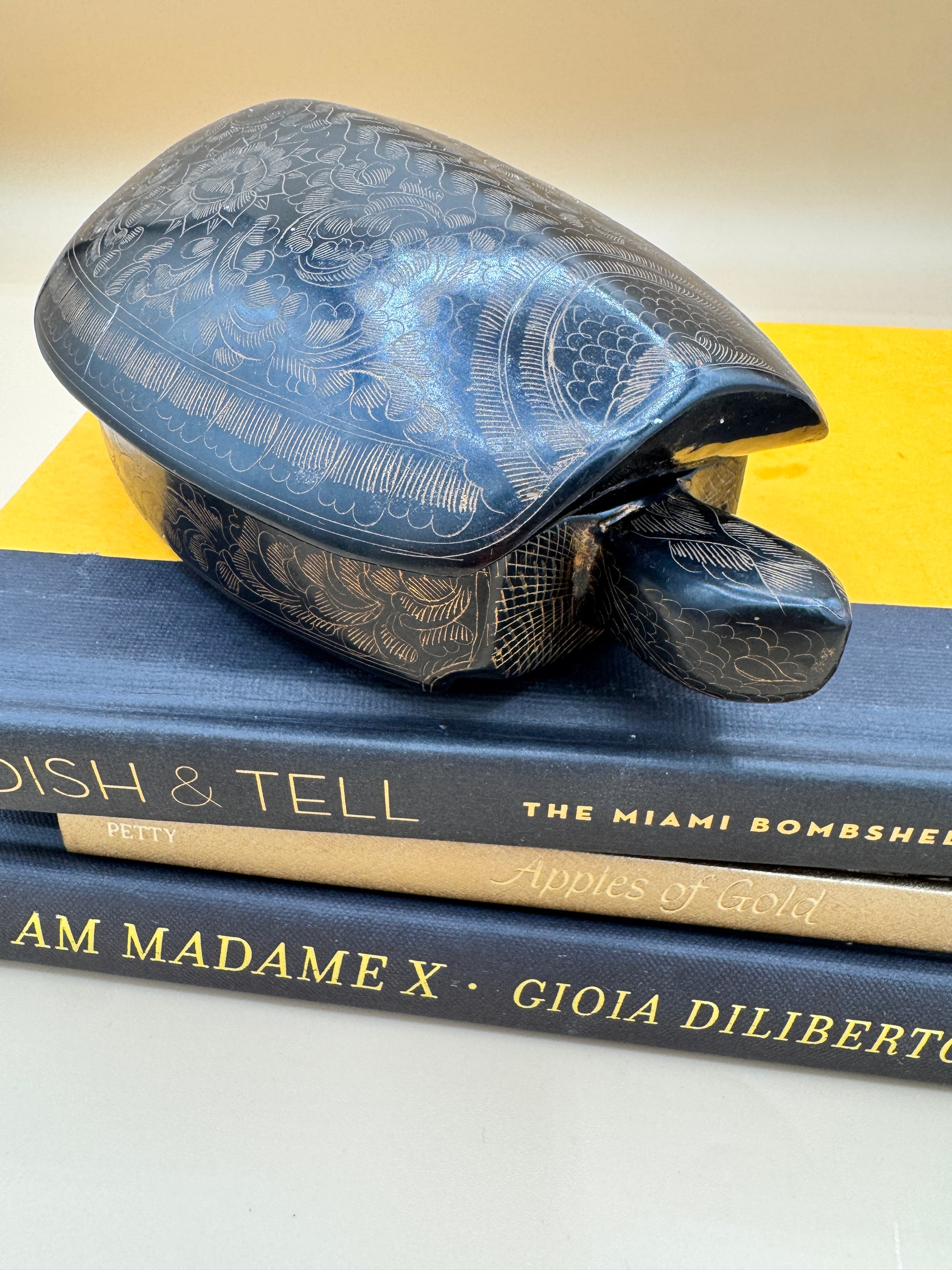 Hand-Carved Black Lacquer Turtle Trinket Box with Floral Etching – 8”