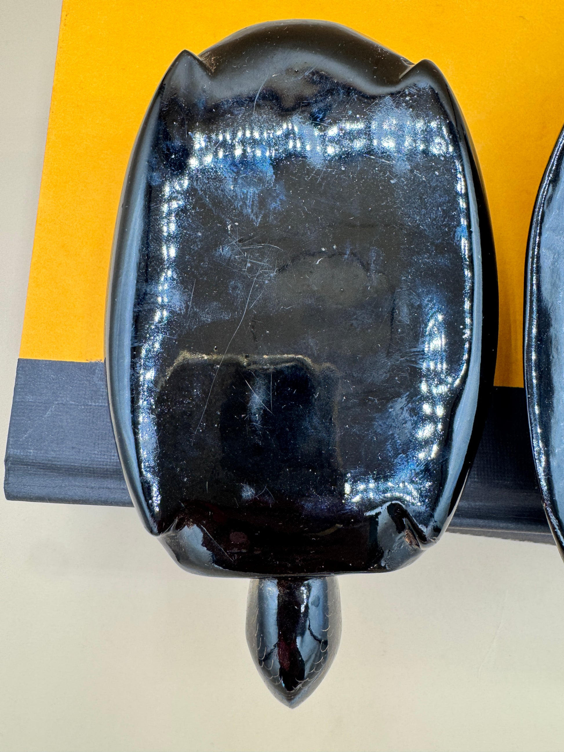 Bring charm and craftsmanship into your space with this turtle-shaped trinket box. Hand-carved and coated in glossy black lacquer, the piece features etched floral and geometric detailing across the shell and body. The hinged-style design opens to reveal a small compartment, perfect for holding jewelry, keys, or keepsakes.