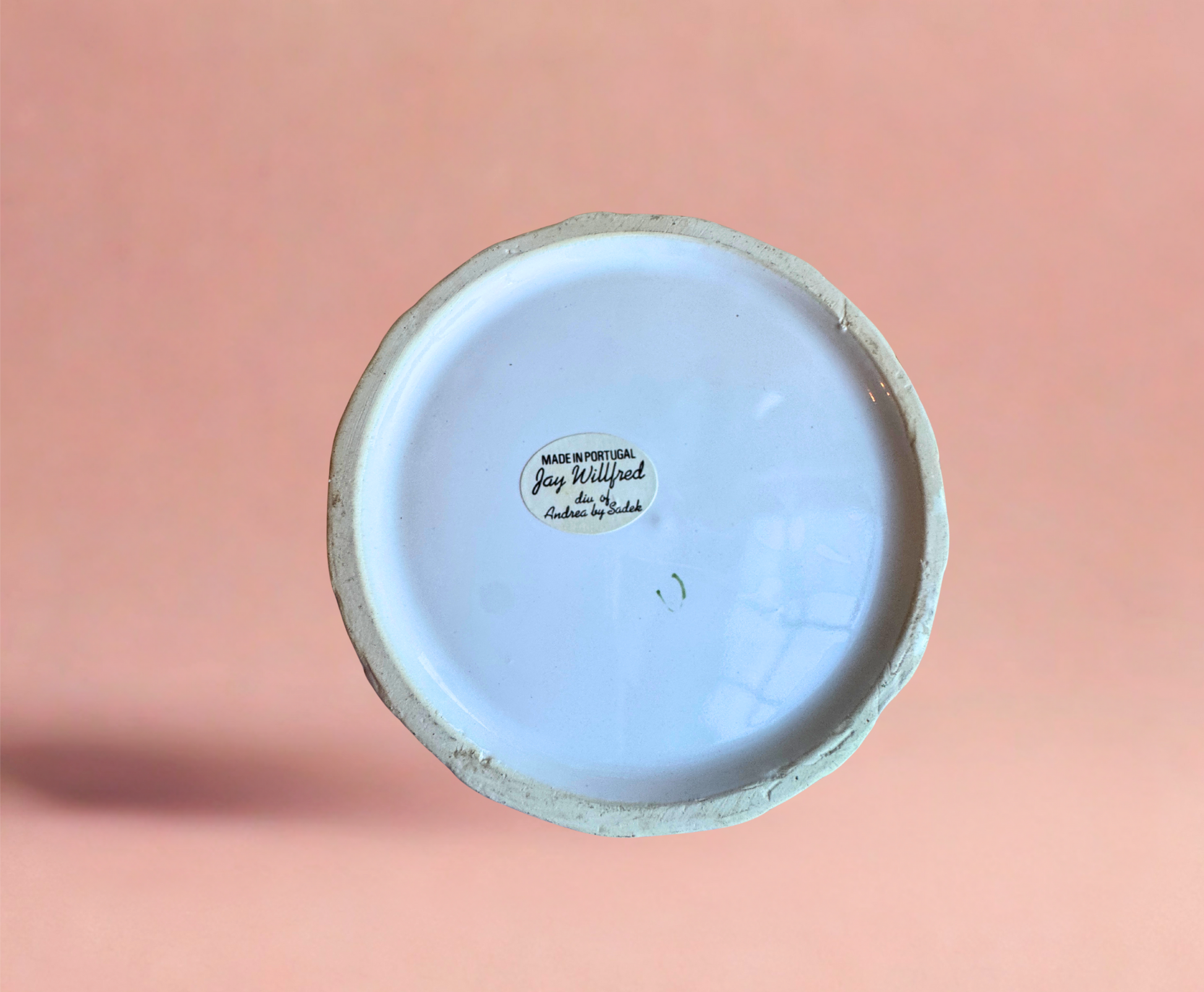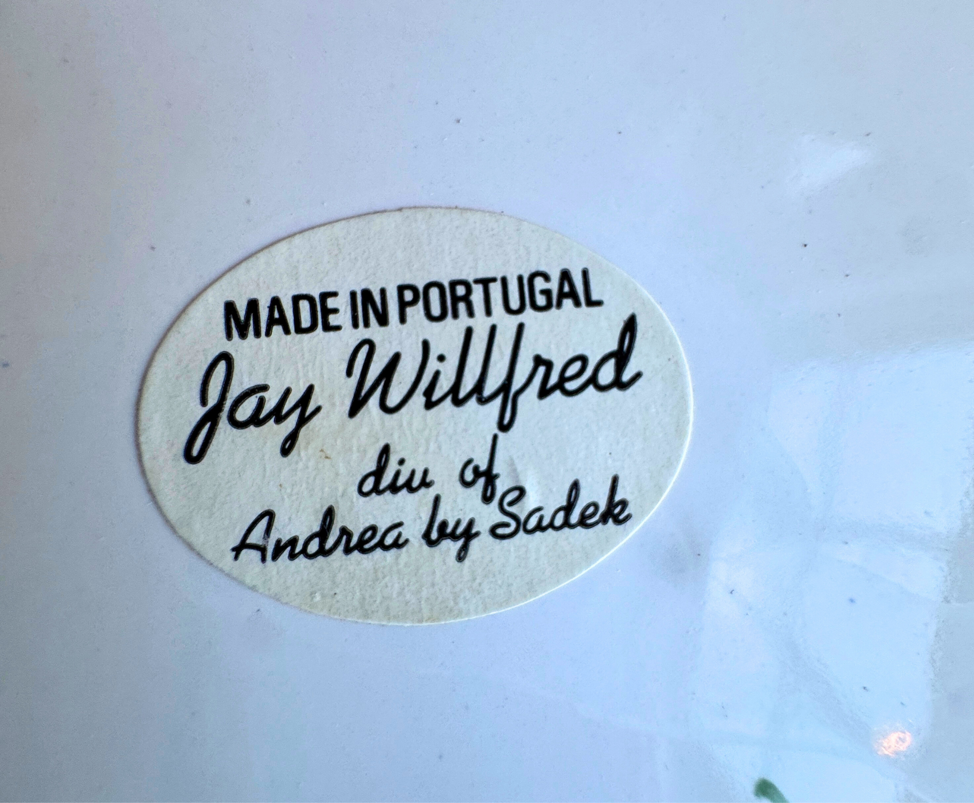 Marked Jay Willfred, div. of Andrea by Sadek – Made in Portugal, this piece is estimated to date from the 1980s–1990s based on the paper label, glaze technique, and company history. Andrea by Sadek was known for importing high-quality decorative ceramics, many from European makers like this one. Their Jay Willfred line, in particular, focused on old-world charm and vivid hand-painted finishes.