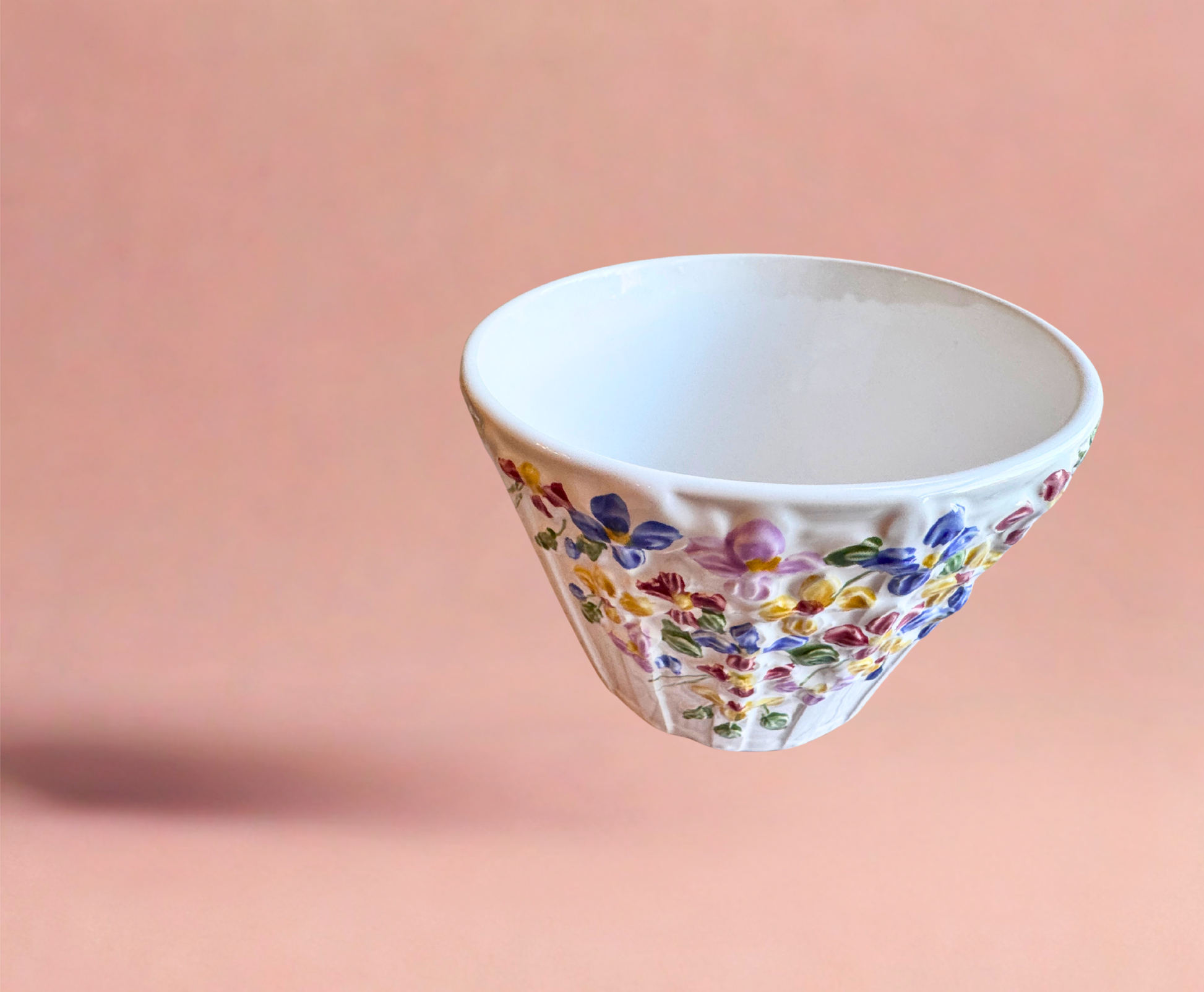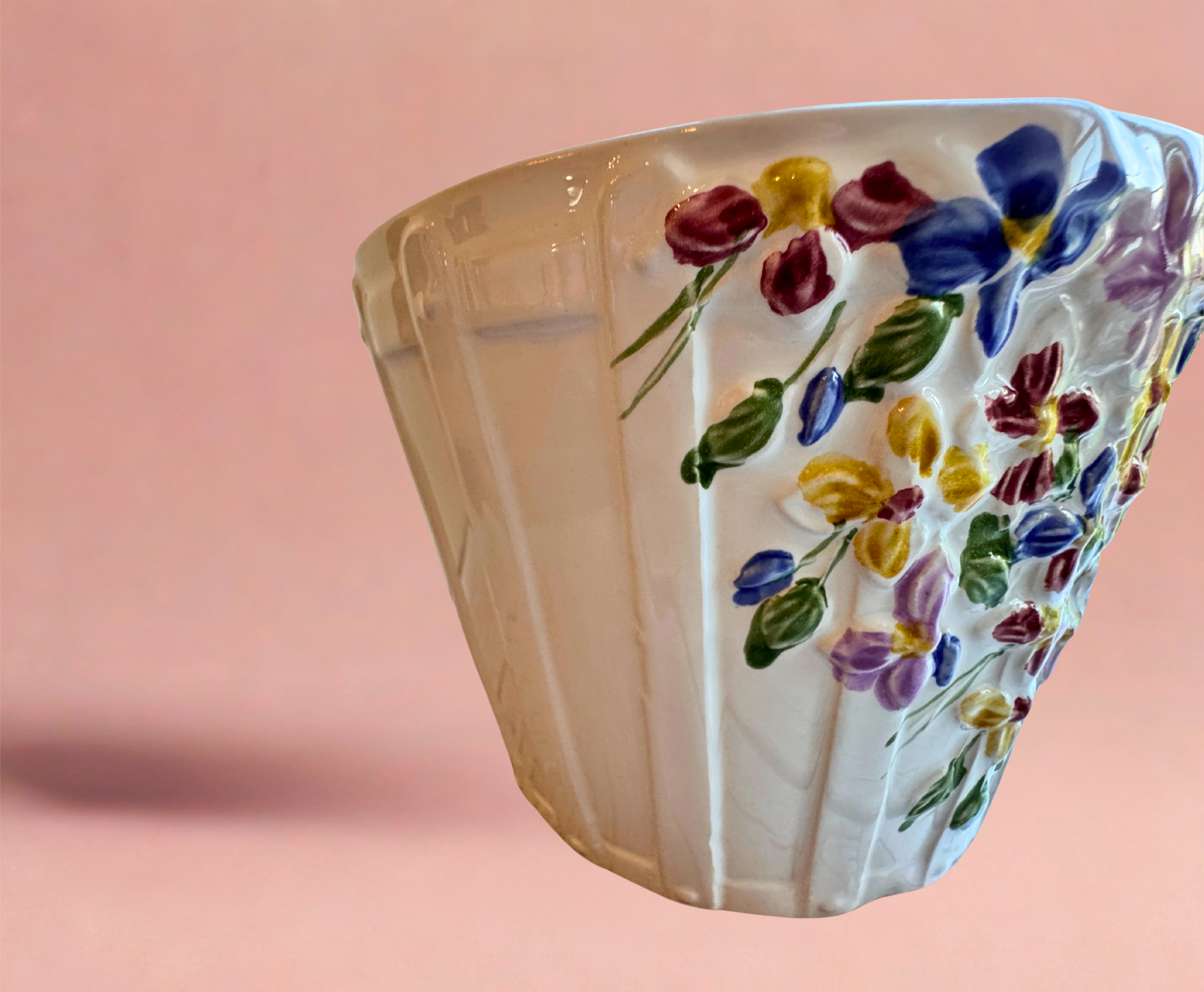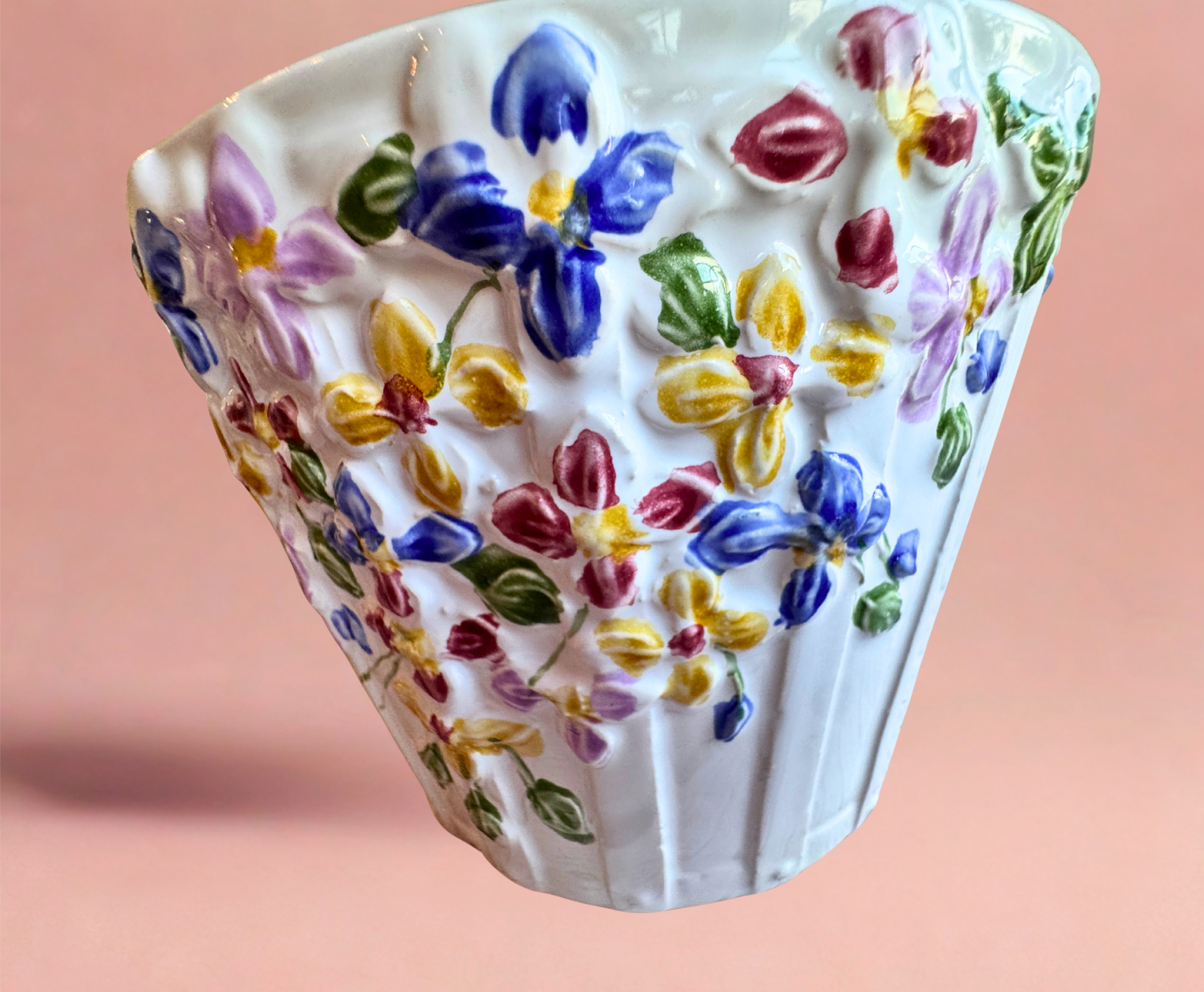 This charming ceramic pot bursts with sculpted blooms in shades of violet, golden yellow, cobalt, and rose. The dimensional floral design wraps around a fluted white form, offering a cheerful and tactile presence perfect for displaying spring blossoms or standing alone as a collectible accent.
