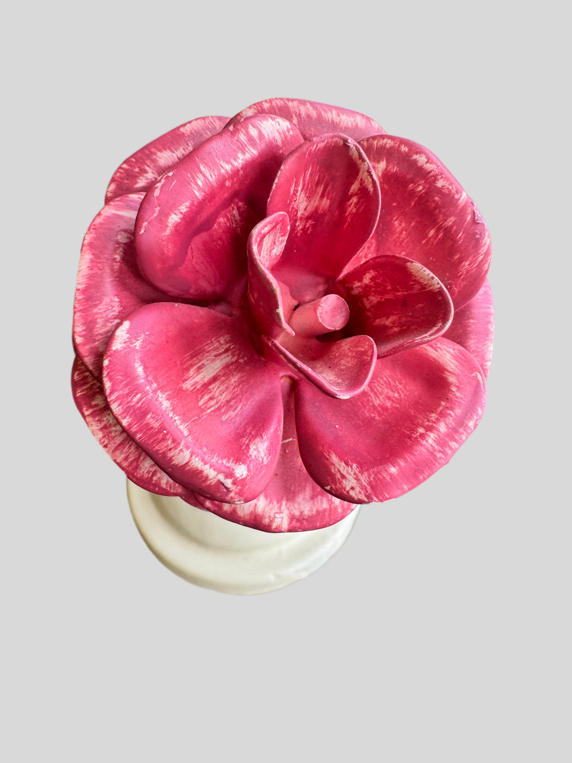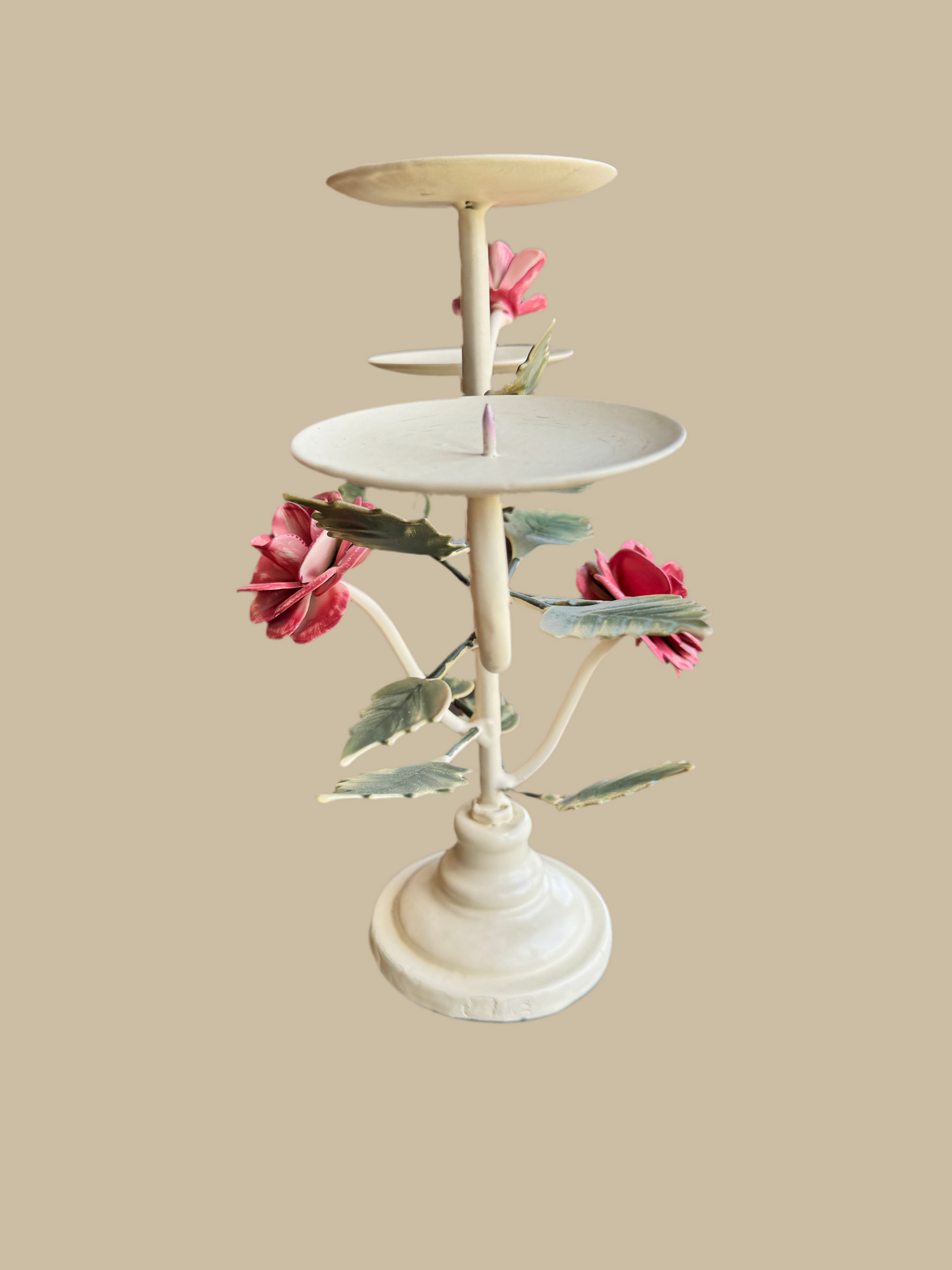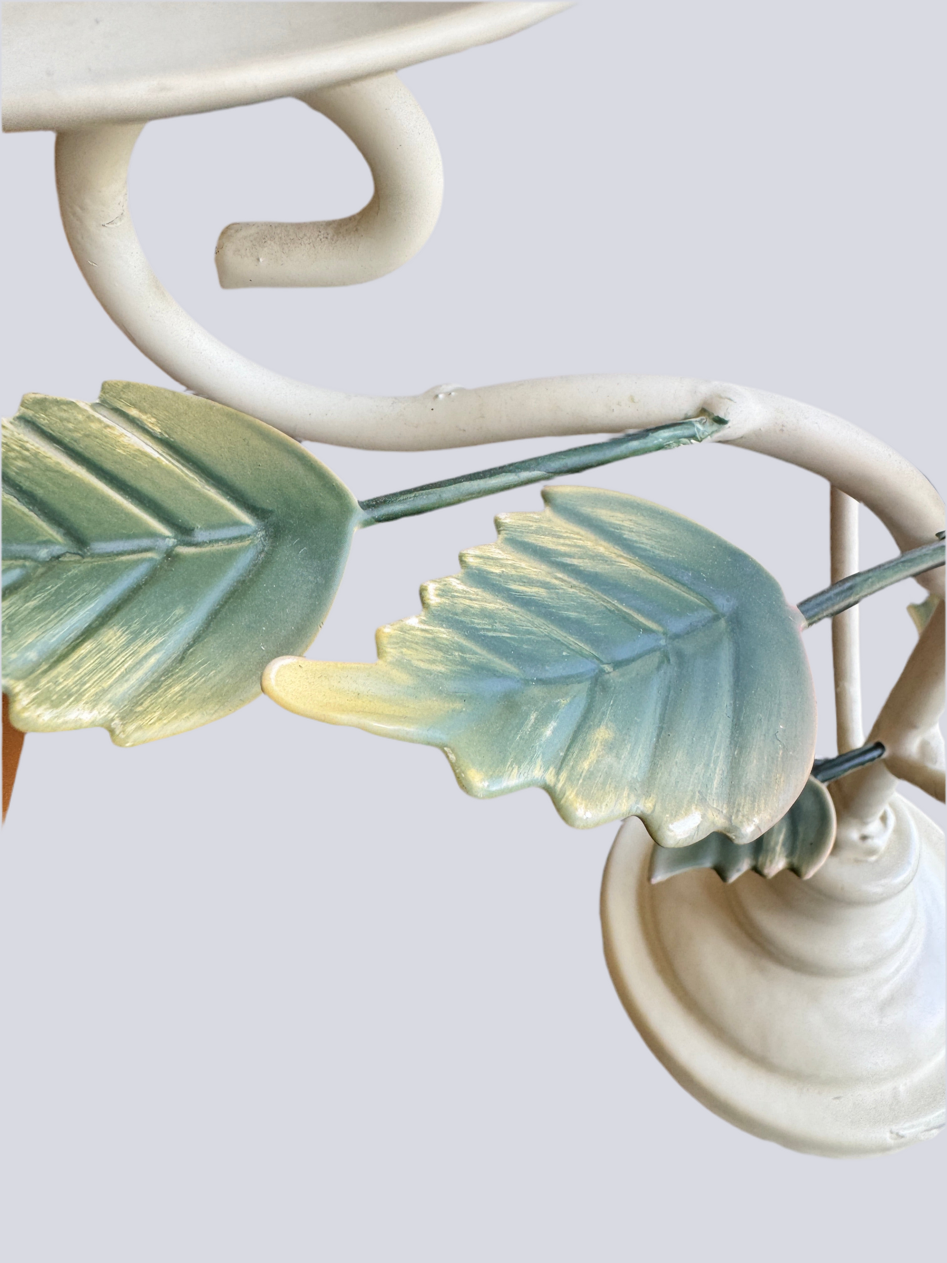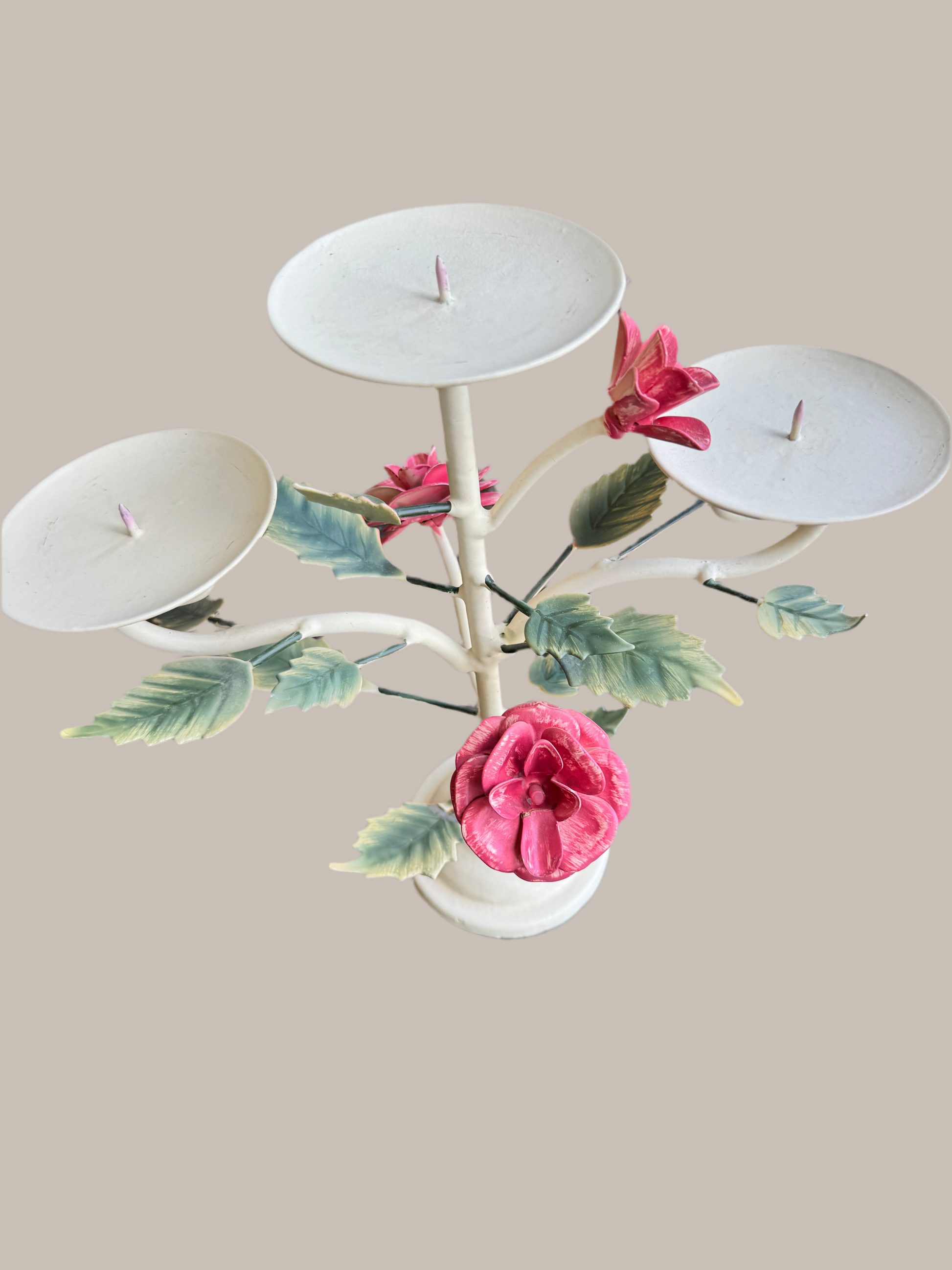 This vintage toleware-style candlestick is a sculptural gem, hand-painted with soft ivory, green, and rosy blush tones. Its swirling floral bouquet—crafted entirely from metal—evokes the timeless romance of Italian cottage decor.