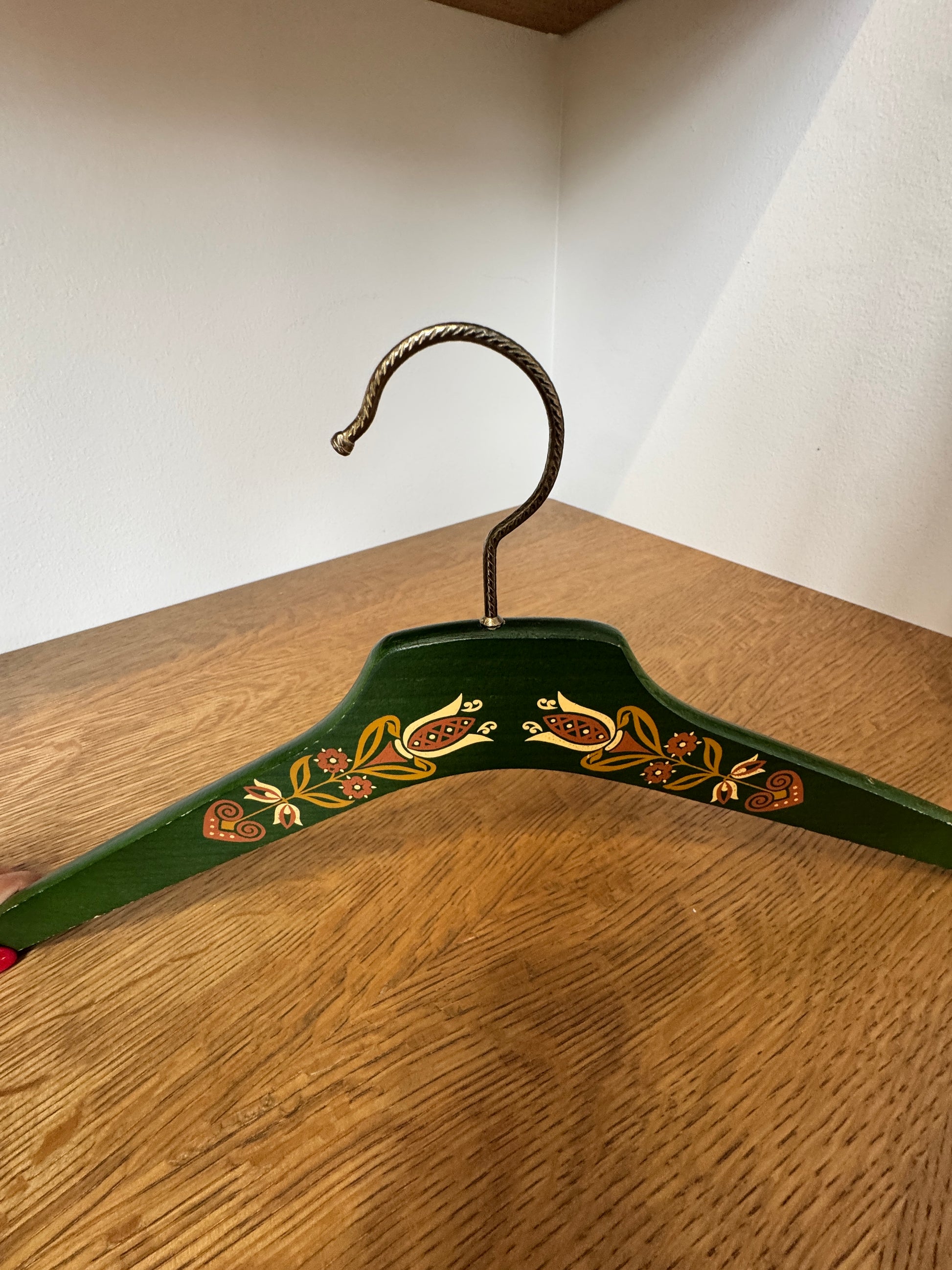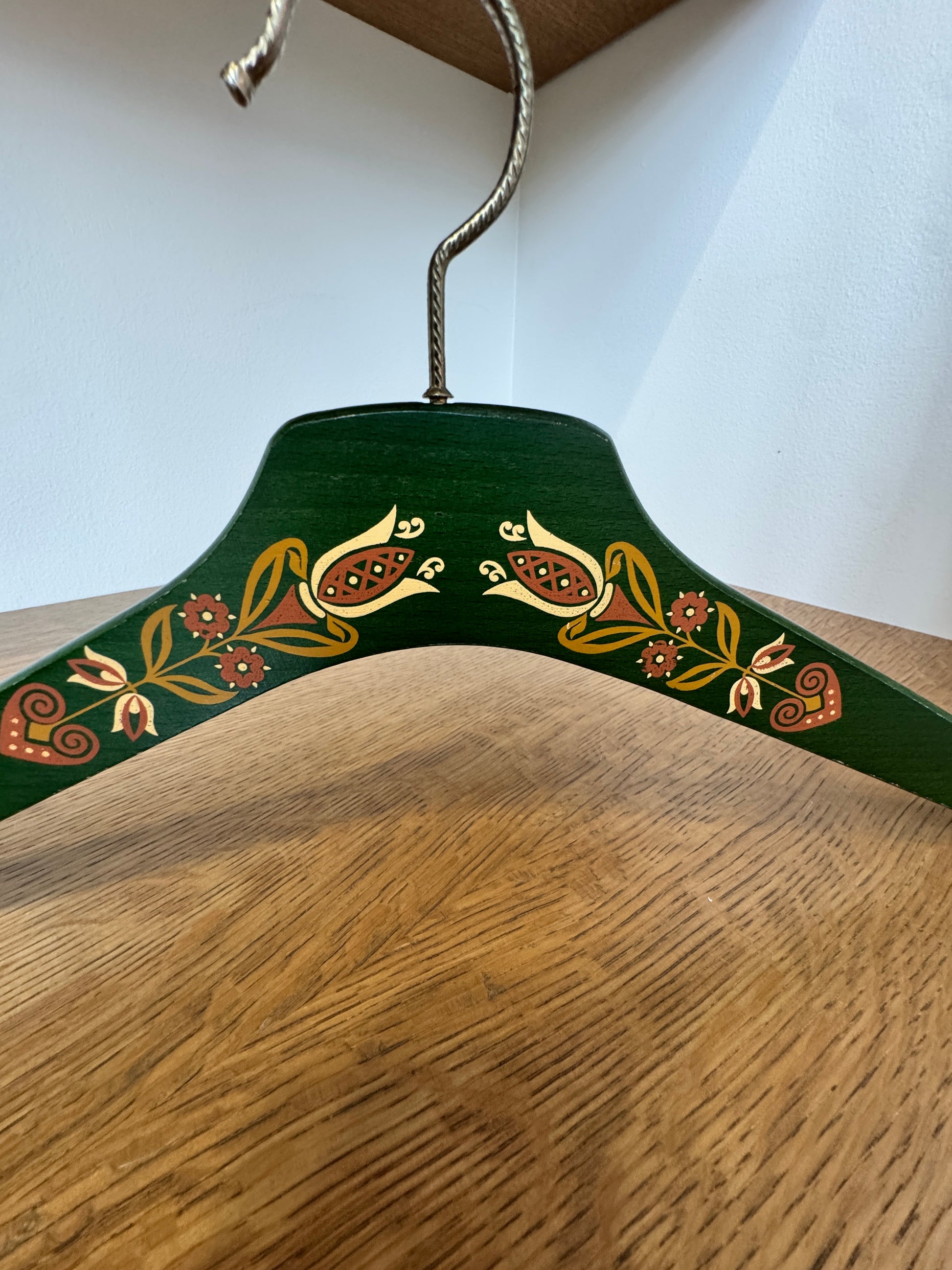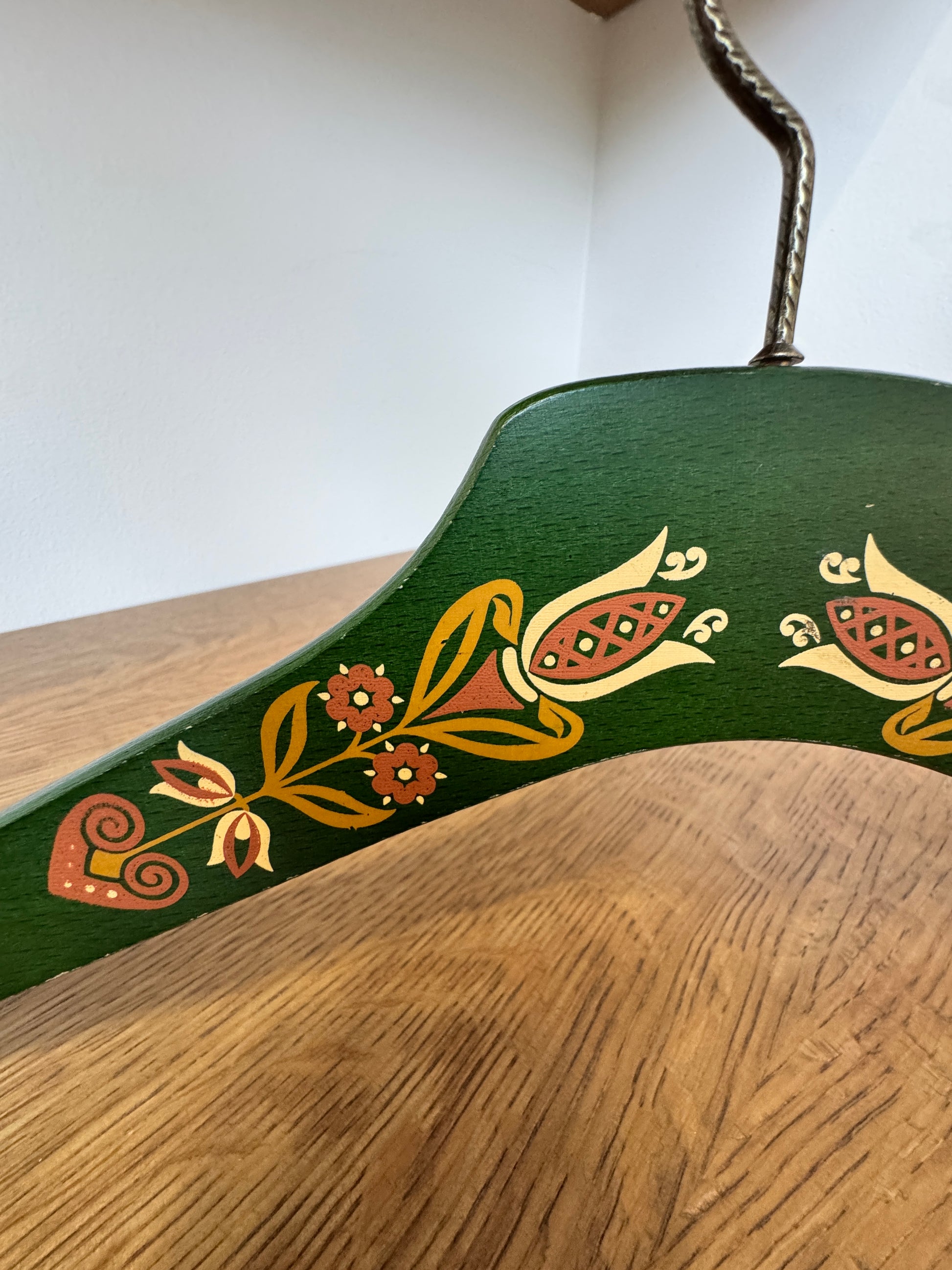 Finished in a deep green with traditional floral tulip motifs in red, gold, and ivory, this hand-painted wooden hanger is both practical and decorative.