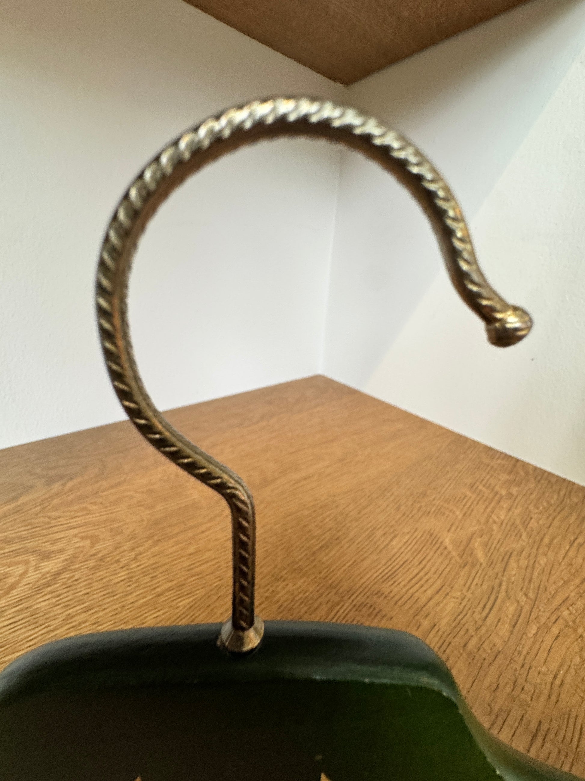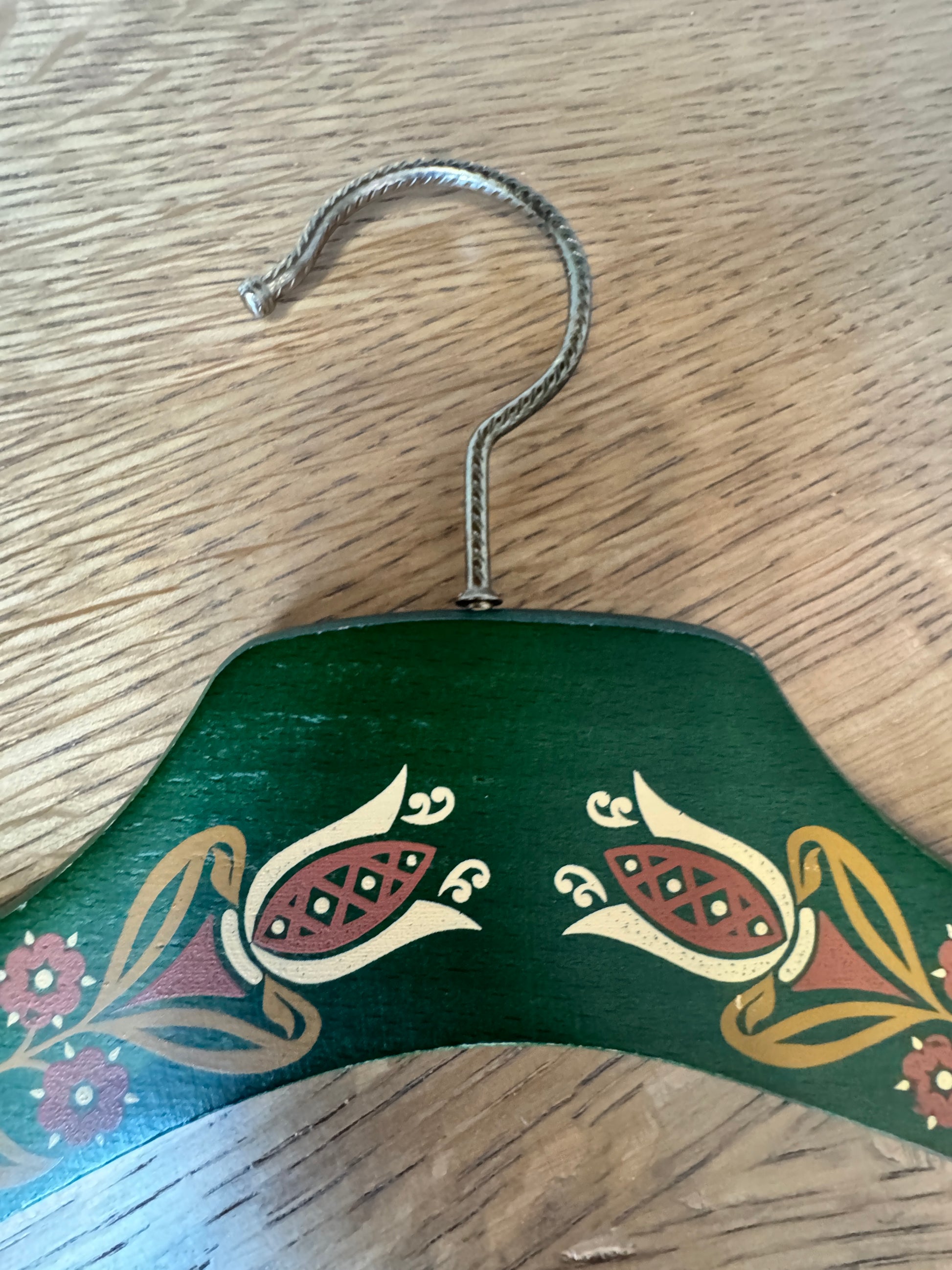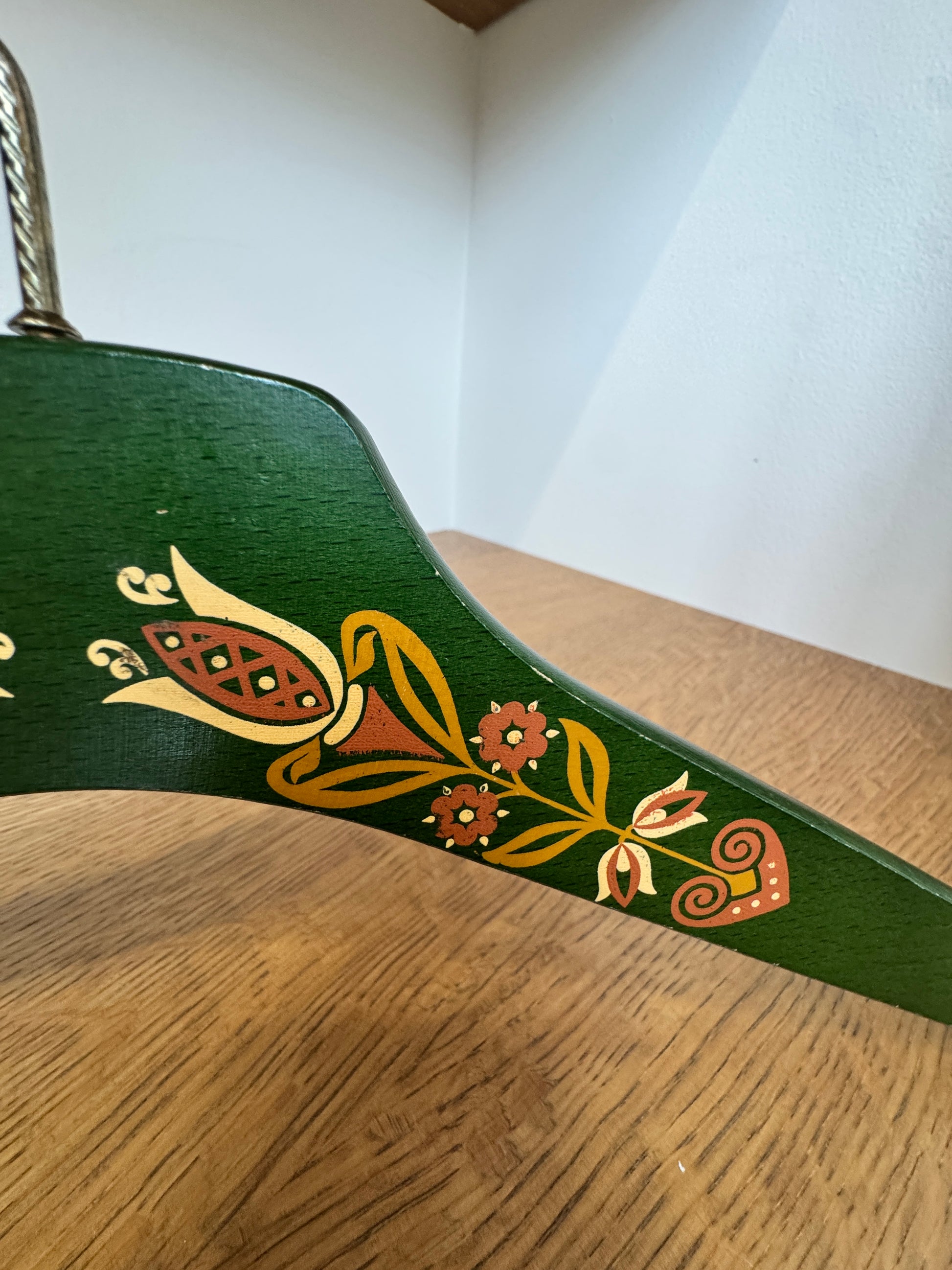 Finished in a deep green with traditional floral tulip motifs in red, gold, and ivory, this hand-painted wooden hanger is both practical and decorative.