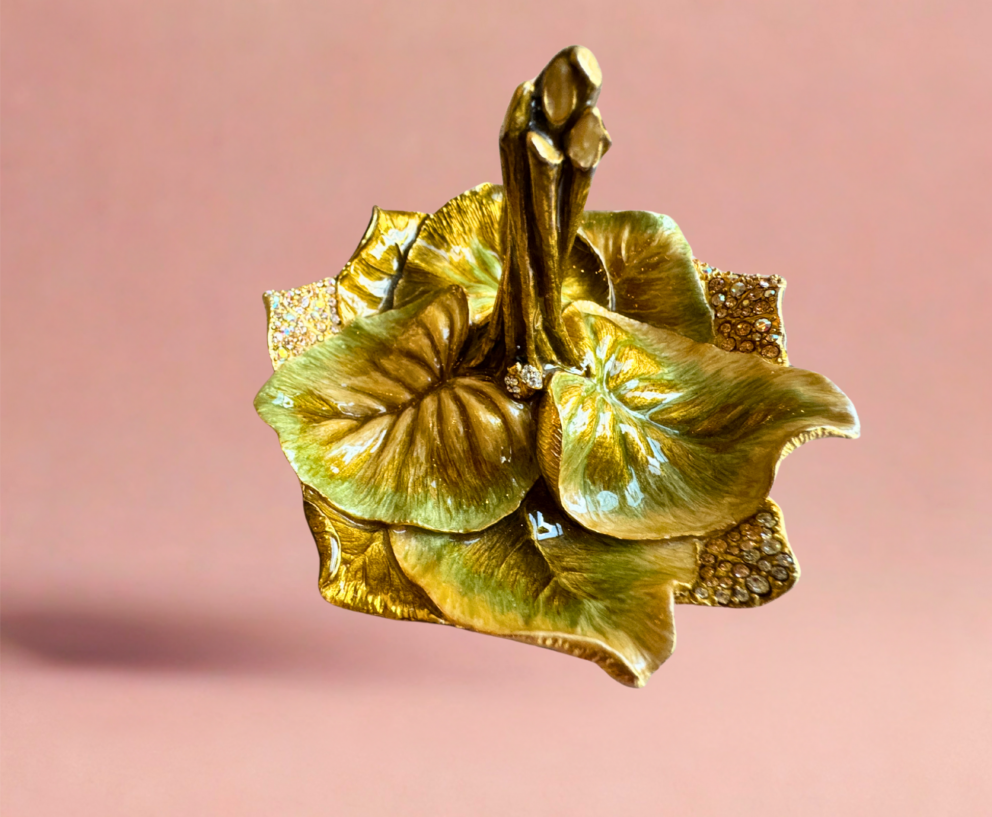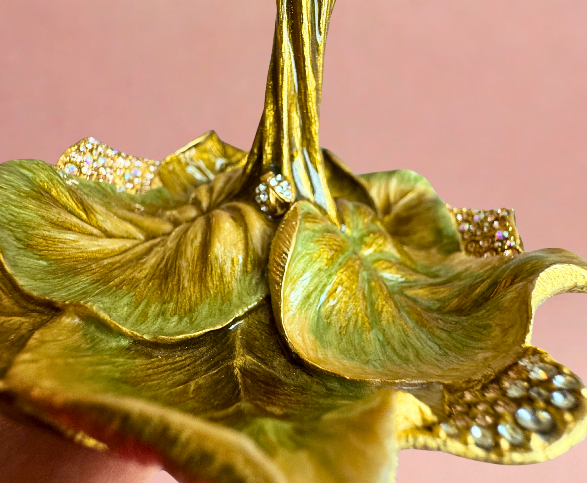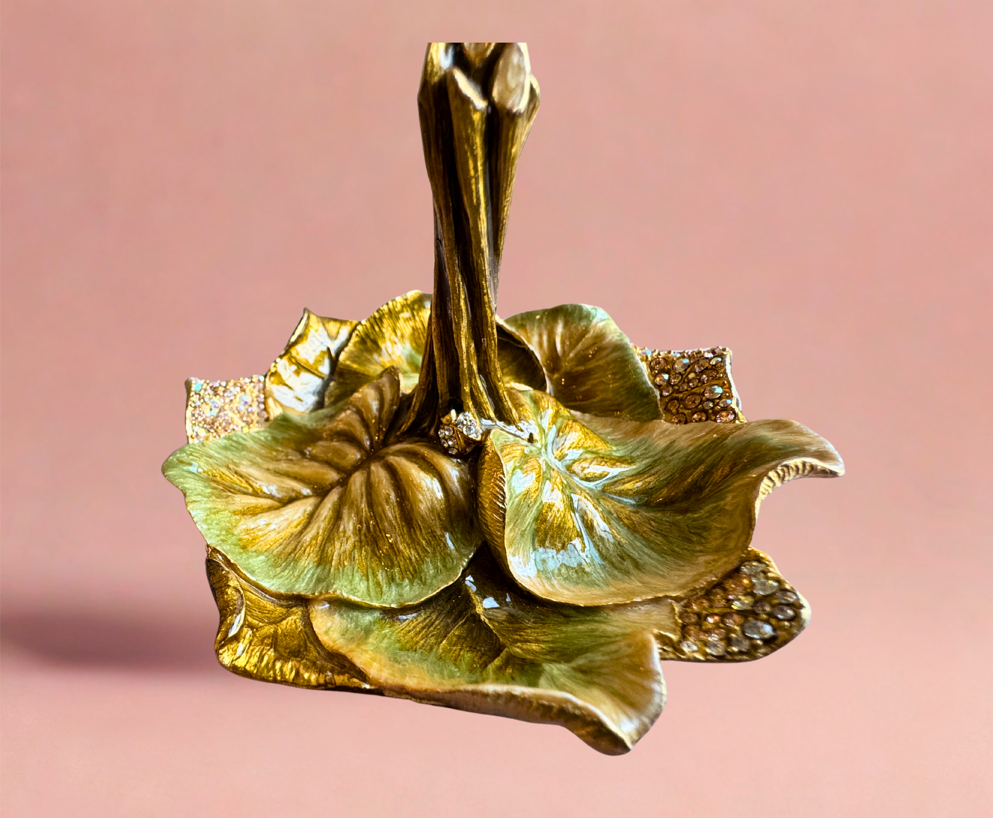 This sculptural calla lily ring holder by Jay Strongwater is a standout vanity piece — with rich green and gold hand-painted enamel leaves and crystal-studded accents. The flower’s center stem is perfectly shaped to cradle rings or dainty jewelry, while the wide base adds drama and luxury.