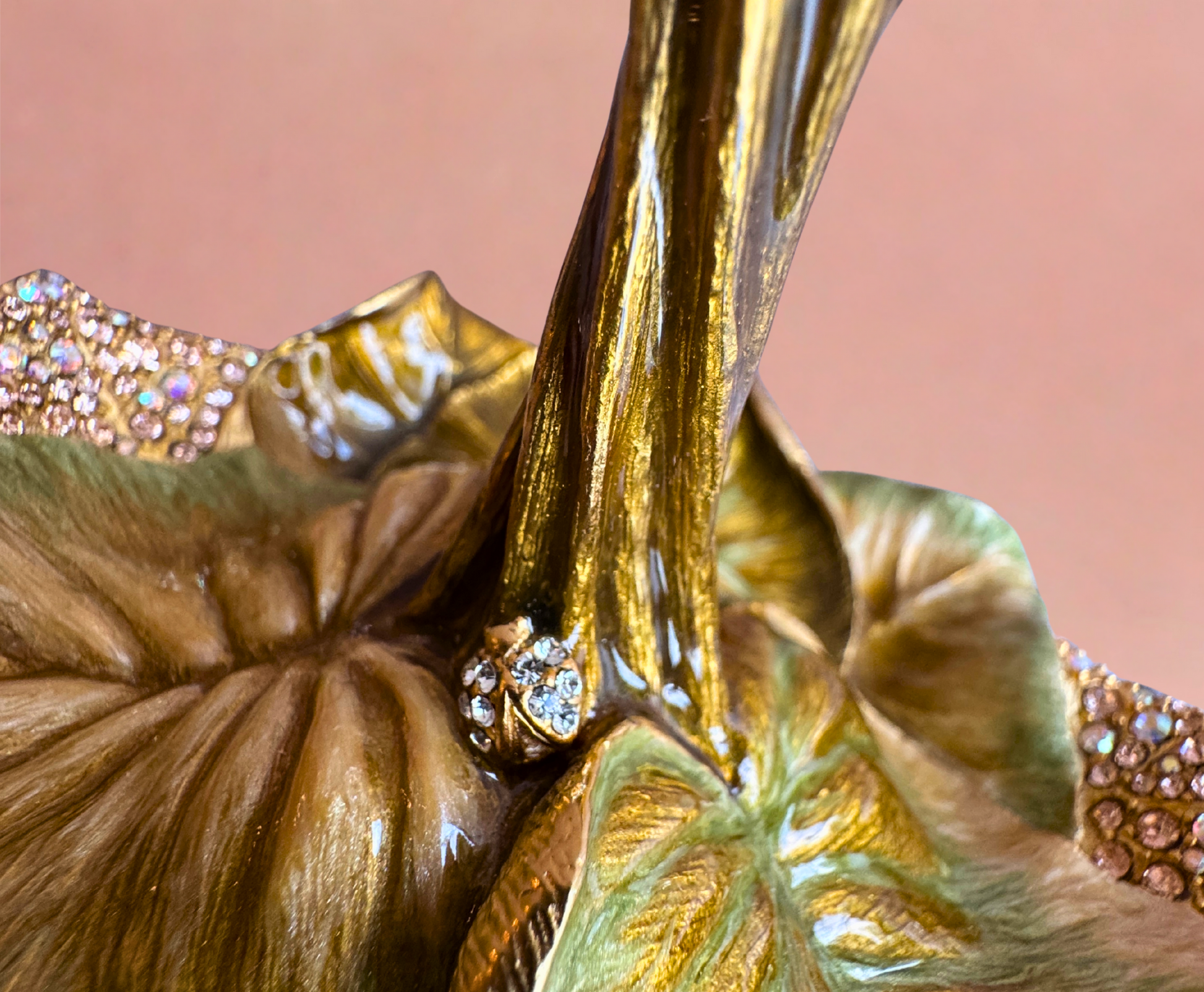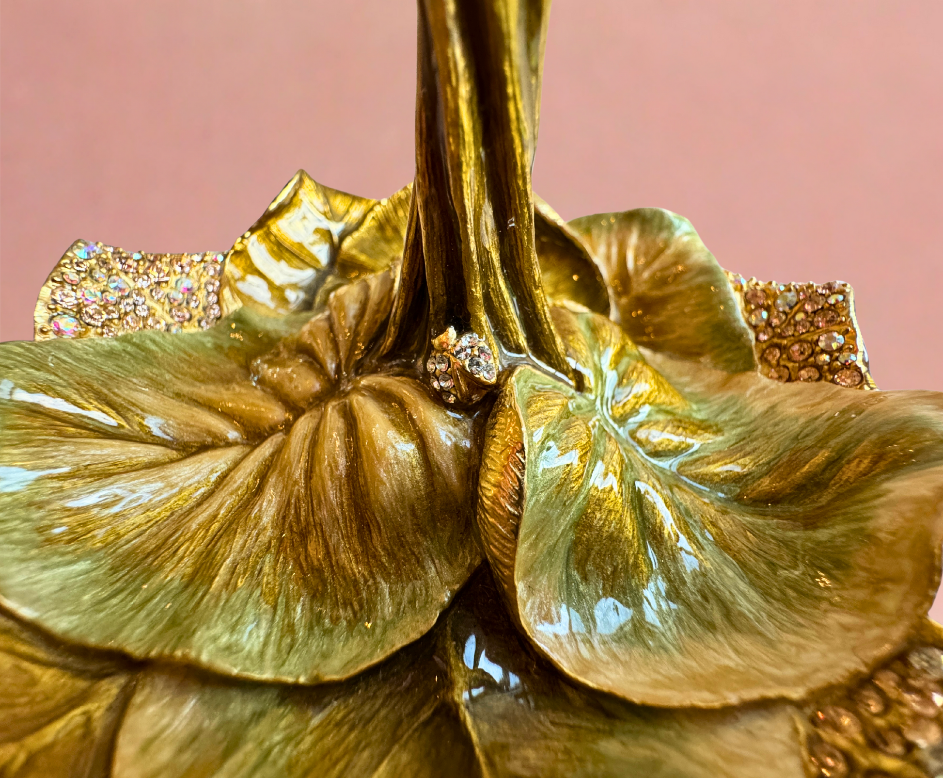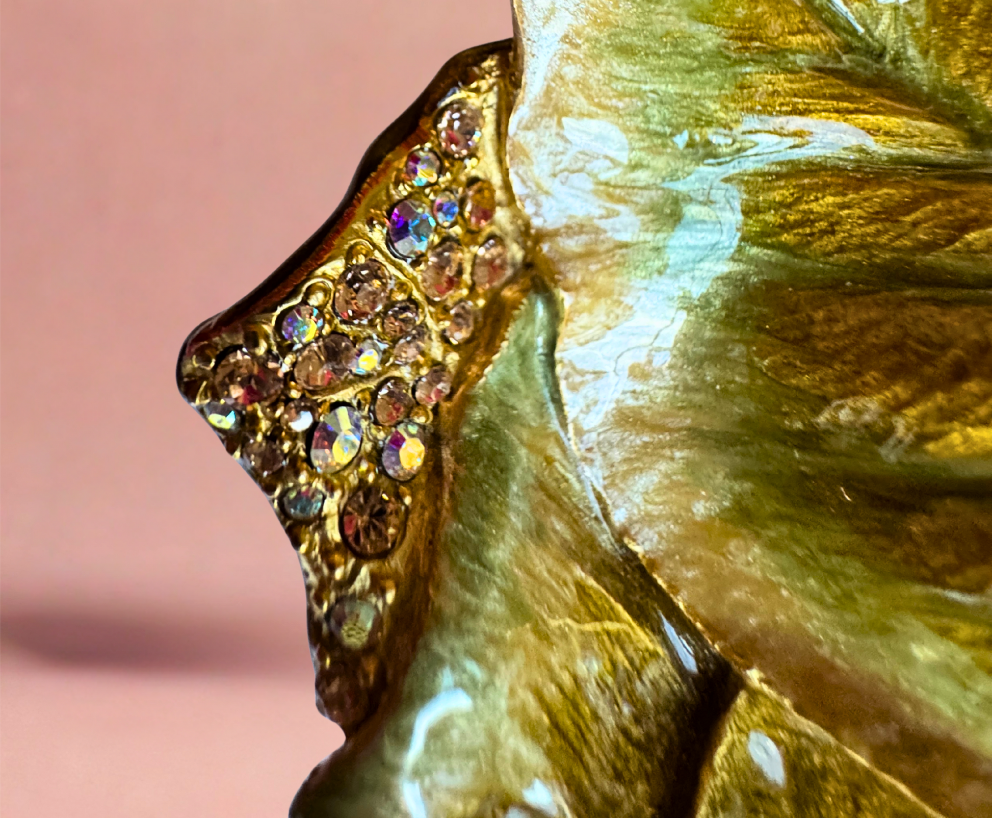 This sculptural calla lily ring holder by Jay Strongwater is a standout vanity piece — with rich green and gold hand-painted enamel leaves and crystal-studded accents. The flower’s center stem is perfectly shaped to cradle rings or dainty jewelry, while the wide base adds drama and luxury.
