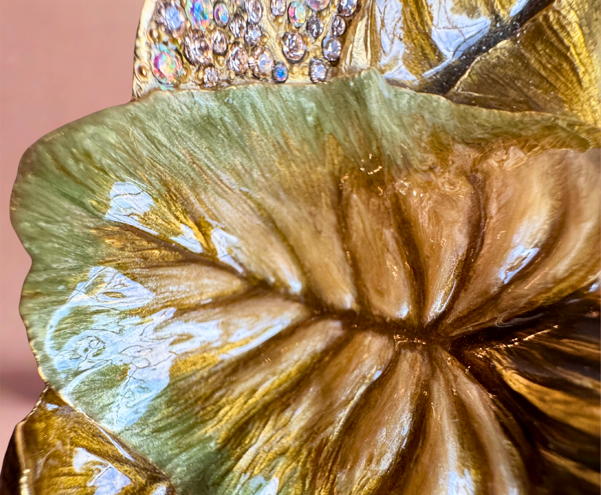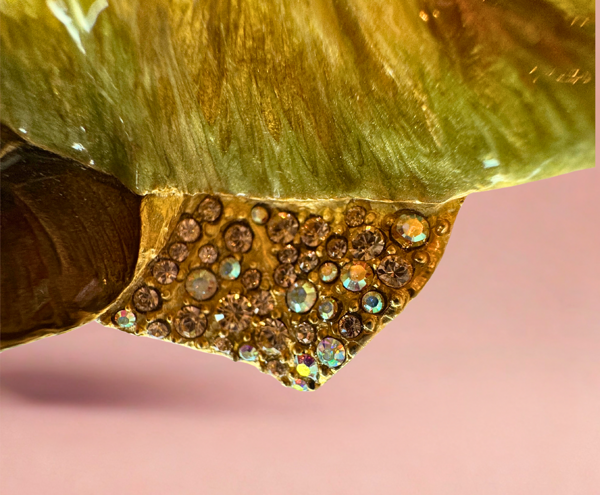 Jay Strongwater is known for his theatrical, luxe take on everyday objects — and this piece exemplifies that vision. With hand-applied enamel, crystal embellishments, and a solid cast metal base, it’s both functional and ornamental. Signed on the underside, this piece is a work of art worthy of display.