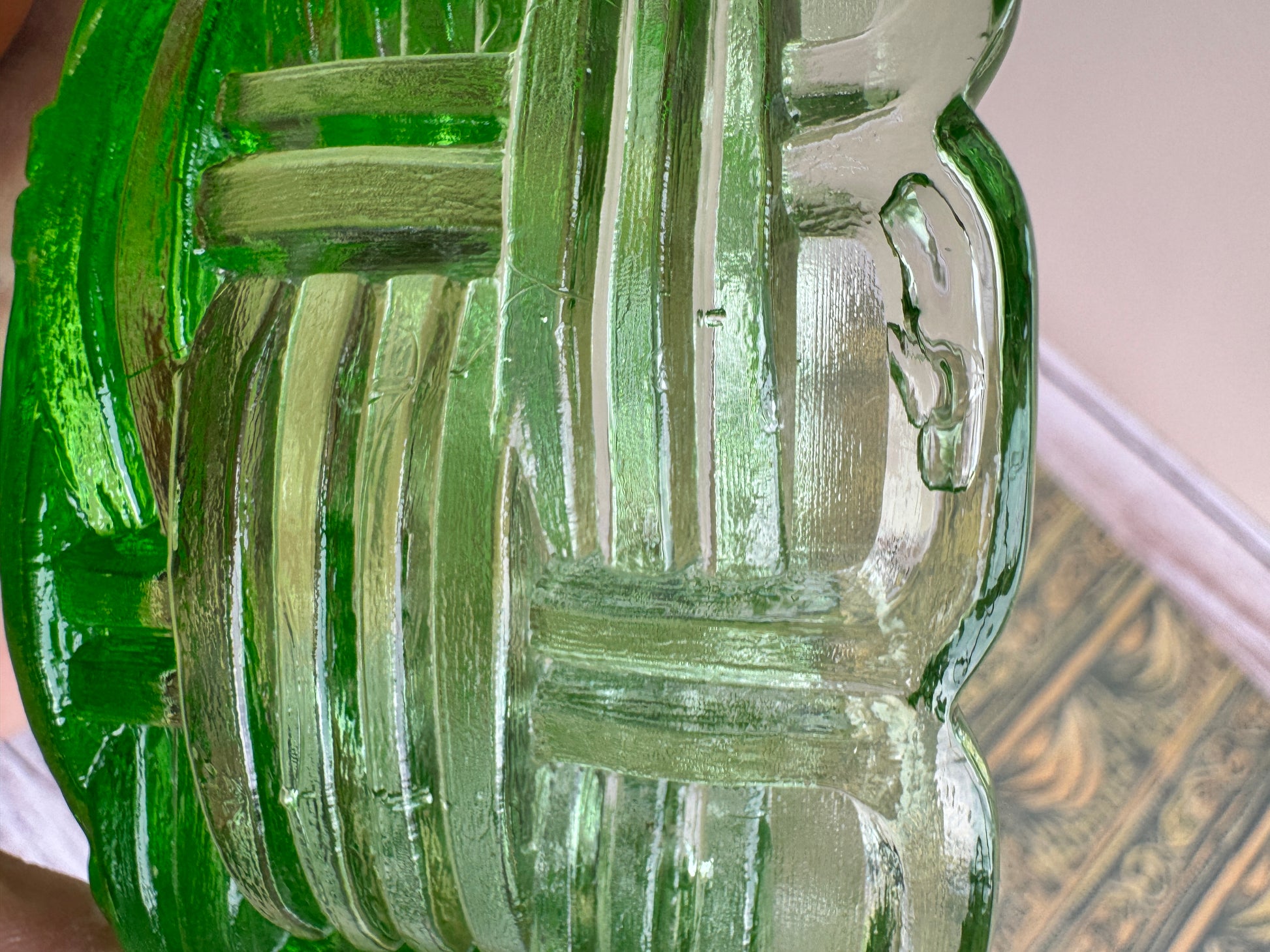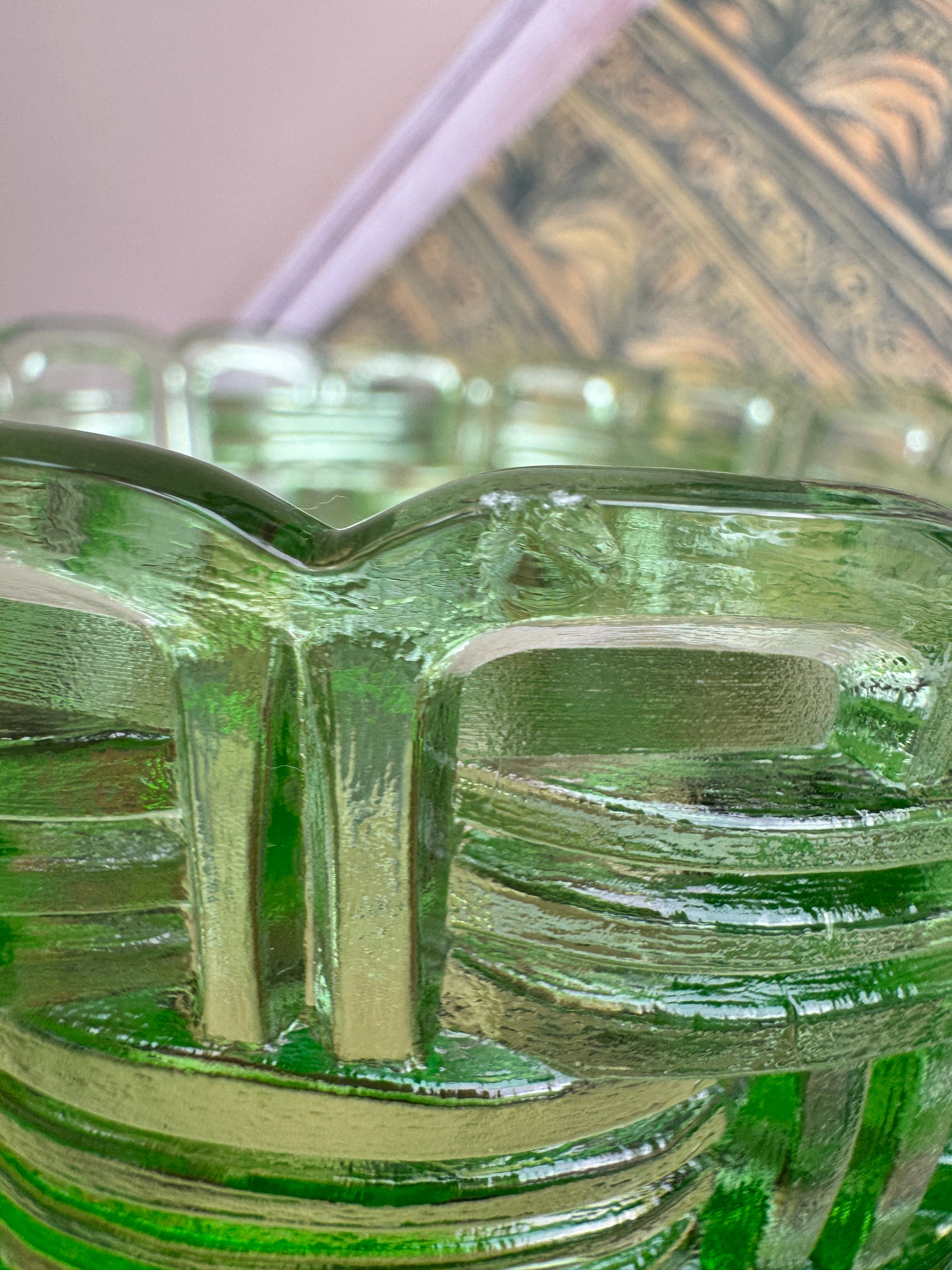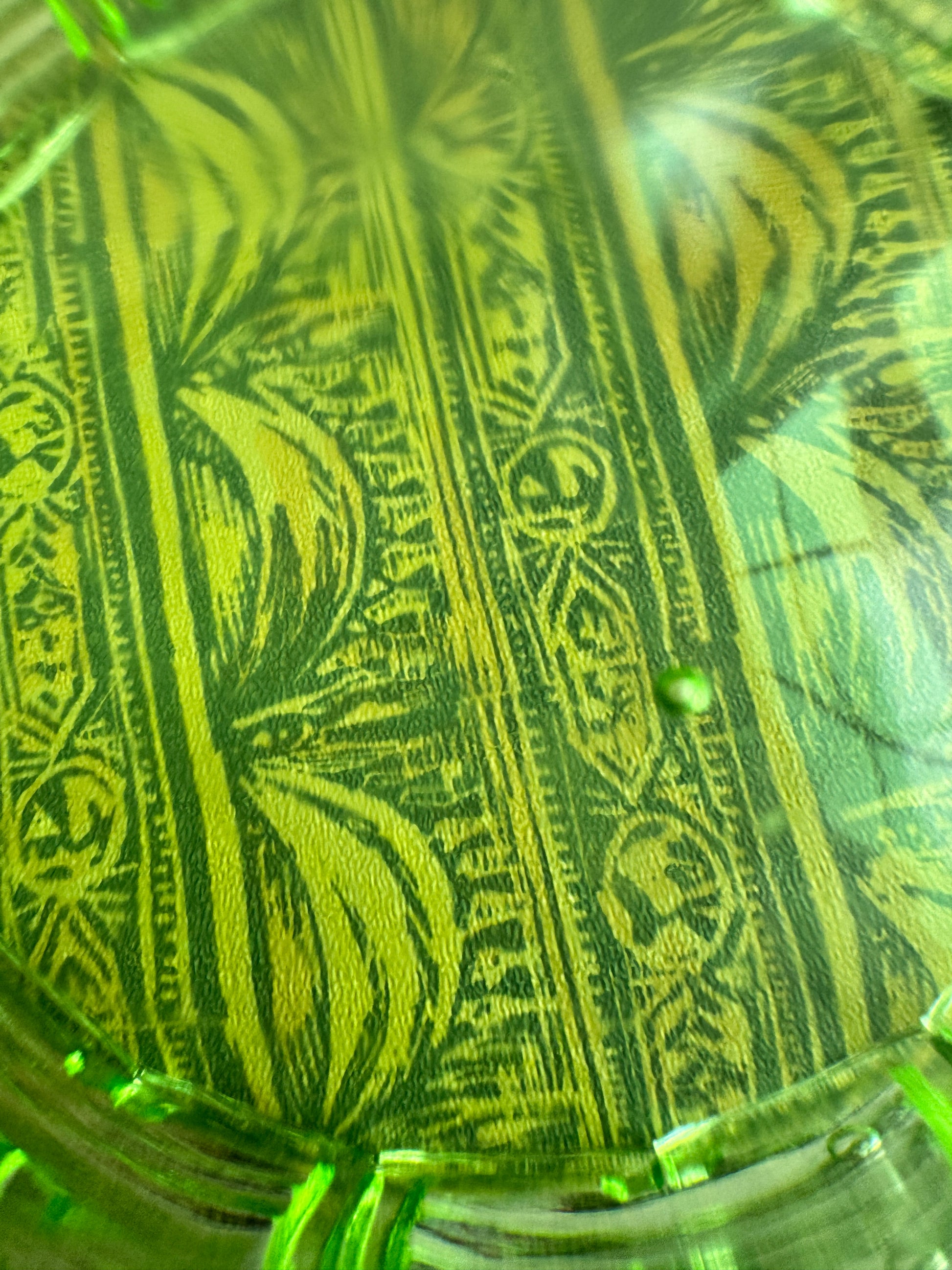 The Wicker pattern is instantly recognizable for its basketweave-inspired panels and scalloped edge. Though it doesn’t glow under UV light like some uranium glass, its bold color and textured design still bring vintage charm to any space.