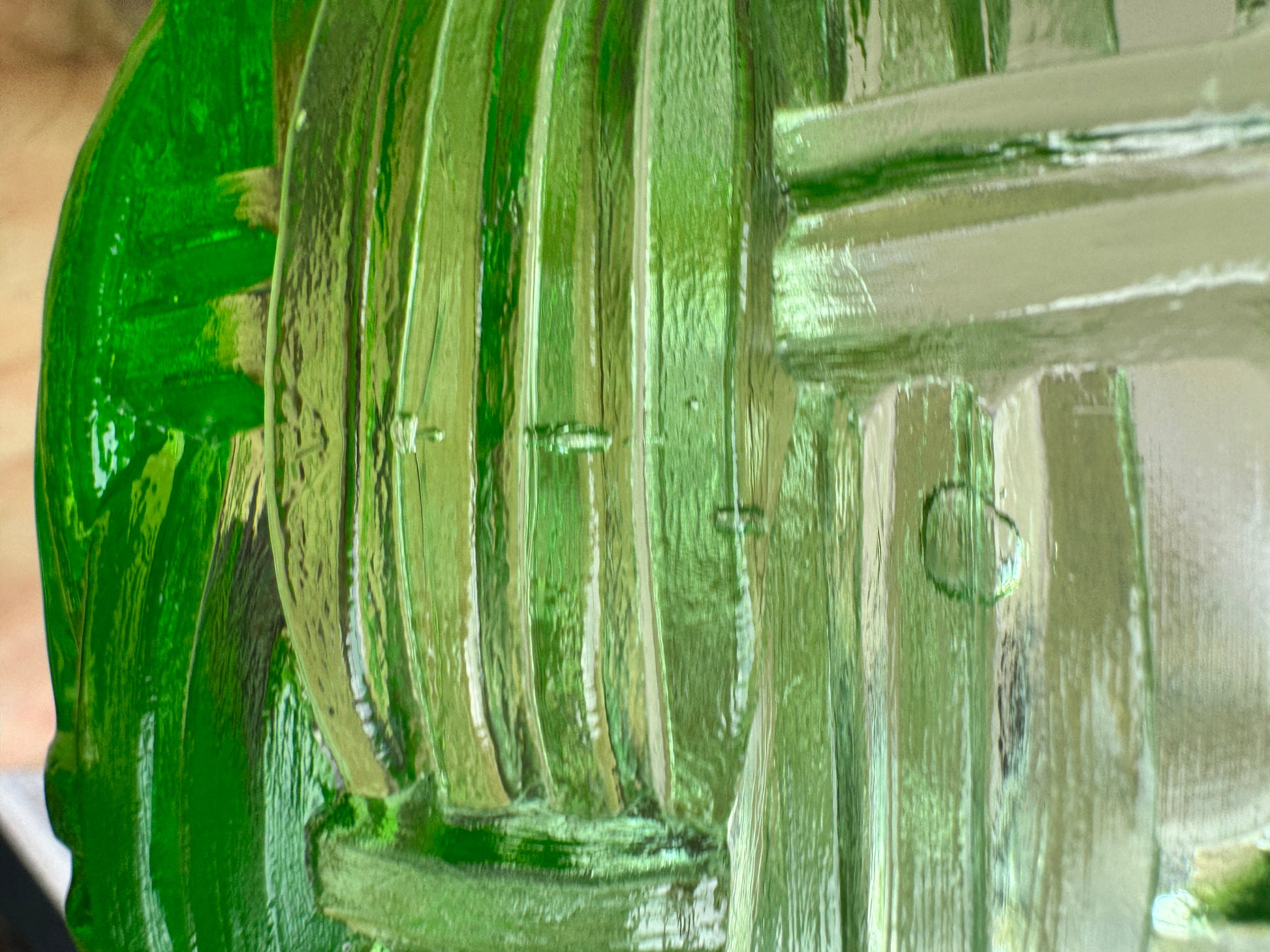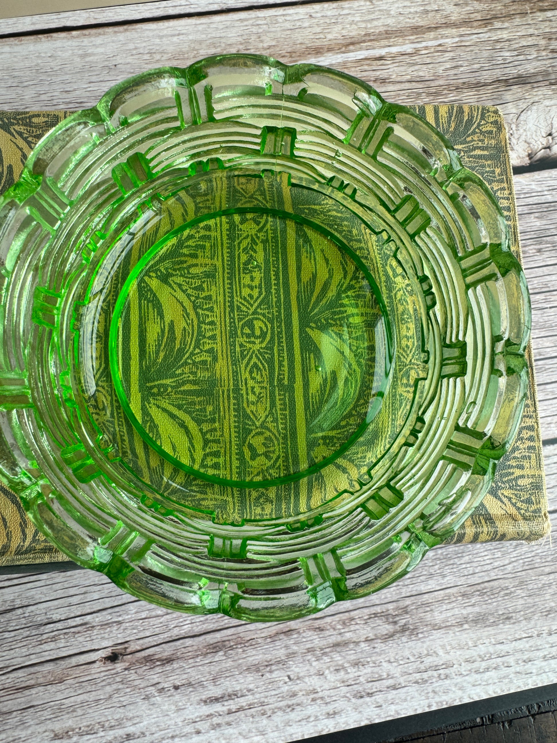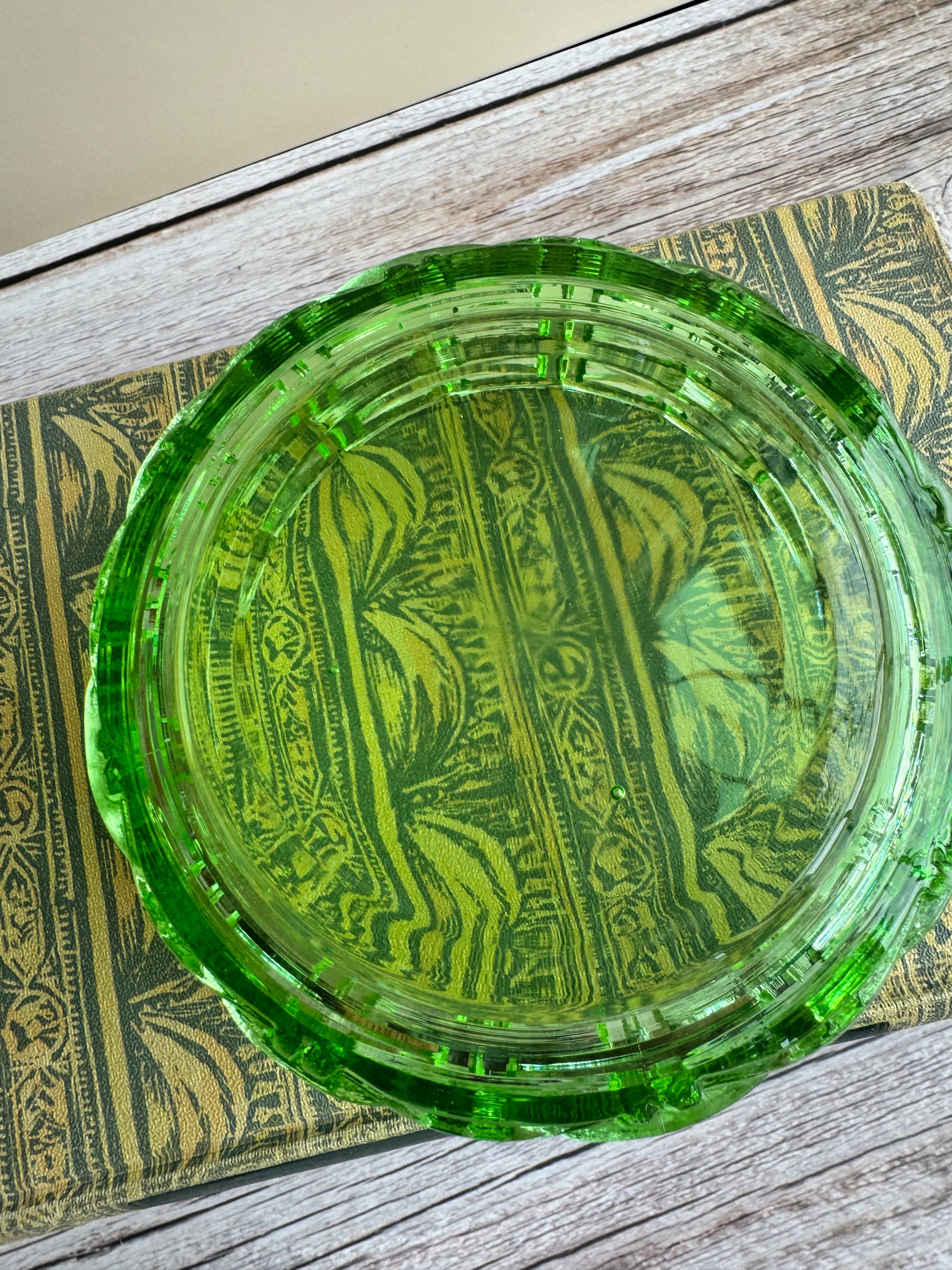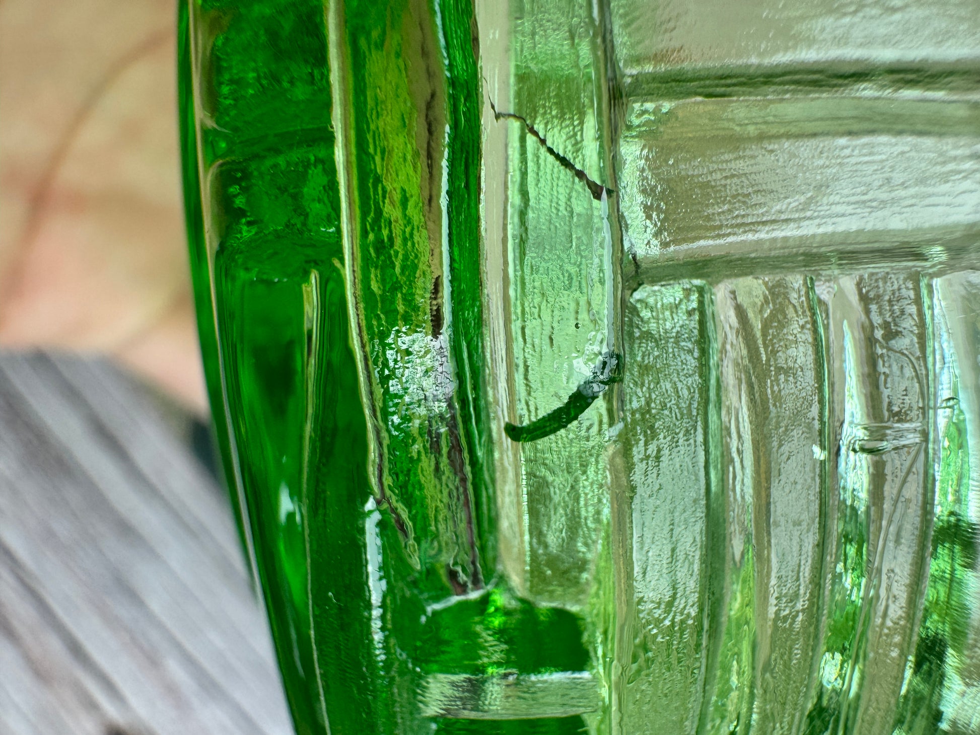 The Wicker pattern is instantly recognizable for its basketweave-inspired panels and scalloped edge. Though it doesn’t glow under UV light like some uranium glass, its bold color and textured design still bring vintage charm to any space.