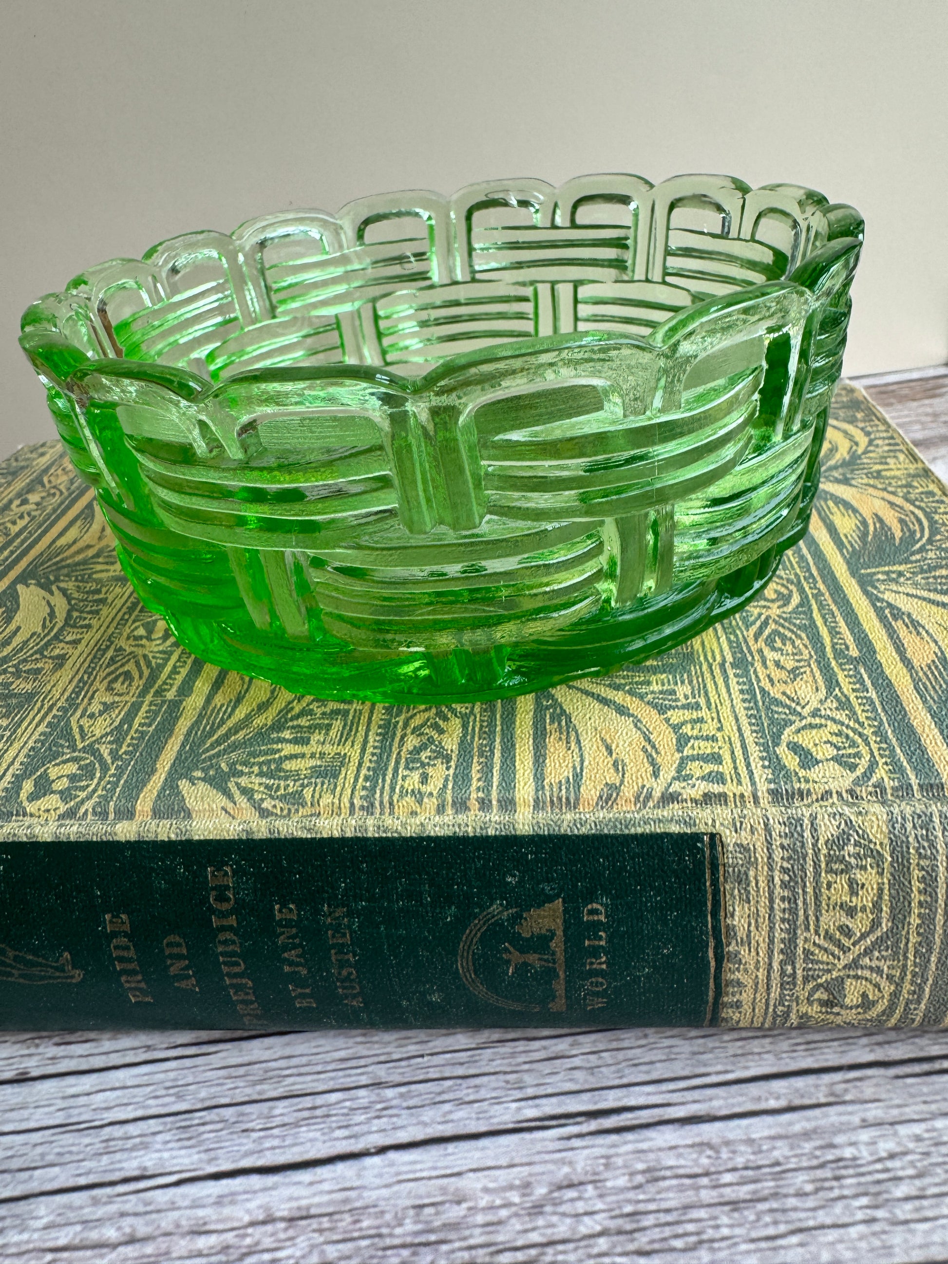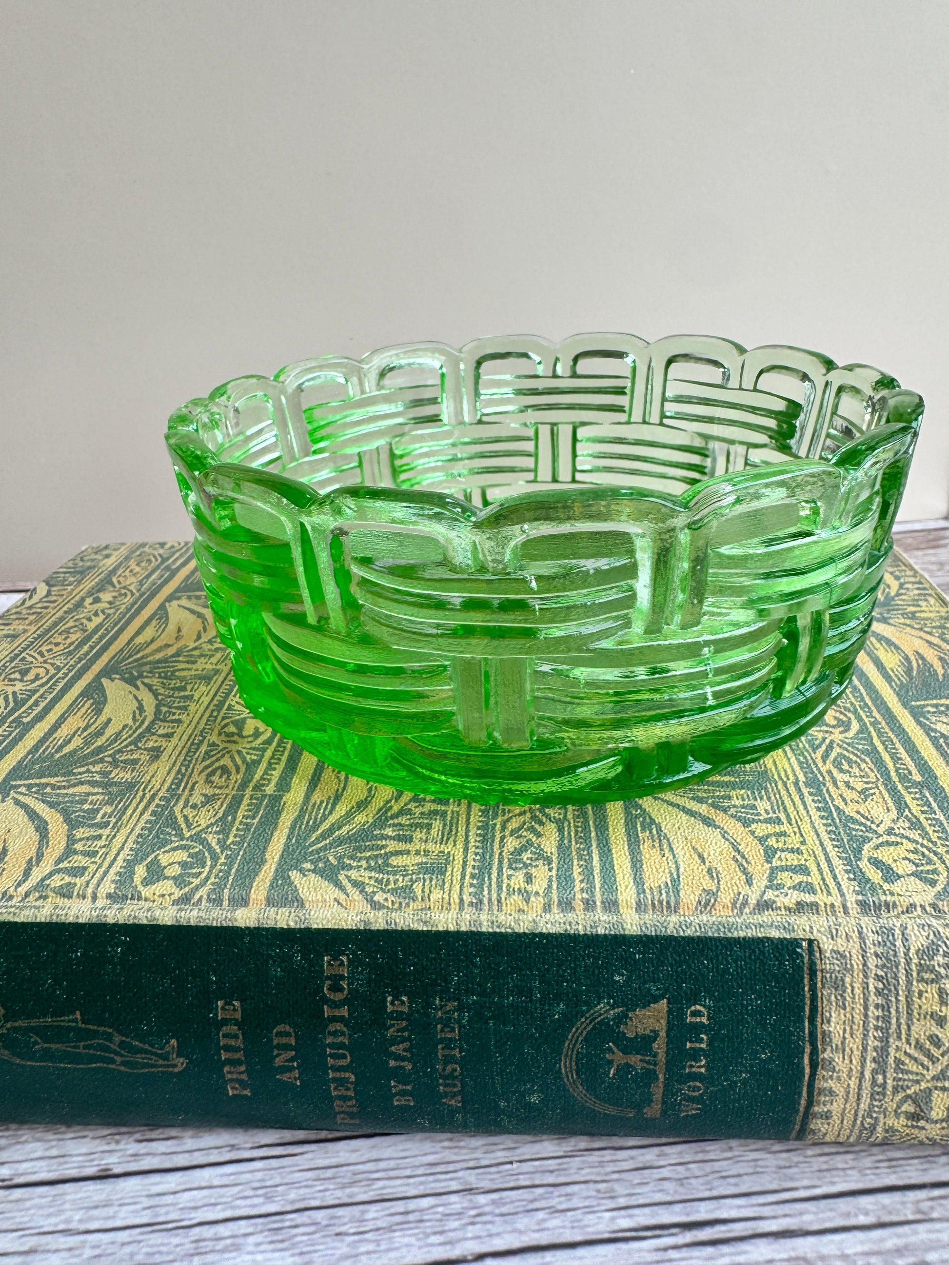 L.E. Smith Apple Green Wicker Pattern Glass Bowl – 1930s Depression Glass