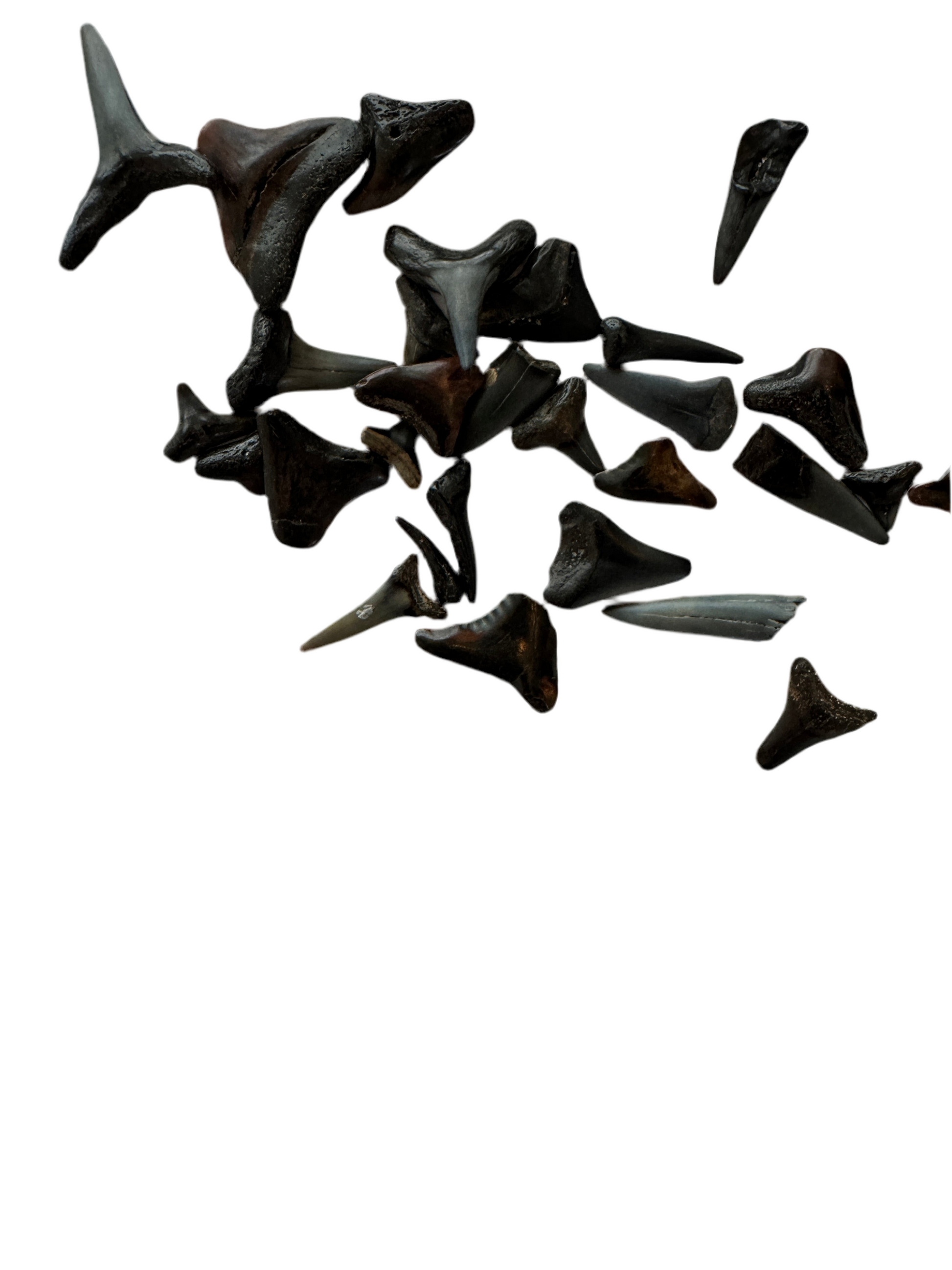 This lot includes 29 shark teeth fossils, each with its own distinct shape, size, and color variation ranging from dark gray to brown and black. Some show sharp points and serrated edges, while others carry the smooth wear of age.