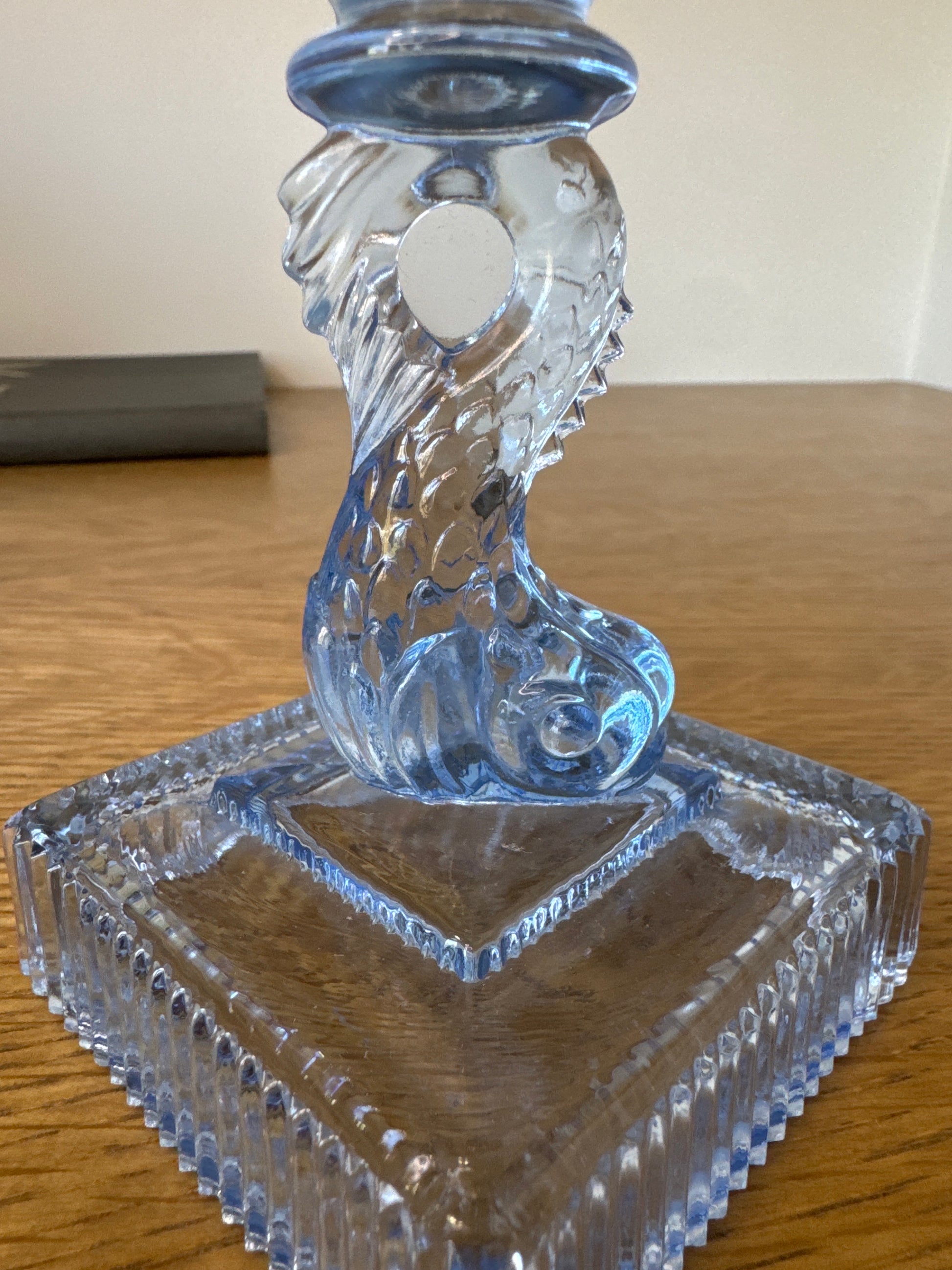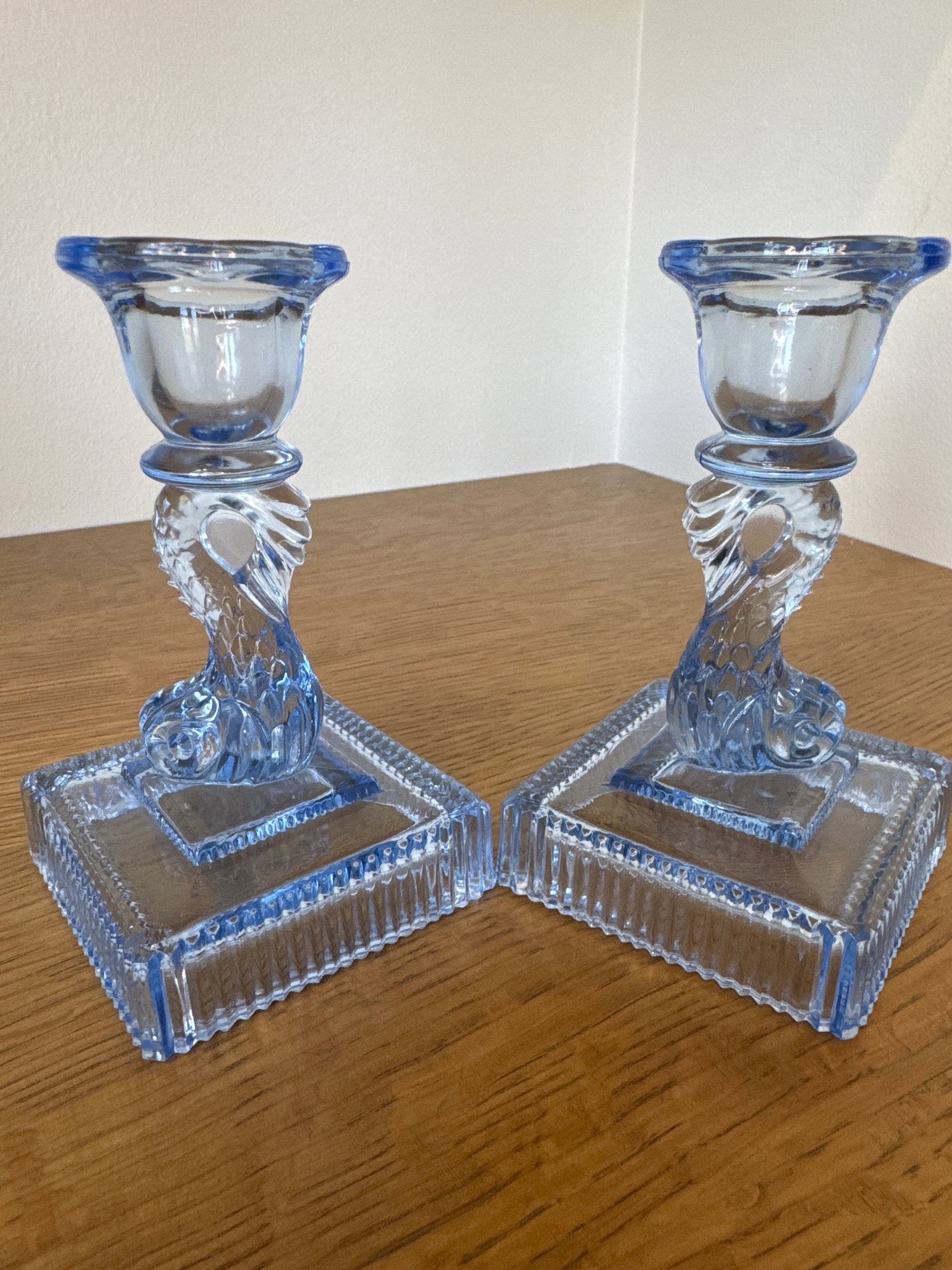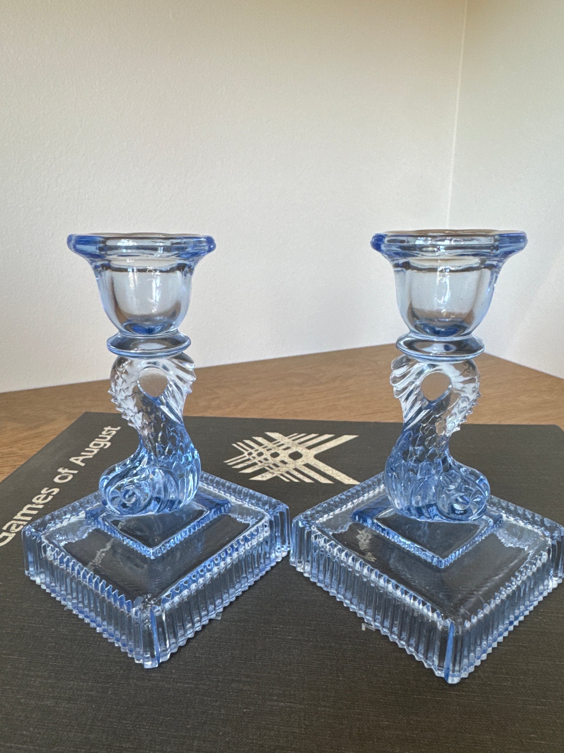 his charming pair of mid-century blue glass candlestick holders features stylized dolphin stems with graceful curves and pressed details. Each piece is made from vibrant blue glass with a glossy finish, bringing a playful but elegant touch to your table, shelf, or windowsill.