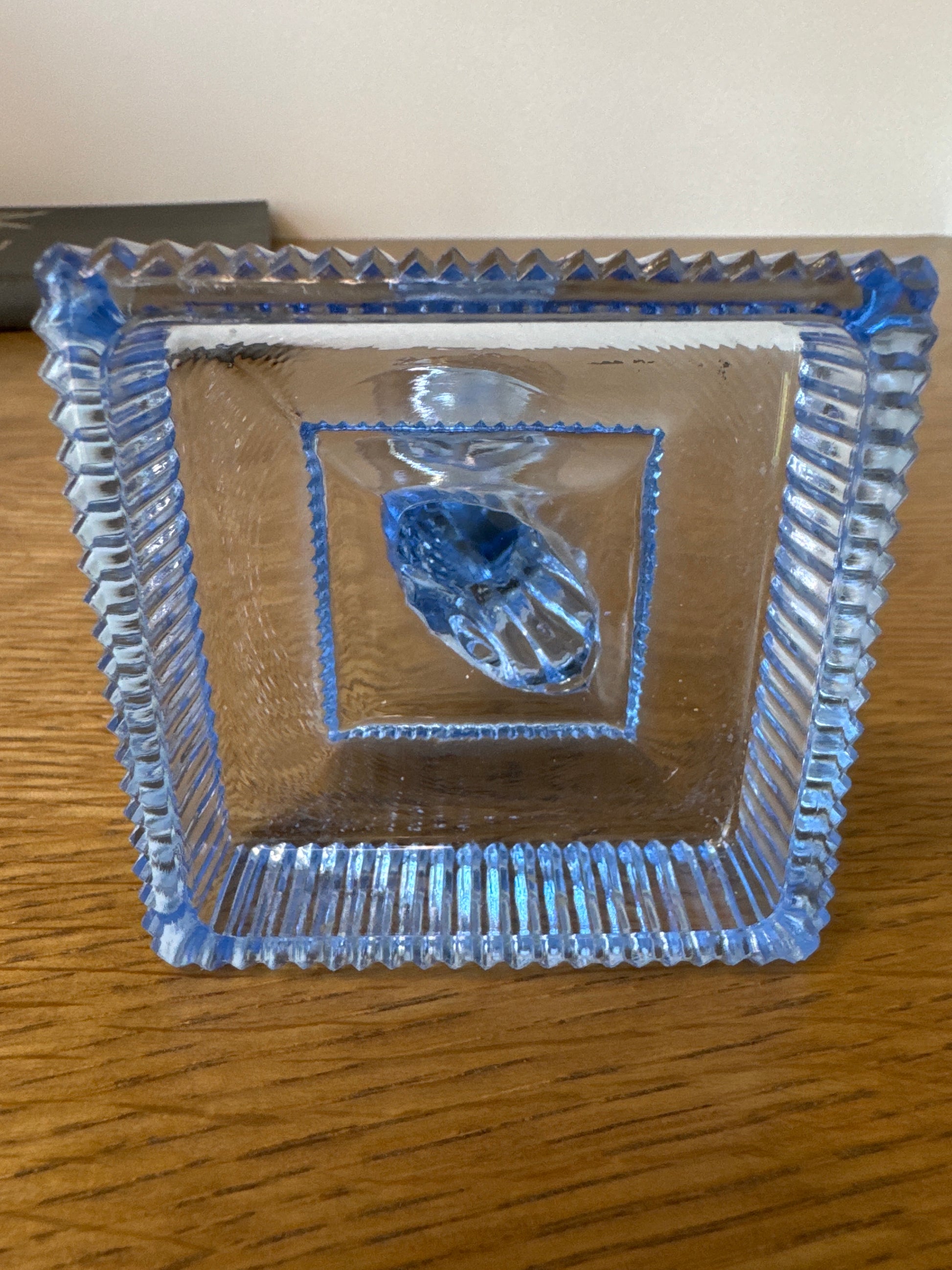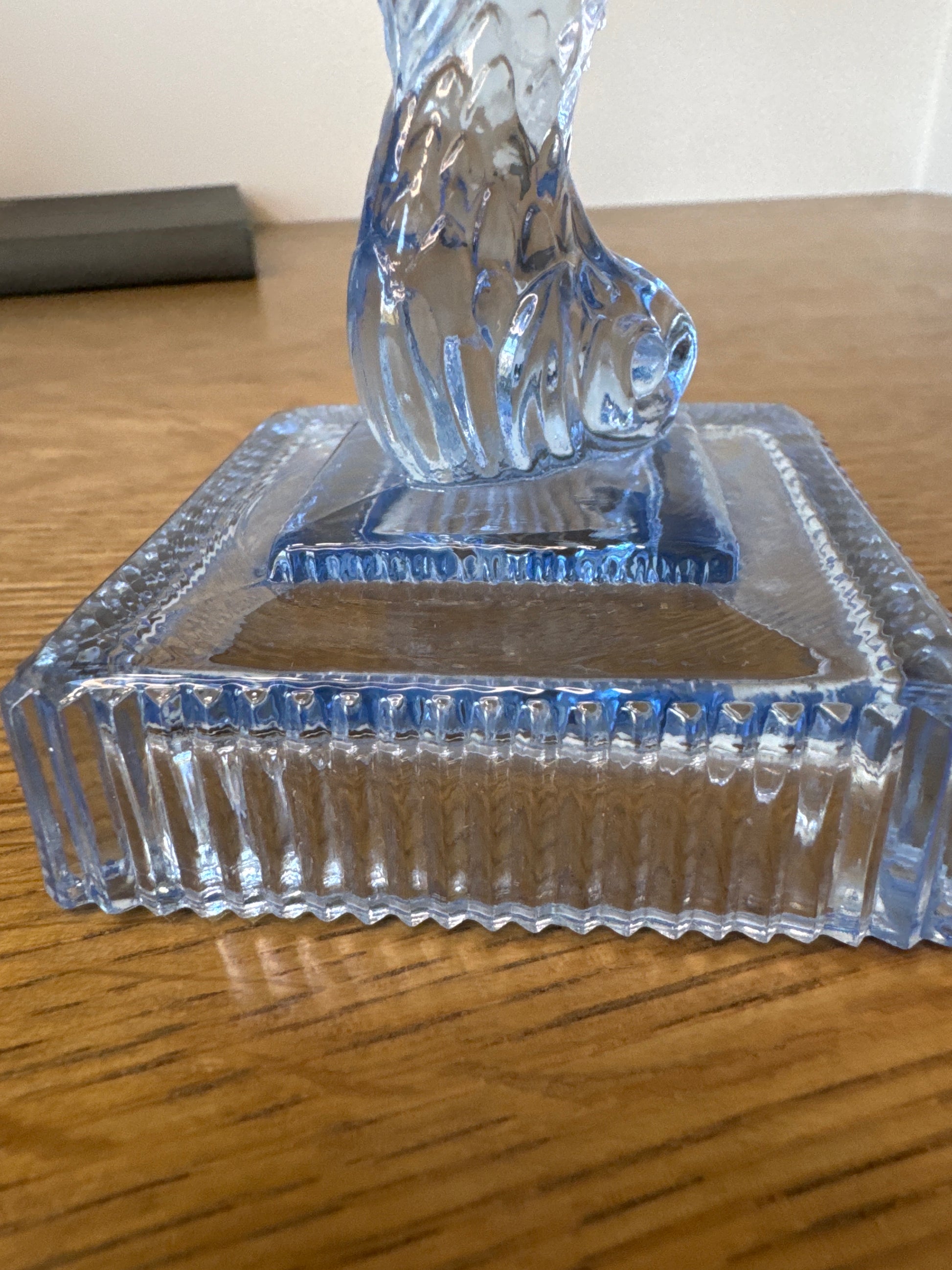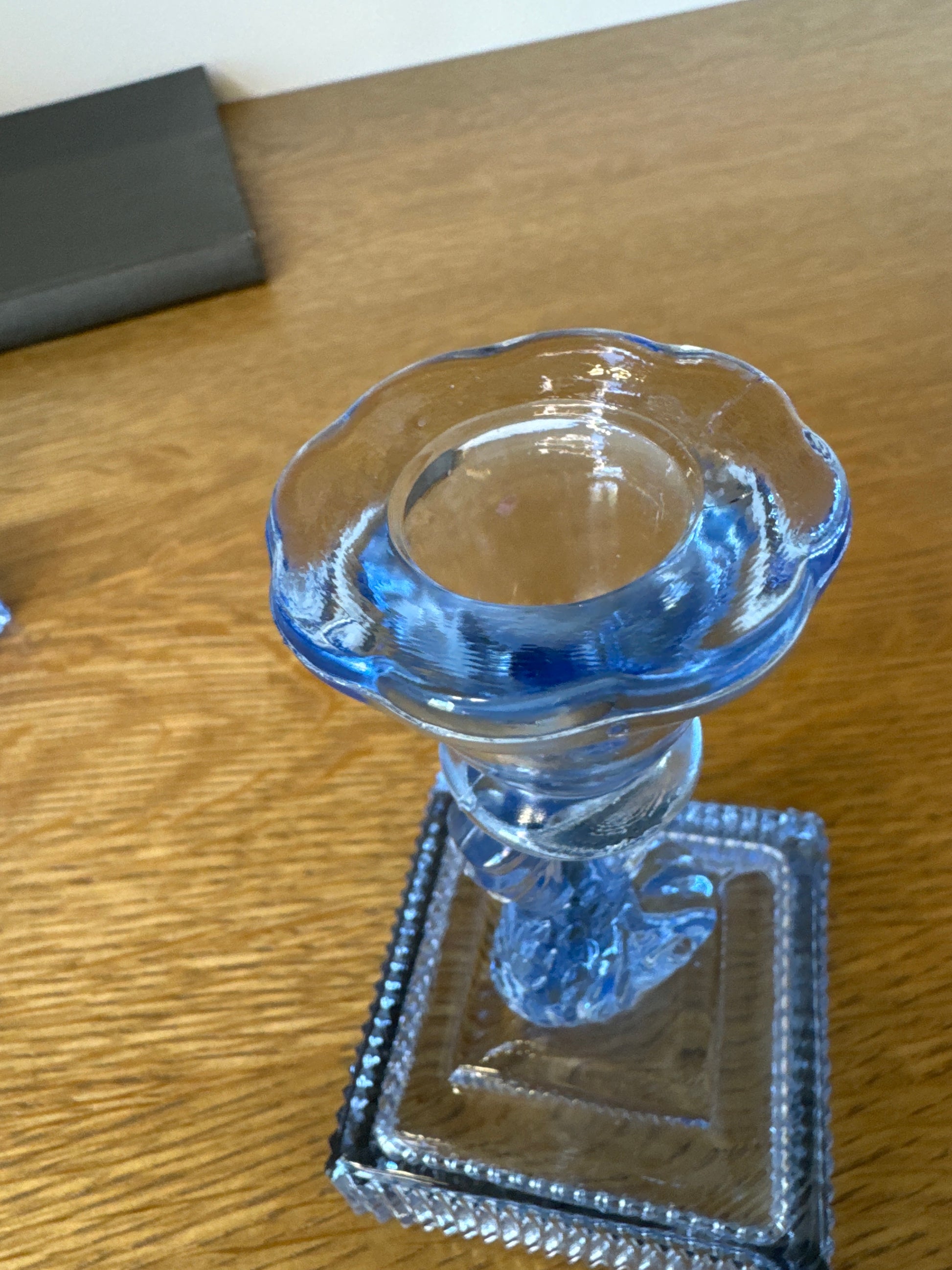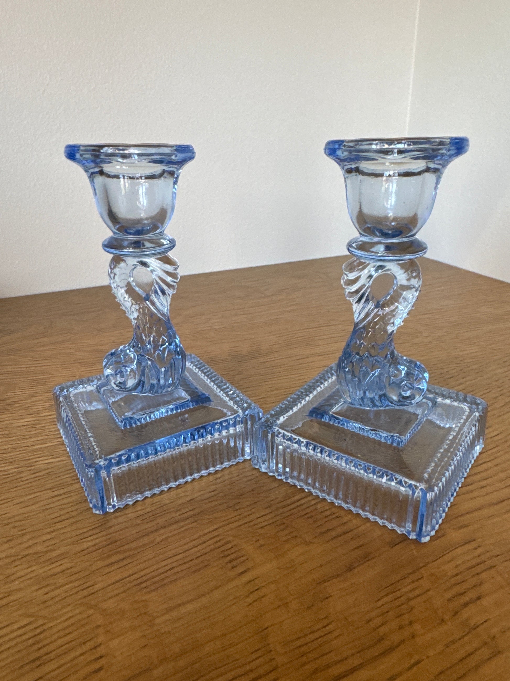 his charming pair of mid-century blue glass candlestick holders features stylized dolphin stems with graceful curves and pressed details. Each piece is made from vibrant blue glass with a glossy finish, bringing a playful but elegant touch to your table, shelf, or windowsill.