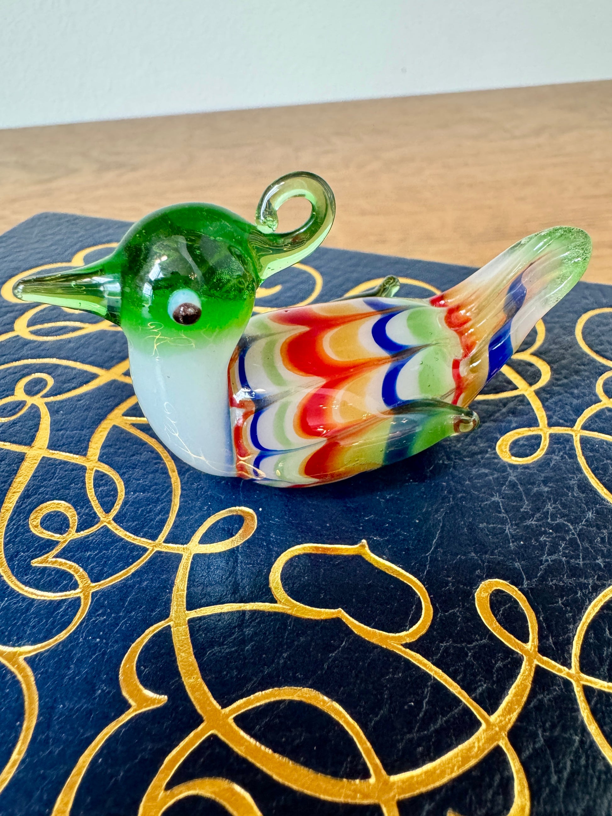 A charming handblown glass bird figurine in the Murano style, showcasing vibrant rainbow swirls of red, blue, orange, green, and white with a clear glass finish. Small in size yet full of personality, this colorful piece is perfect for collectors of art glass or as a cheerful accent on a desk, shelf, or windowsill.