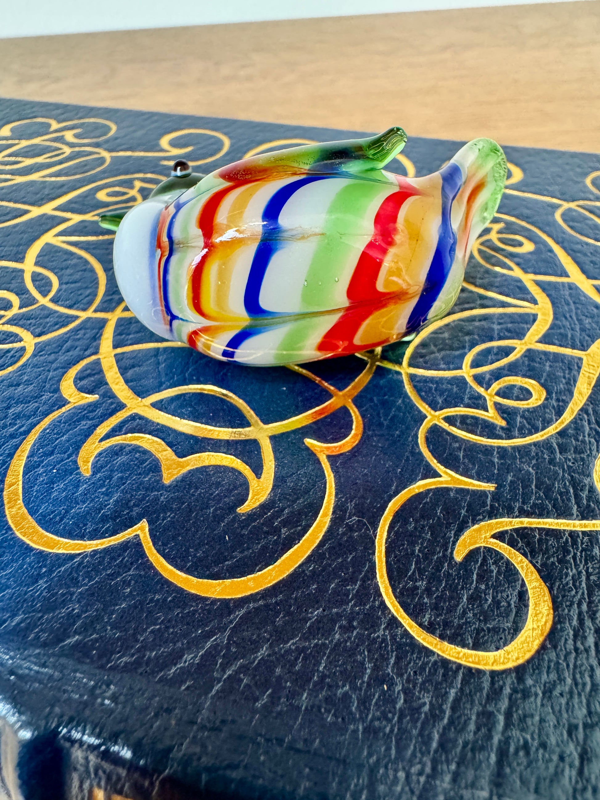 Style: Murano-inspired multicolor swirl design with green head and looped tail detail