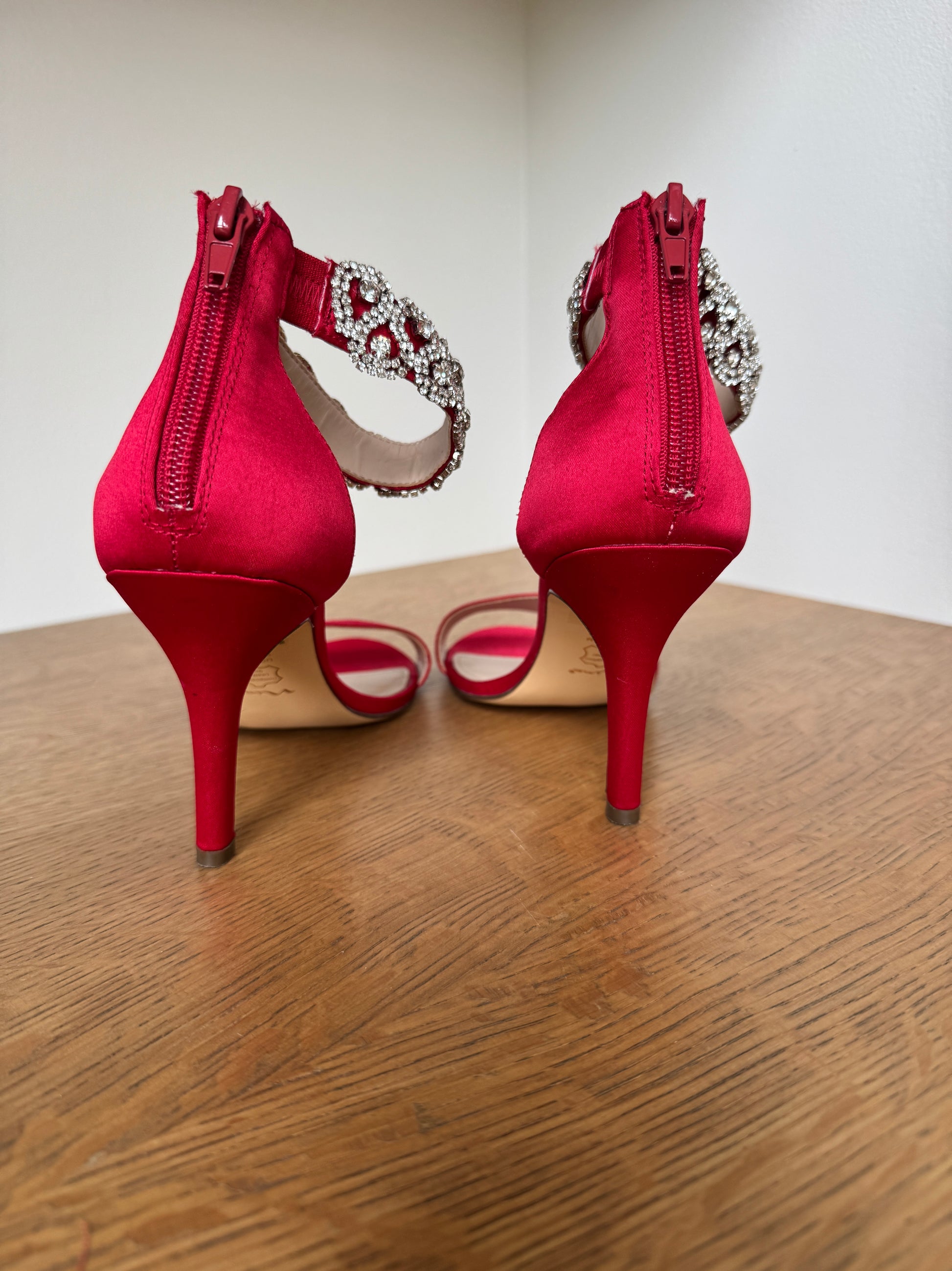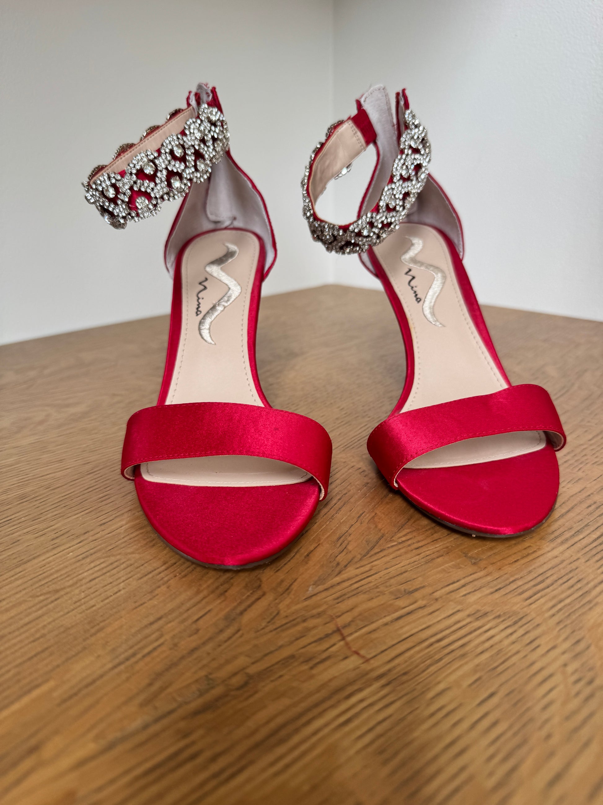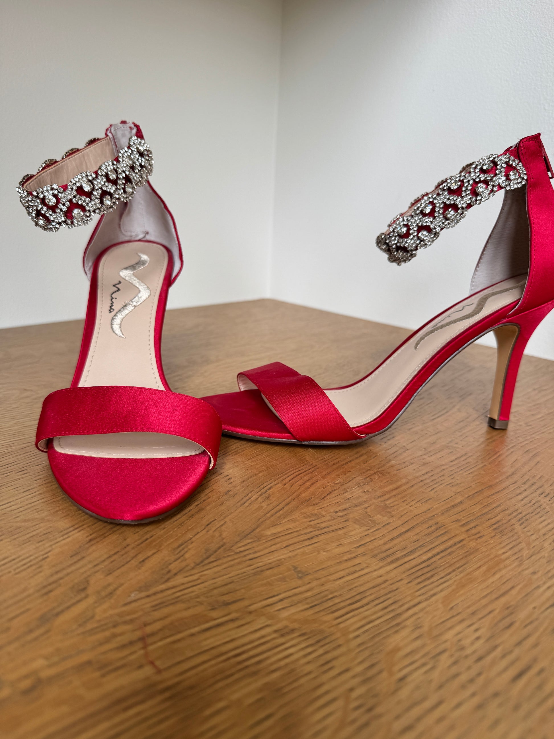 Nina Red Satin Heels with Rhinestone Ankle Strap – Size 8