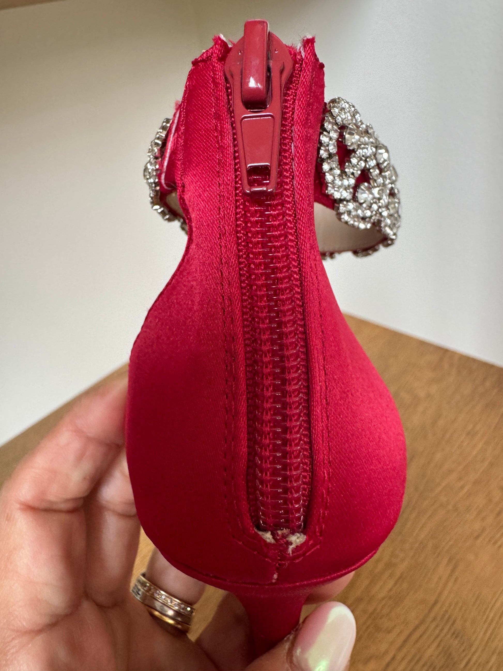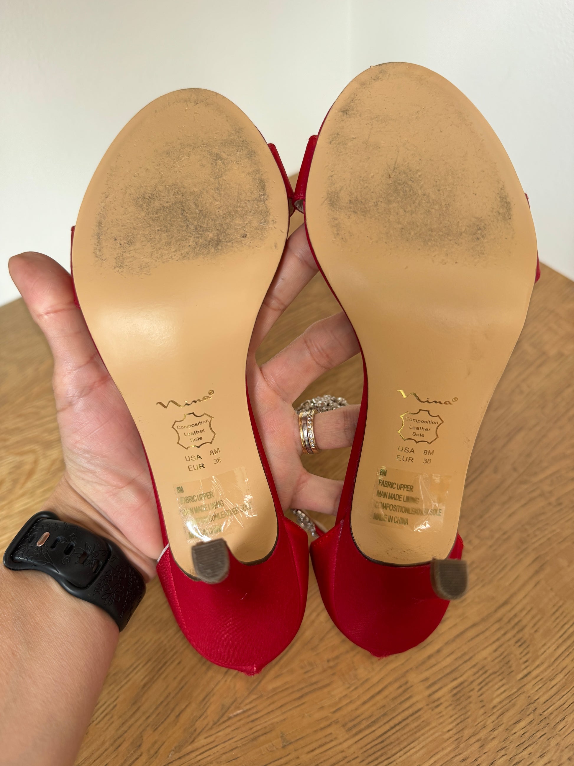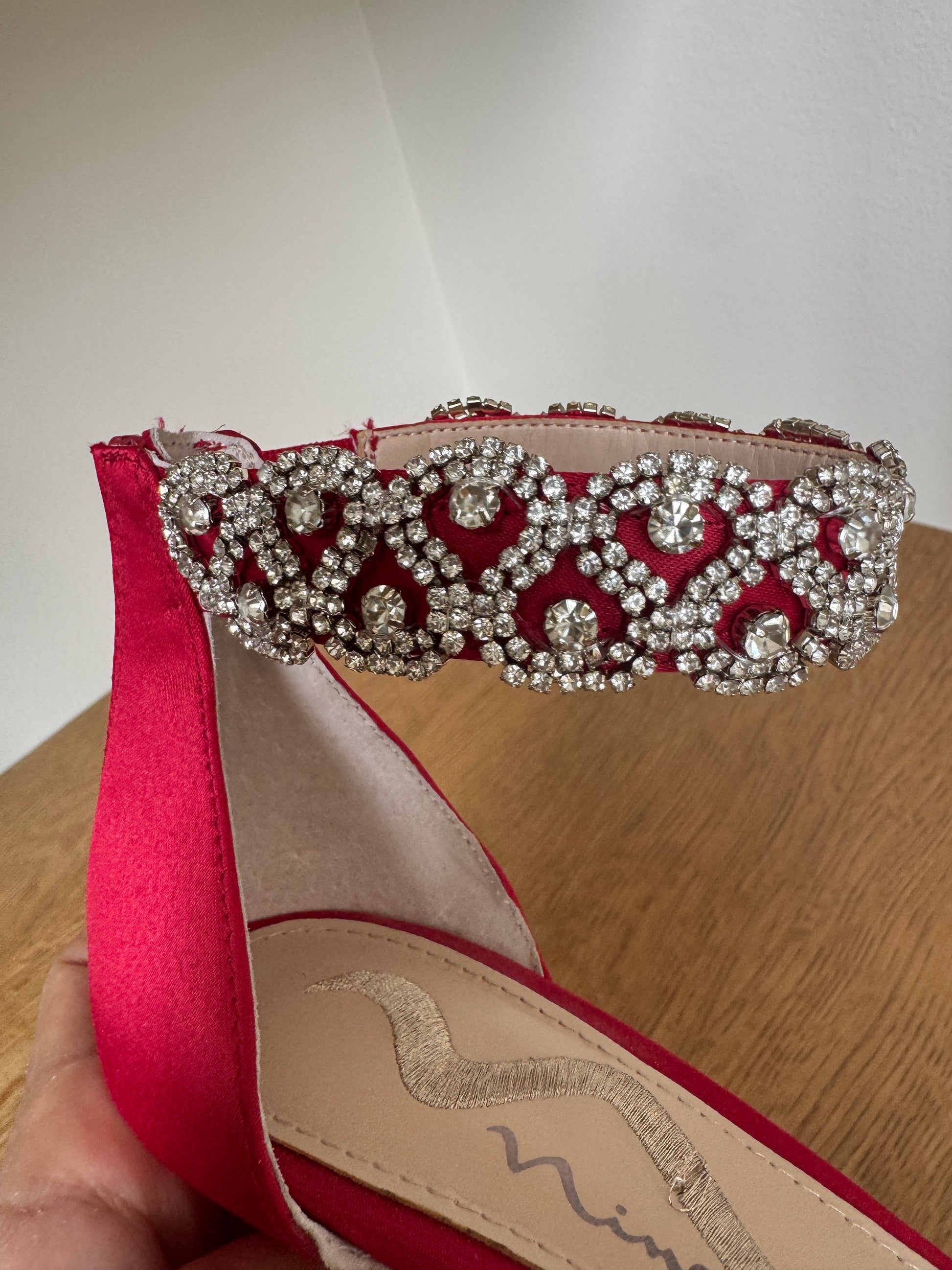 Nina Red Satin Heels with Rhinestone Ankle Strap – Size 8