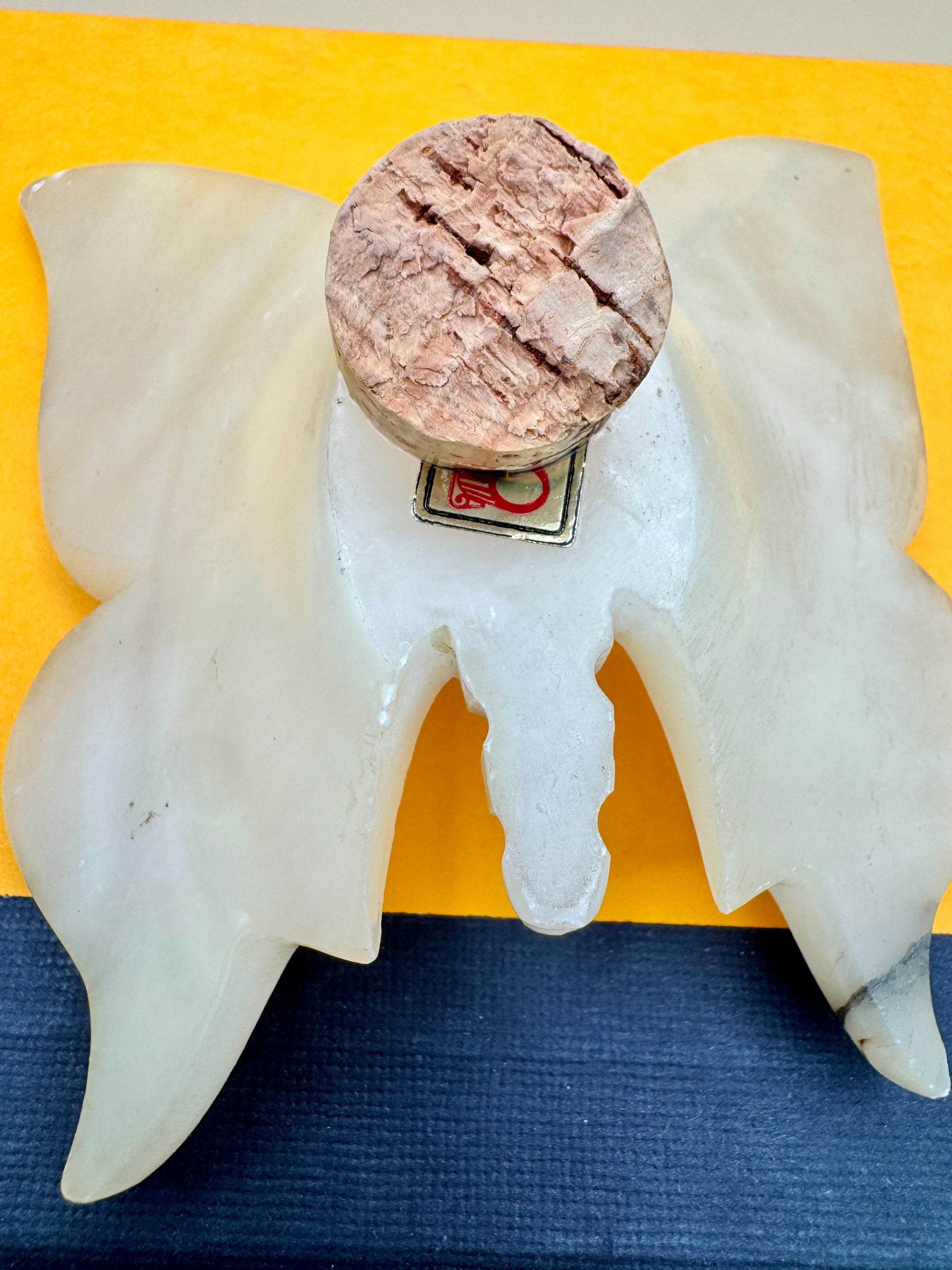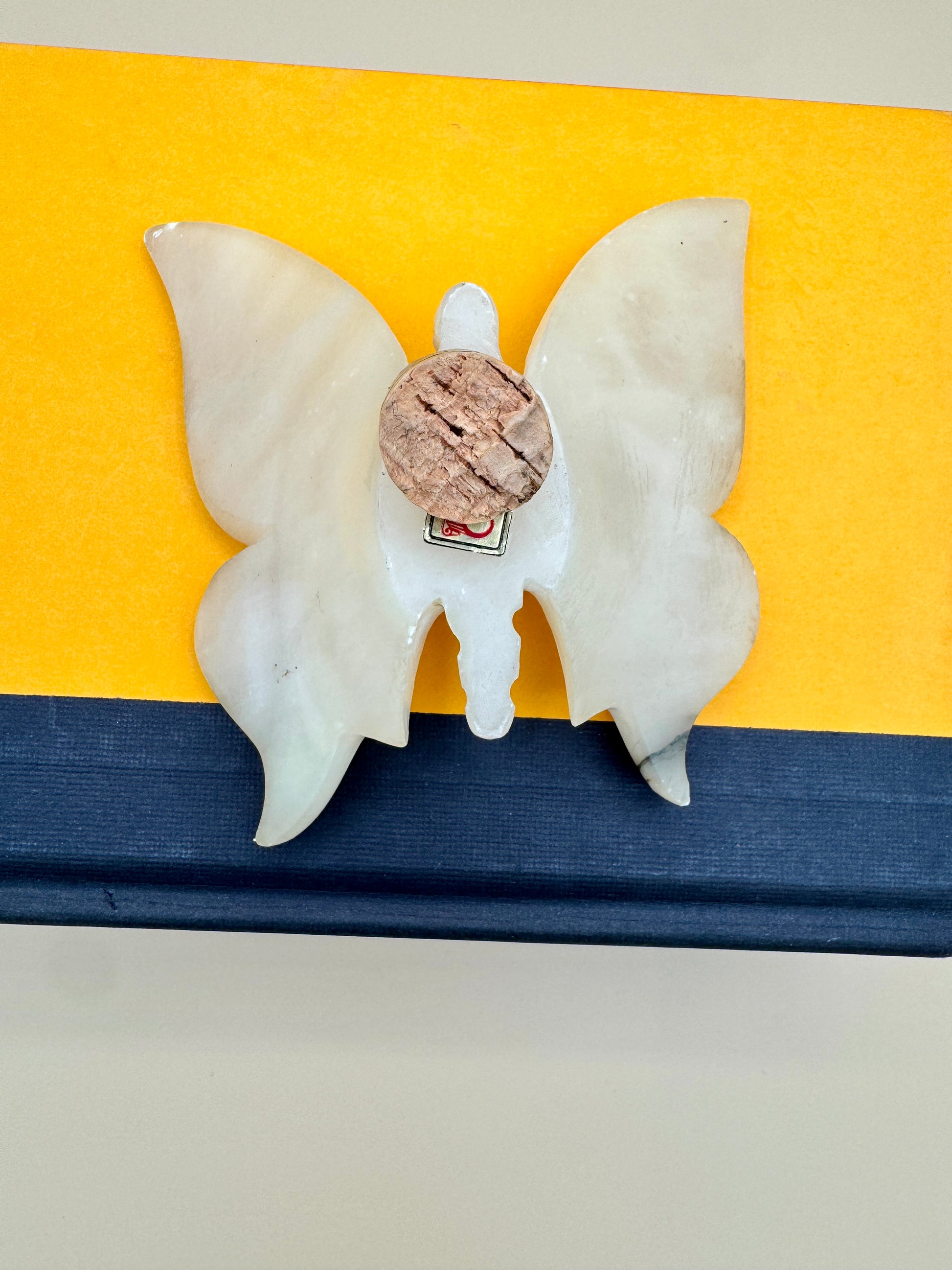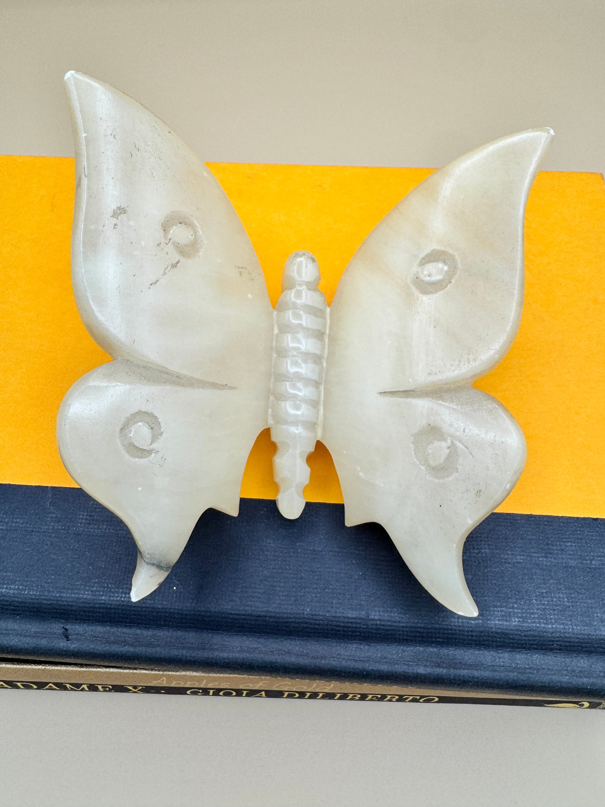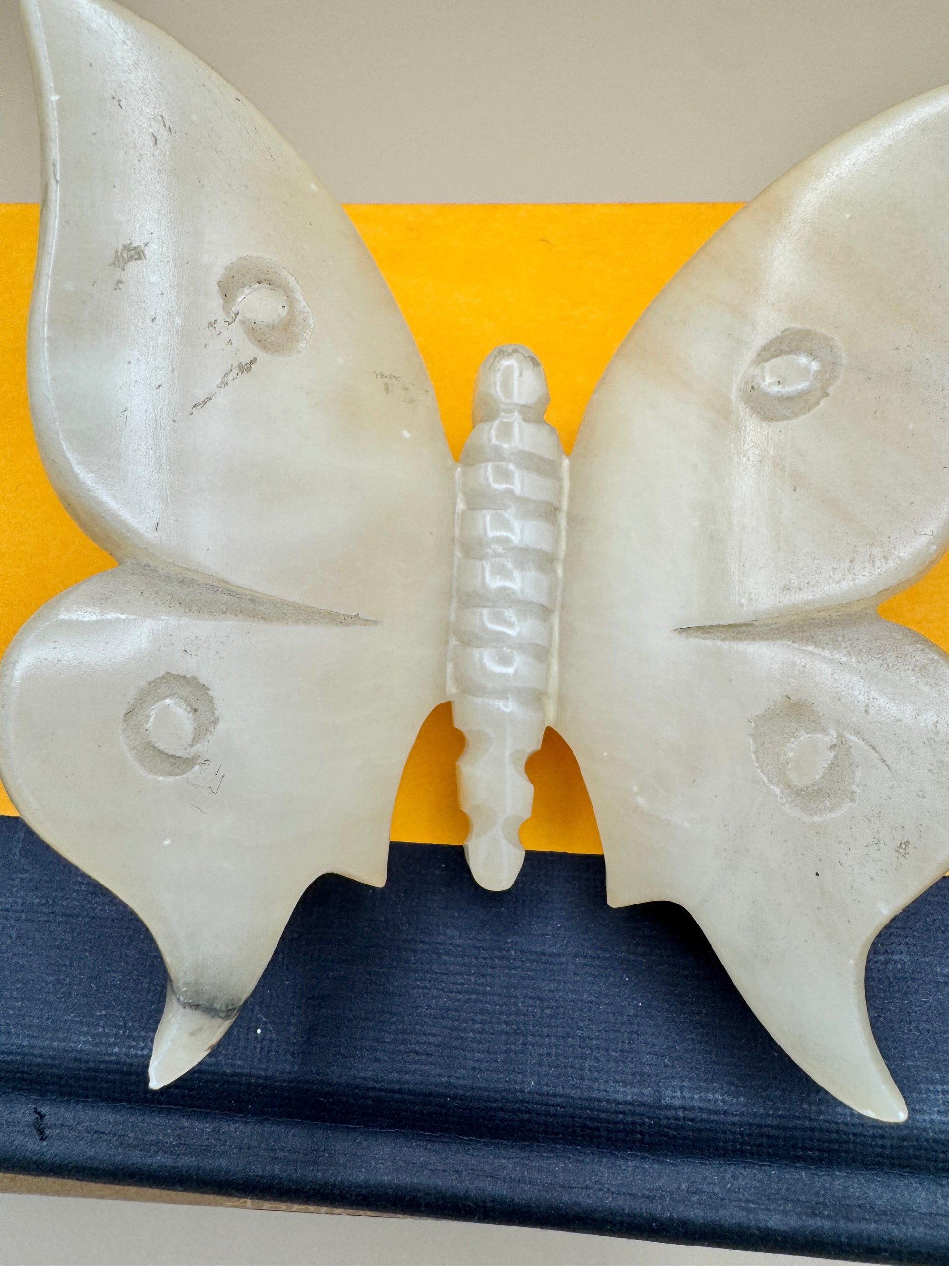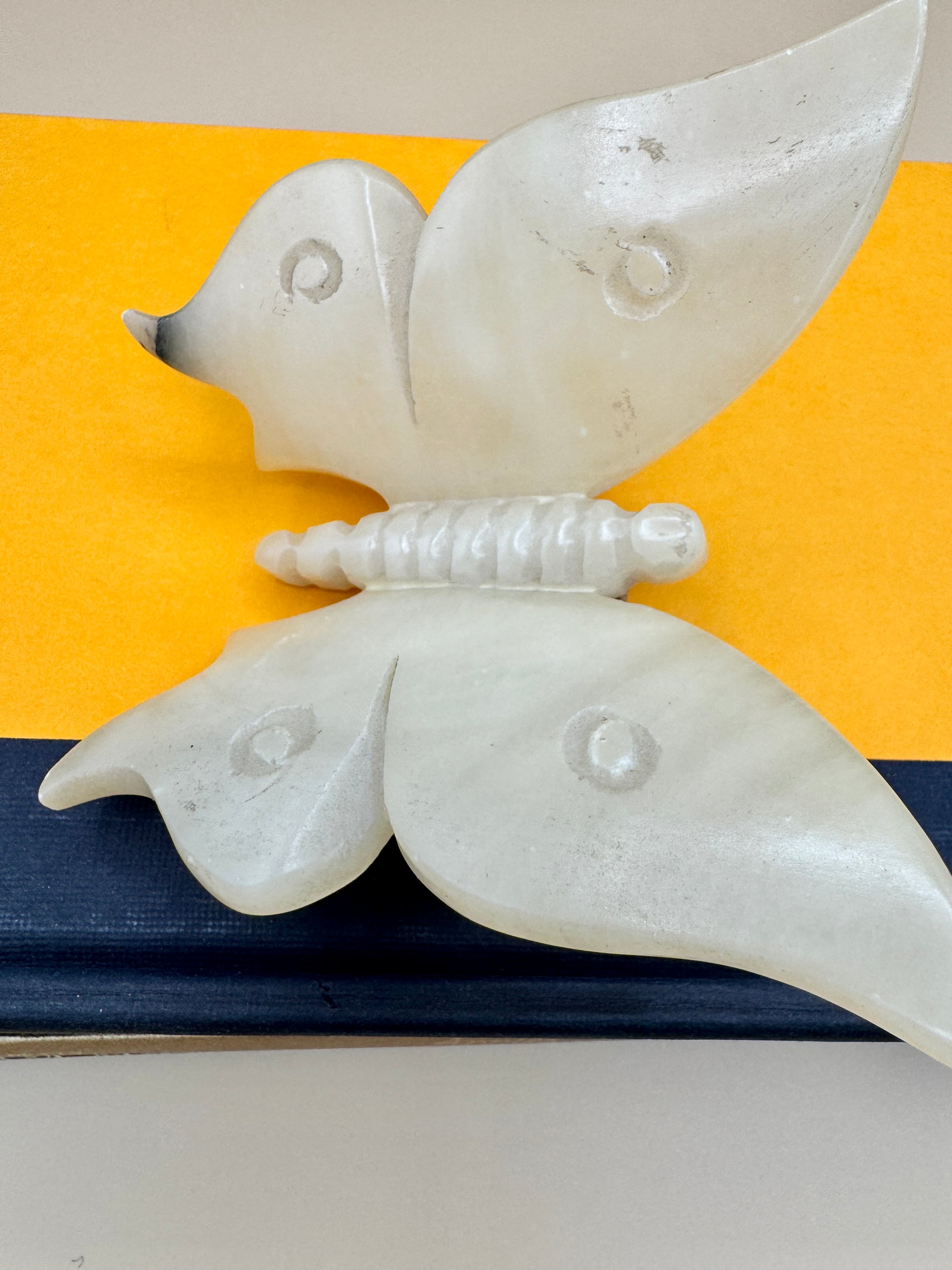 A hand-carved butterfly made of creamy white alabaster, showcasing the stone’s natural translucence and veining. This decorative piece makes a lovely accent for a bookshelf, desk, or display cabinet. Its organic material and timeless butterfly form bring a touch of nature indoors.