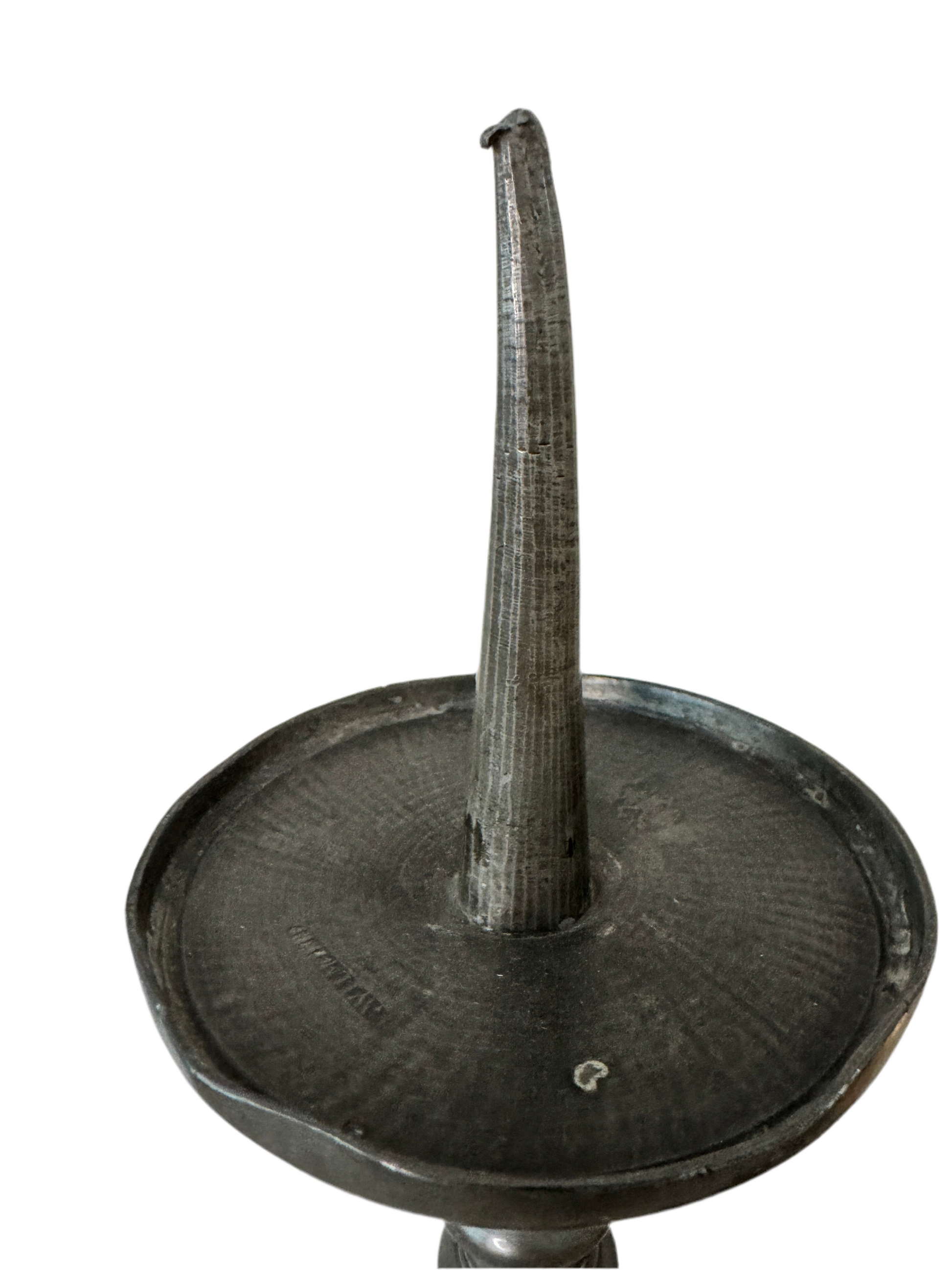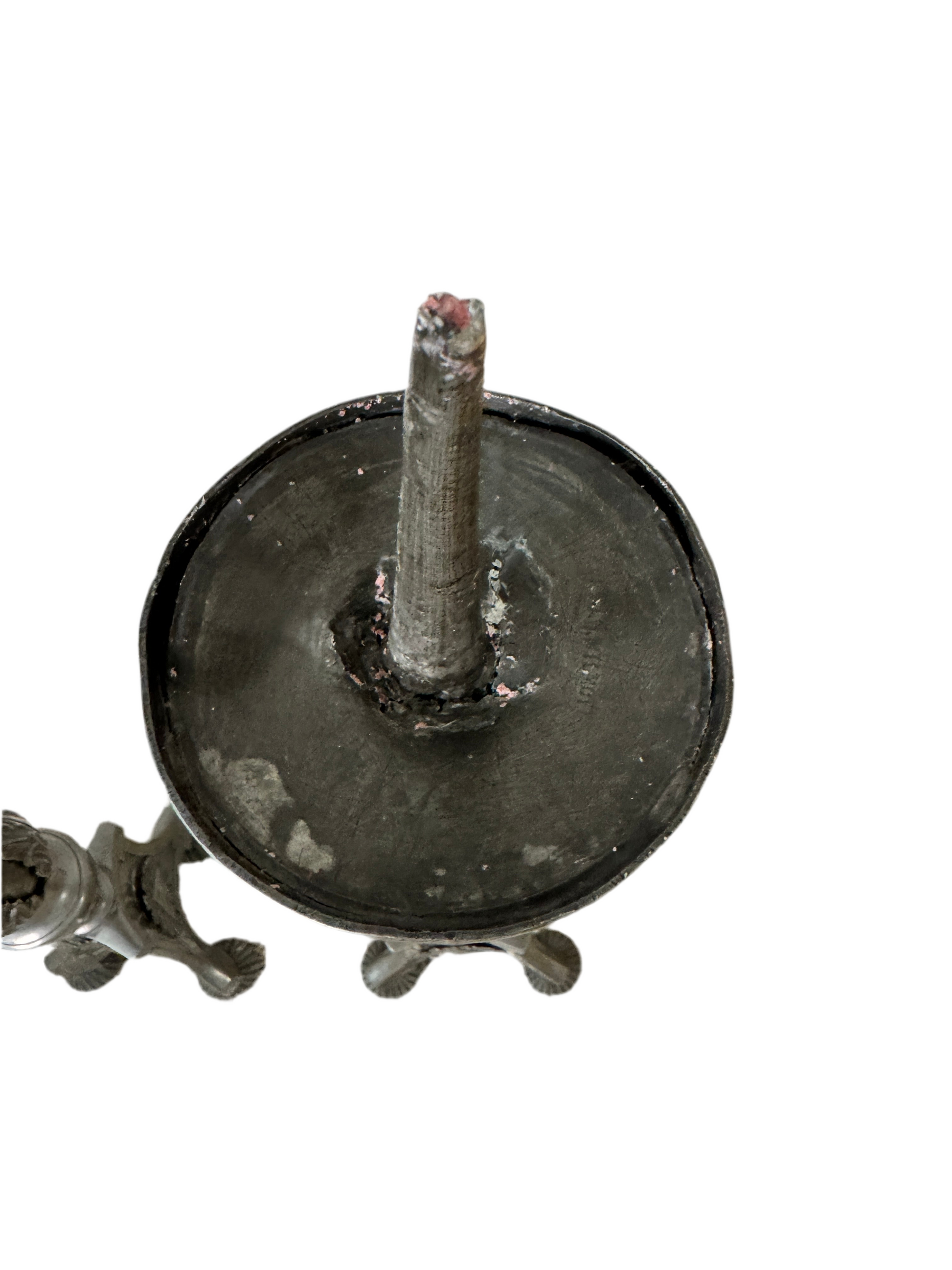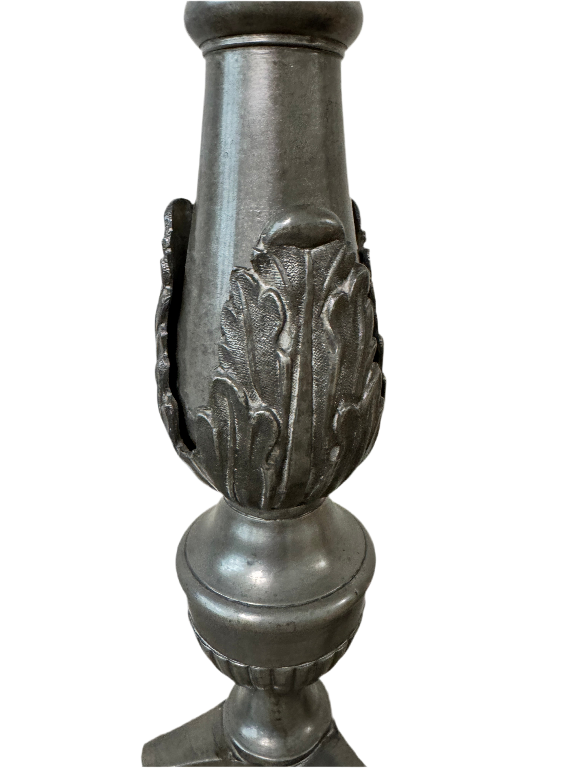 This striking pair of tall pewter-tone candlesticks brings dramatic presence and old-world character to any setting. Standing an impressive 26 inches high with a 6-inch wide base, each candlestick weighs over 4 pounds, making them substantial statement pieces.