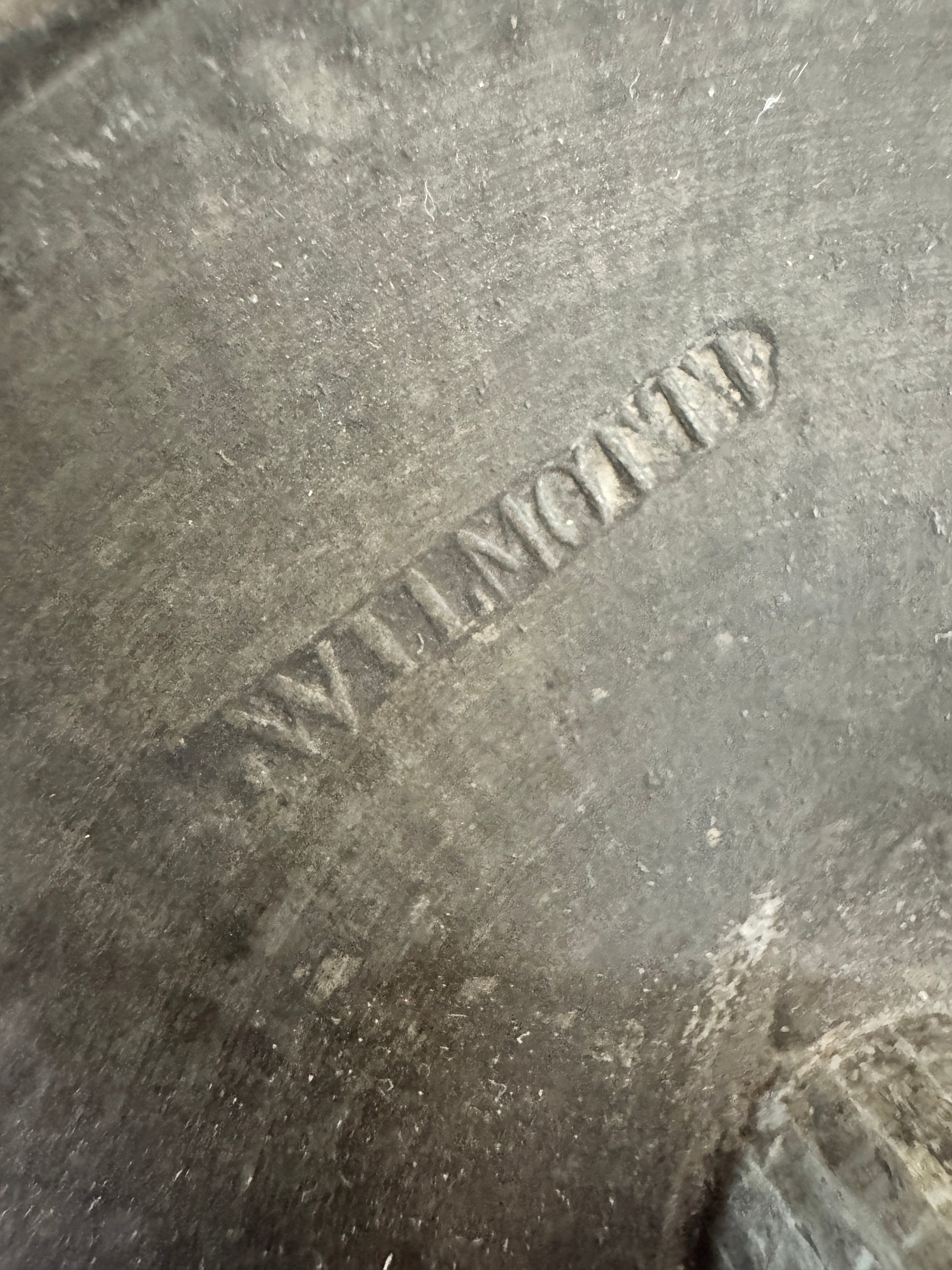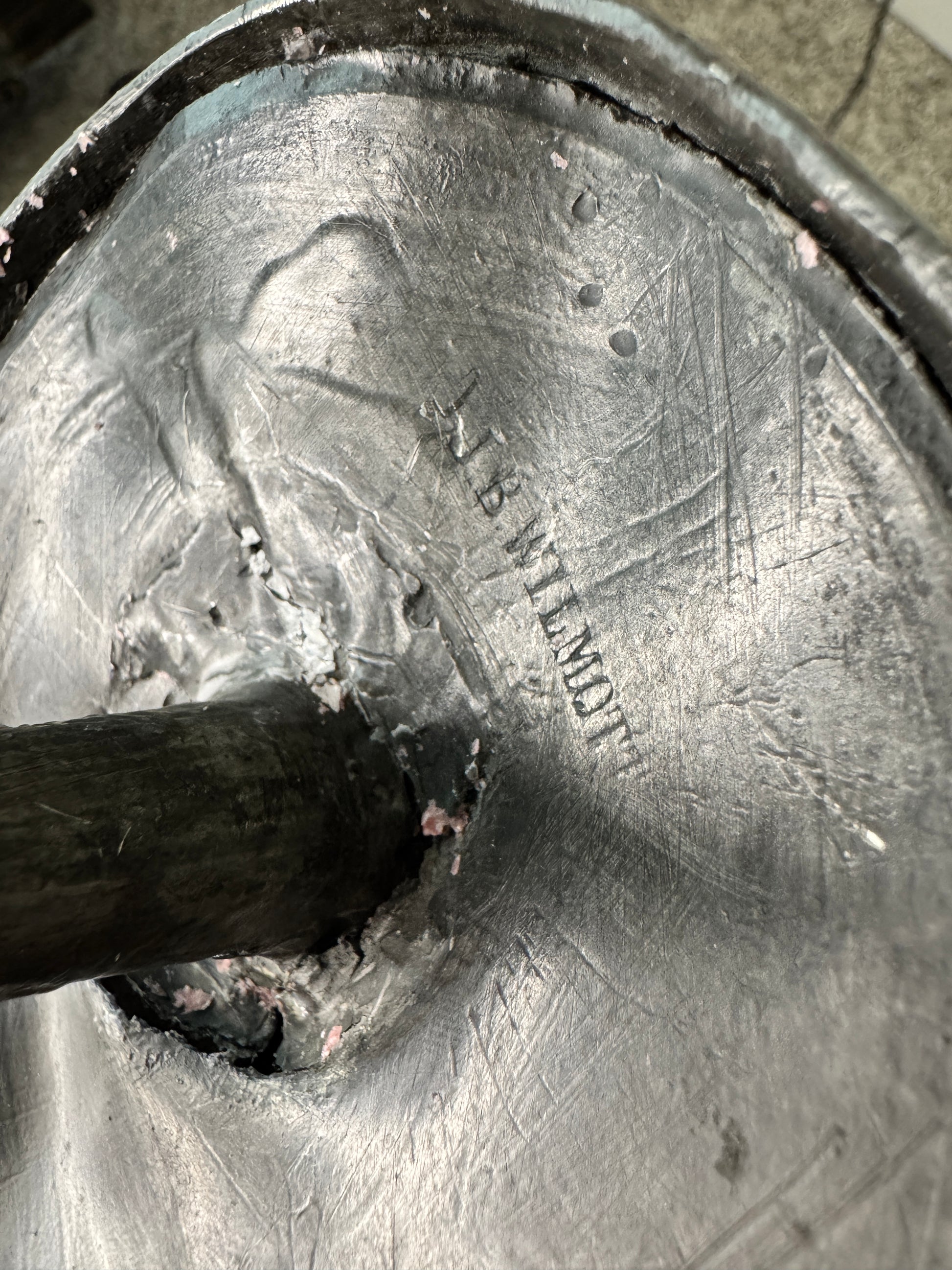 One is clearly marked “WILMOTTT.” The exact maker and era remain uncertain, though the weight, finish, and decorative details suggest quality craftsmanship. One top shows a crack, and one decorative motif is slightly loose but stable — both consistent with age and use.