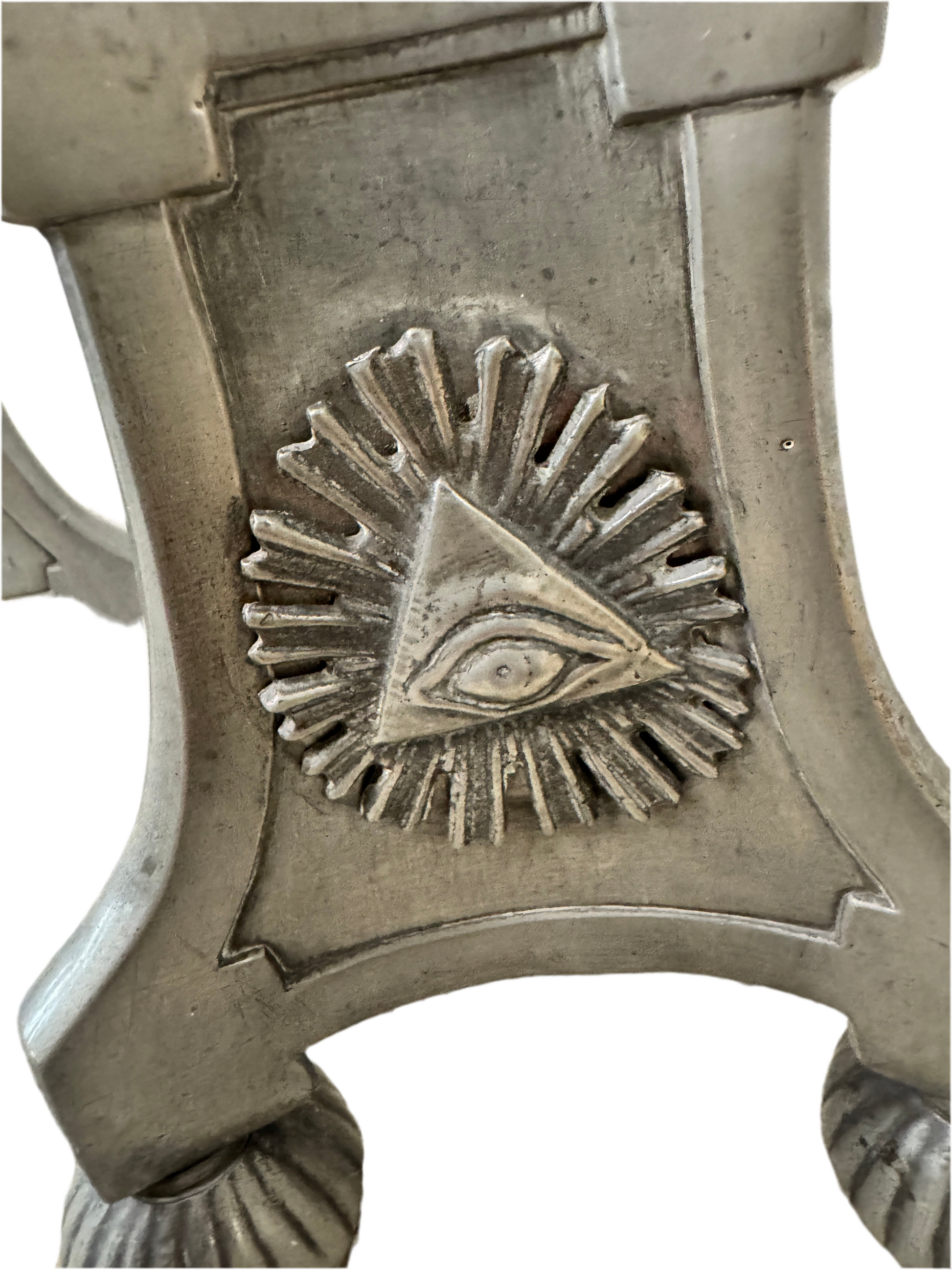The piece features a prominent Eye of Providence motif with sunburst rays, fluted and acanthus detailing, and stands on a triangular base with ball feet. Though the exact maker remains unconfirmed, the candlesticks bear an impressed mark and show signs of age consistent with vintage to antique metalwork.