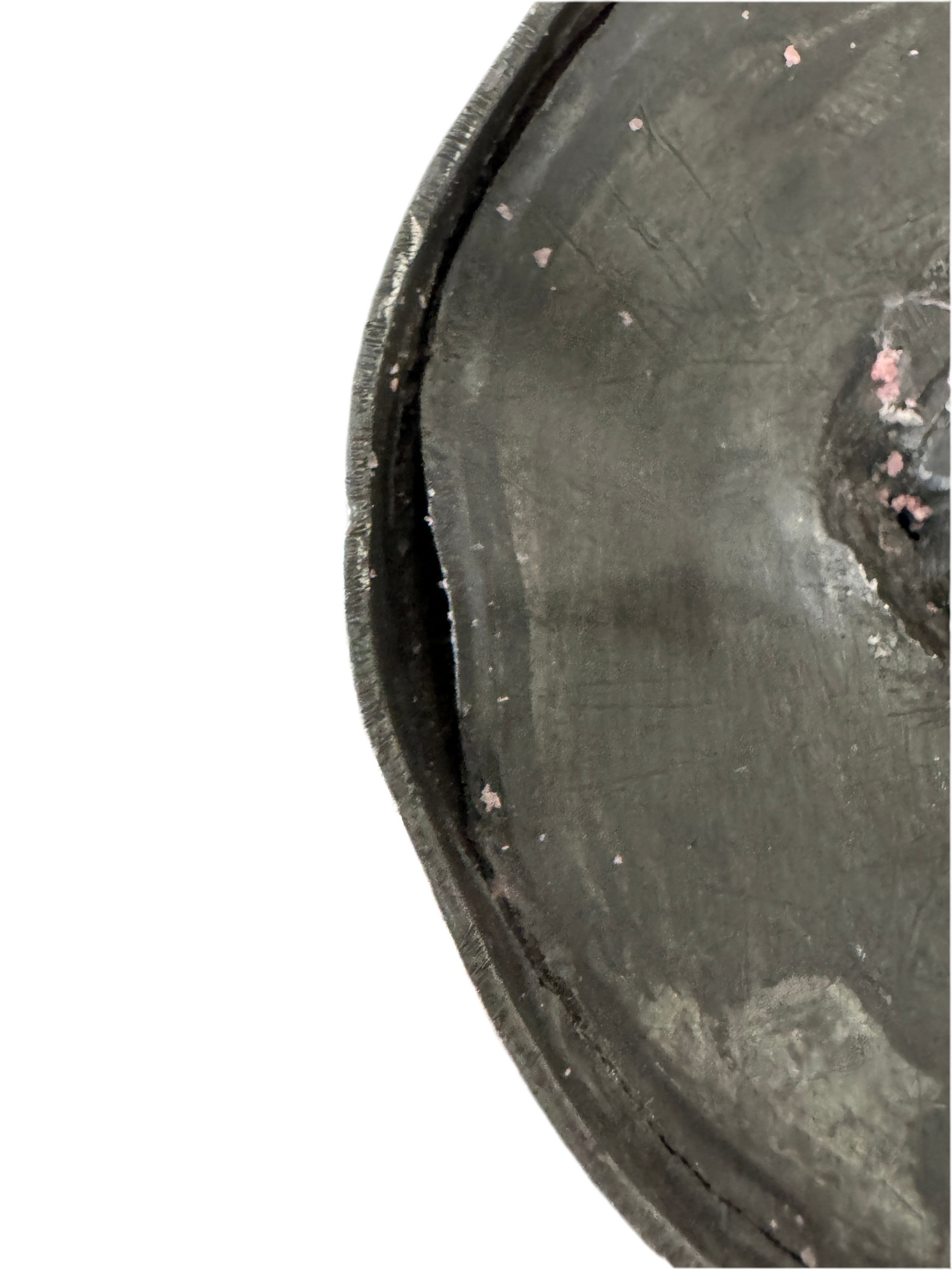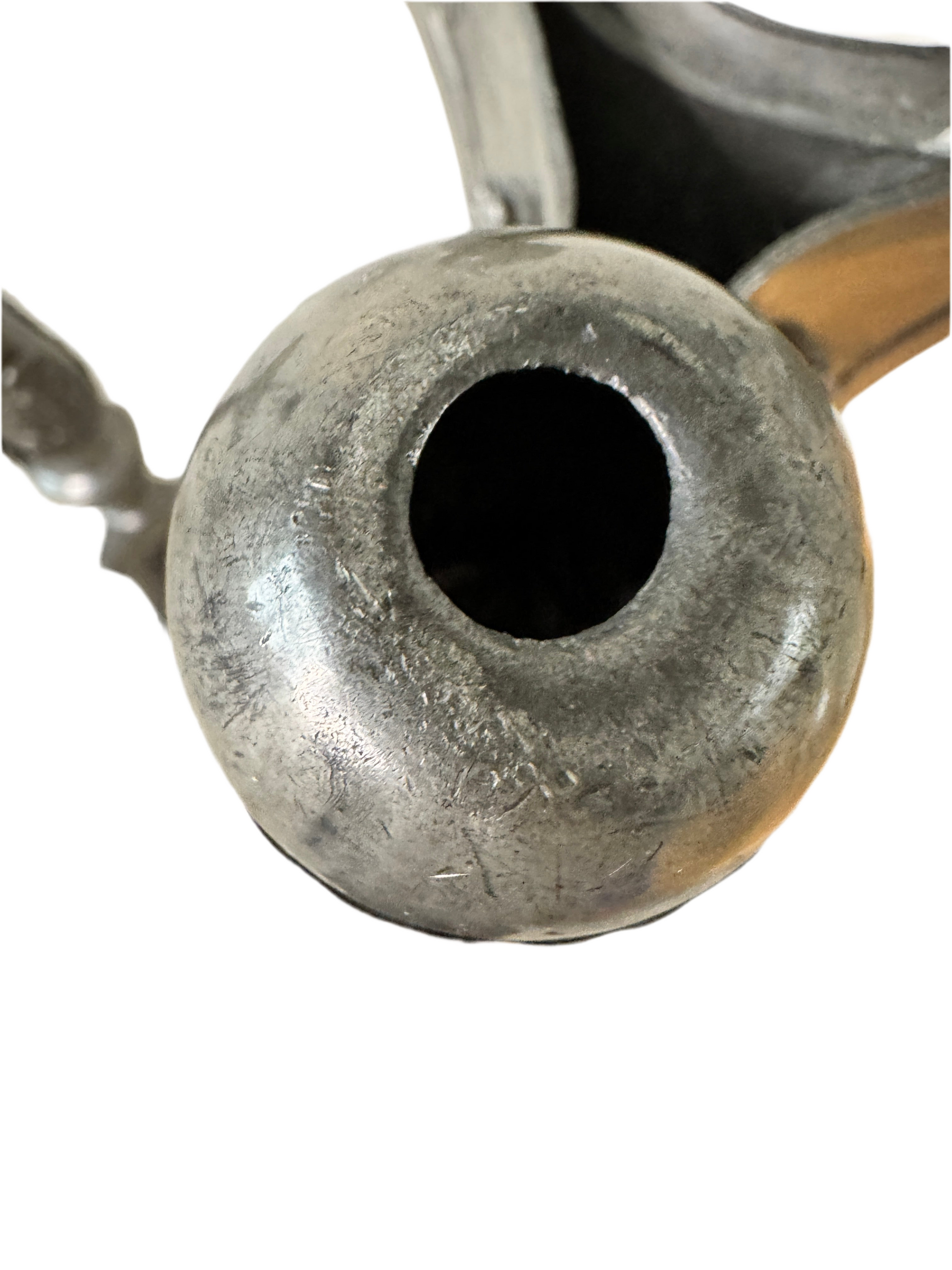 Not magnetic, with a dull gray tone and a light metallic ring when tapped — likely pewter or a pewter-like alloy.