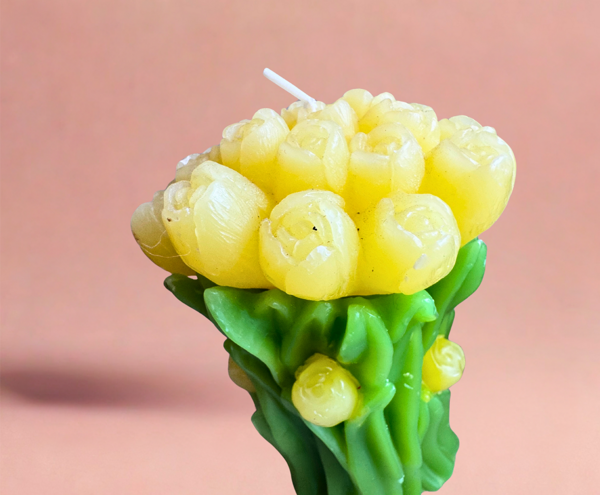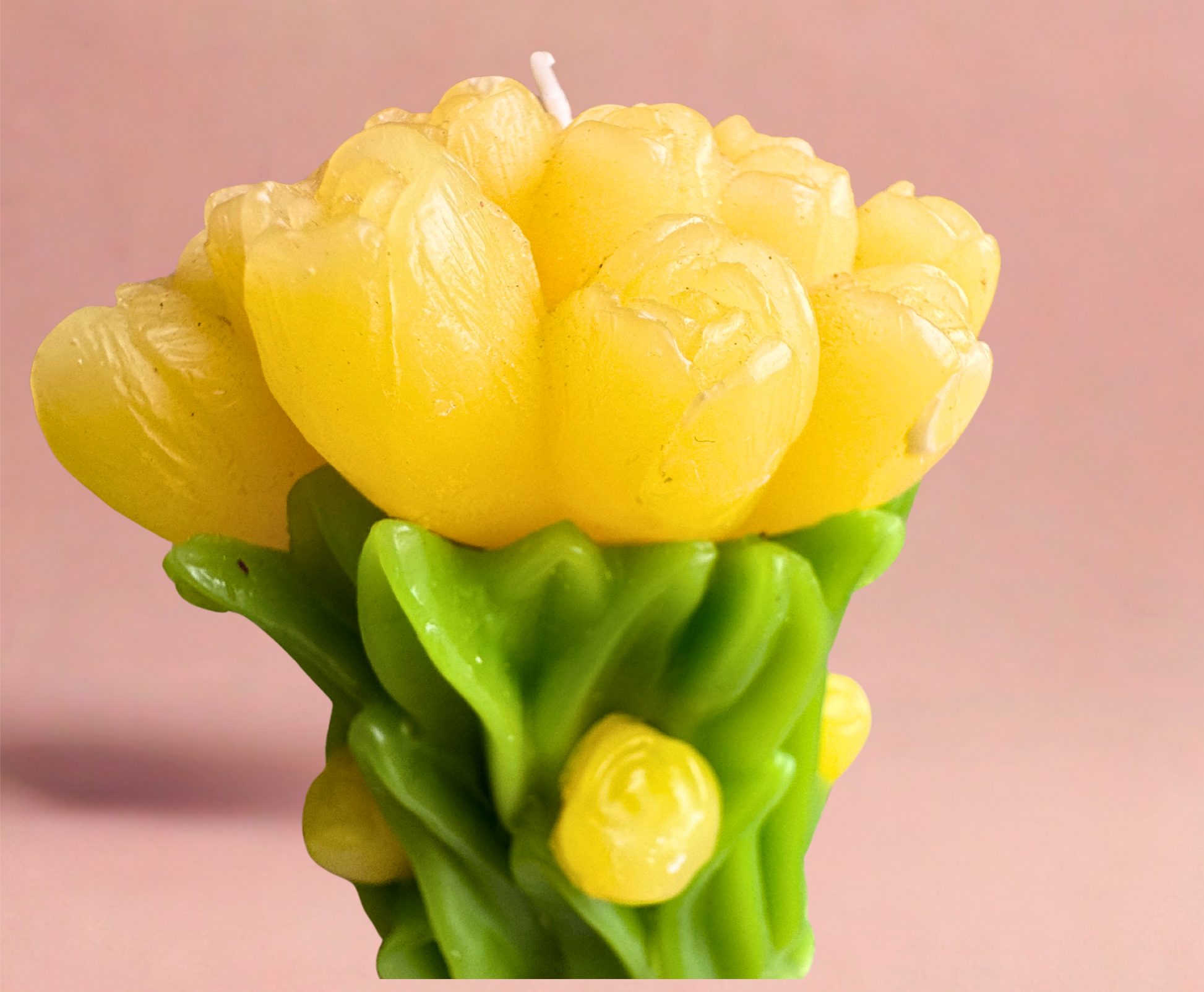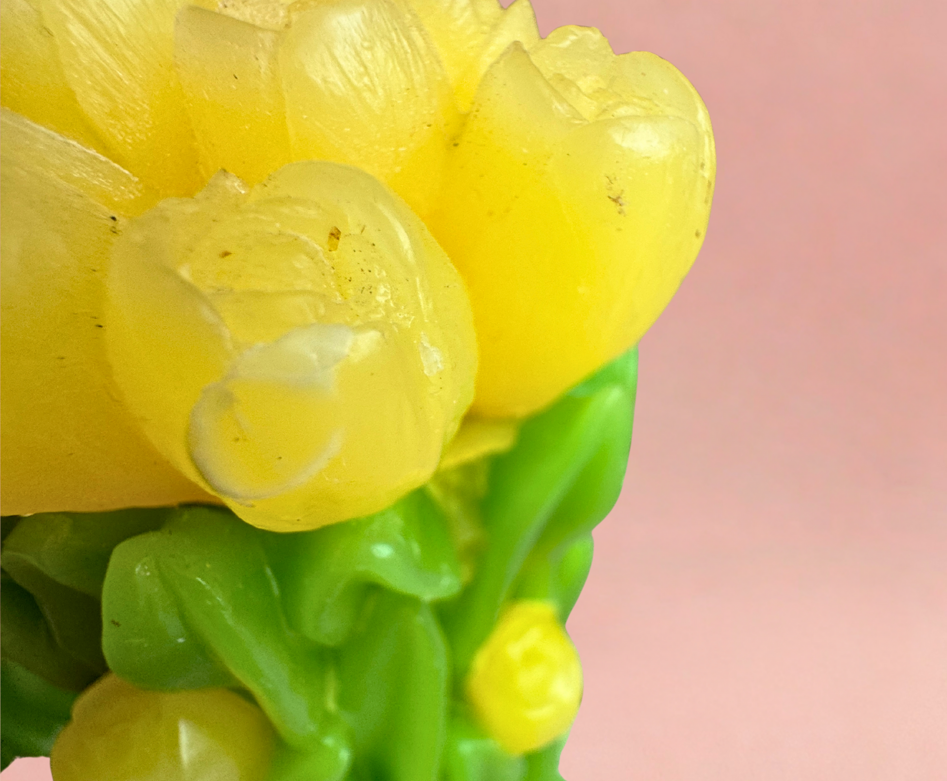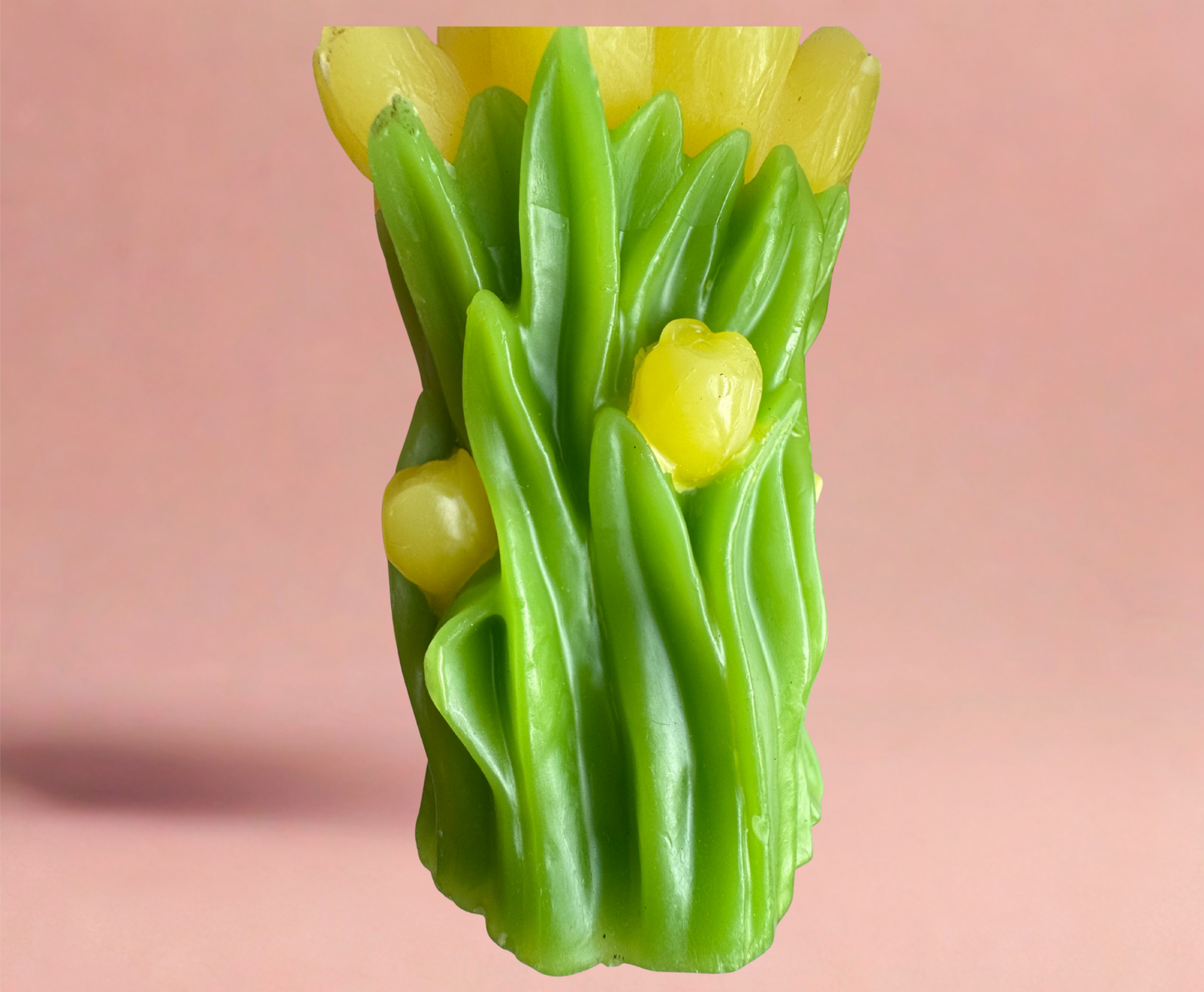 This vibrant pair of carved candles features blooming yellow tulips with lush green stems, sculpted in intricate detail. Whether you're styling a vintage-inspired tablescape or adding a playful floral accent to a shelf or vignette, these candles are as charming unlit as they are glowing.