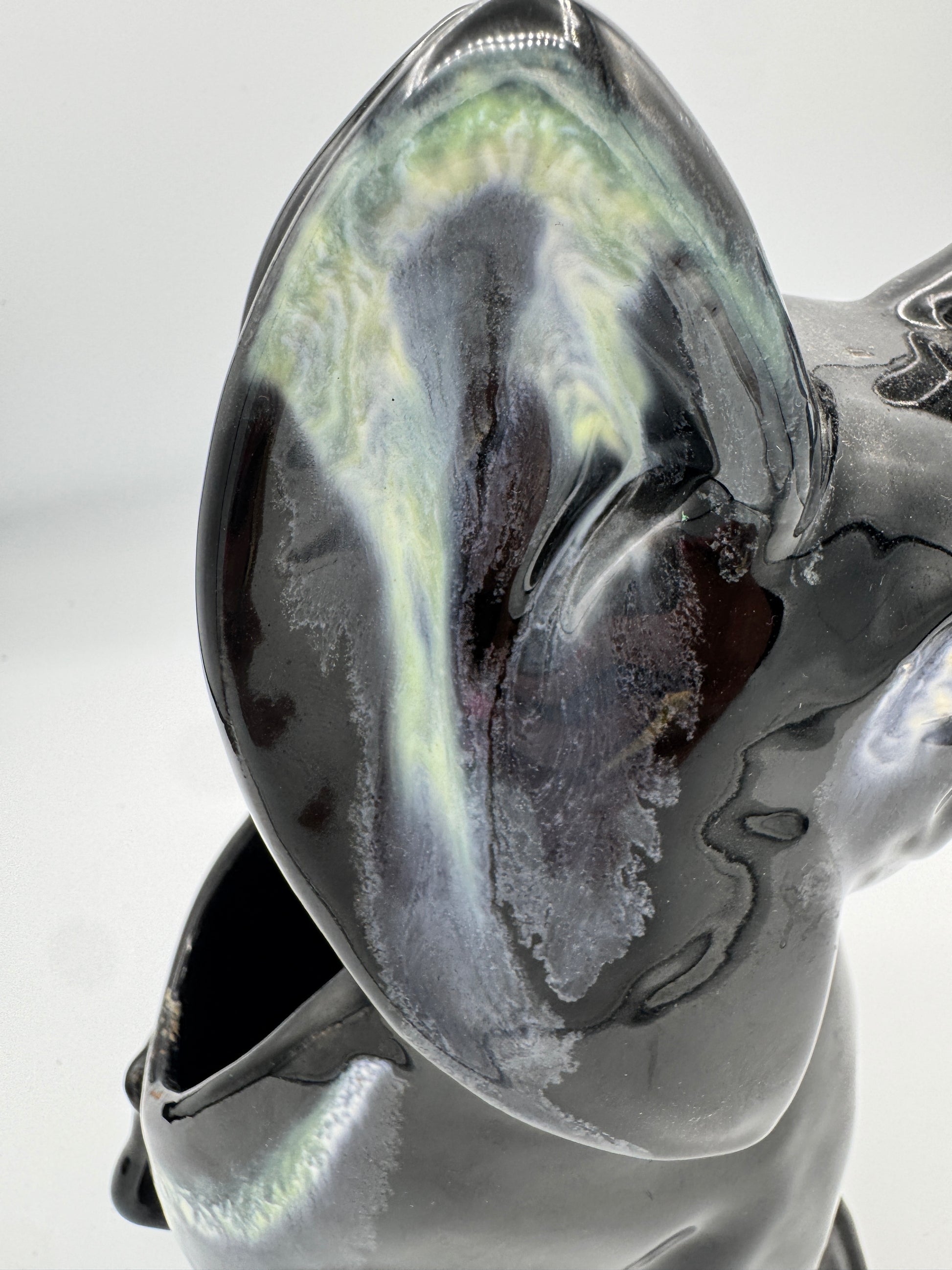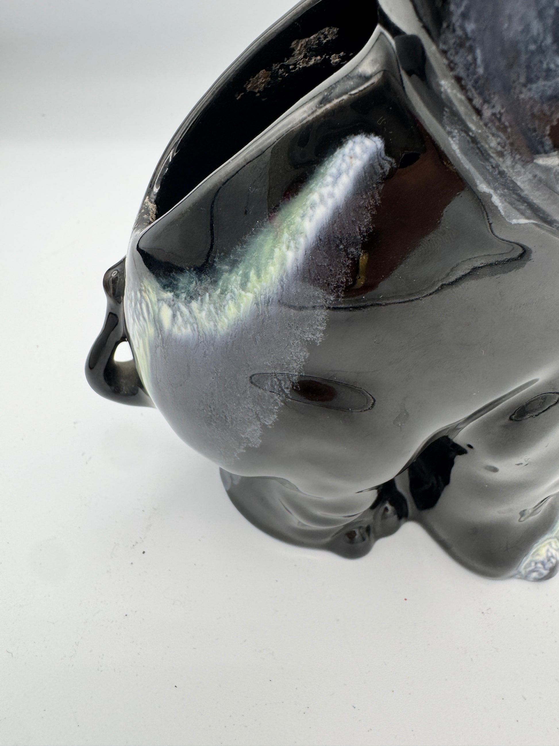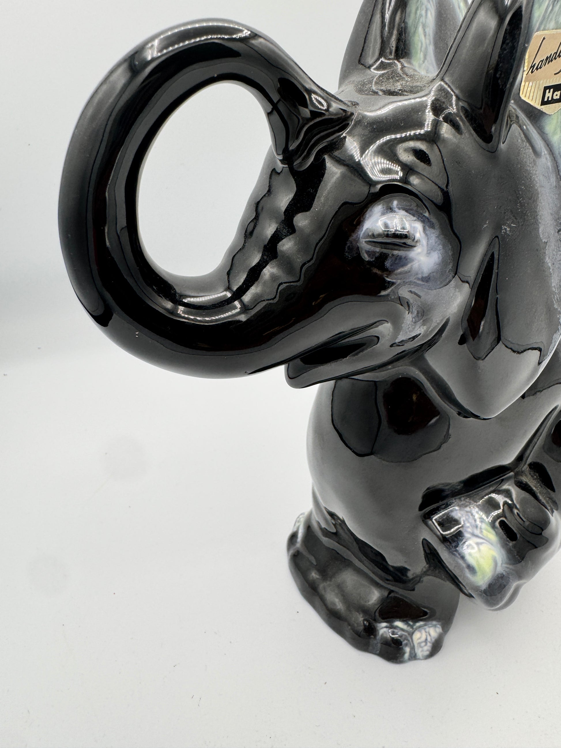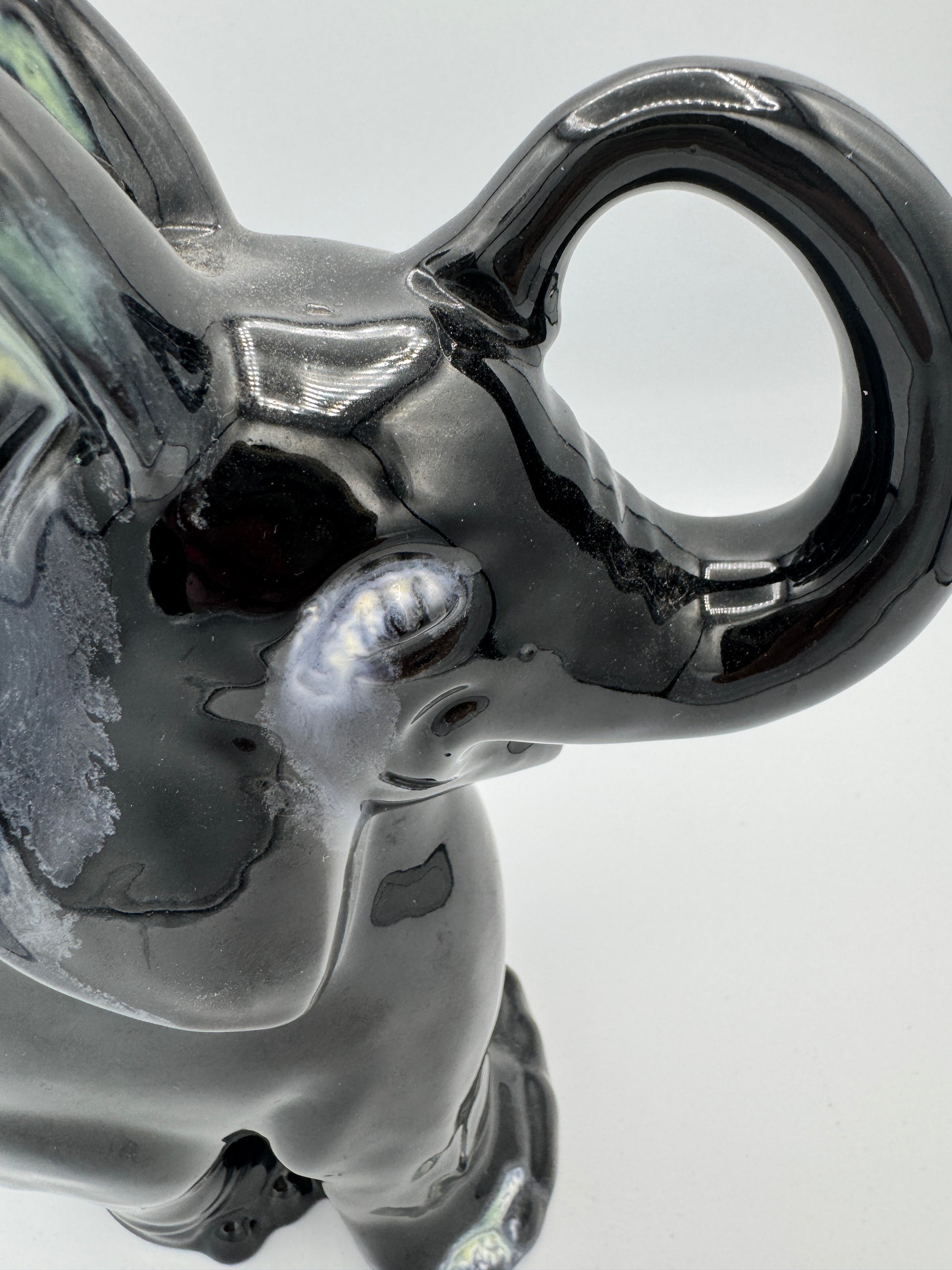 Bring a touch of mid-century charm home with this glossy black ceramic elephant by Royal Haeger Pottery. Model #509, this collectible features Haeger’s signature handcrafted finish with swirling iridescent glaze and a playful raised trunk design. Retains its original gold Handcrafted Haeger foil label and impressed base mark.