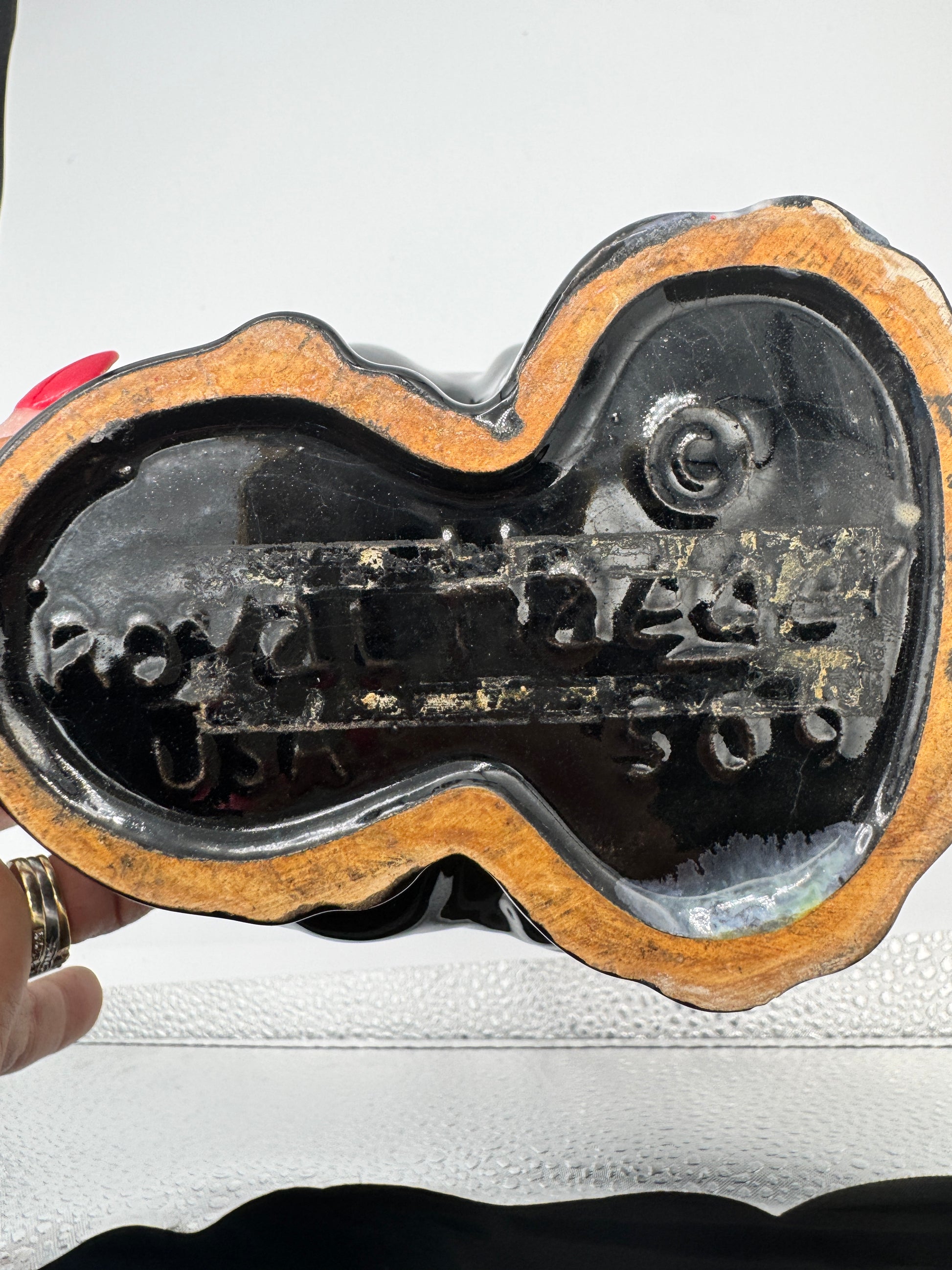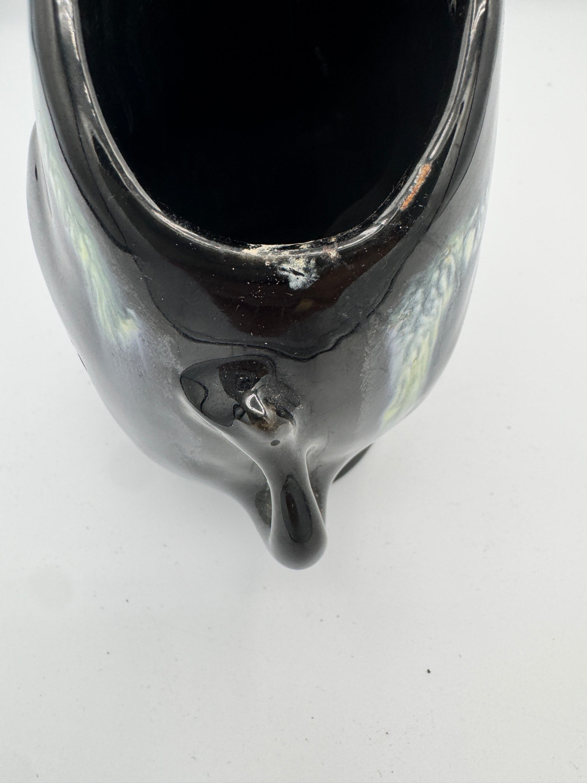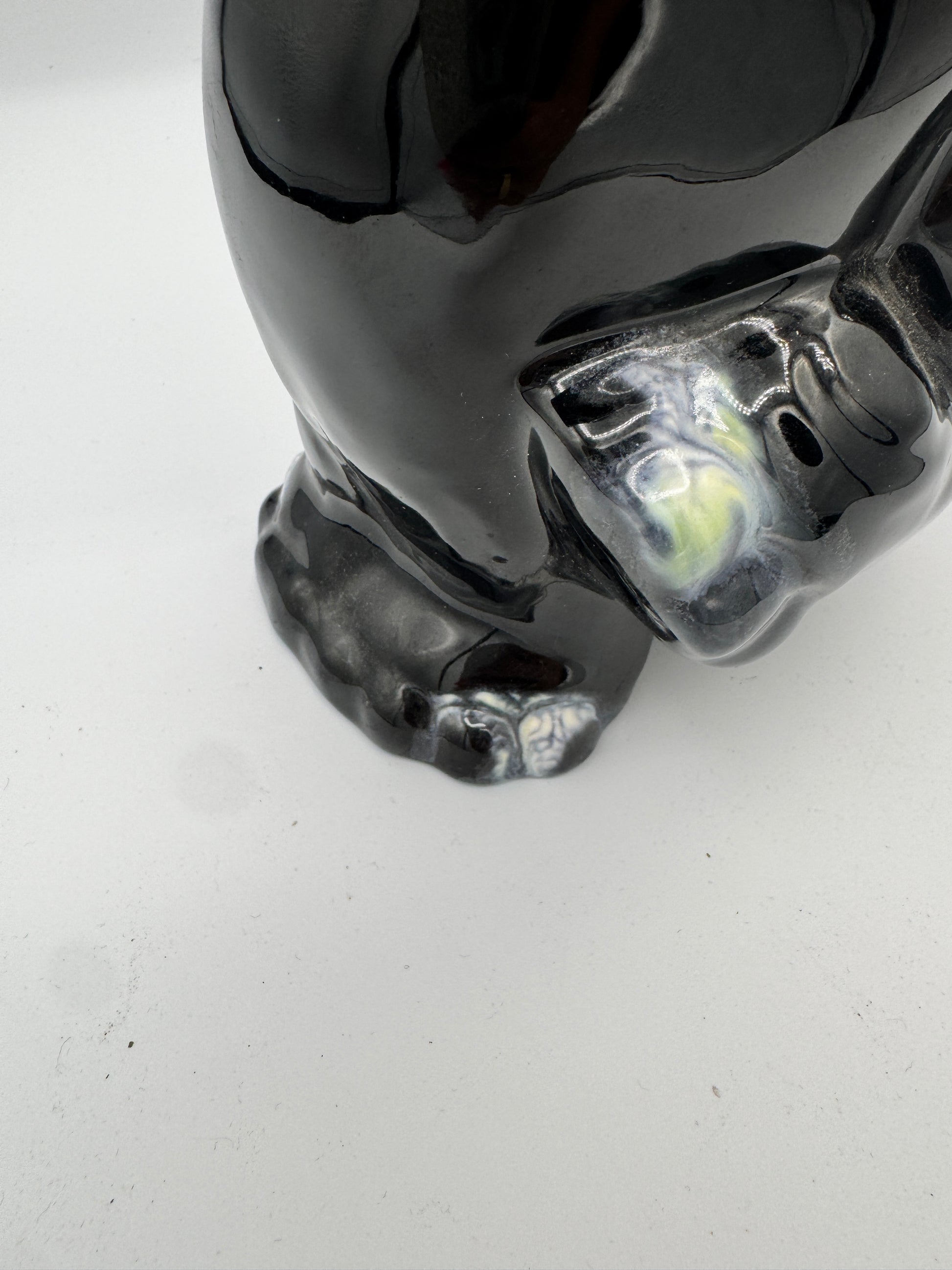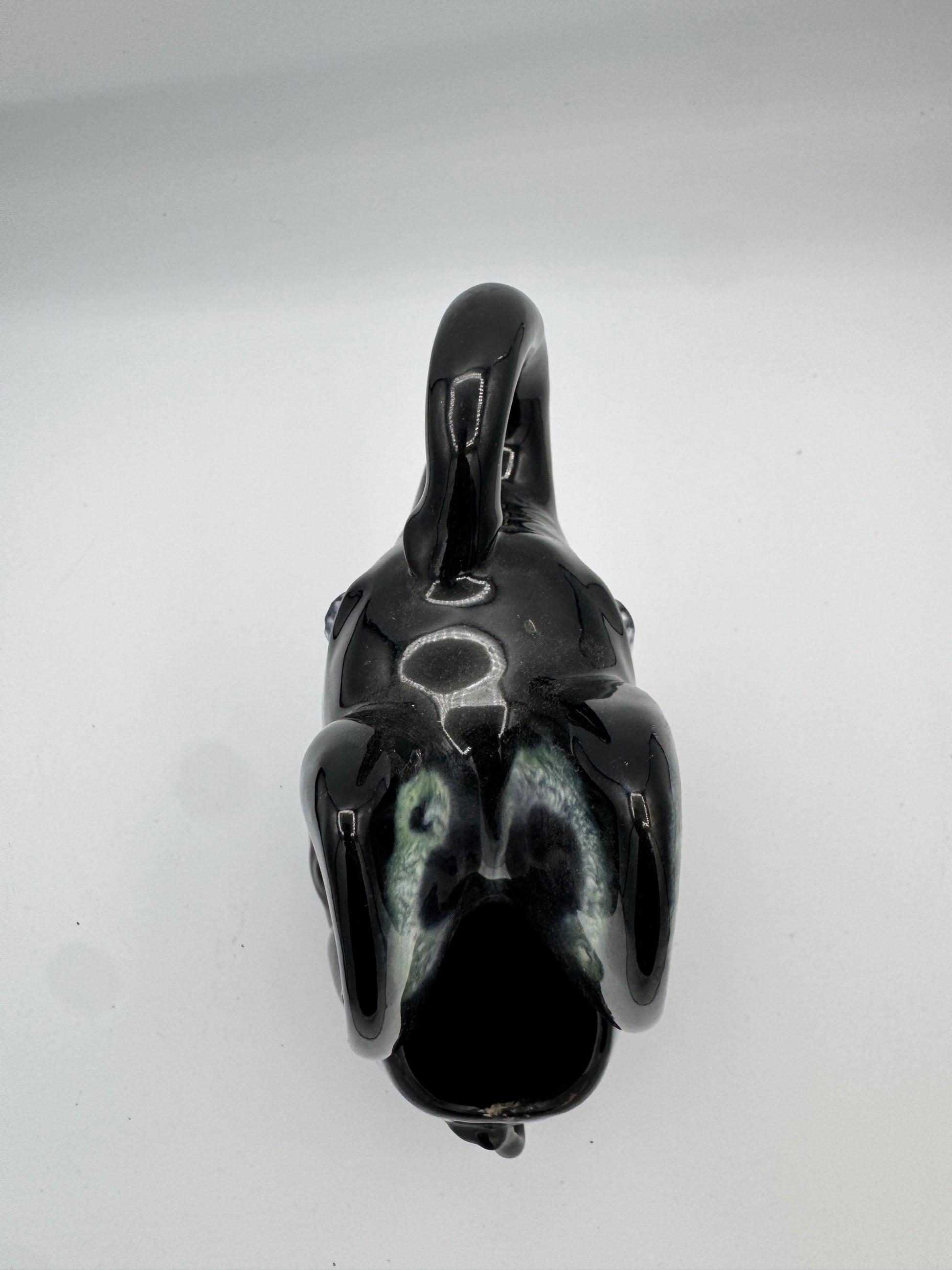 Bring a touch of mid-century charm home with this glossy black ceramic elephant by Royal Haeger Pottery. Model #509, this collectible features Haeger’s signature handcrafted finish with swirling iridescent glaze and a playful raised trunk design. Retains its original gold Handcrafted Haeger foil label and impressed base mark.