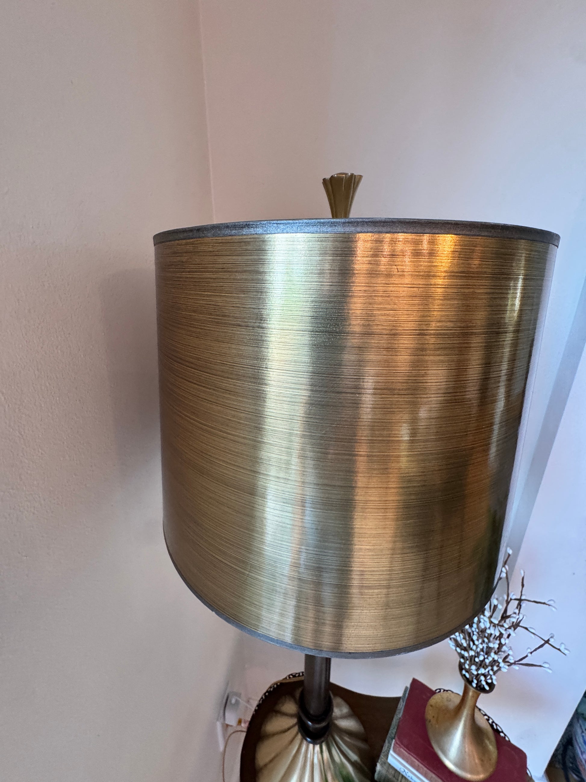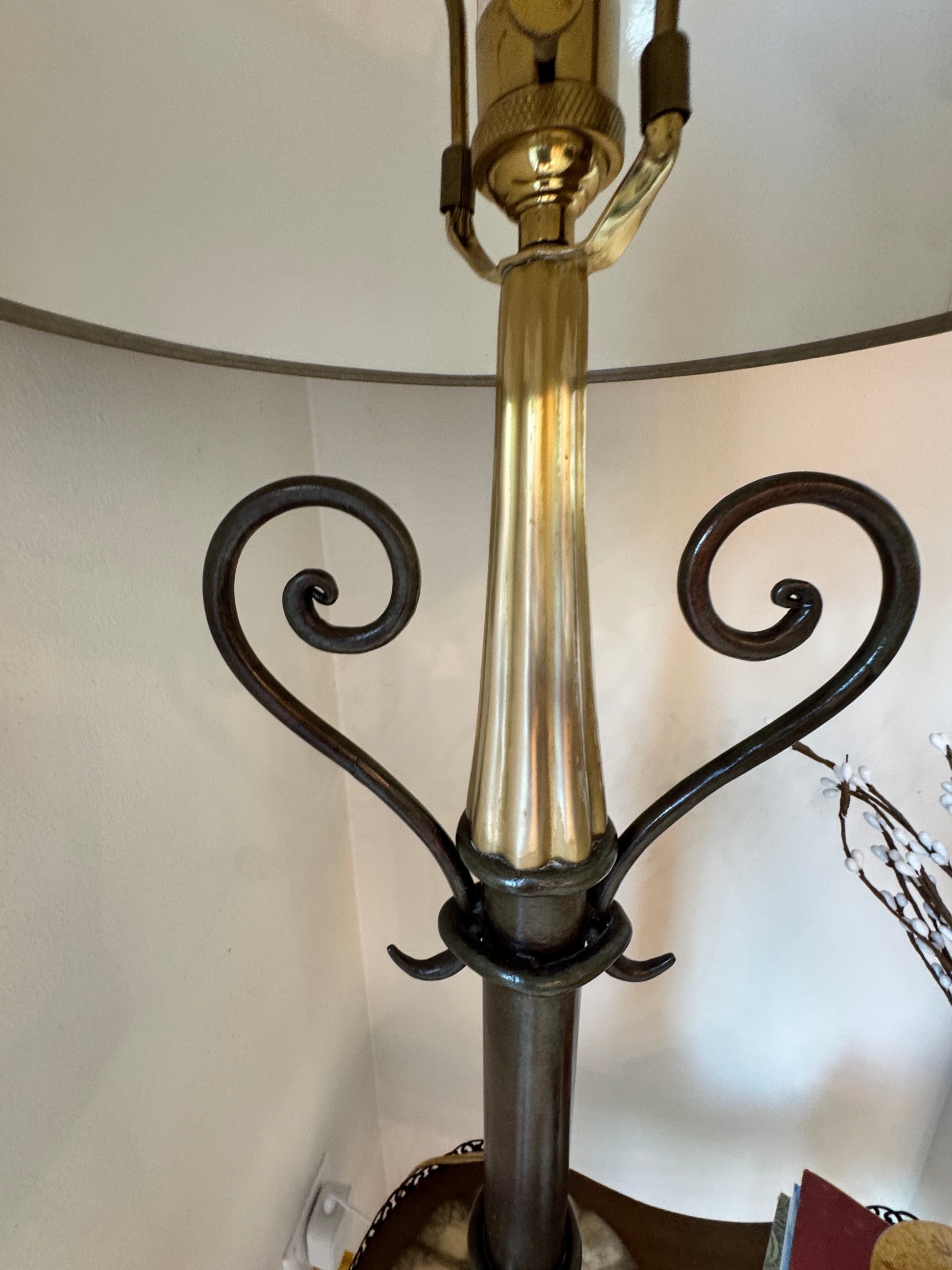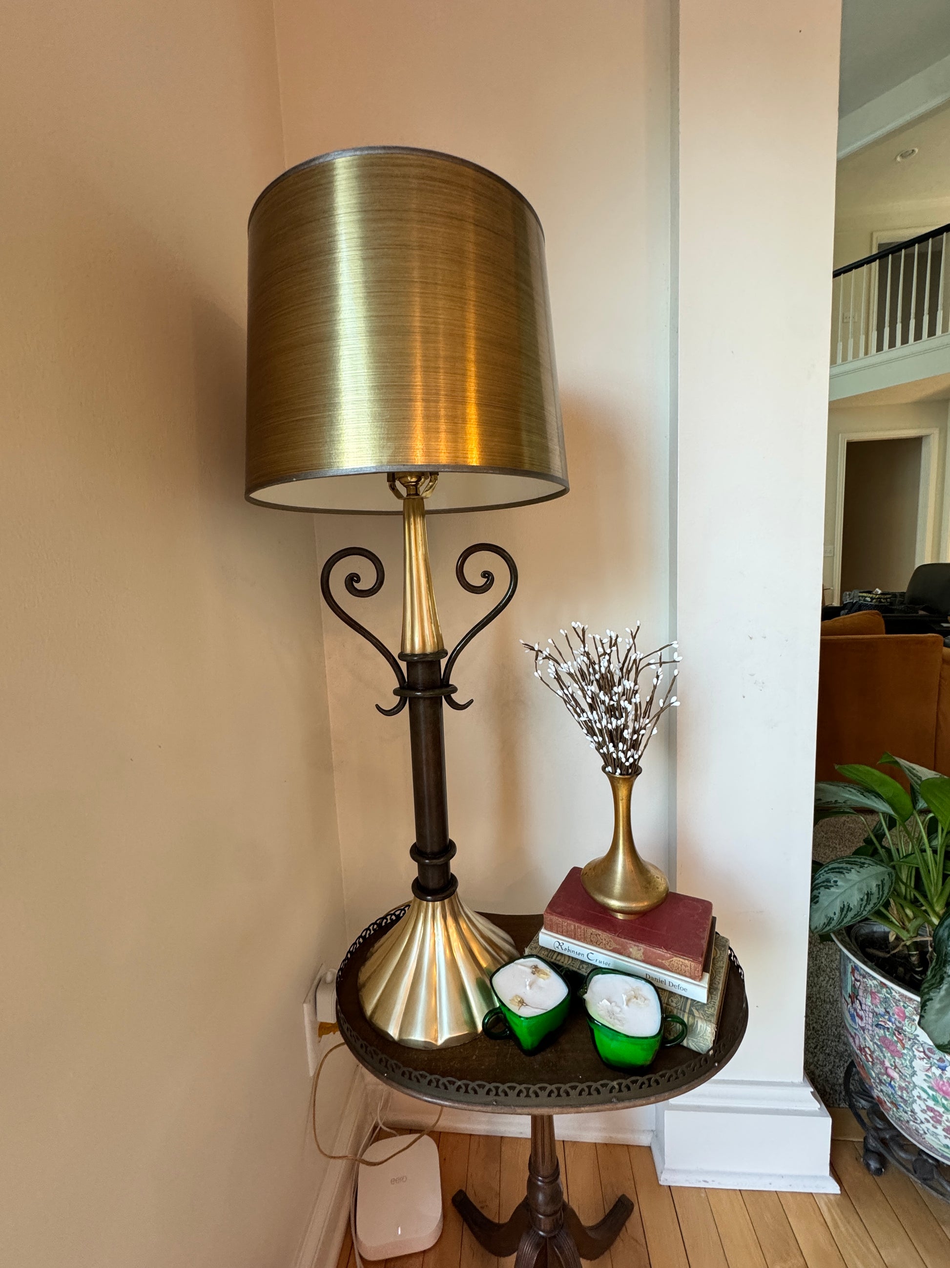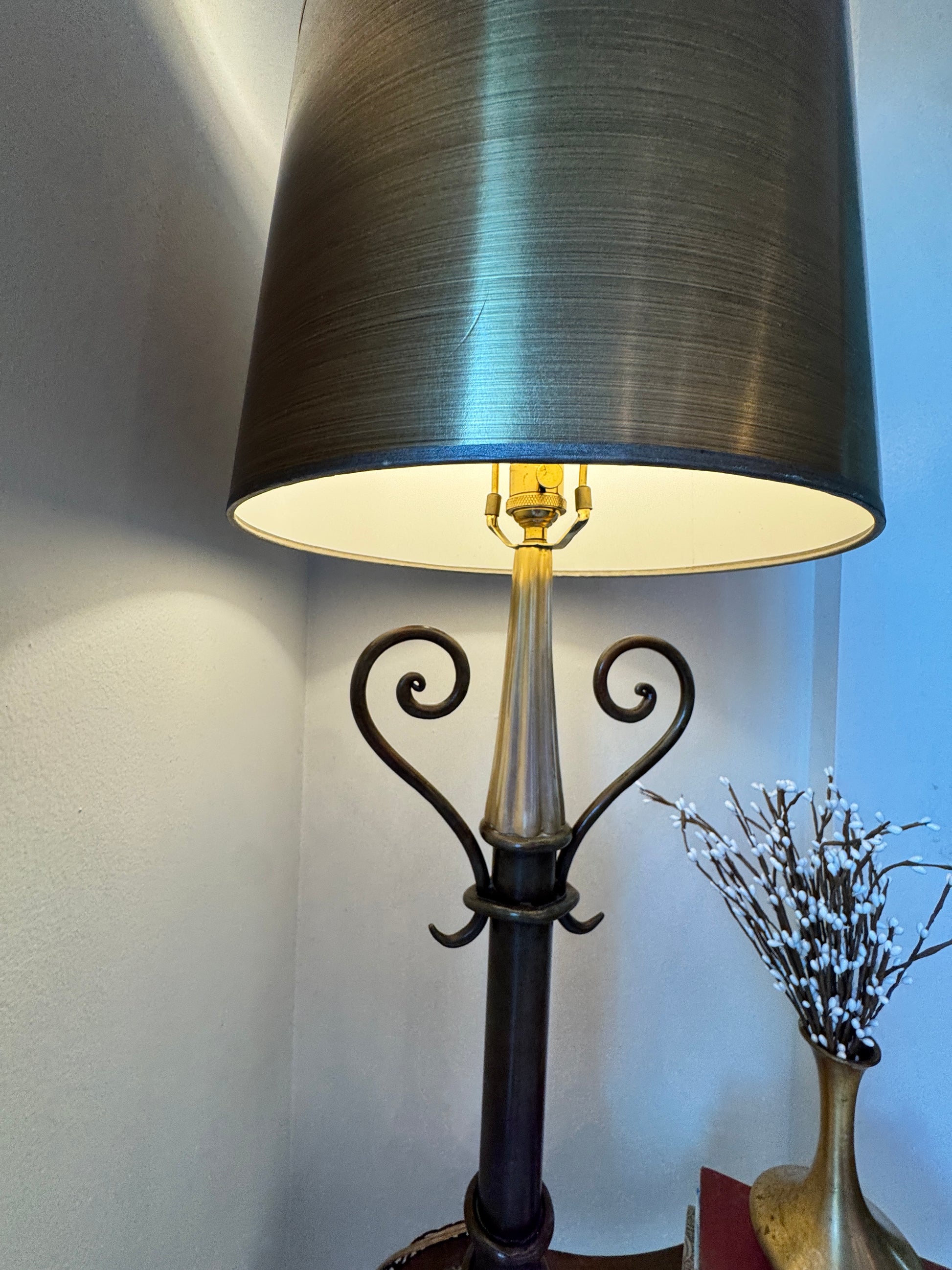 This sculptural vintage lamp immediately catches the eye with its rich golden glow, brushed brass finish, and striking silhouette. The contrast between the dark scrollwork and gleaming surface creates a look that’s grounded yet glamorous — the kind of piece you’d expect to find in a midcentury editorial or an eclectic designer nook.
