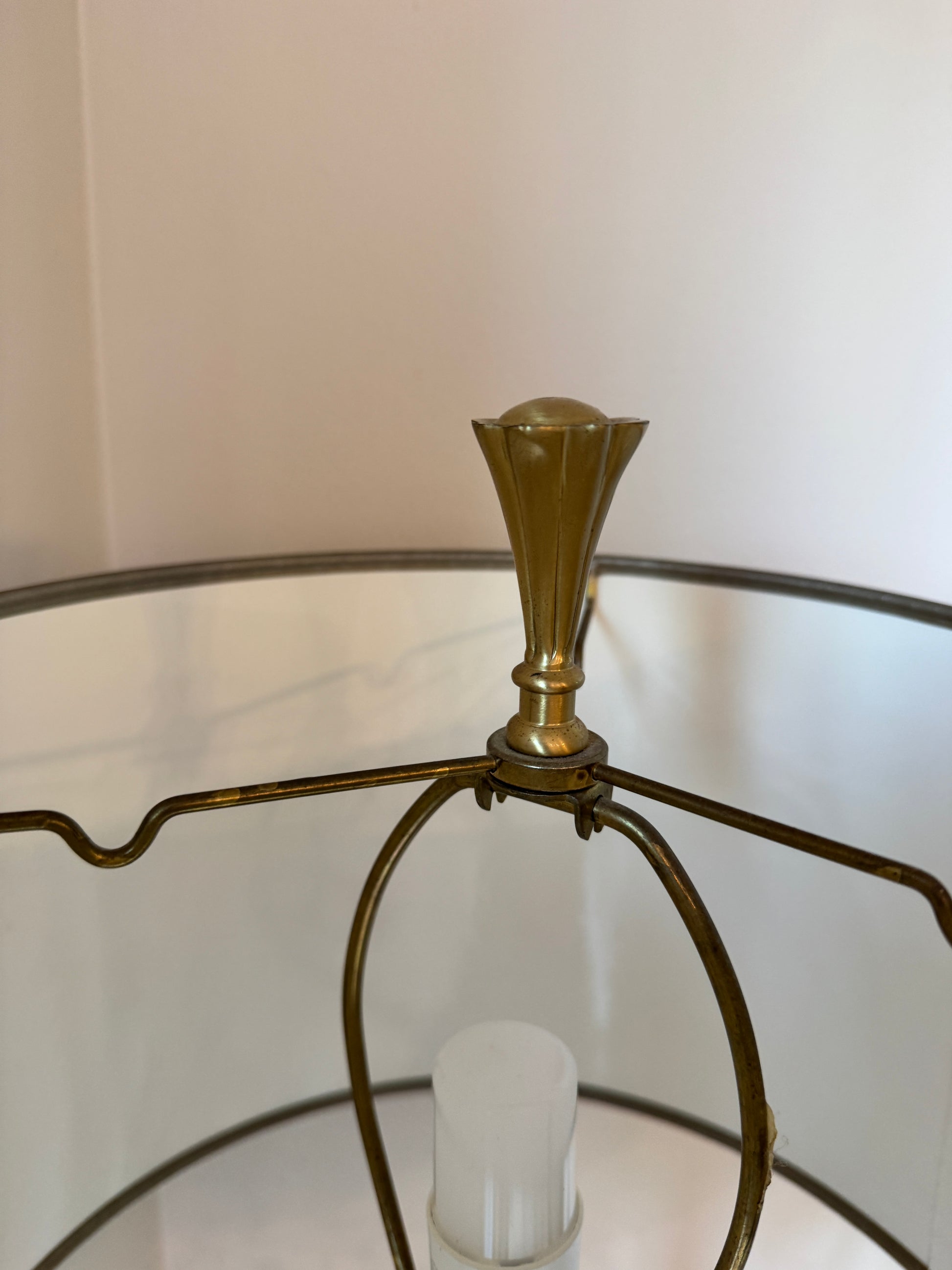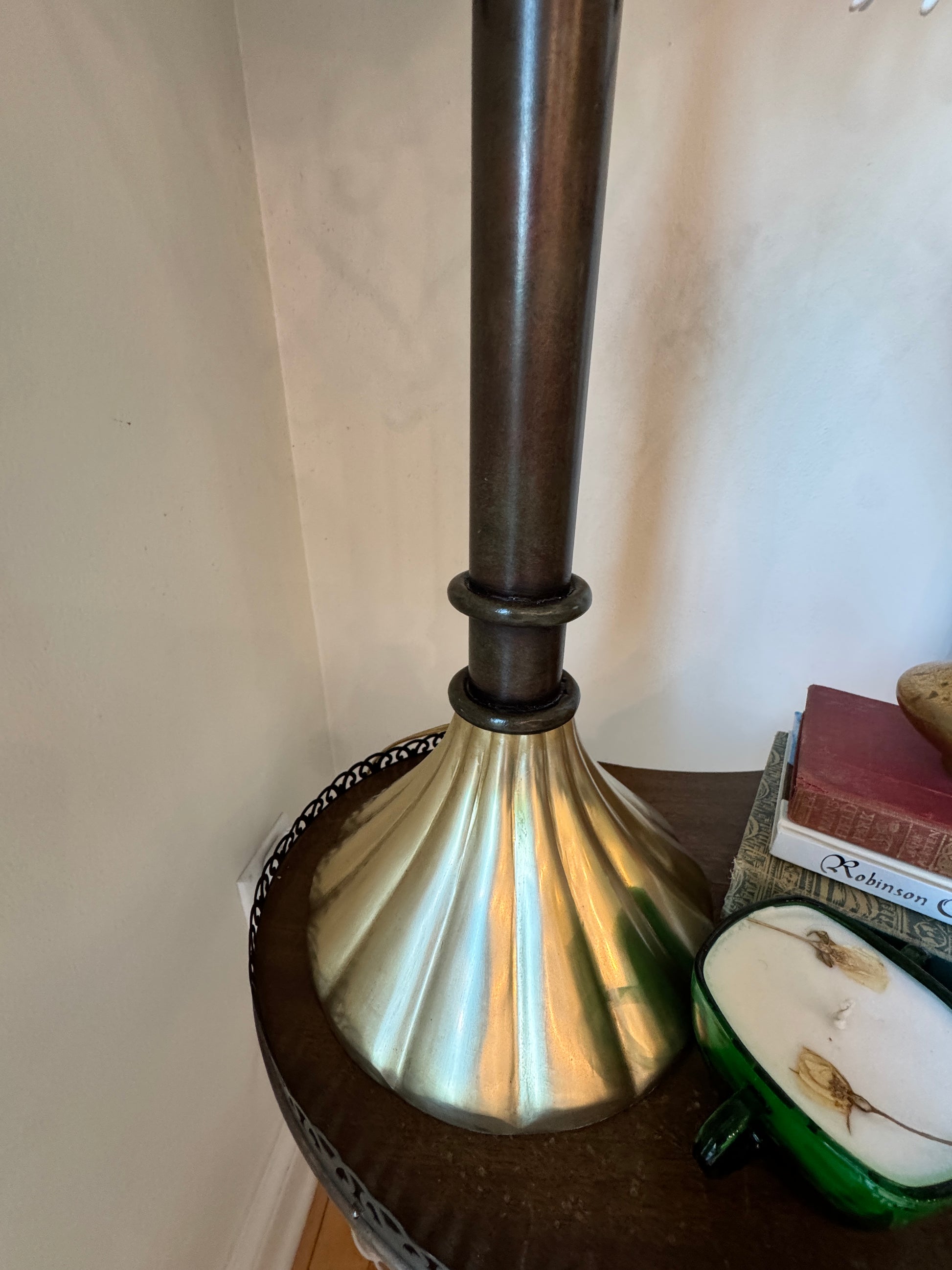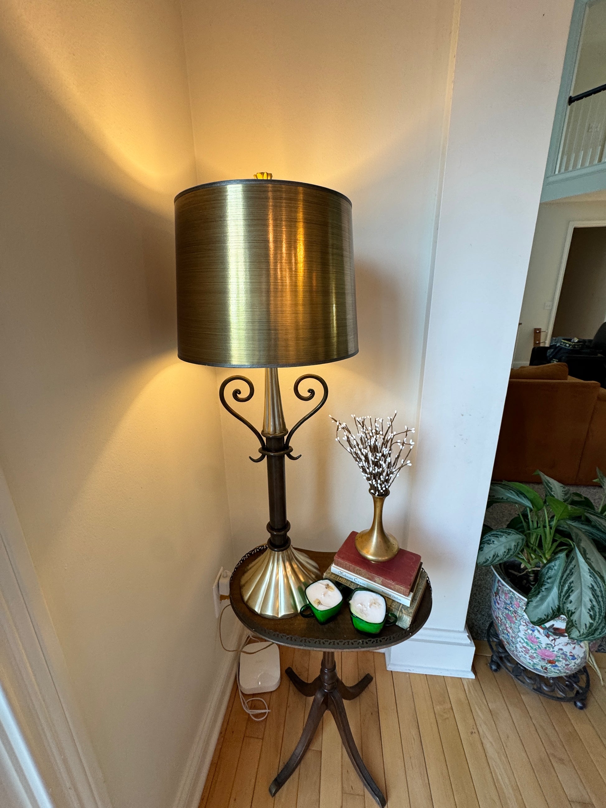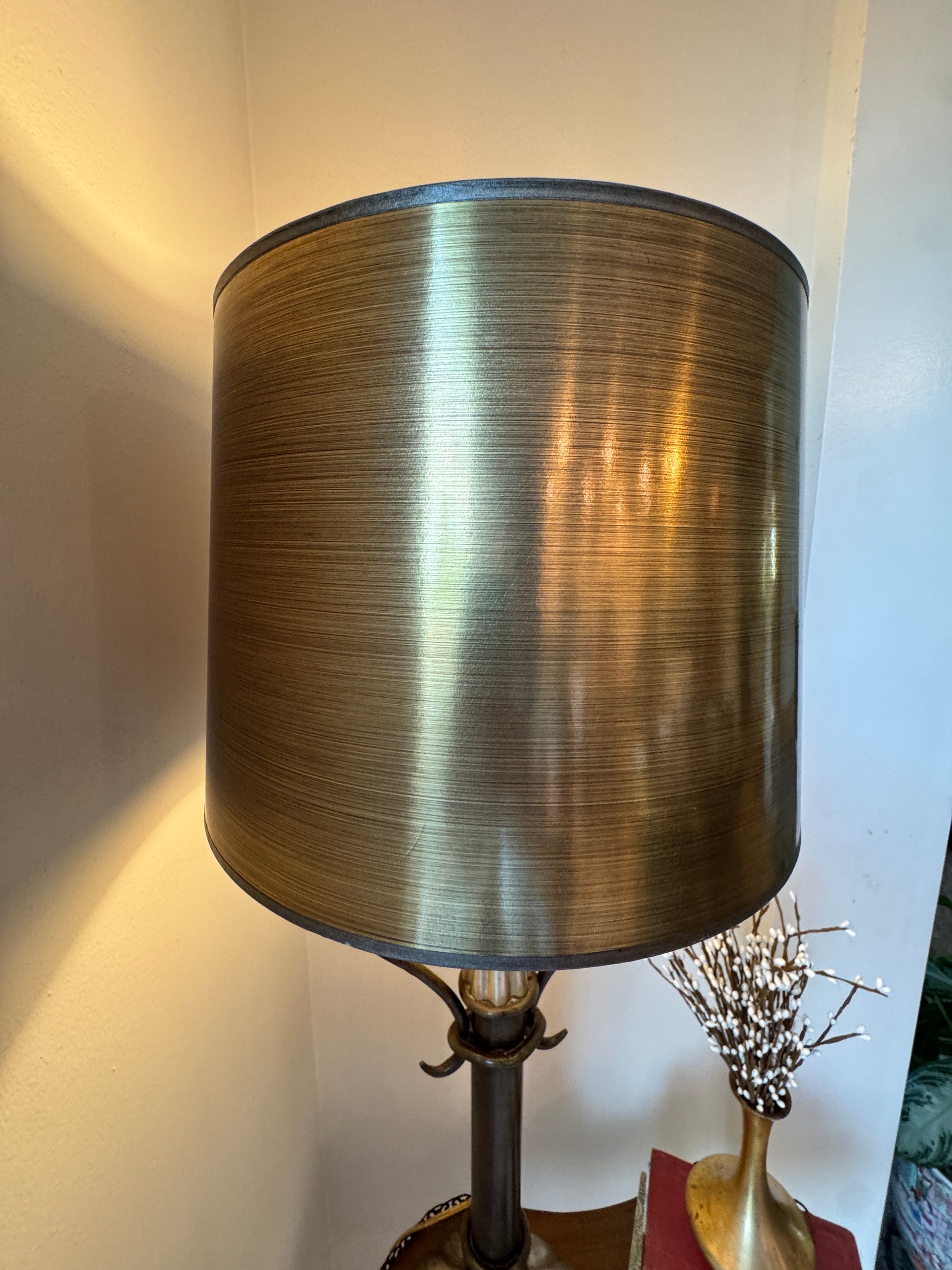 This sculptural vintage lamp immediately catches the eye with its rich golden glow, brushed brass finish, and striking silhouette. The contrast between the dark scrollwork and gleaming surface creates a look that’s grounded yet glamorous — the kind of piece you’d expect to find in a midcentury editorial or an eclectic designer nook.