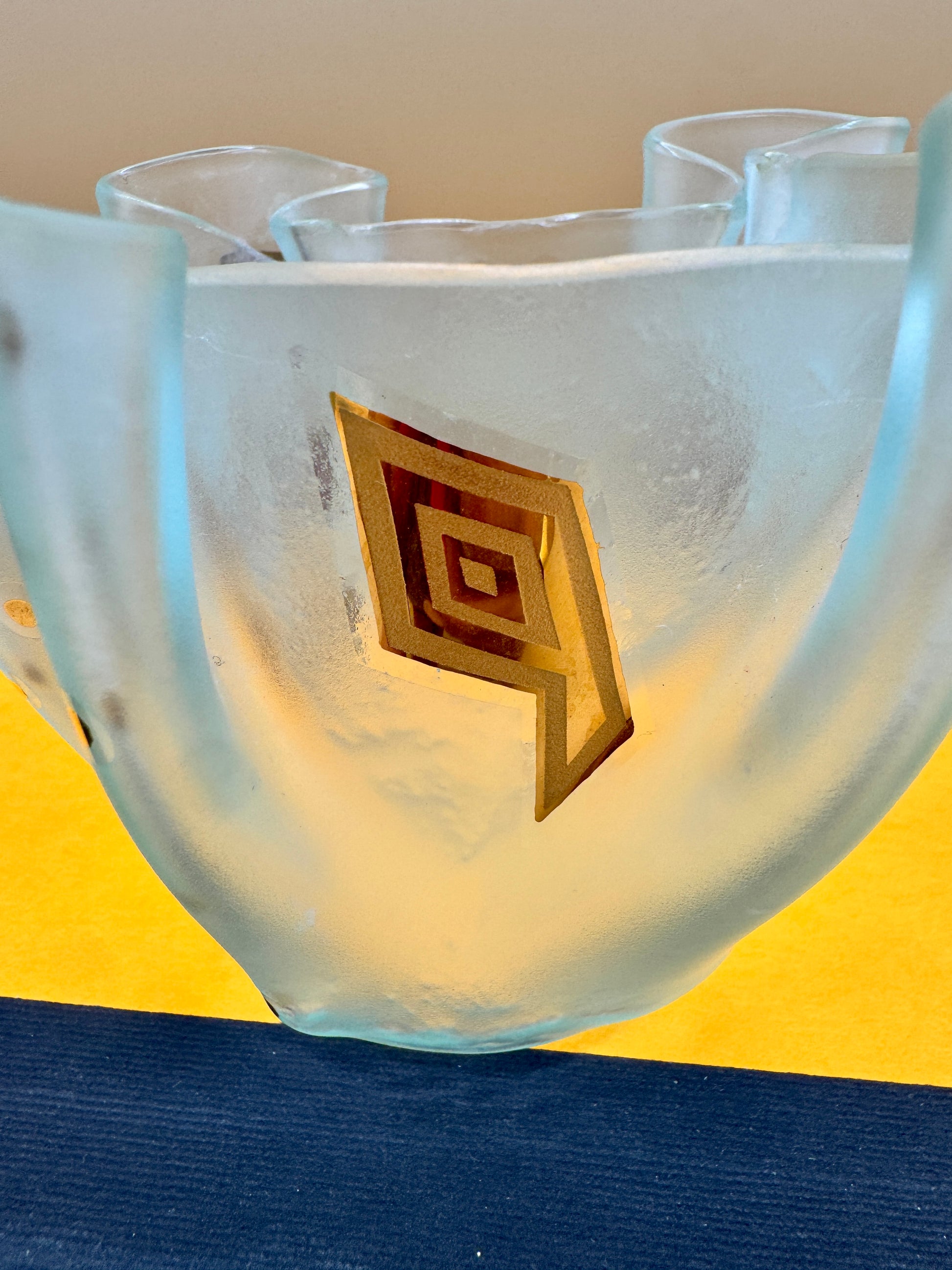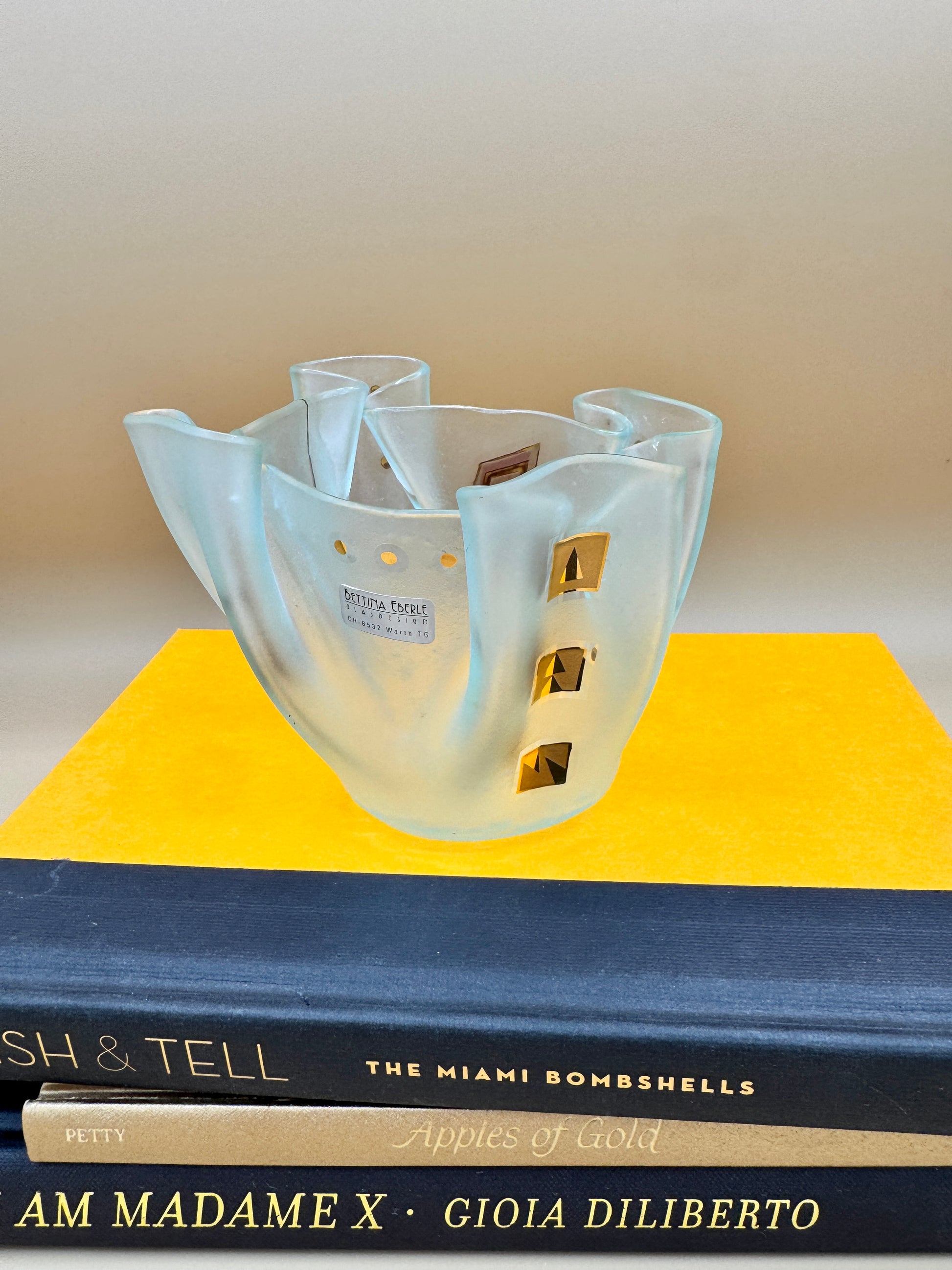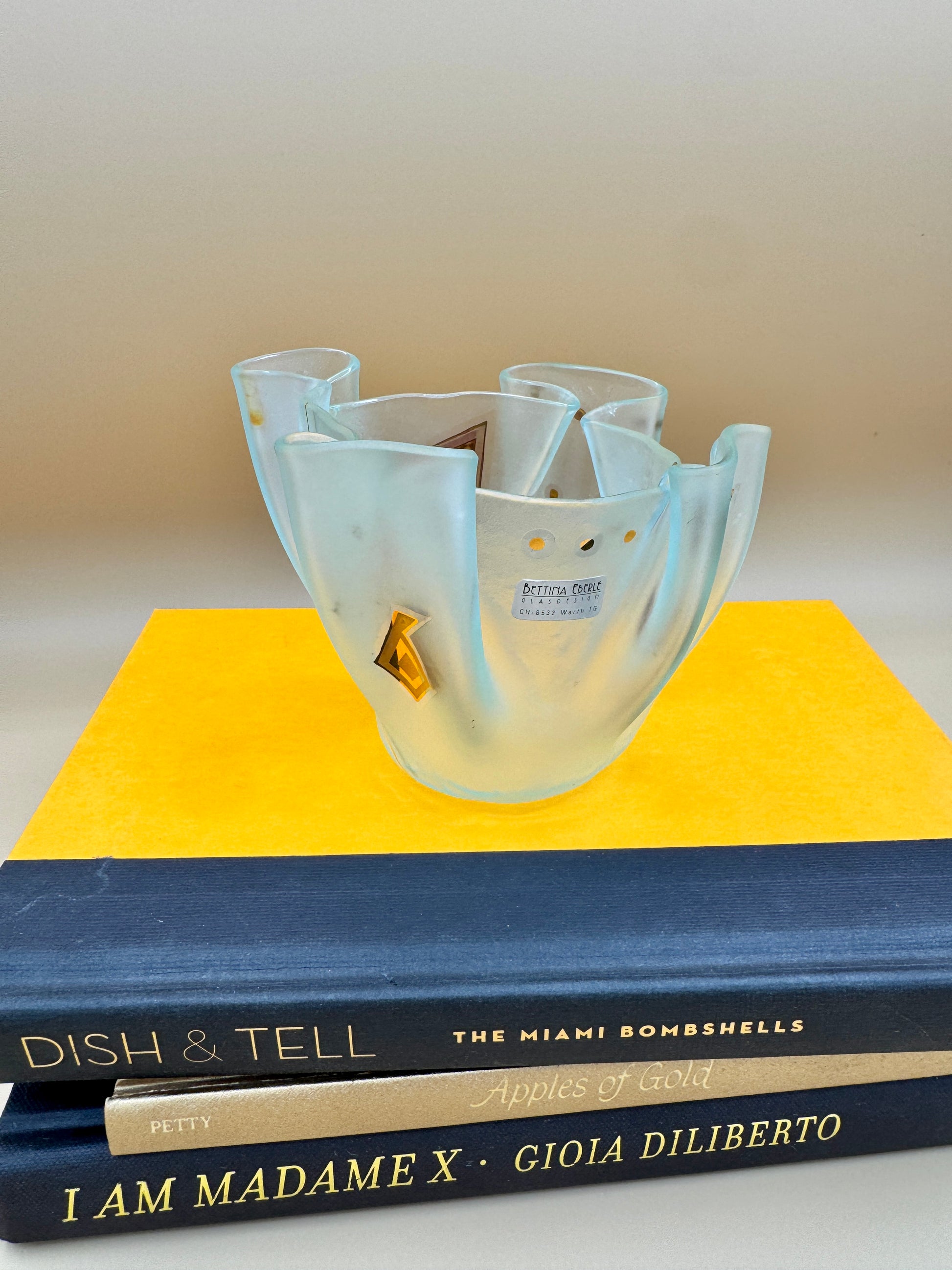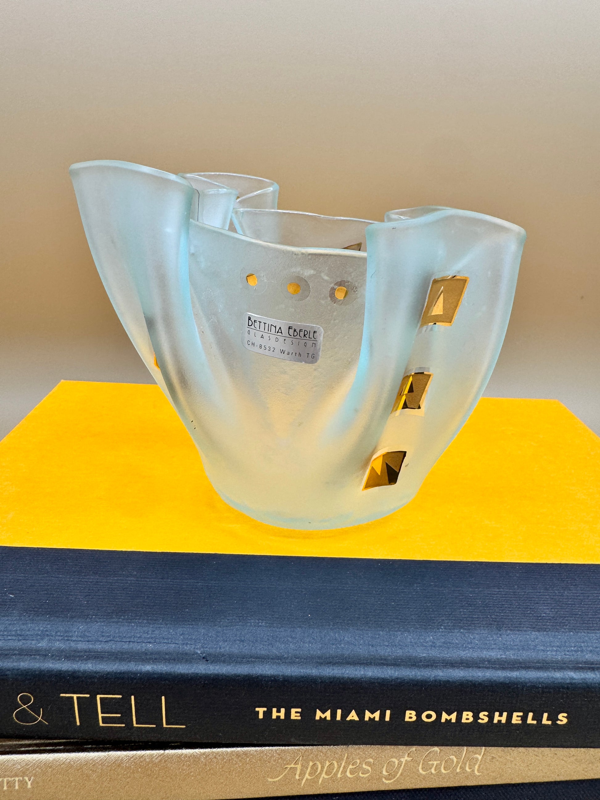 This frosted glass vase features softly folded edges and geometric gold-accented details. Complete with its original Bettina Eberle GlasDesign label, confirming authenticity. Small in size but full of presence, it makes a unique decorative accent for shelves, desks, or display cabinets.