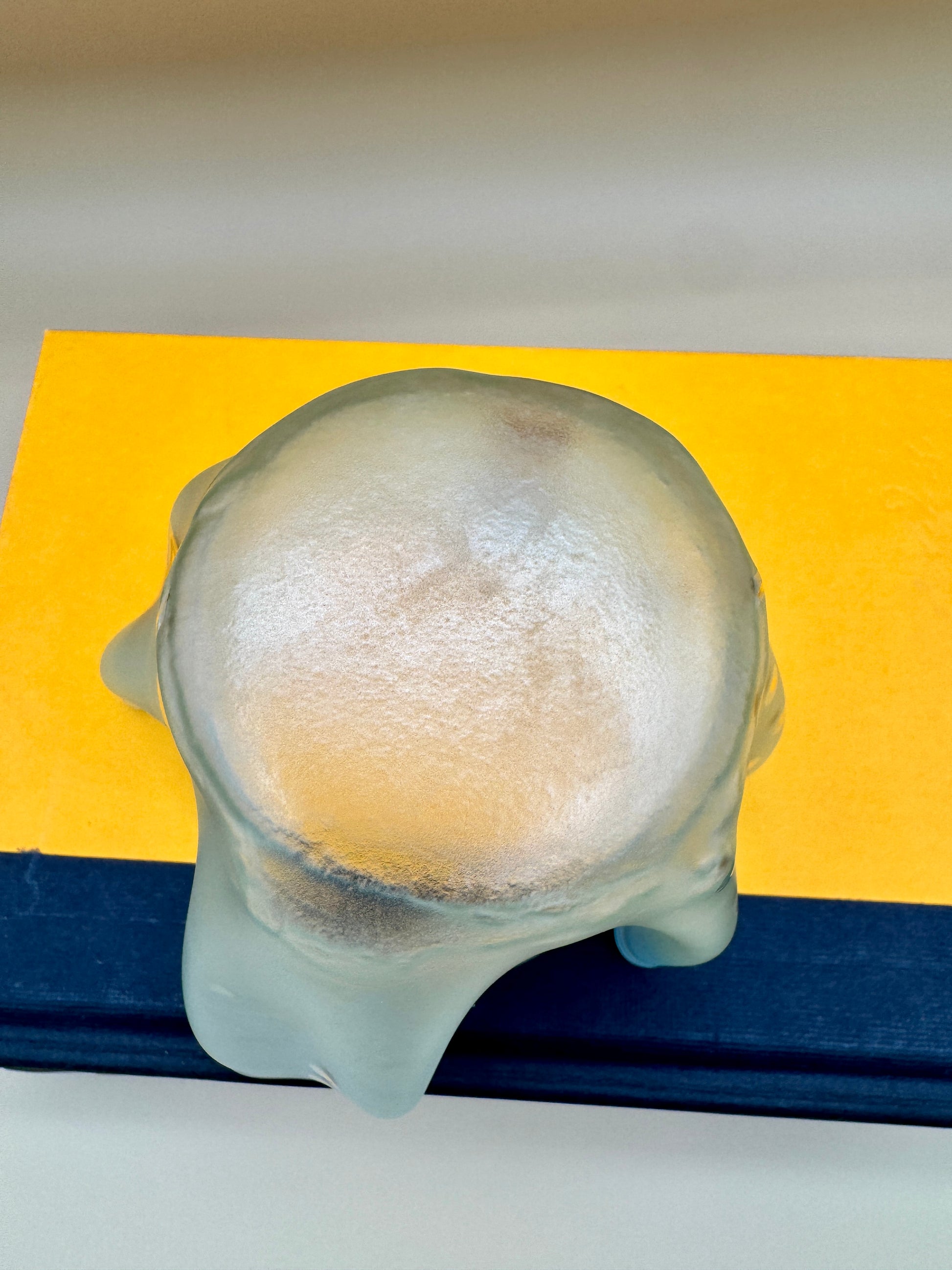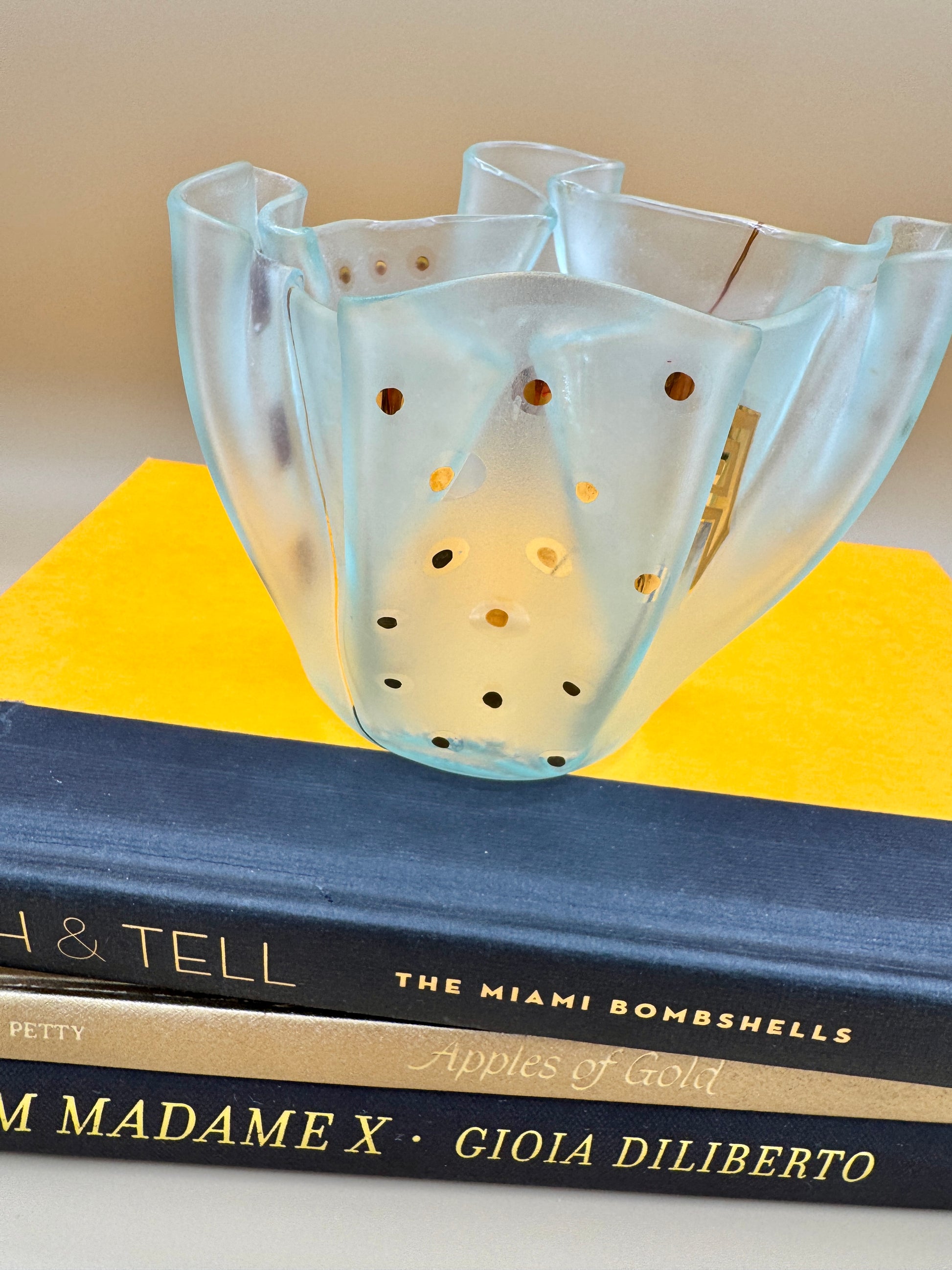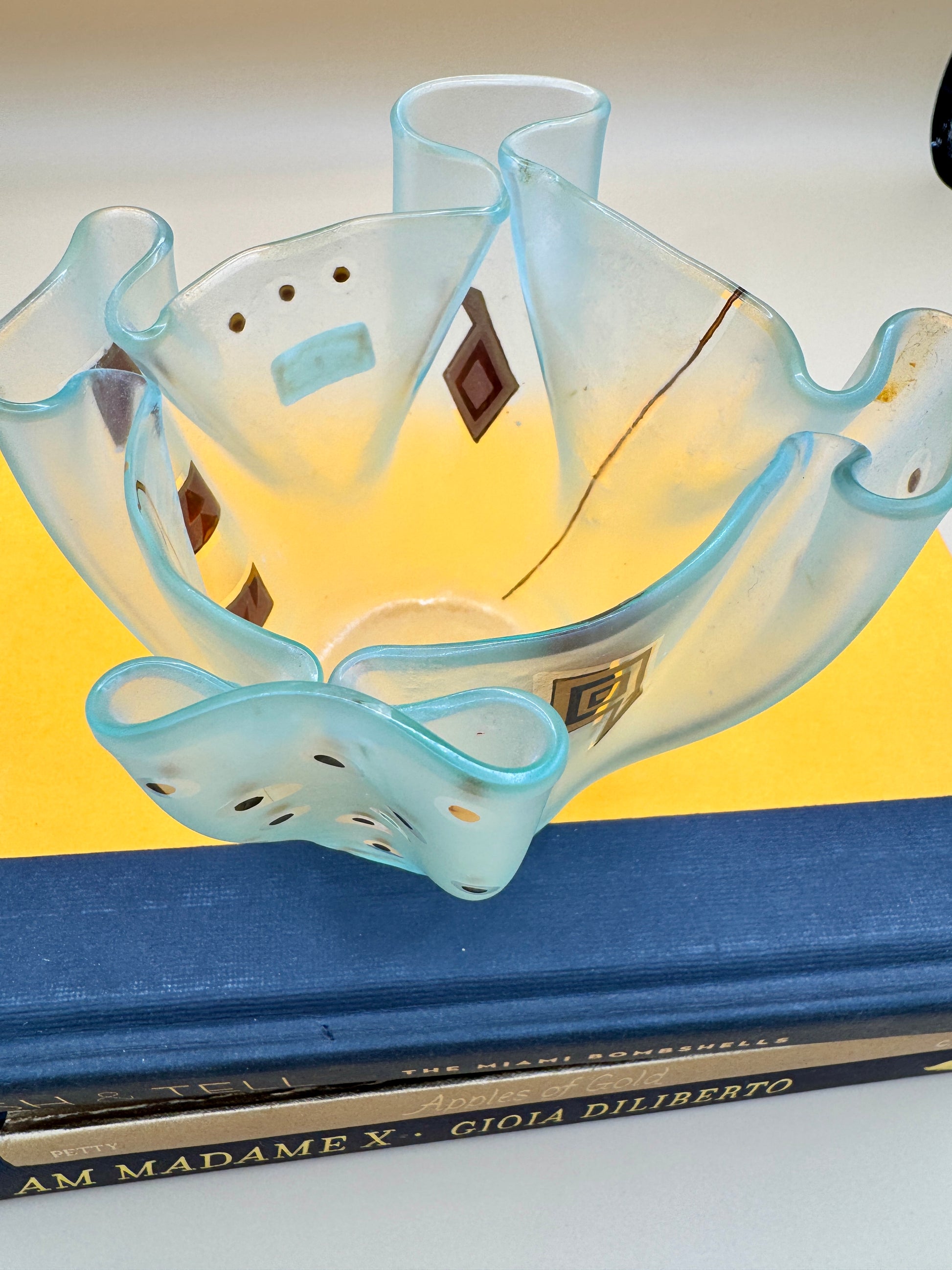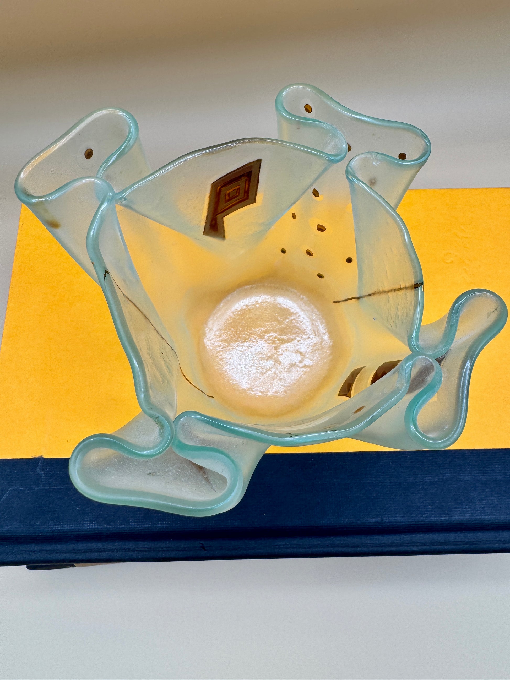 This frosted glass vase features softly folded edges and geometric gold-accented details. Complete with its original Bettina Eberle GlasDesign label, confirming authenticity. Small in size but full of presence, it makes a unique decorative accent for shelves, desks, or display cabinets.
